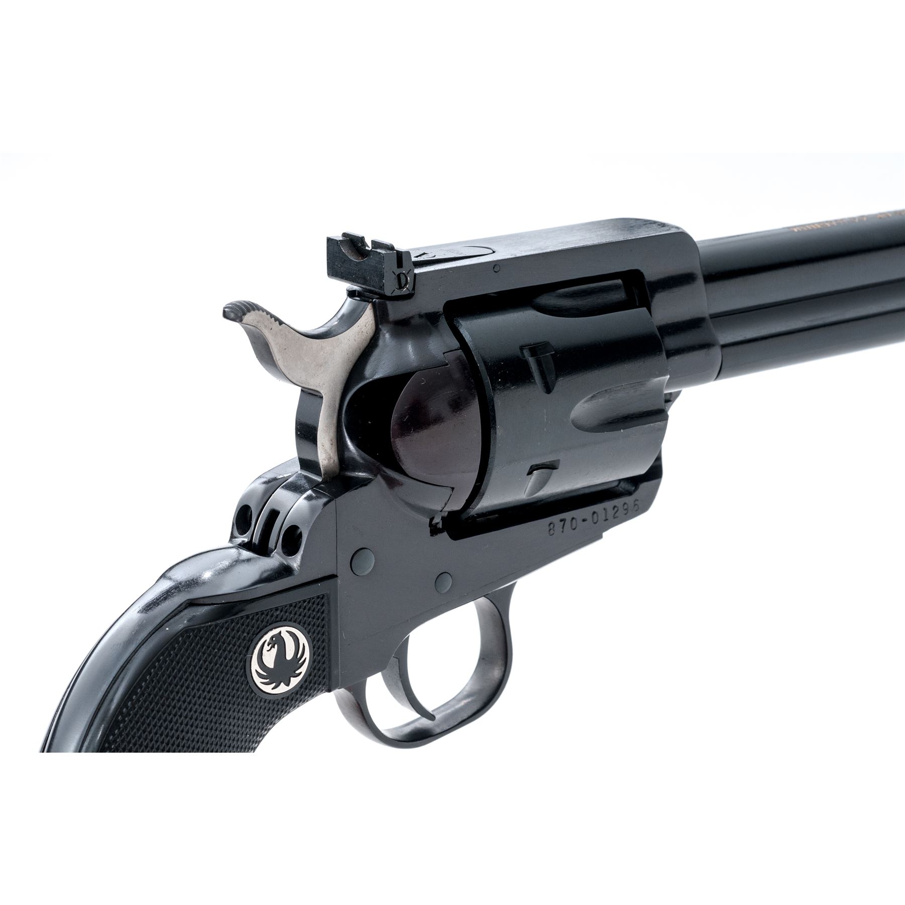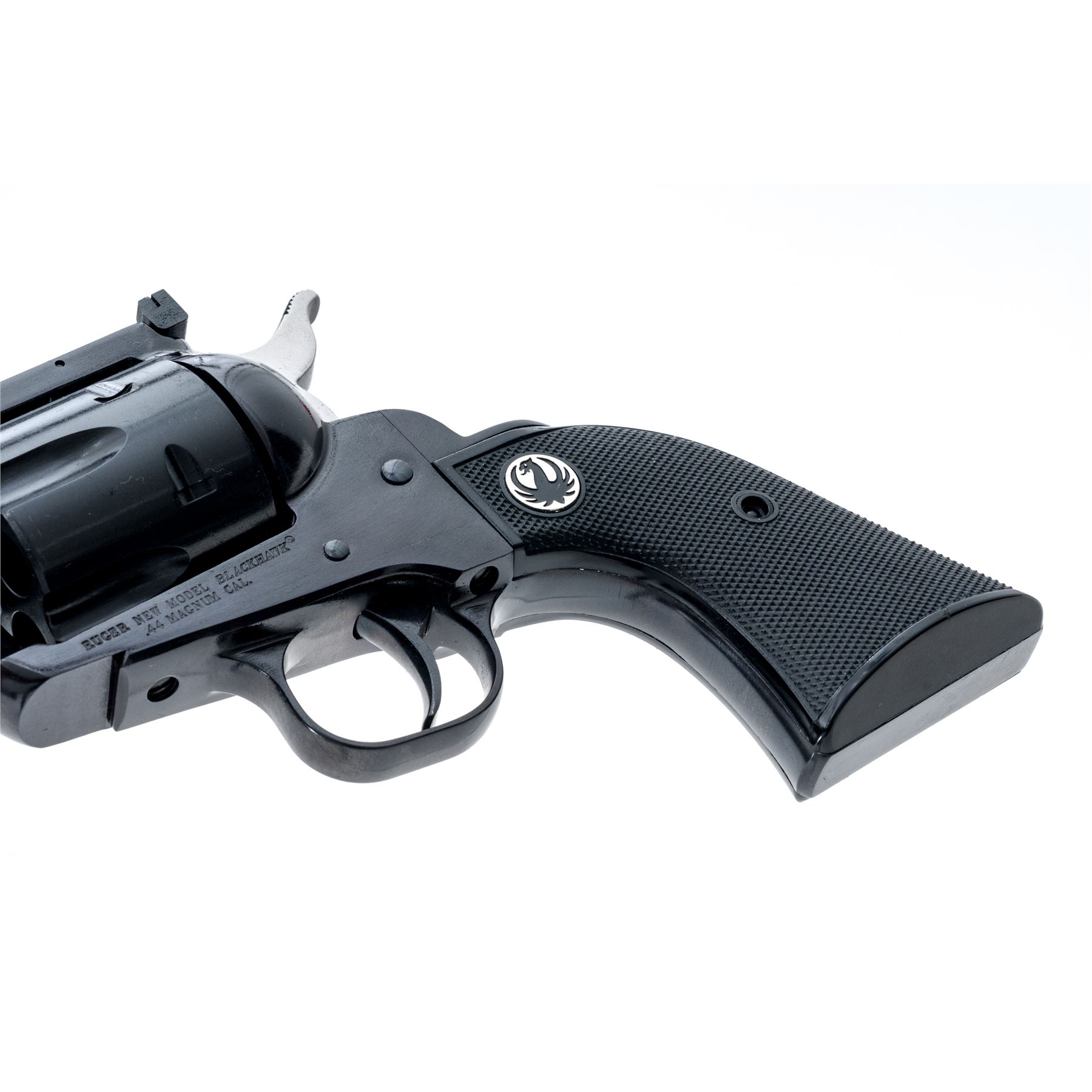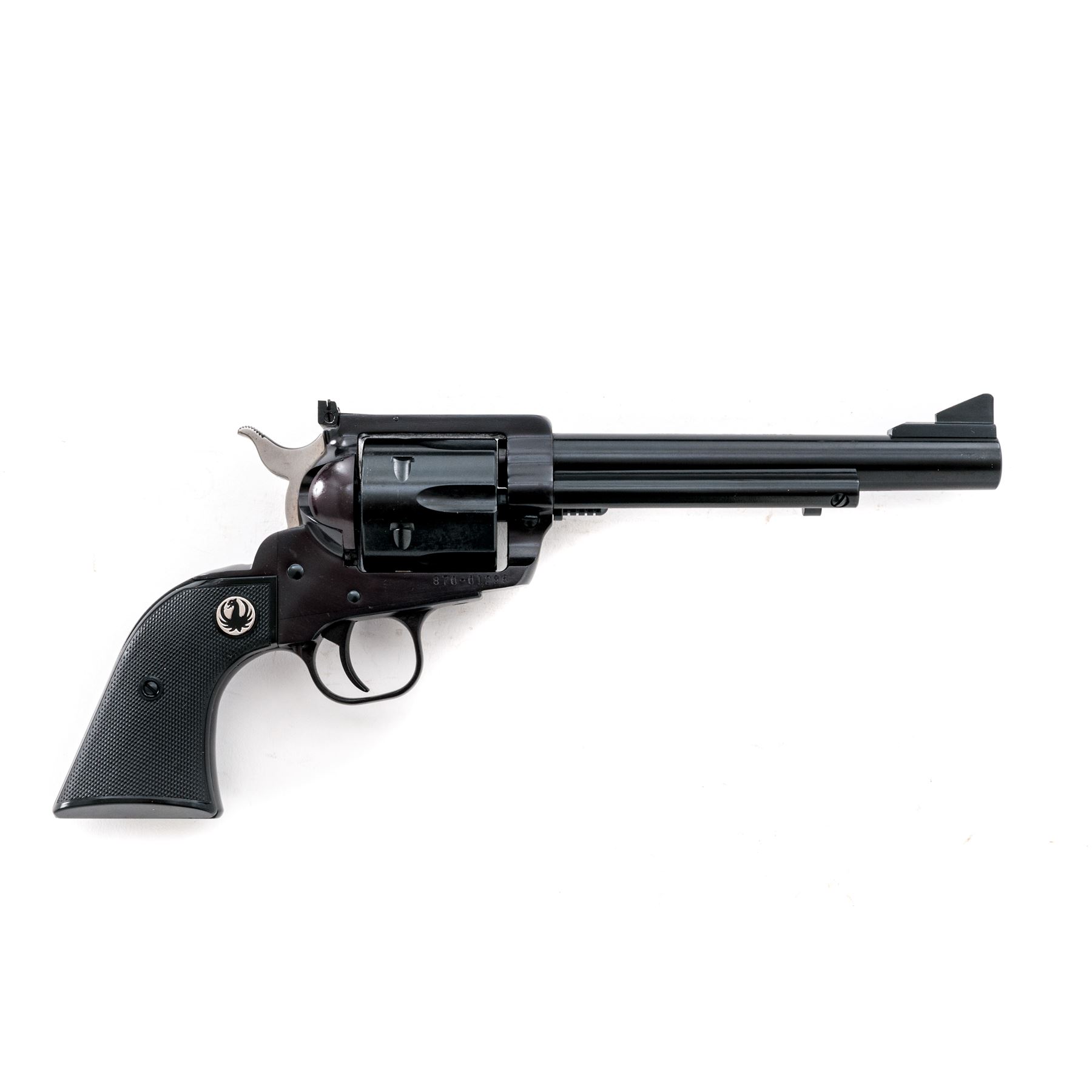 Mint Ruger 50th Anniversary New Model Blackhawk Single Action Revolver, #870-01296, .44 Magnum cal., 6.5'' barrel, blue finish, factory checkered black hard rubber grips with Ruger ''black eagle'' medallions, blade front sight, square-notched fully adjustable rear sight. The top of the barrel is marked in gold lettering ''50 YEARS OF .44 MAGNUM / 1956-2006''. In the original red plastic Ruger case with matching end label, gun lock, two (2) internal safety keys, 50th Anniversary owner's manual, and other misc. paperwork. Condition is excellent appearing as new and unfired; cylinder with only a very faint index line. Left grip with one tiny mark to the lower edge and otherwise both grips appears as new. Bore is mirror bright. Est.: $450-$600. (Modern)