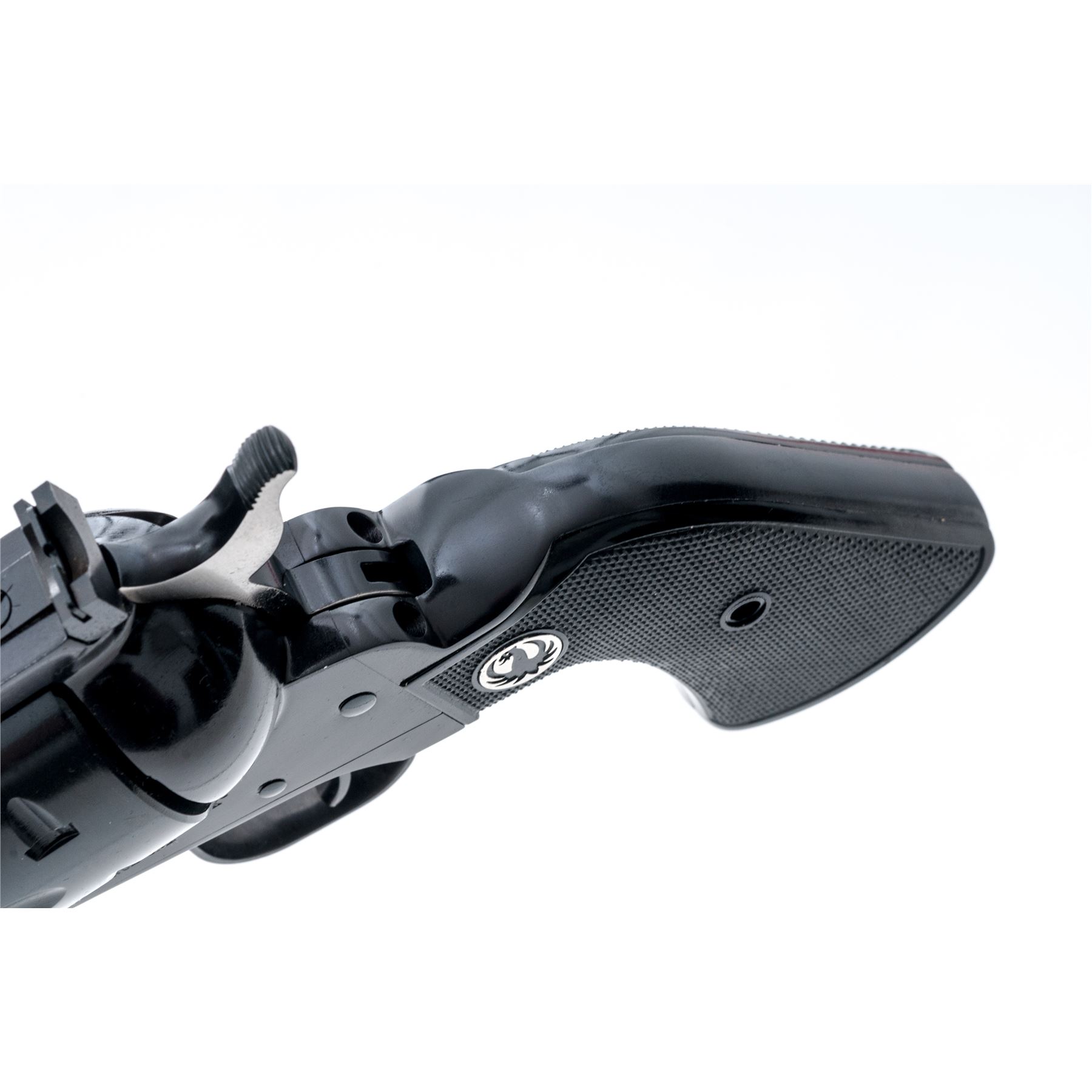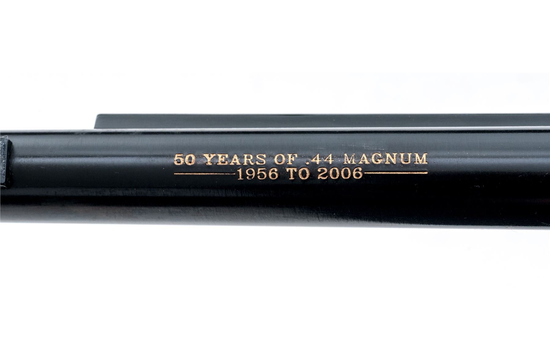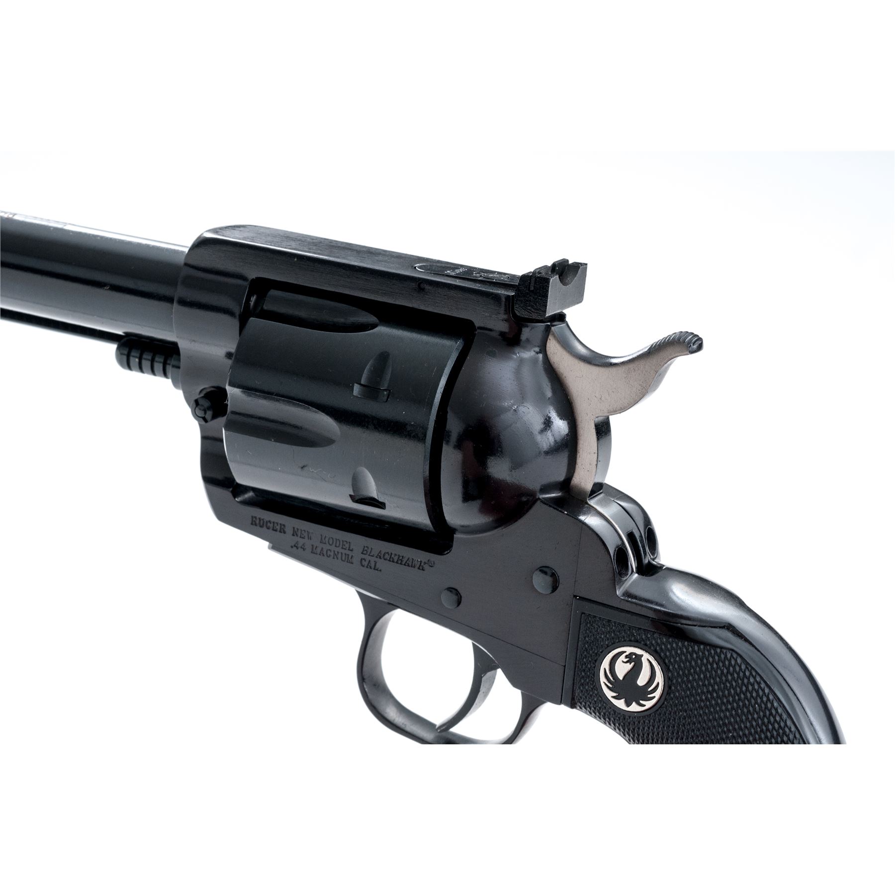 Mint Ruger 50th Anniversary New Model Blackhawk Single Action Revolver, #870-01296, .44 Magnum cal., 6.5'' barrel, blue finish, factory checkered black hard rubber grips with Ruger ''black eagle'' medallions, blade front sight, square-notched fully adjustable rear sight. The top of the barrel is marked in gold lettering ''50 YEARS OF .44 MAGNUM / 1956-2006''. In the original red plastic Ruger case with matching end label, gun lock, two (2) internal safety keys, 50th Anniversary owner's manual, and other misc. paperwork. Condition is excellent appearing as new and unfired; cylinder with only a very faint index line. Left grip with one tiny mark to the lower edge and otherwise both grips appears as new. Bore is mirror bright. Est.: $450-$600. (Modern)