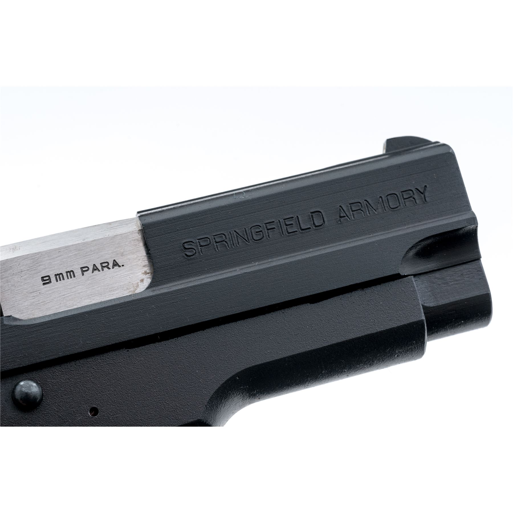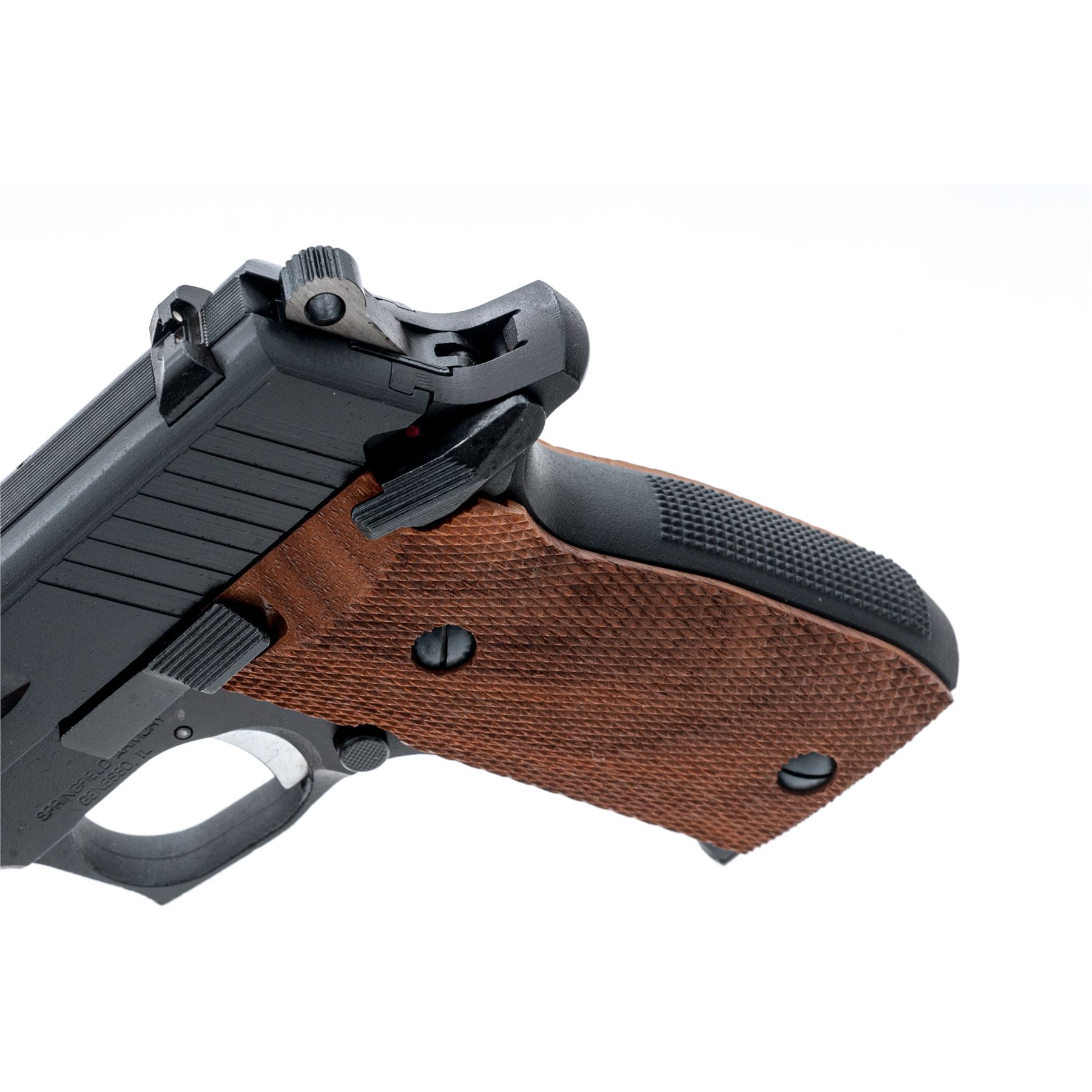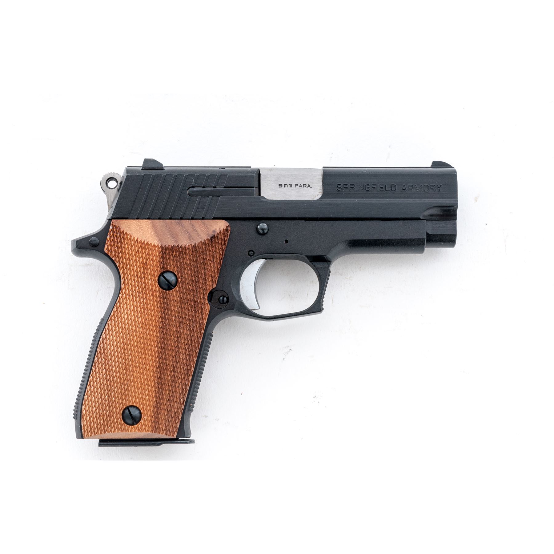 Springfield Armory Firecat Semi-Automatic Pistol, #FC0681, 9mm cal., 3.5'' barrel, matte blue finish, checkered wood grips, white 3-dot sights, checkered front and backstrap, with one 8-round magazine. Pistol is in excellent condition, appearing as new, with only a few light marks from handling, the most noticeable being a small scratch on the left side of the slide below the ejection port. Smooth action, bright bore with excellent rifling. Est.: $350-$550. (Modern/PPT)