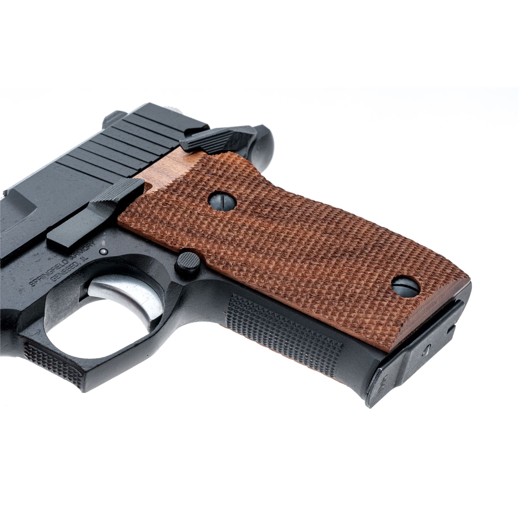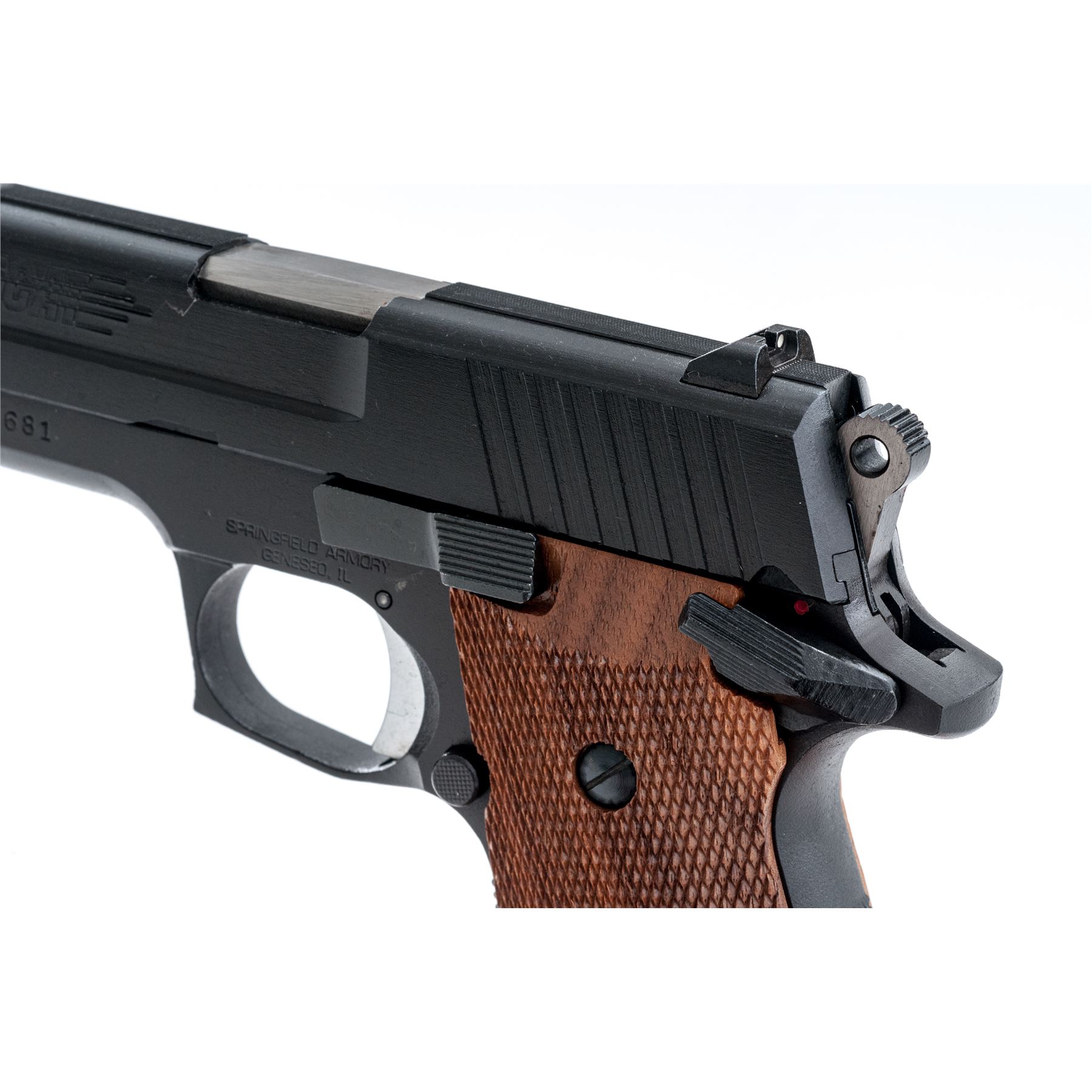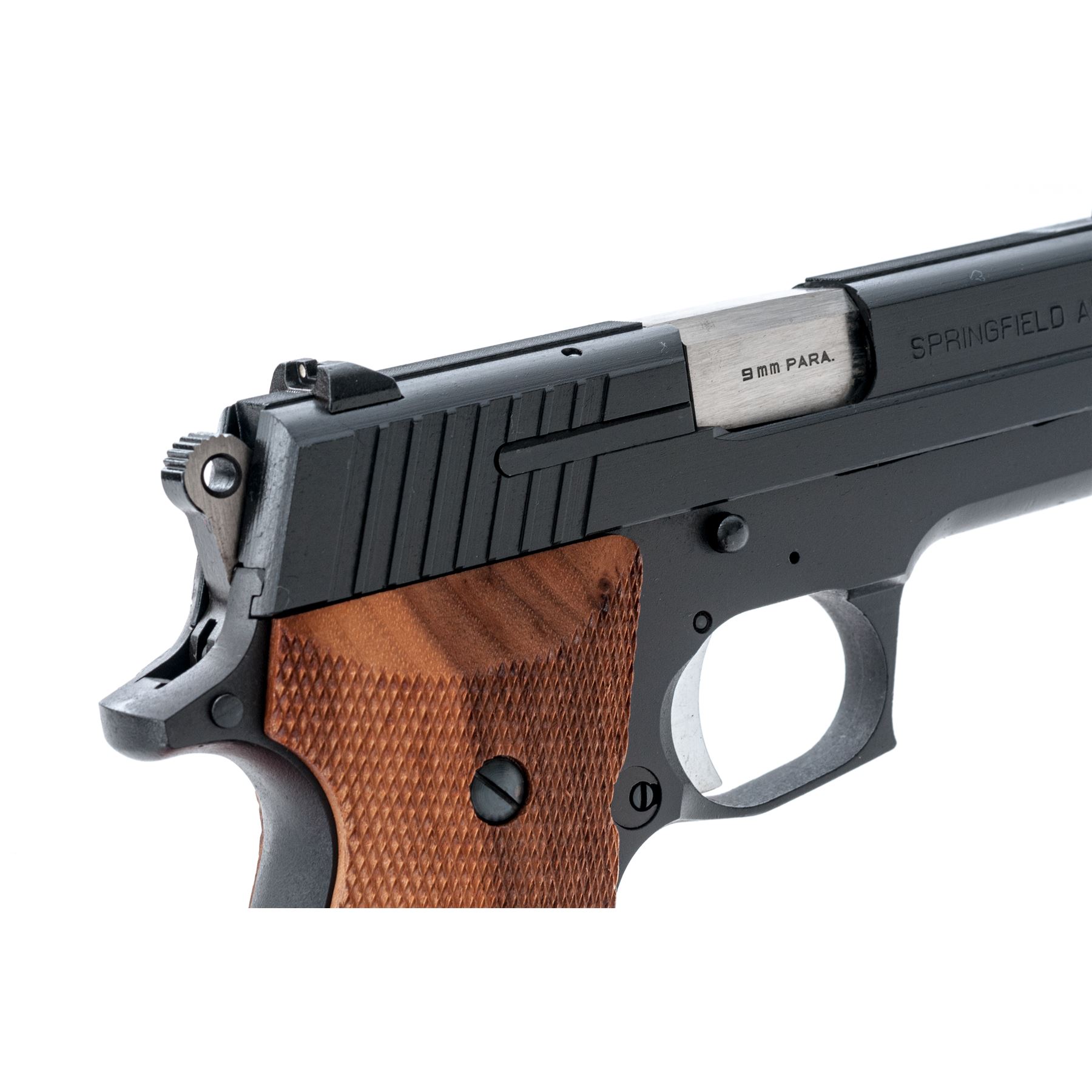 Springfield Armory Firecat Semi-Automatic Pistol, #FC0681, 9mm cal., 3.5'' barrel, matte blue finish, checkered wood grips, white 3-dot sights, checkered front and backstrap, with one 8-round magazine. Pistol is in excellent condition, appearing as new, with only a few light marks from handling, the most noticeable being a small scratch on the left side of the slide below the ejection port. Smooth action, bright bore with excellent rifling. Est.: $350-$550. (Modern/PPT)