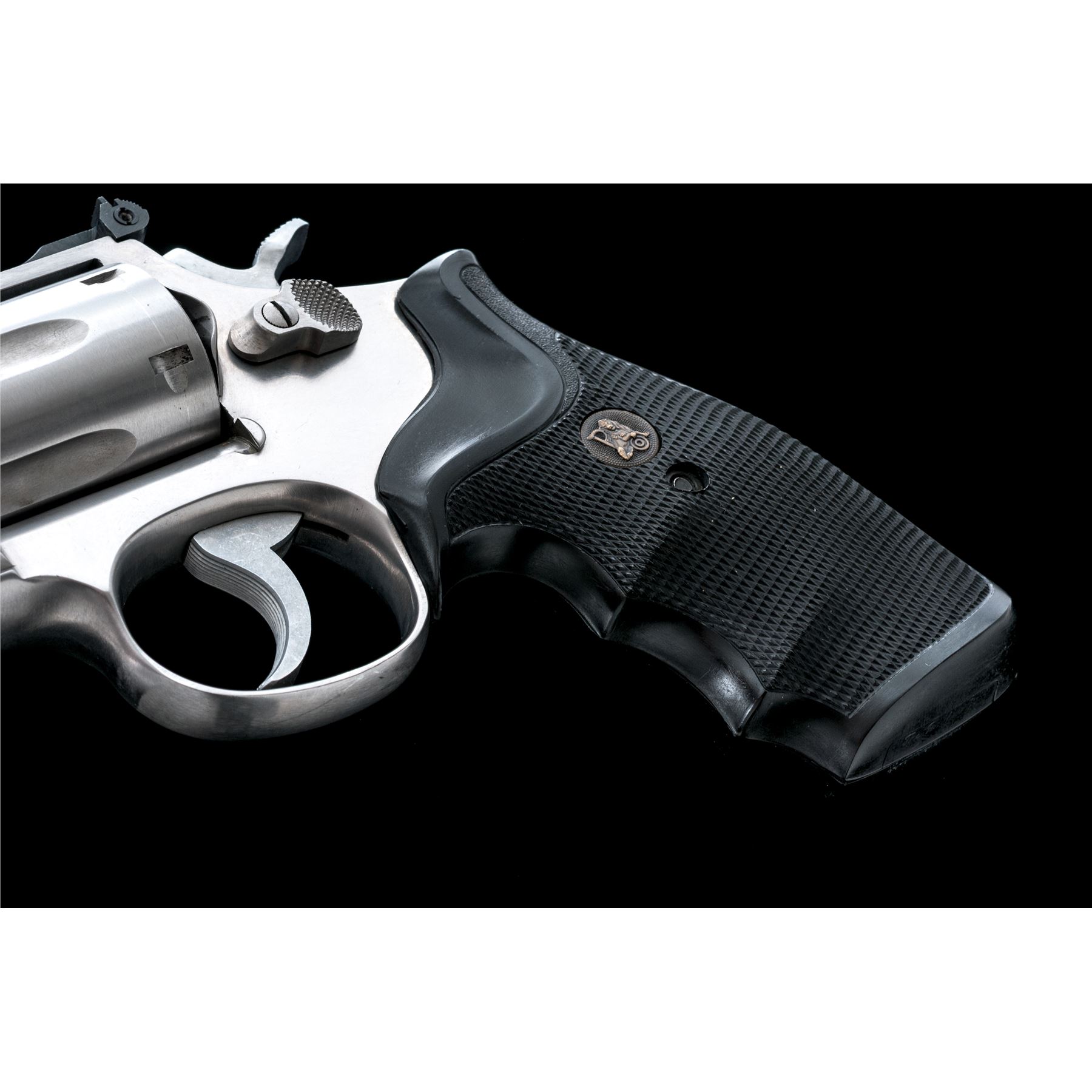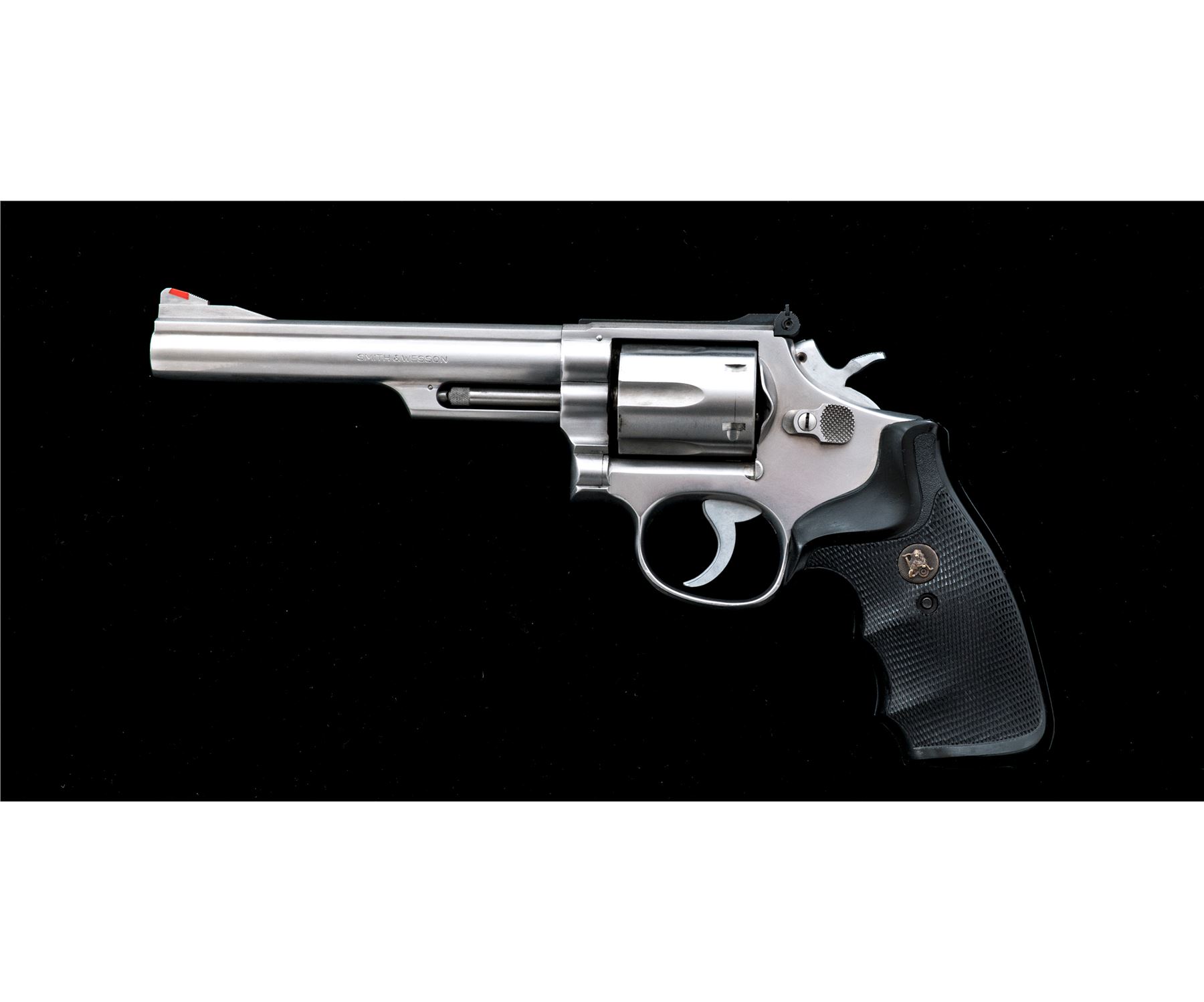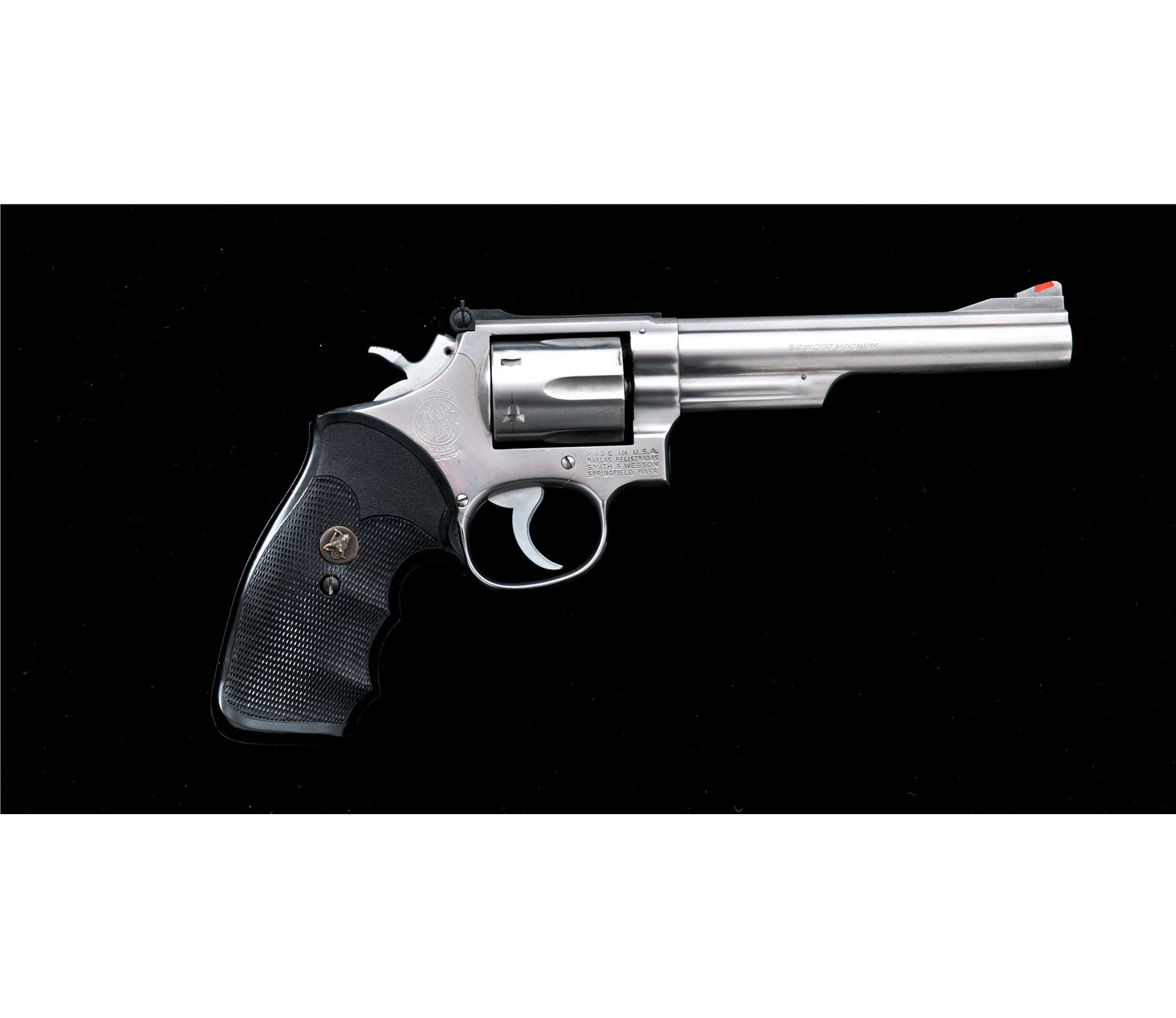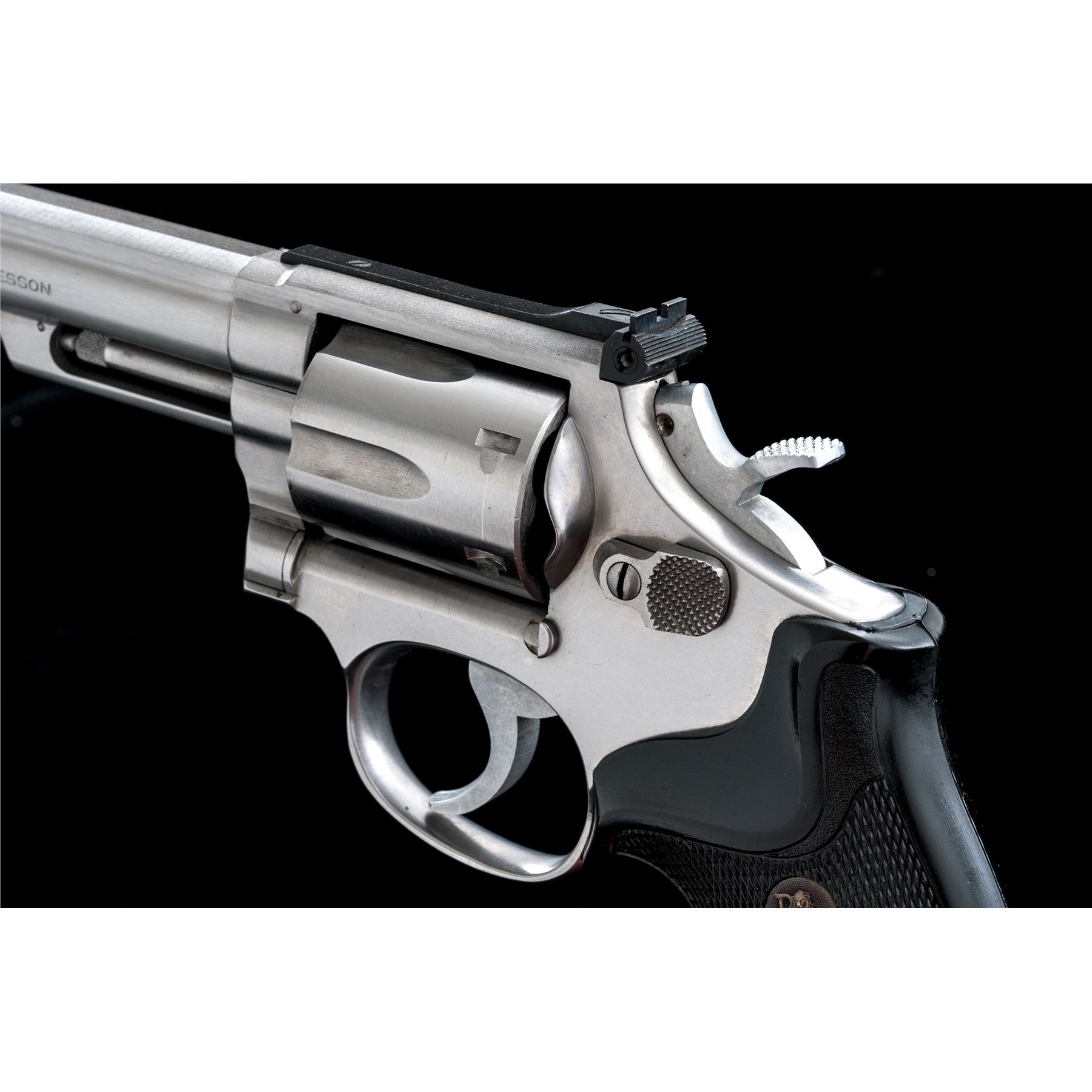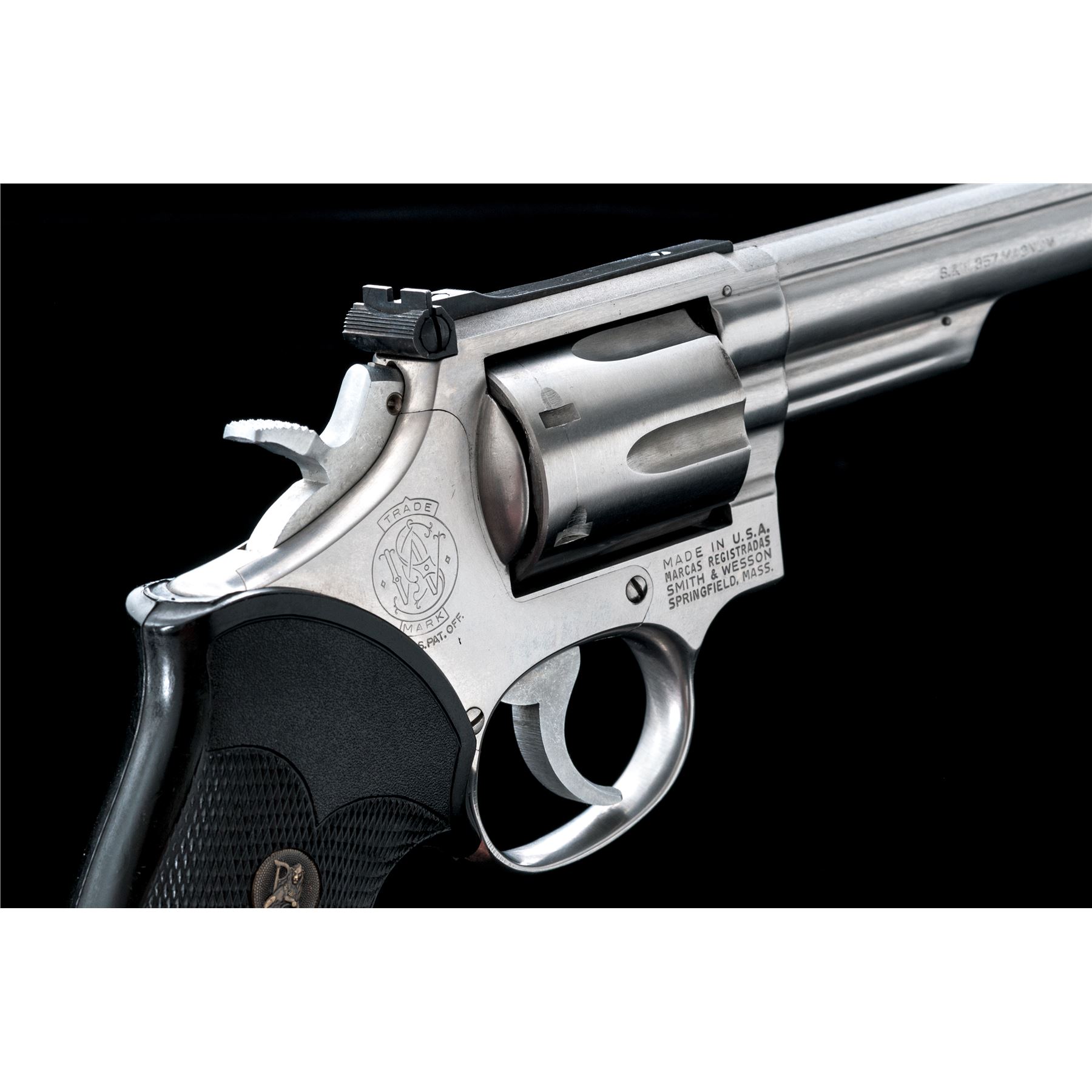 Smith & Wesson Model 66-1 Combat Magnum Double Action Revolver, #67K3667, .357 mag. cal., satin stainless steel, checkered black rubber Pachmayr grips, red ramp front sight and square-notched rear sight adjustable for both windage and elevation, service trigger, and checkered semi-target hammer. Metal surfaces with scattered light scuffs and small handling marks, all normal signs of moderate range use. Cylinder with a thin index line. Overall very good+. Grips rate as near excellent with a few slight marks, mainly to the smooth borders. Factory lettering is clear and defined. Screw heads are straight and unmarred. Crisp action, excellent bore. Est.: $400-$600. (Modern/PPT)