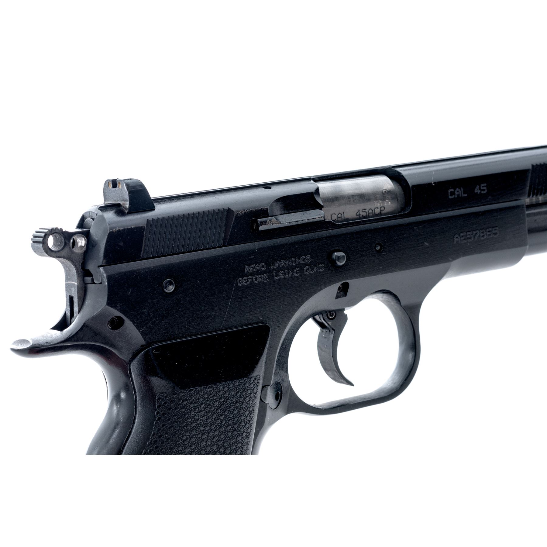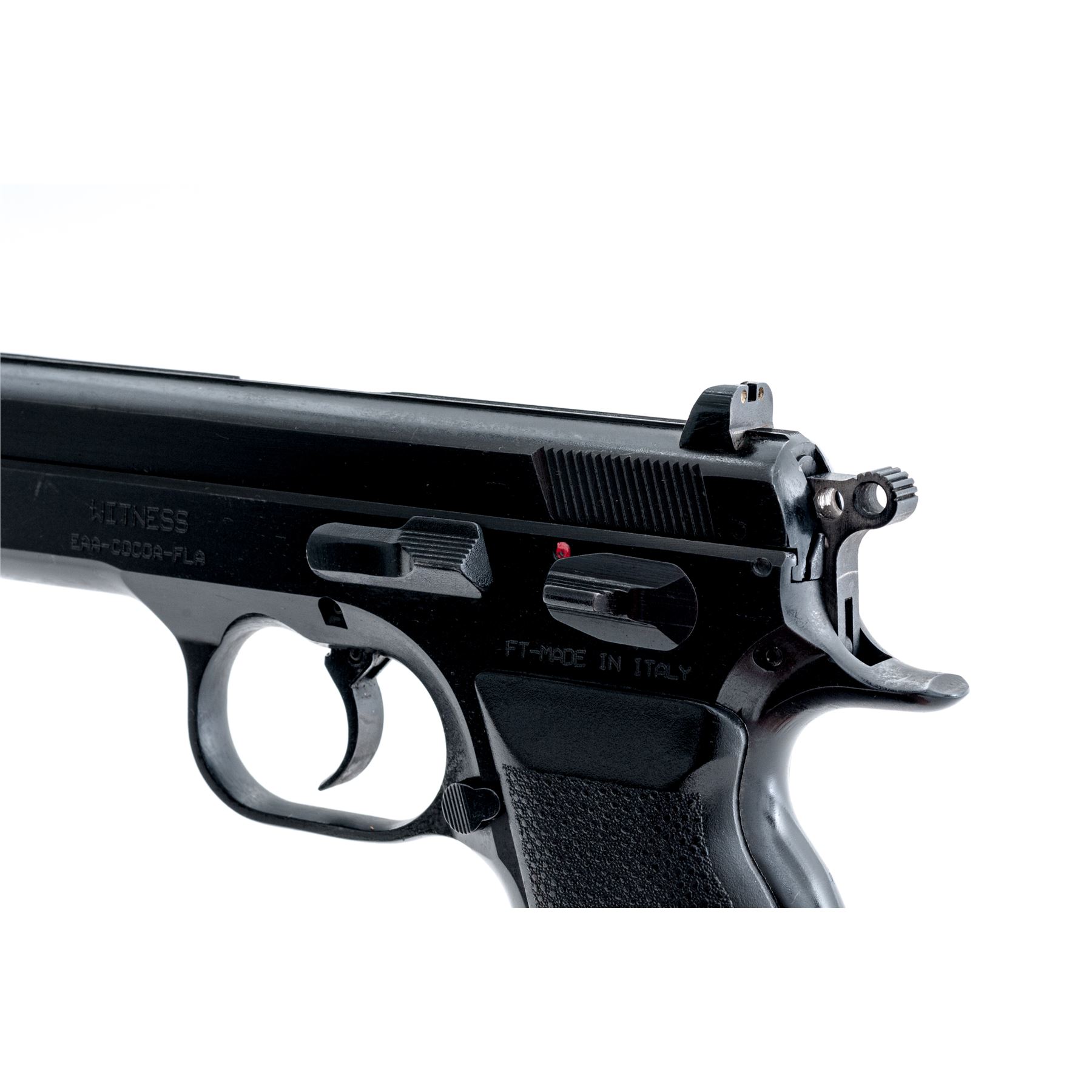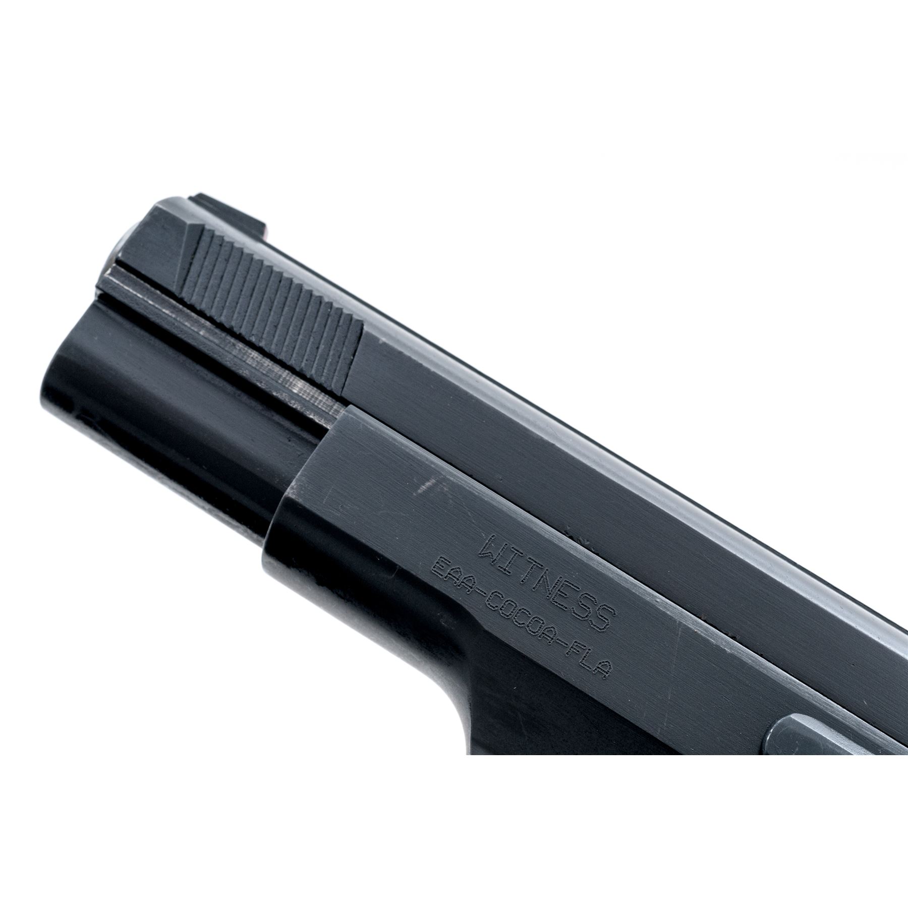 Tanfoglio EAA Witness EA 45 Series Semi-Automatic Pistol, #AE57865, .45 ACP cal., 4.5'' barrel, satin blue finish, steel frame, stippled black rubber grips, front and rear slide serrations, integral blade front sight with red paint and white two-dot square-notched rear sight. Included is one 10-round Mec-Gar magazine. Made in Italy. With the exception of tiny impressions along the exposed edge of the extractor and right side rear edge of slide, this pistol is in near excellent overall condition. Approx. 98% original finish remains with a half-inch scratch on left side of slide, otherwise showing only normal light handling marks to the metal and grips. Smooth action, near excellent bore with just a little powder fouling. Est.: $350-$550. (Modern/PPT)