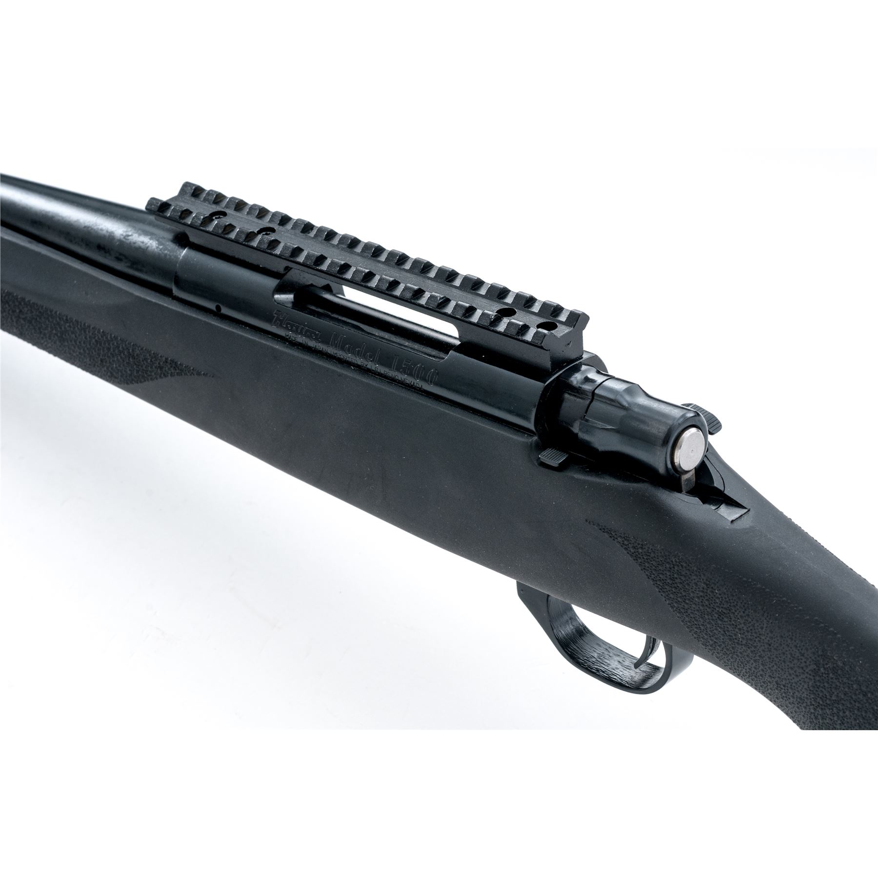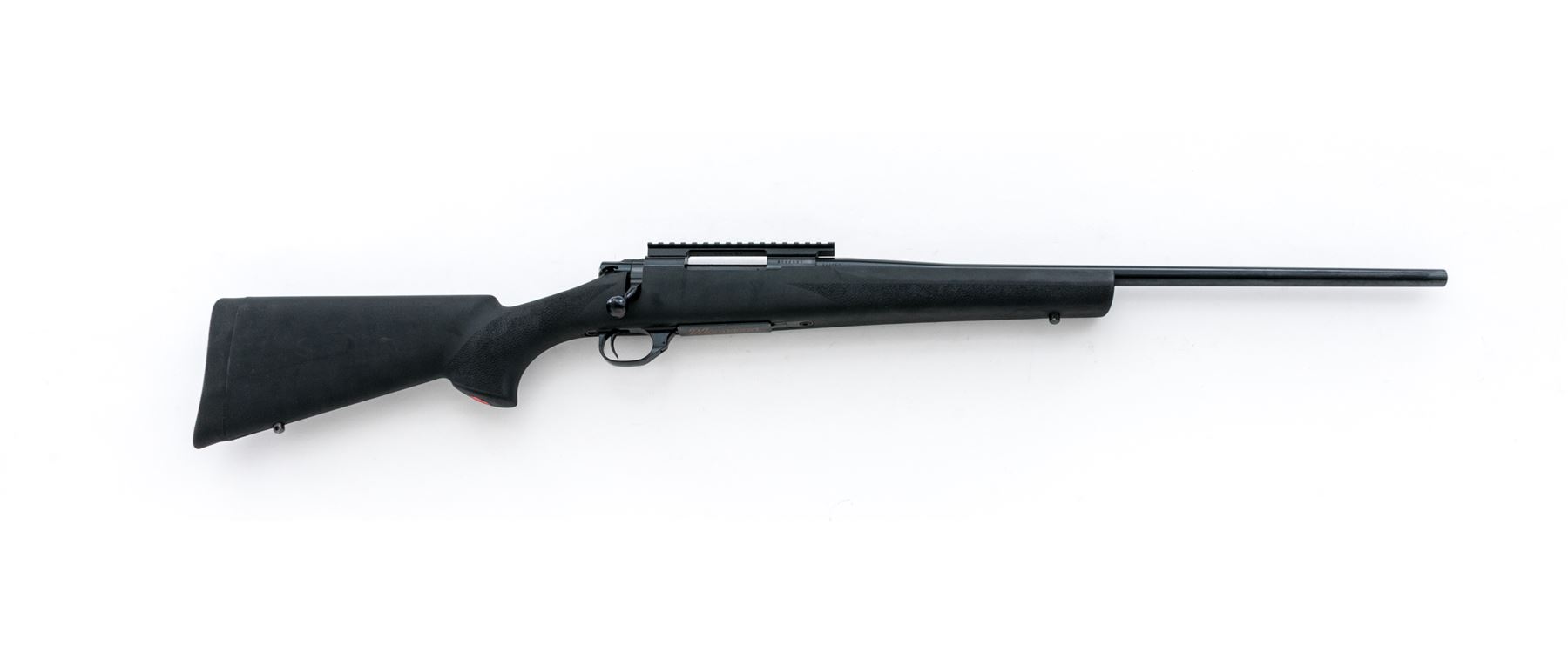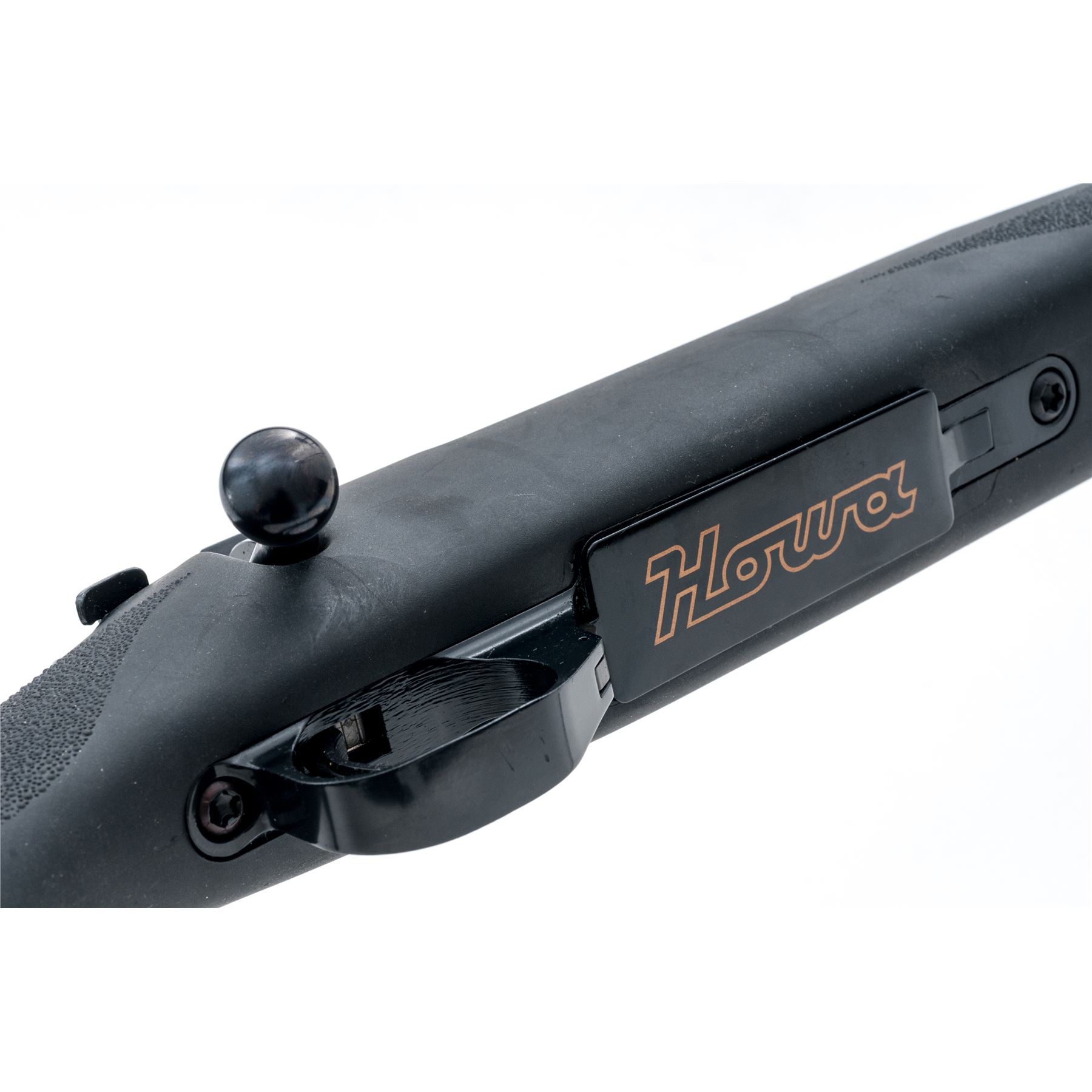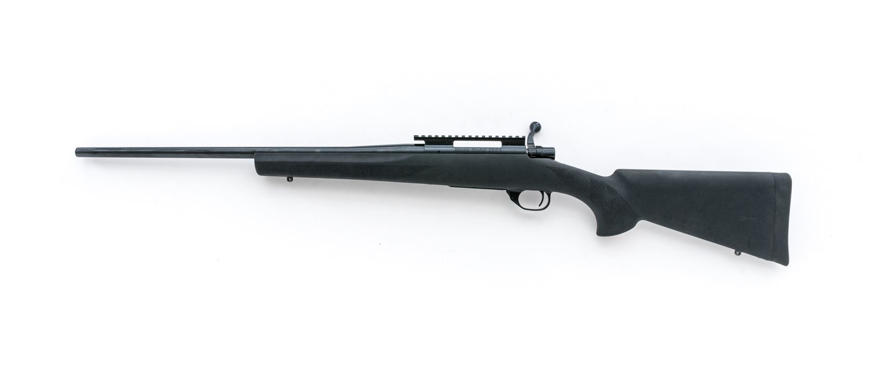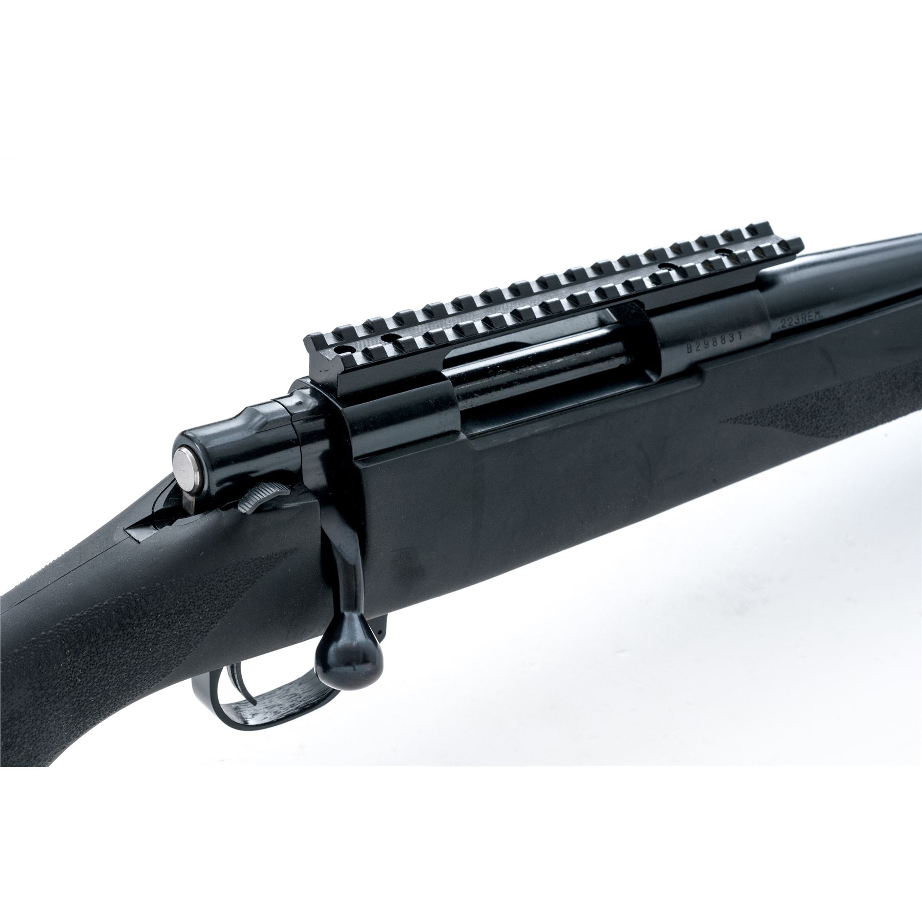 Howa Model 1500 Bolt Action Rifle, #B298831, .223 cal., 22'' barrel, blue finish, black synthetic pistol-grip stock with stippling at the forend and grip, black rubber Hogue recoil pad, and sling swivel studs. From the factory without sights; with a receiver mounted one-piece scope base. Marked on floorplate in gold lettering ''Howa''. Rifle is in excellent overall condition, retaining approx. 99%+ original blue finish; bottom of triggerguard with a few small scratches. Rubberized surface of stock with a few surface scuffs, stippling shows no signs of wear. Smooth action, bright clean bore with excellent rifling. Est.: $300-$450. (Modern)