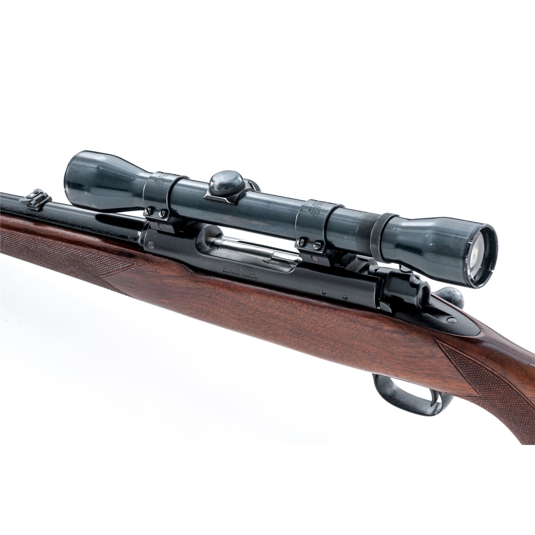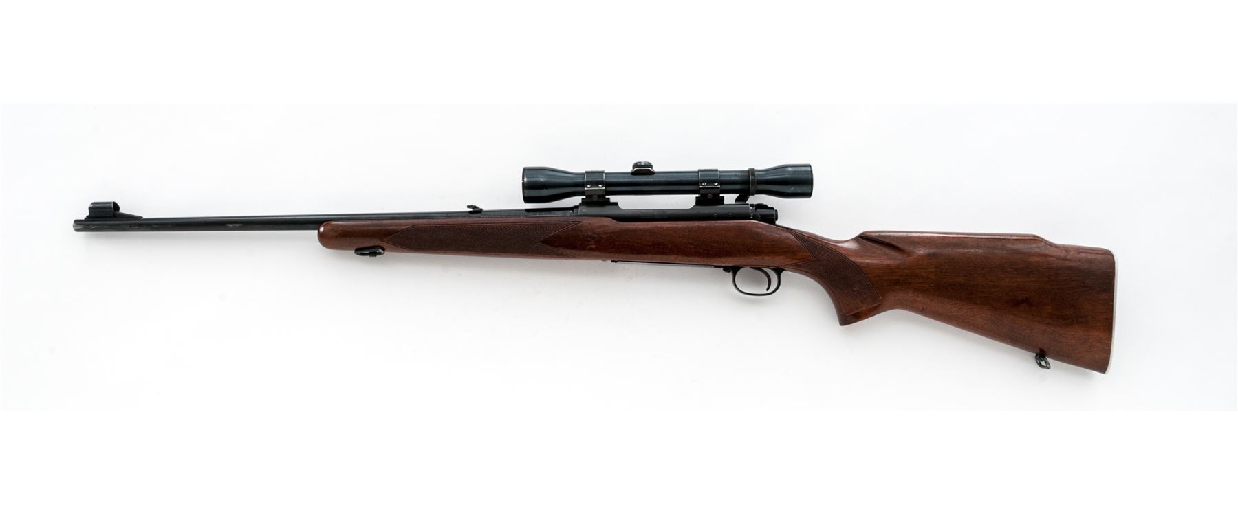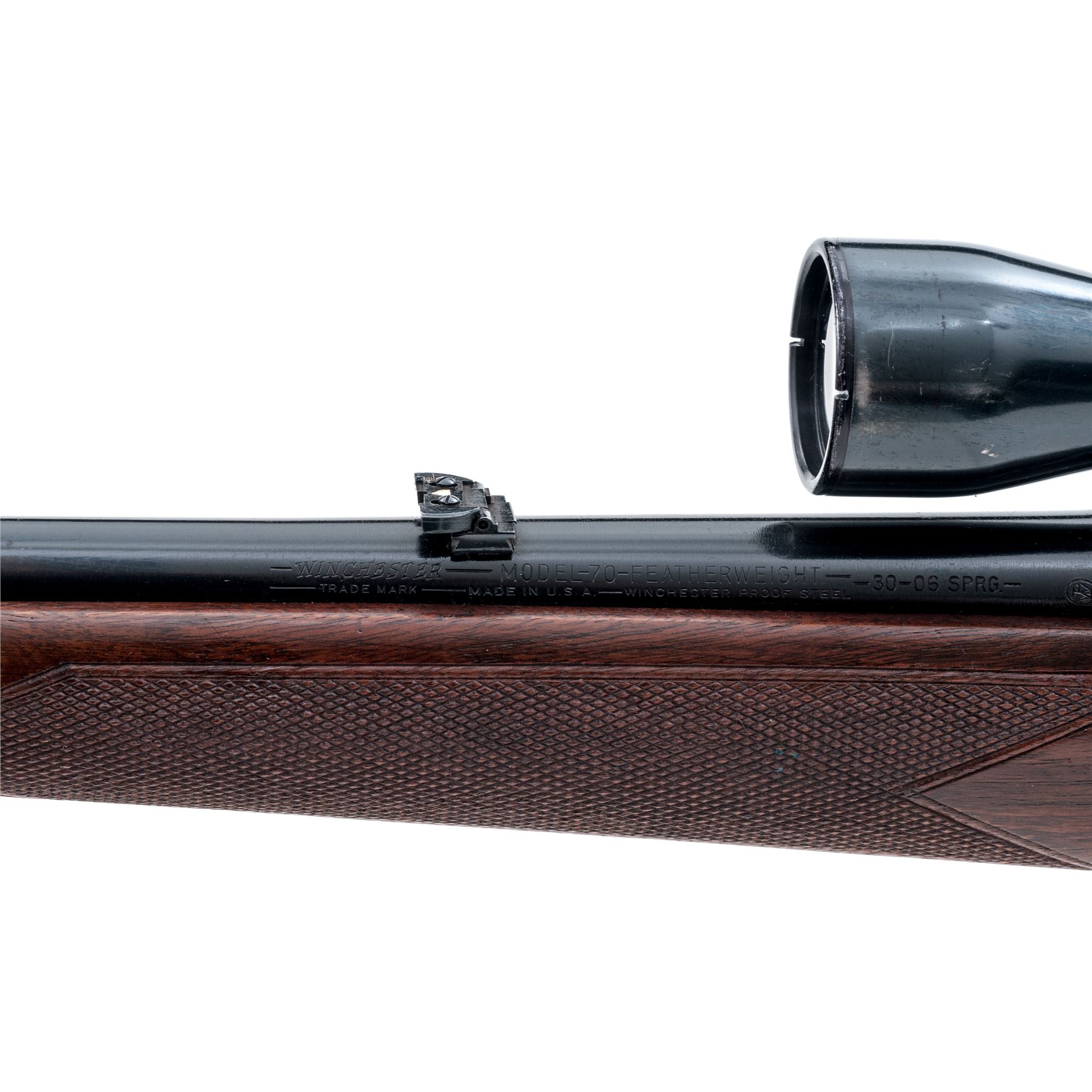 Pre-64 Winchester Model 70 Featherweight Bolt Action Rifle, #345823, .30-06 cal., 22'' barrel, blue finish, hollow bolt handle, aluminum floorplate and triggerguard, one-piece checkered walnut stock with Monte Carlo comb, pistol-grip, checkered aluminum ''widow's peak'' buttplate and sling swivels. Sights include a hooded silver bead front sight on ramped base and folding rear sight. Topped with a Weaver K4 scope on Weaver mount; scope with fine crosshair reticle and blue finish. Left side of barrel and receiver are both Winchester proofed. Mfg'd 1955. Condition is very good retaining approx. 90% original blue, with most of the losses to bolt handle, muzzle, and floorplate; floorplate has thinned and toned, barrel with scattered moderate scratches and handling marks, a few which have lightly rusted. Factory lettering is clear and defined. Stock retains 80% of its varnish with general scuffs and scratches, checkering with some light wear. Smooth action; bright, clean bore with excellent rifling. Scope with shallow scratches and minor thinning to the eye piece bell; optics are bright and clear. Overall a nice moderately used rifle. Est.: $600-$900. (C&R)