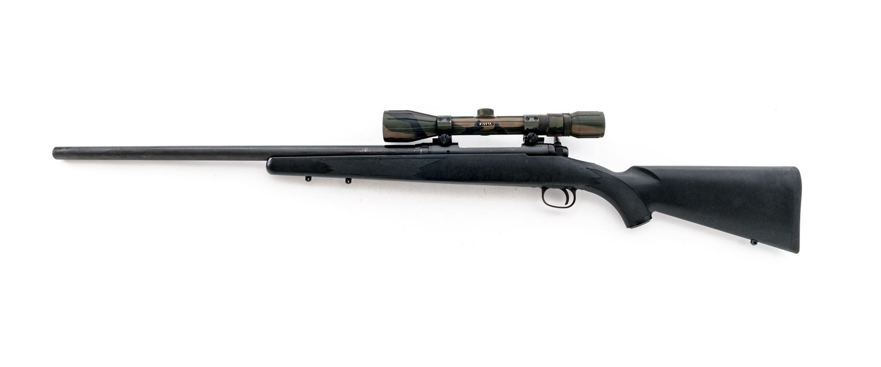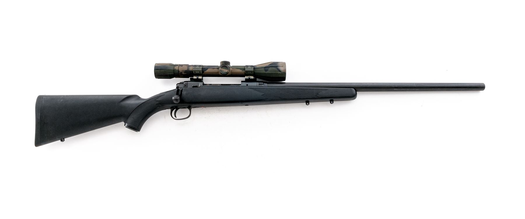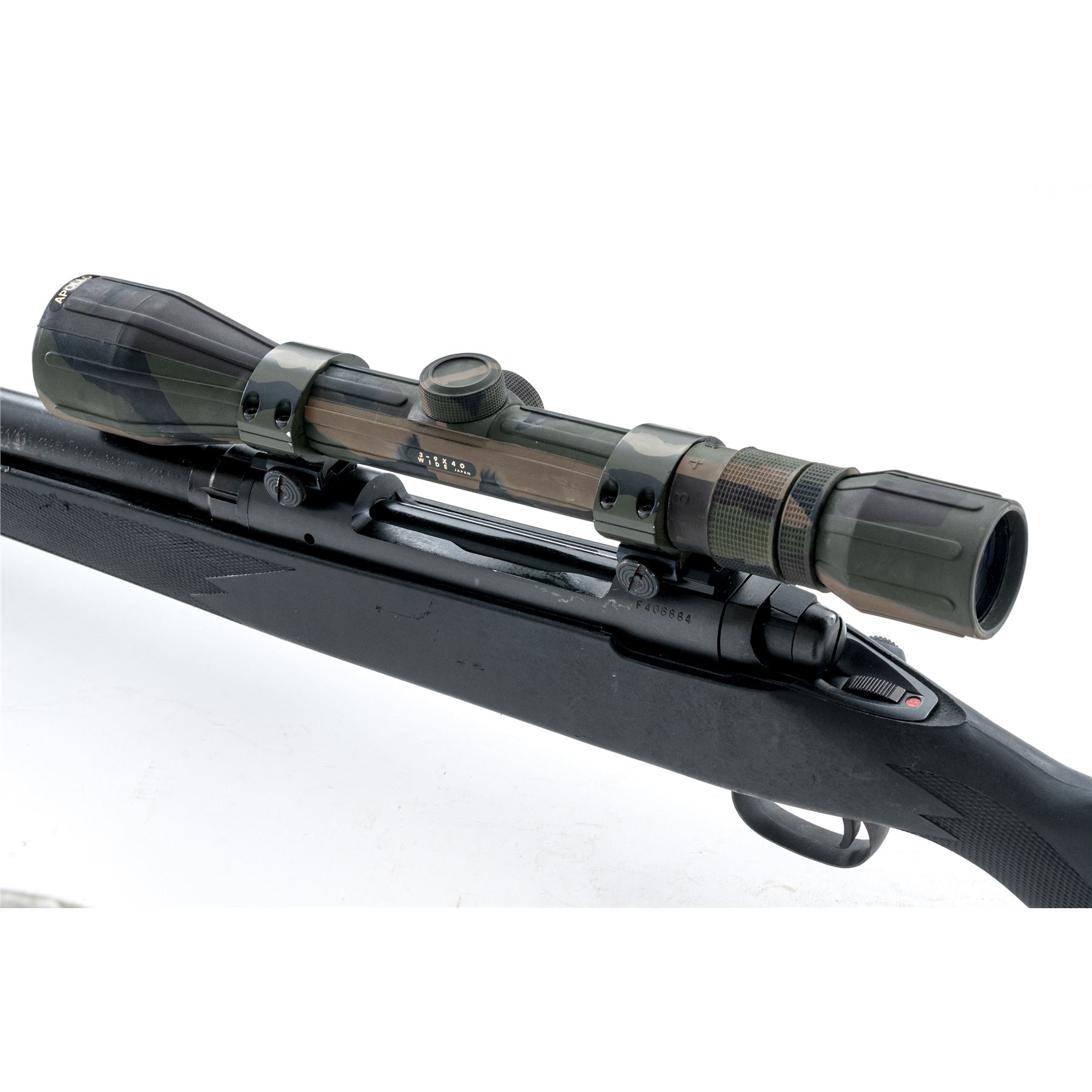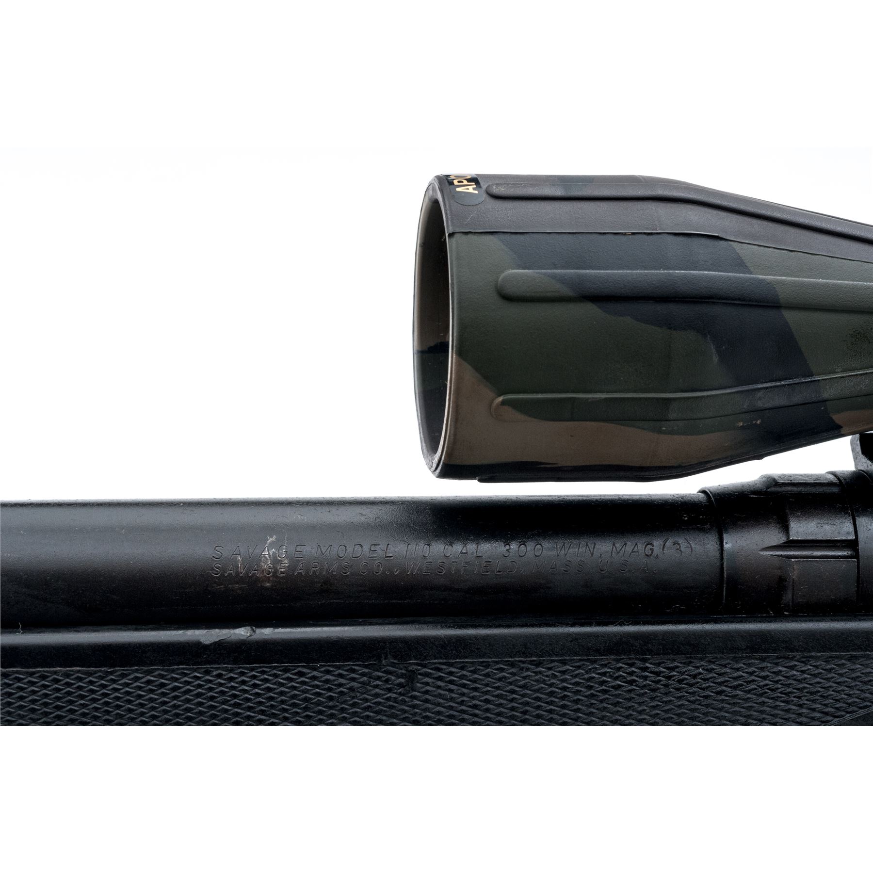 Savage Model 110FP Tactical Bolt Action Rifle, #F406884, .300 Win. mag. cal., 24'' heavy barrel, matte black finish, checkered black synthetic pistol-grip stock, Savage grip cap, black rubber recoil pad, and sling swivel studs; tang-mounted safety, from the factory without sights. Topped with a Apollo 3-9x40 scope; scope with protective rubber camouflage coating and duplex reticle. Made in Japan. Rifle is in very good overall condition with general light scuffs to the stock and metal; stock with a few larger scratches and impressions. Smooth action, bright bore with excellent rifling. Scope is excellent with crystal clear optics. Est.: $300-$400. (Modern)