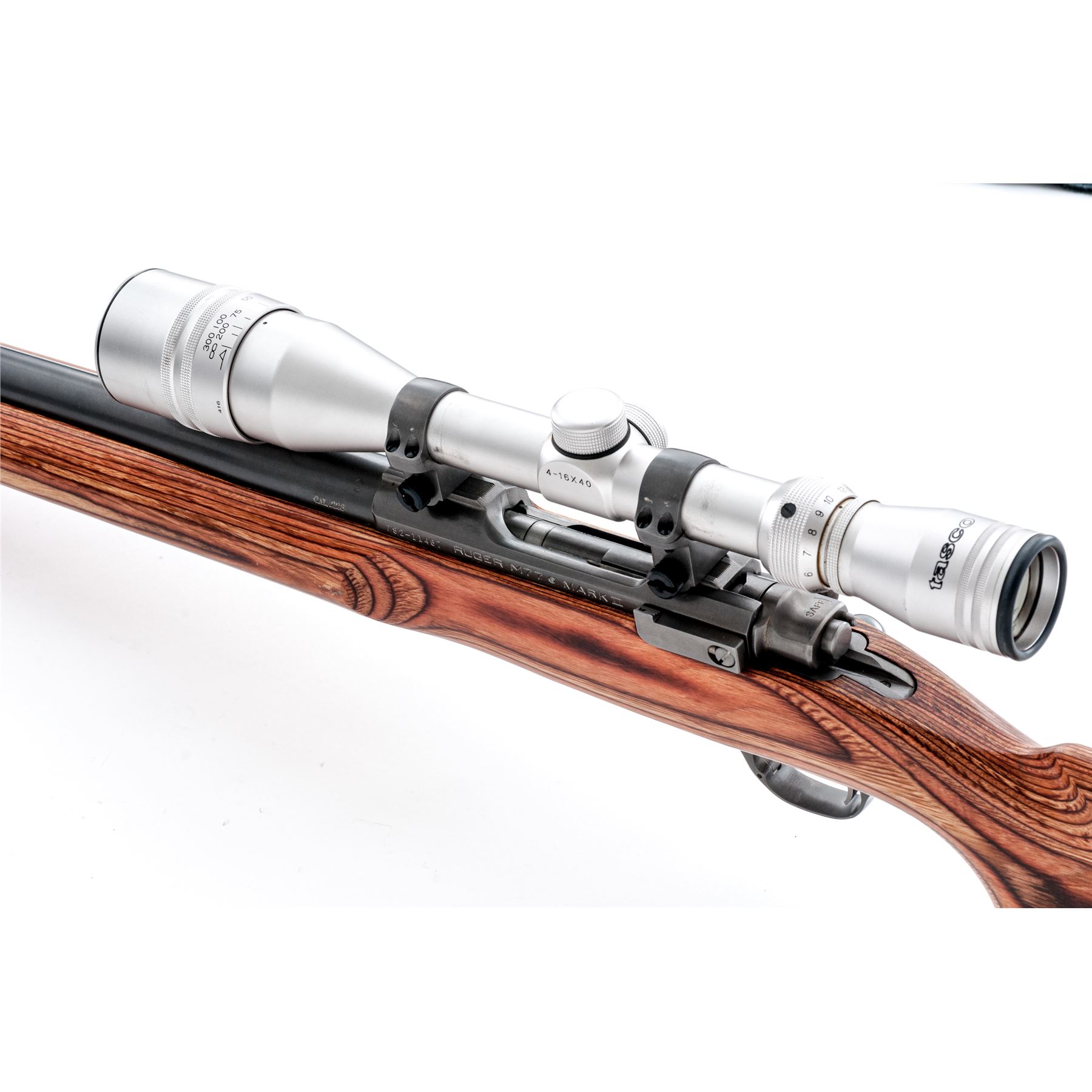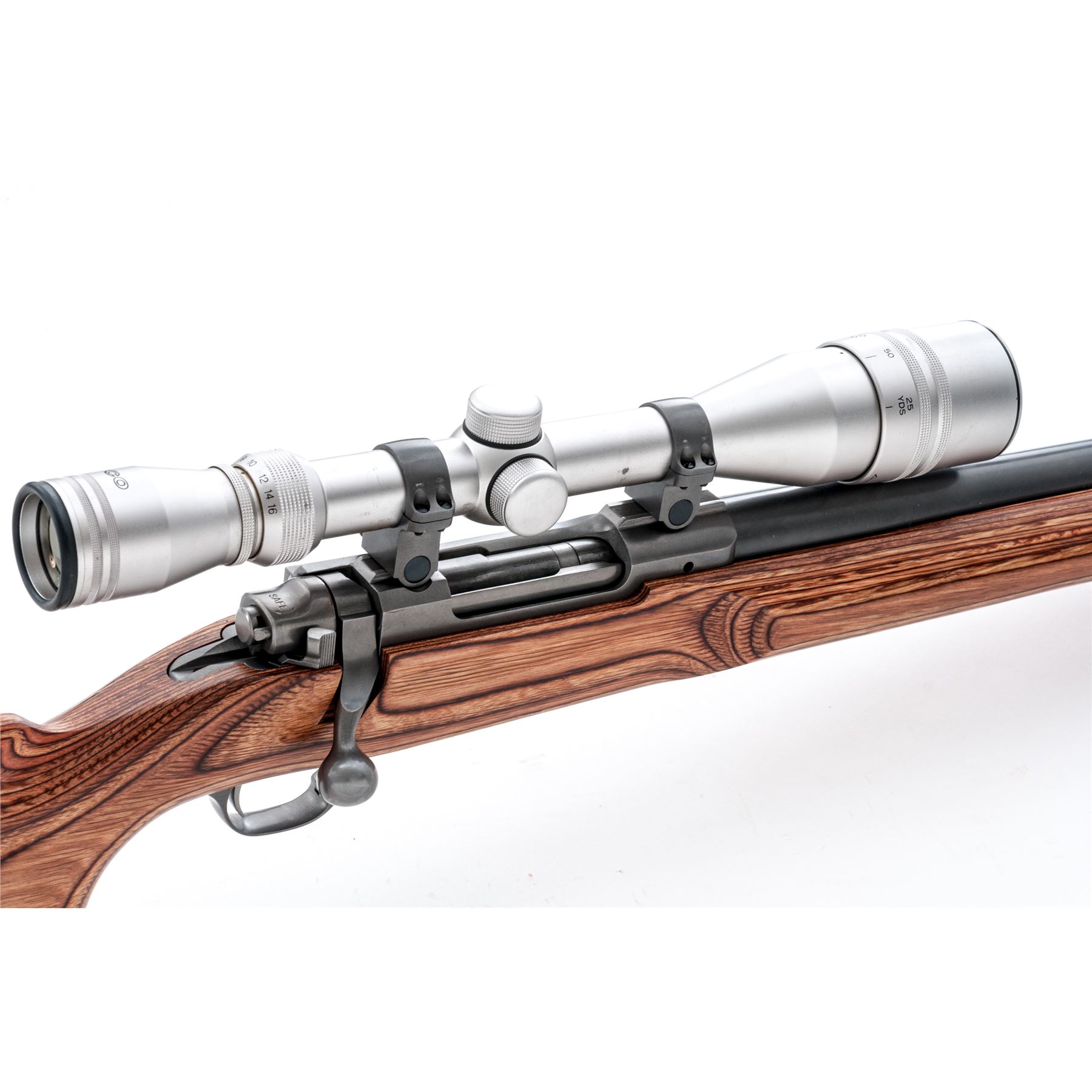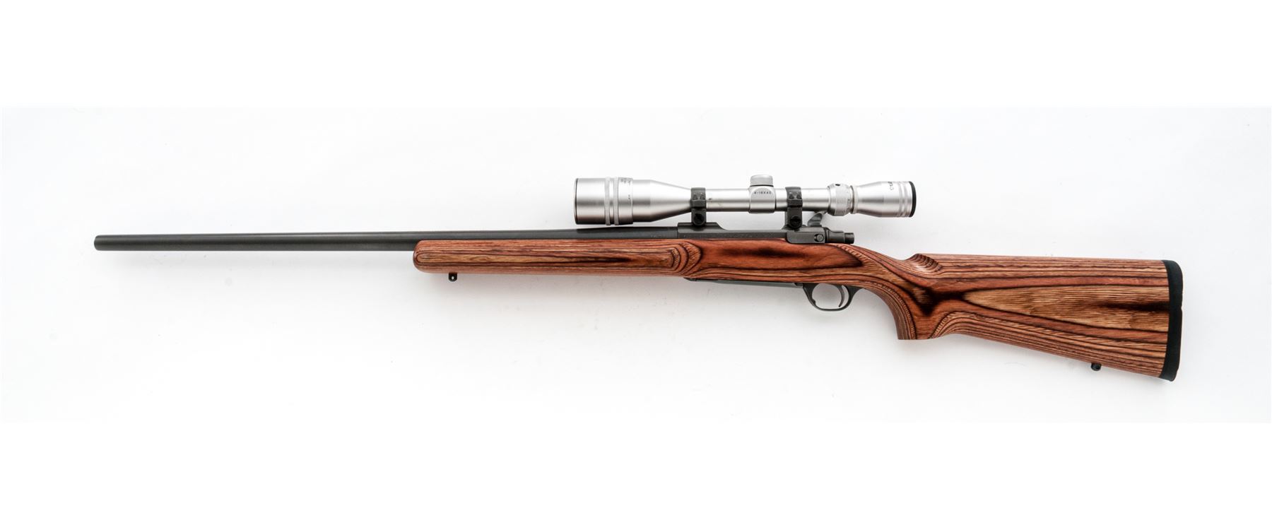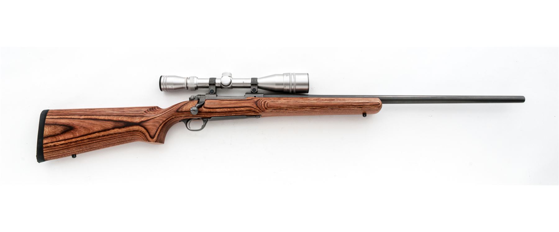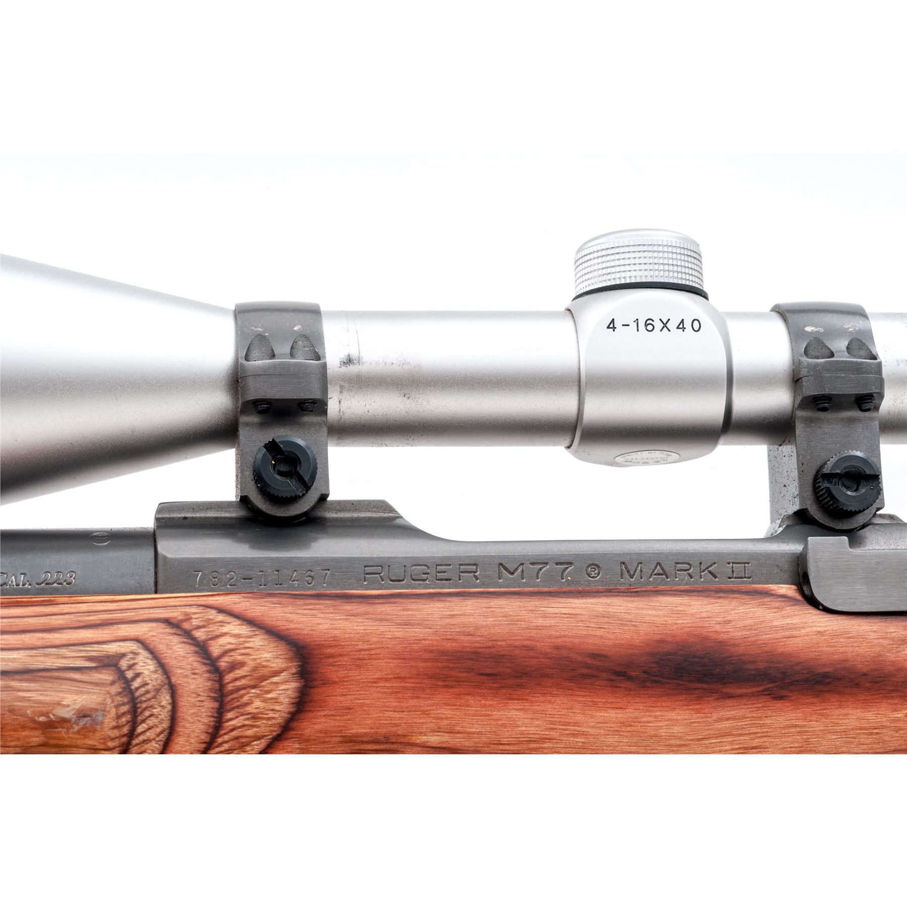 Ruger M77 Mark II (K77RVT) Bolt Action Rifle, #782-11467, .223 cal., 26'' tapered heavy barrel, target gray finish, brown pistol-grip laminate wood stock with wide target type forend, factory black rubber Ruger recoil pad, with sling swivel studs. From the factory without sights. Factory grooved receiver is topped with a Tasco 4-16x40 scope on target gray Ruger rings; scope with a duplex reticle and matte silver finish. This rifle is in excellent near new overall condition, retaining approx. 99% original finish. Stock with a few small handling marks, the most noticeable being on the lower left corner of the forend. Recoil pad with a couple of sizeable pressure dents along the upper half, they are purely cosmetic and the pad could easily be replaced if desired. Smooth action, bright bore with excellent rifling. Scope exterior with slight ring marks; optics are crystal clear. Est.: $500-$750. (Modern)