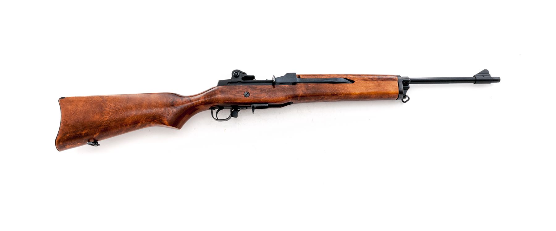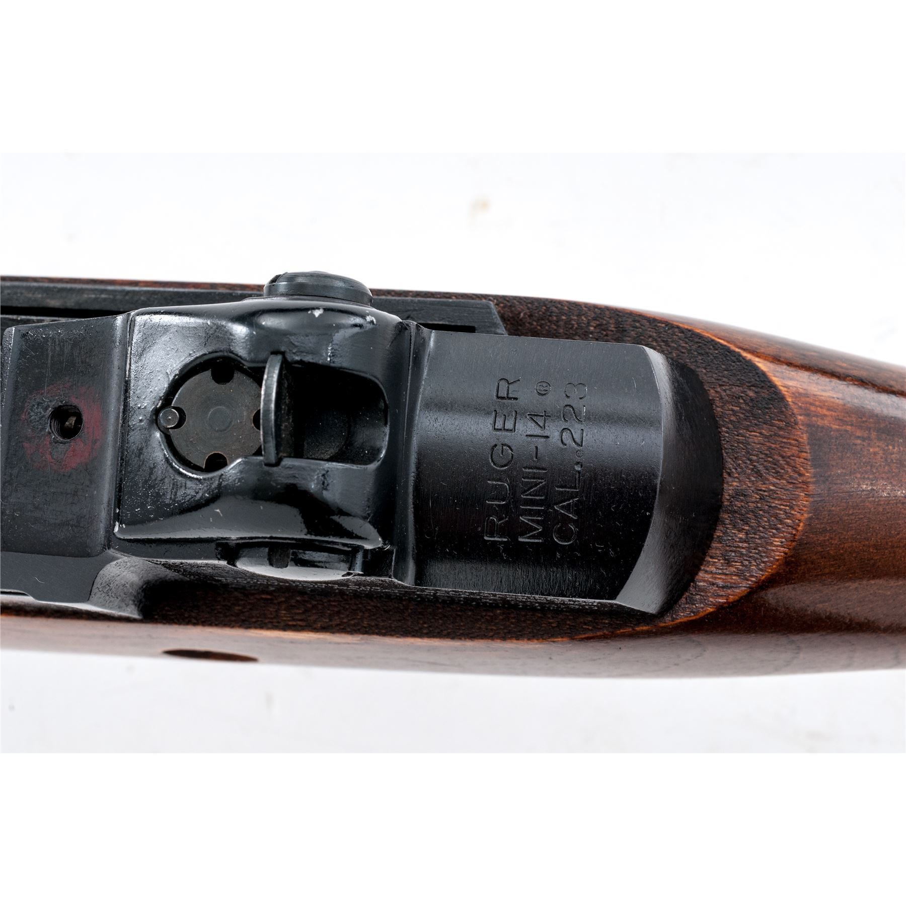 Ruger Mini-14 Semi-Automatic Rifle, #182-86393, .223 cal., 18.5'' barrel, blue finish, factory birch stock and upper handguard with black plastic buttplate, and sling swivels. Standard sights include a blade front and rear peep sight; no magazine. Top of receiver with two drilled and tapped holes, missing plug screws. Condition is very good retaining approx. 93%-95% metal finish; triggerguard with some speckled freckling. Stock with light handling marks and some thinning to the finish around the edges, most noticeable at the lower left edge below the receiver. Top of the upper handguard with a 1''x1/2'' spot that has been flattened, most likely to accommodate a scope. Smooth action, clean bore with excellent rifling. Est.: $300-$500. (Modern)