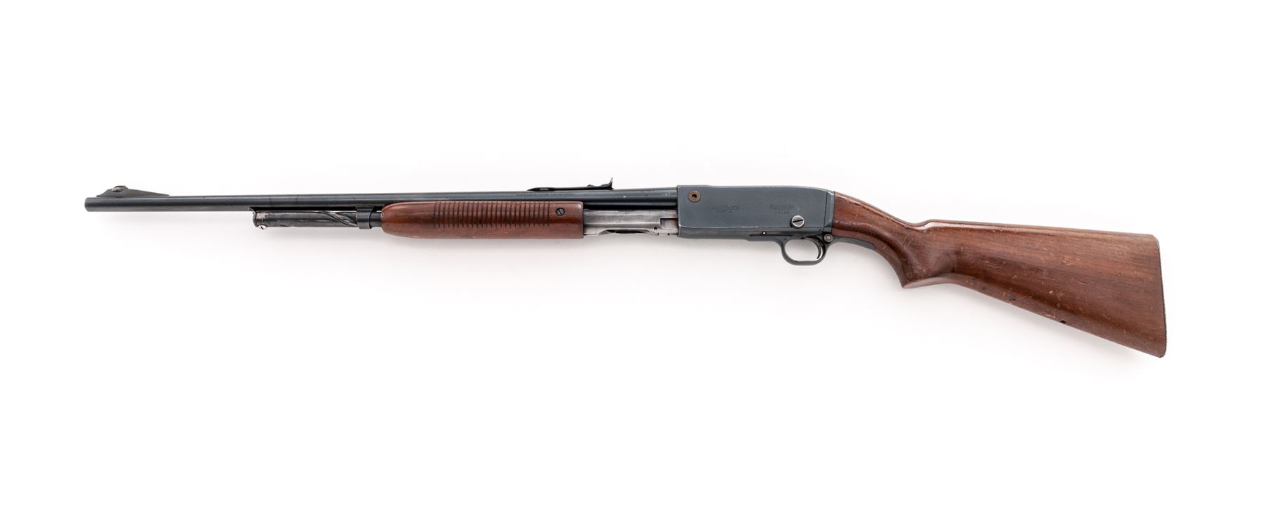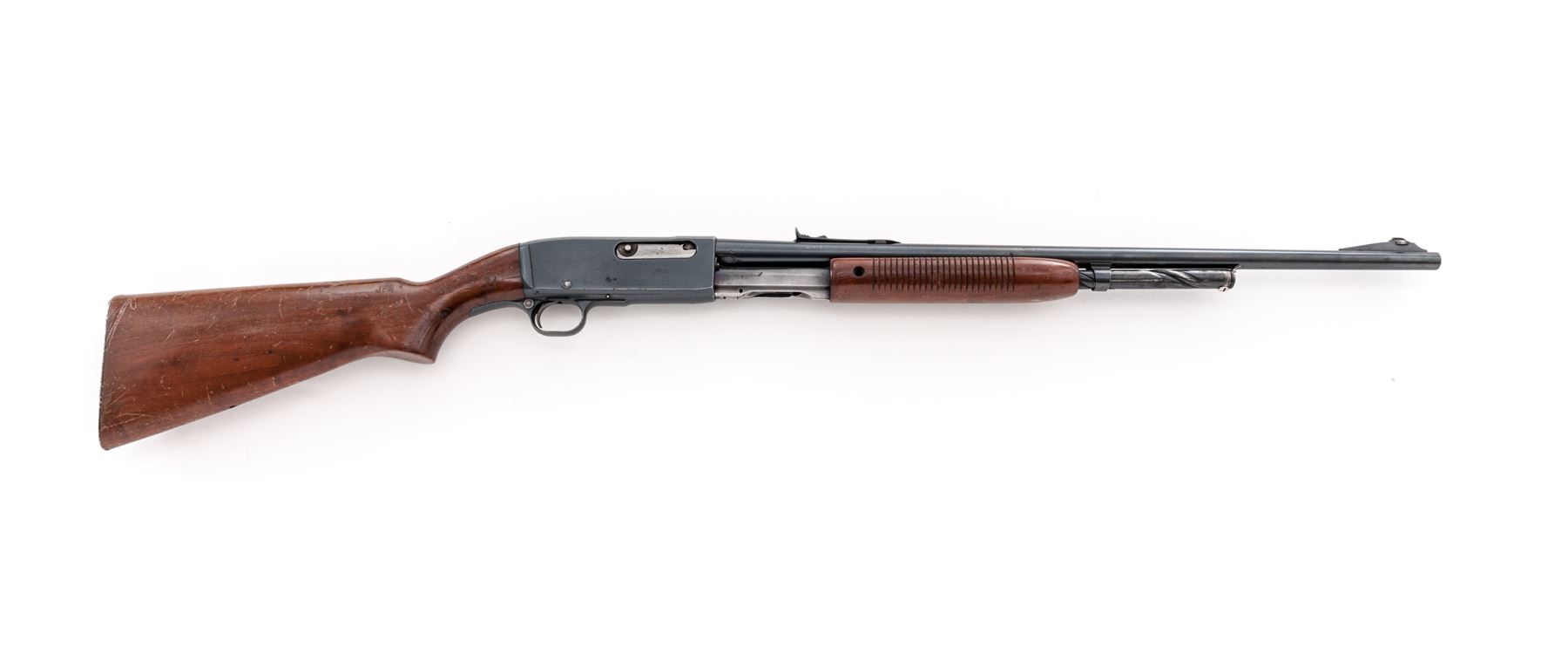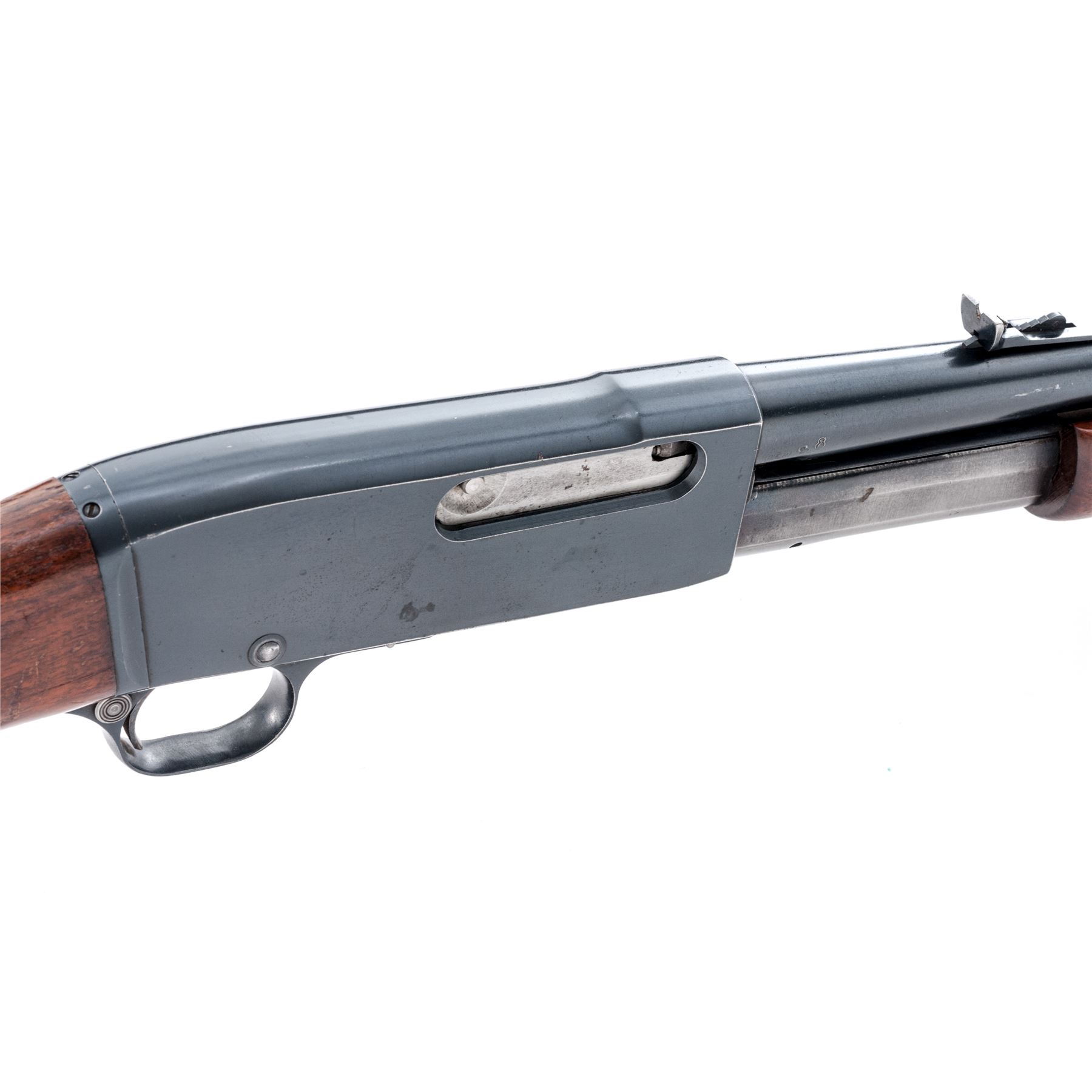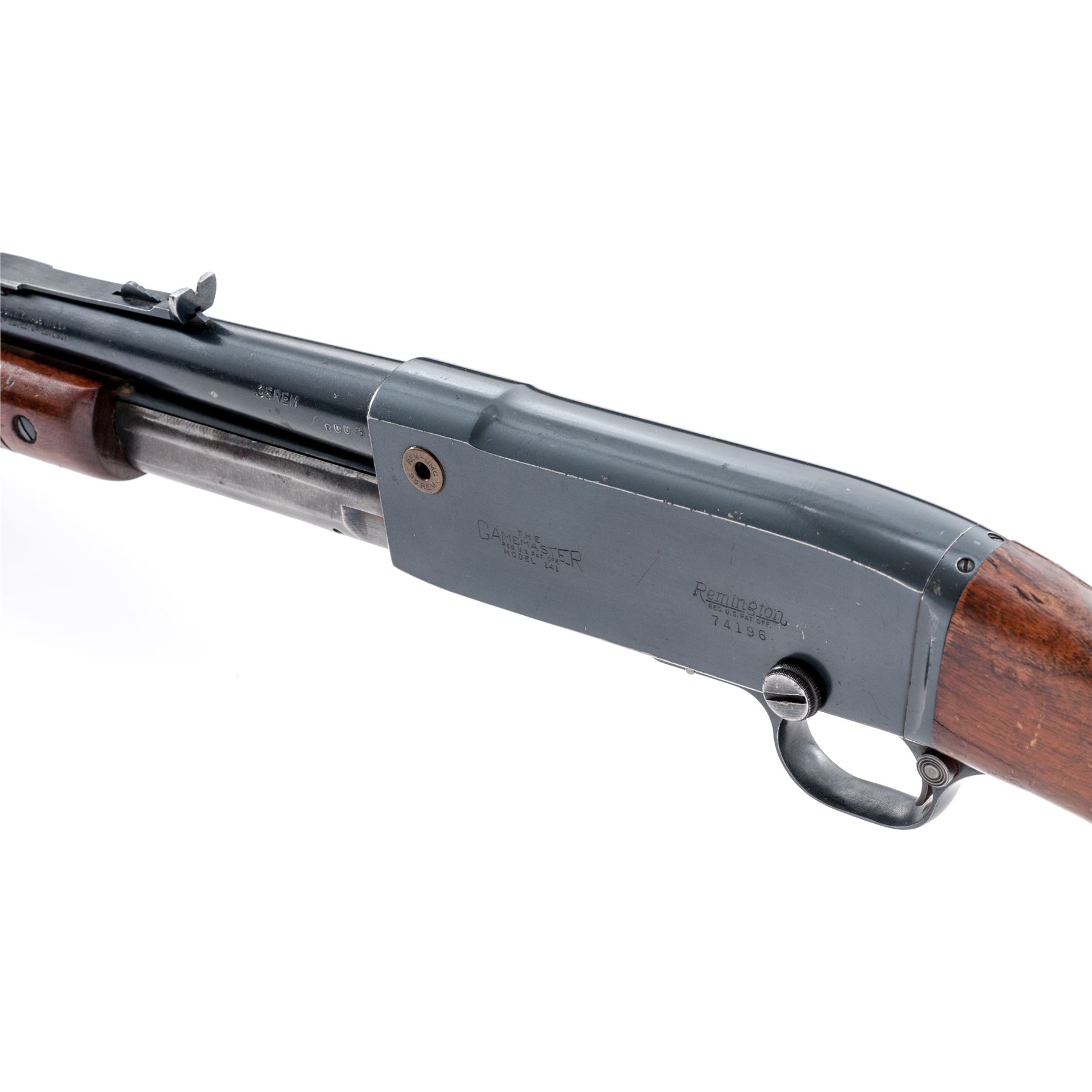 Remington Model 141 ''The Gamemaster'' Slide-Action Rifle, #74196, .35 Rem. cal., 23.5'' barrel, blue finish, walnut stock and forend. Condition is very good retaining approx. 92% blue to barrel and frame; mag tube about 65%. Stock with scattered general finish losses and small scratches overall. Forend is excellent, missing its right side screw. Good action, bright bore. Est.: $250-$450. (C&R)