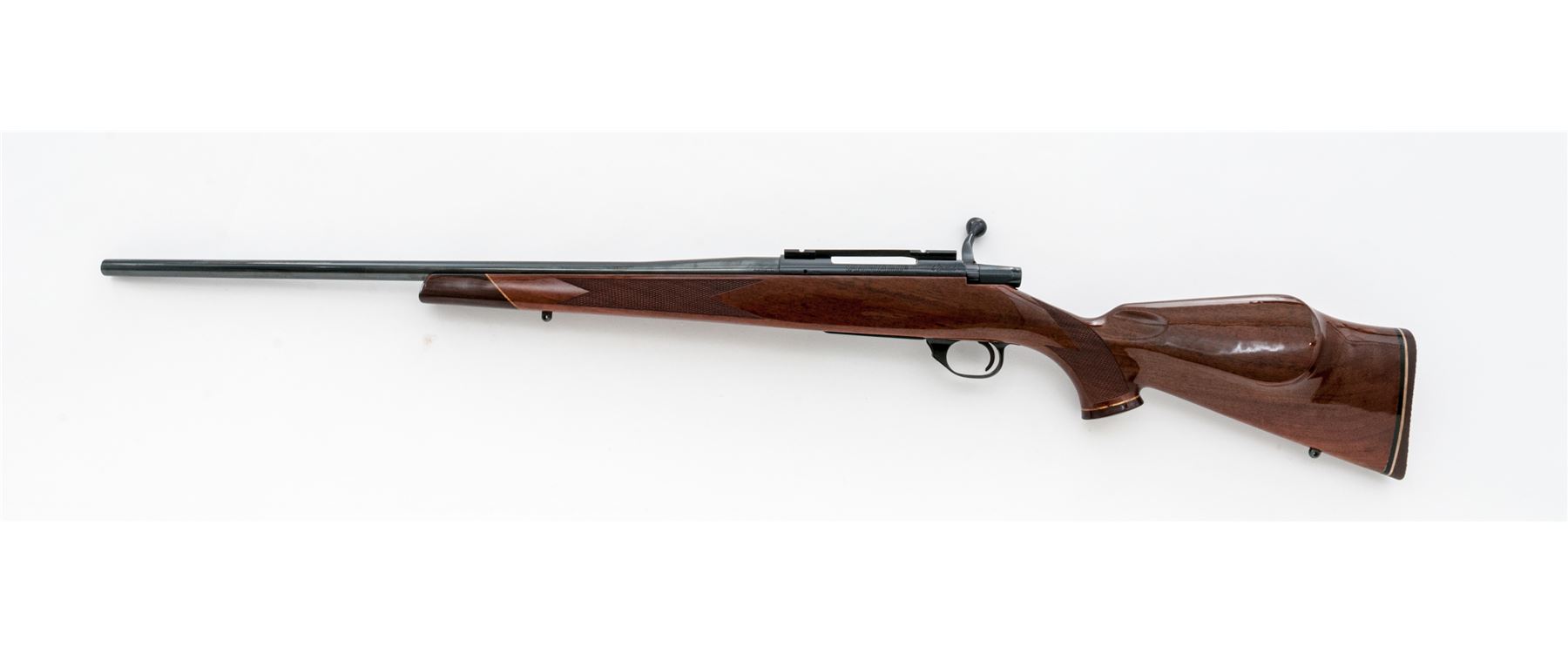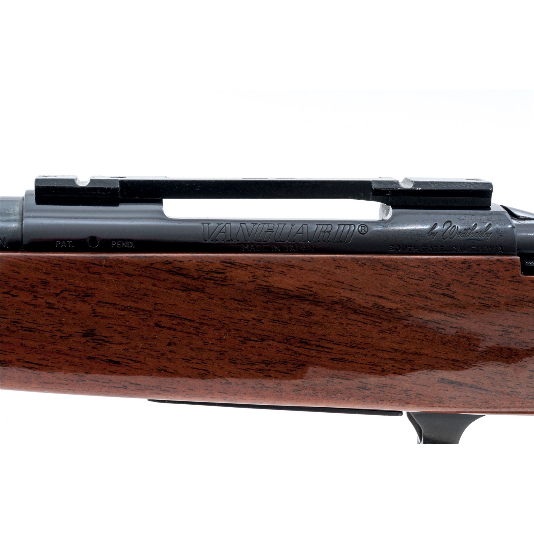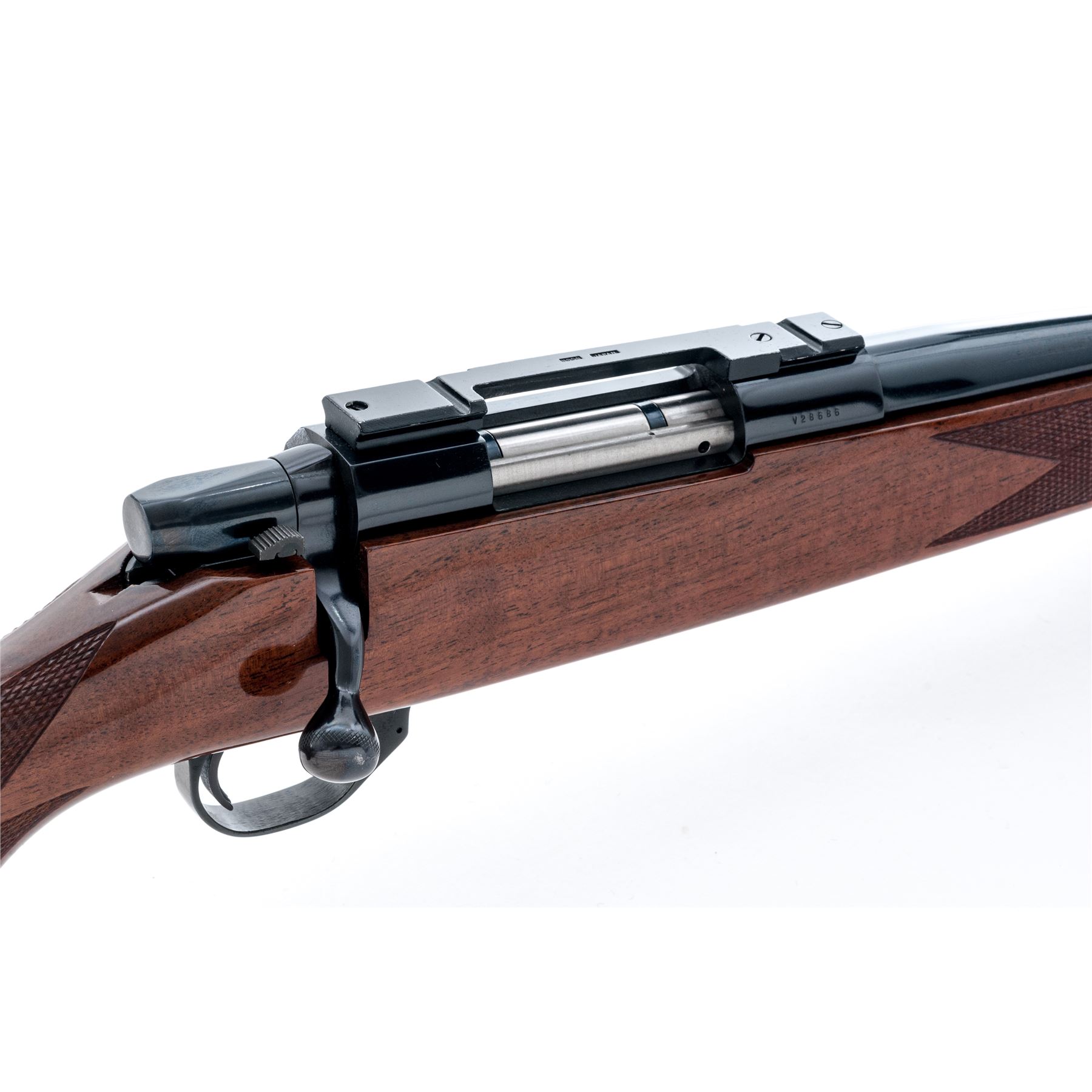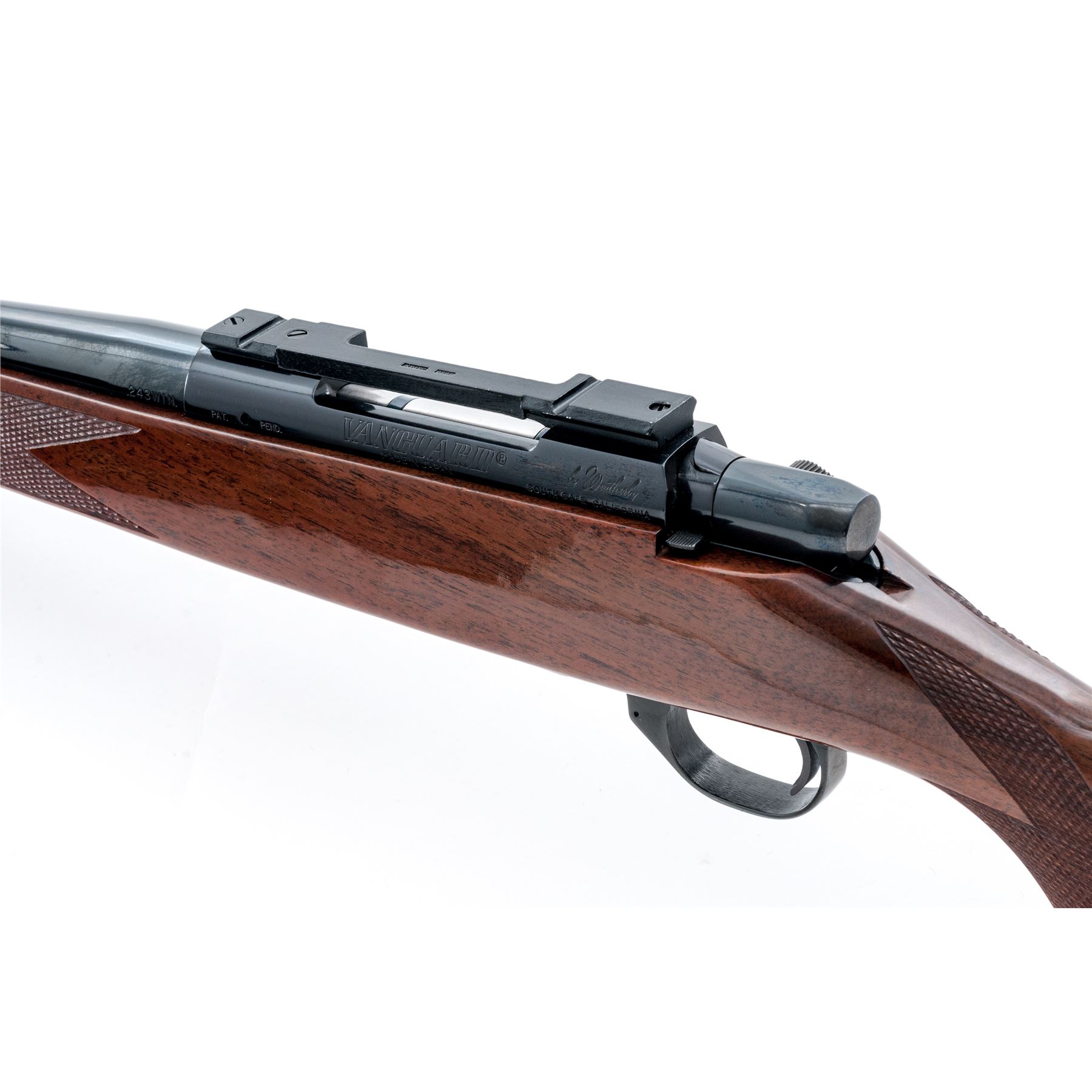 Weatherby Vanguard Deluxe Bolt Action Rifle, #V28686, .243 cal., 24'' barrel, high polish blue finish, mfg'd without sights; top of receiver with a one-piece scope base; one-piece pistol-grip walnut stock with Monte Carlo comb, checkering at the wrist and forend, rosewood forend and grip cap with white diamond insert, brown rubber basketweave pattern pad, and sling swivel studs. Made in Japan. Approx. 99%+ original wood and metal finish remains and rifle is in excellent overall condition. Stock with only light handling marks near the forend, cheekpiece, and around edge of grip cap; checkering is crisp. Smooth action, bright bore with excellent rifling. Scope base with light edge wear. Est.: $500-$700. (Modern)