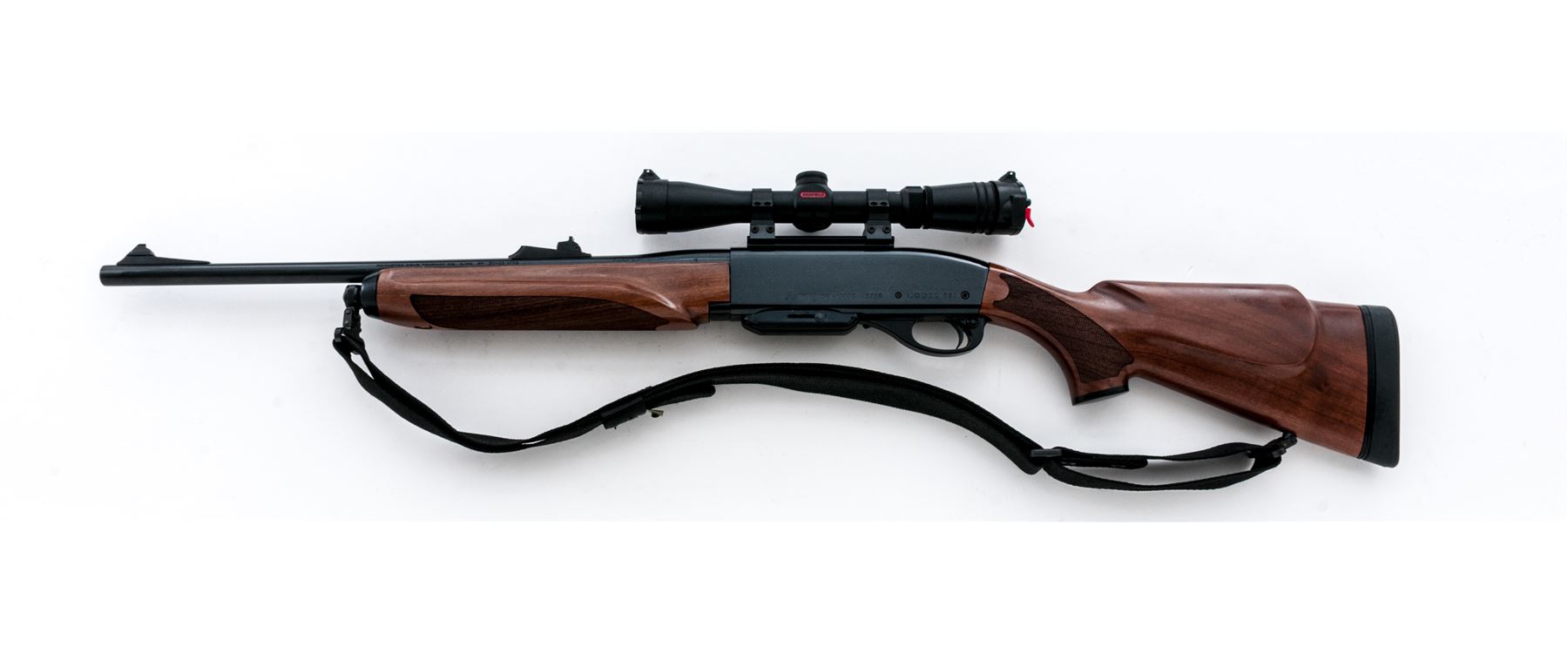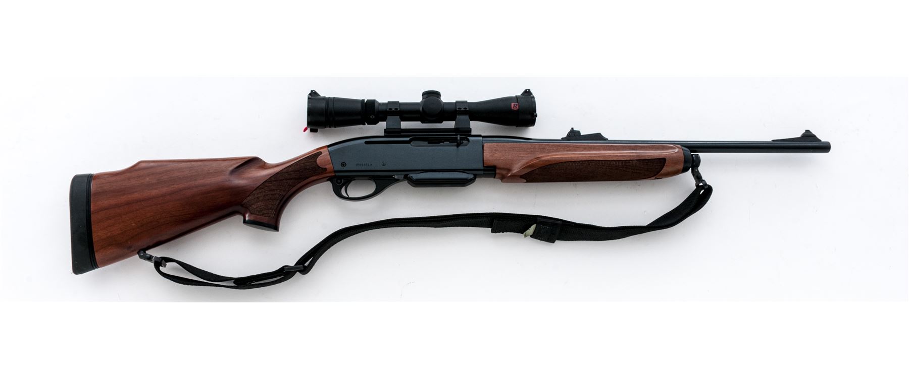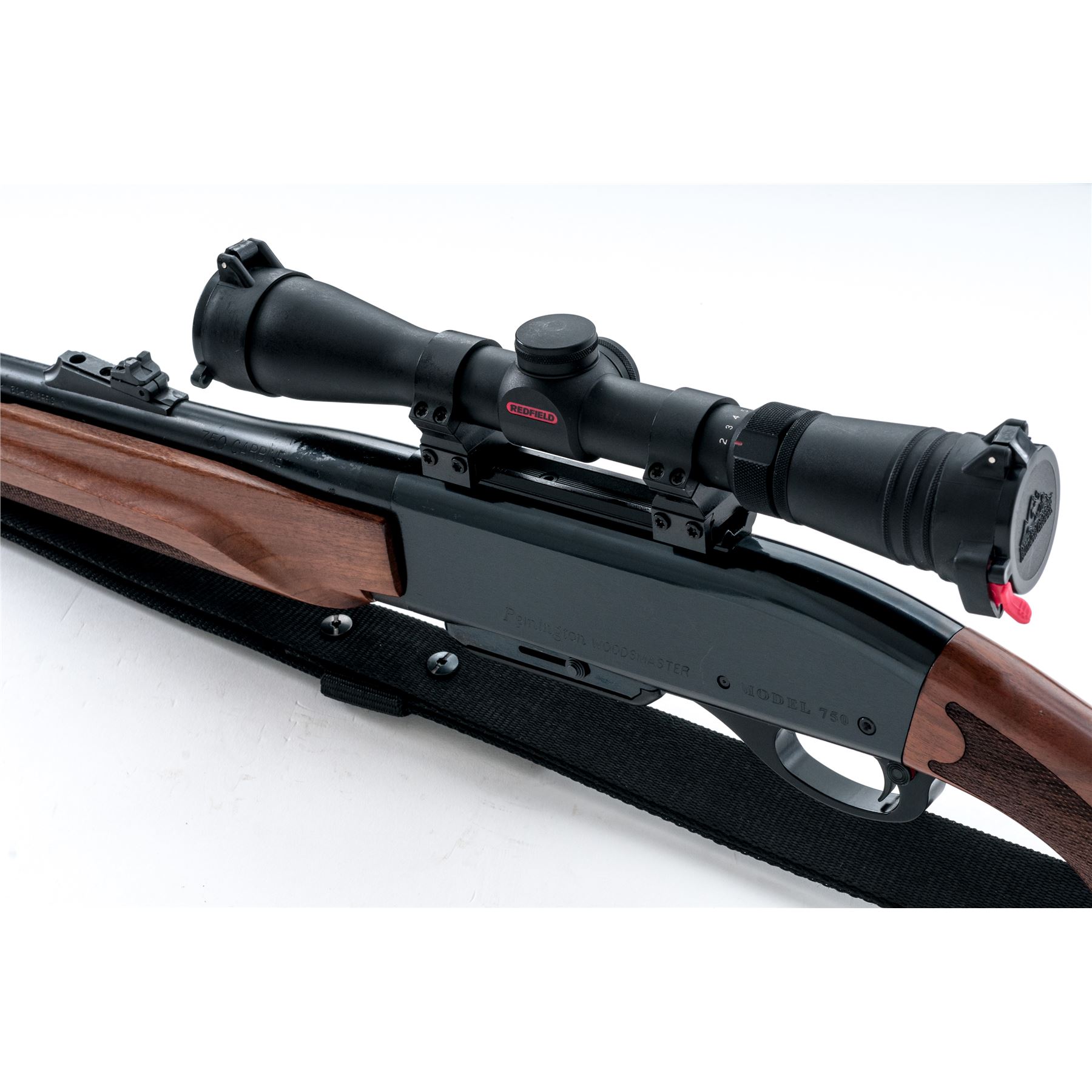 Remington Model 750 Woodmaster Carbine Semi-Automatic Rifle, with Redfield scope, #RR01473V, .30-06 cal., 18.5'' barrel, blue finish, two-piece checkered pistol-grip walnut stock with cheekpiece, finger-grooved forend, plain black grip cap, black rubber Remington recoil pad, sling swivels, black nylon sling. Blade front sight is finished with a white bead; adjustable rear sight is on a ramped base. Includes one magazine. Topped with a Redfield Revolution 2-7x33 scope with an Accu-Range reticle, 1'' tube, matte black finish, and Butler Creek flip-up covers. Condition is near excellent with approx. 98%+ original finish on the wood and metal. Left side of receiver with a few light scratches; factory lettering is crisp. Buttstock with a few small dents to the right side; checkering is sharp and unmarred; forend with only a few very minor handling marks. Smooth action, bright bore is clean with excellent defined rifling. Scope appears near new with crystal clear optics. Est.: $600-$800. (Modern)