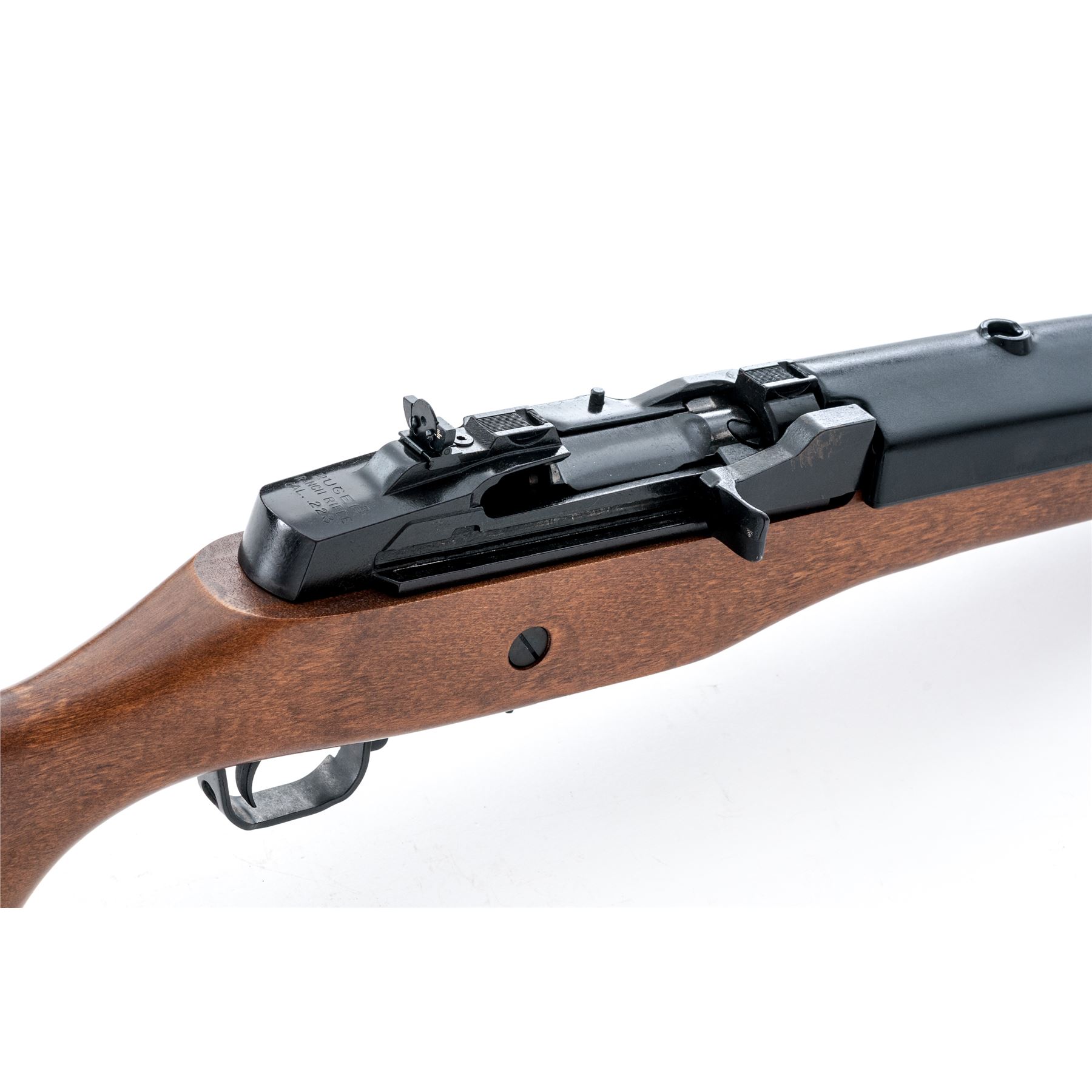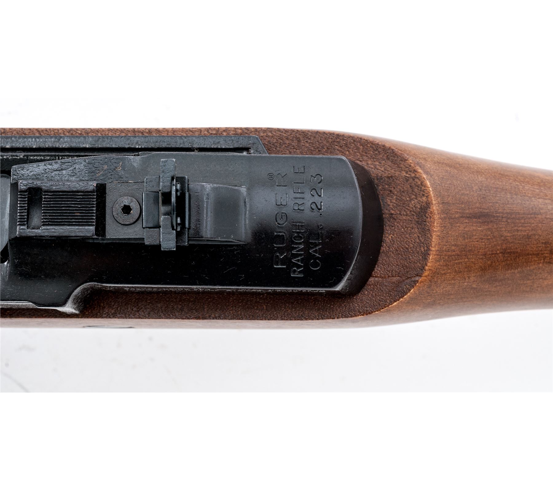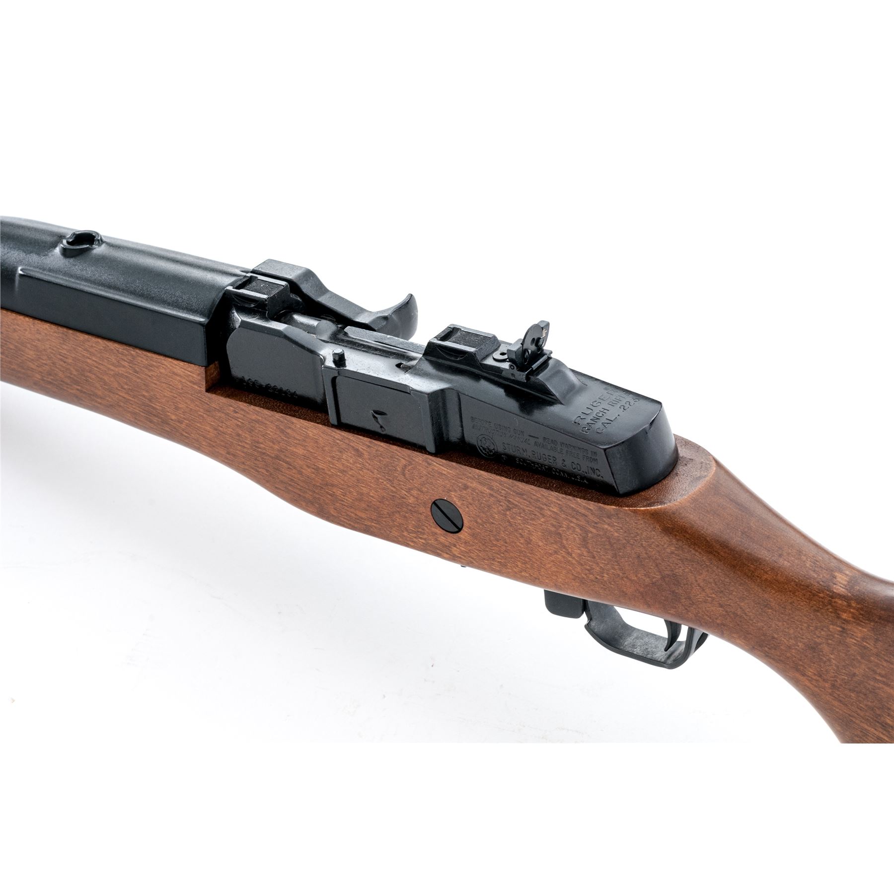 Ruger Mini-14 Semi-Automatic Ranch Rifle, #195-22184, .223 cal., 18.5'' barrel, blue finish, pistol-grip birch stock, factory black plastic buttplate, black upper handguard, fixed blade front sight and folding rear sight, with sling swivels, and one factory 5-round magazine. Condition is excellent appearing near new. Slide with a spot of mild thinning to the finish and otherwise this rifle shows only a few insignificant handling marks. Smooth action, bright bore with sharp rifling. Est.: $500-$700. (Modern)