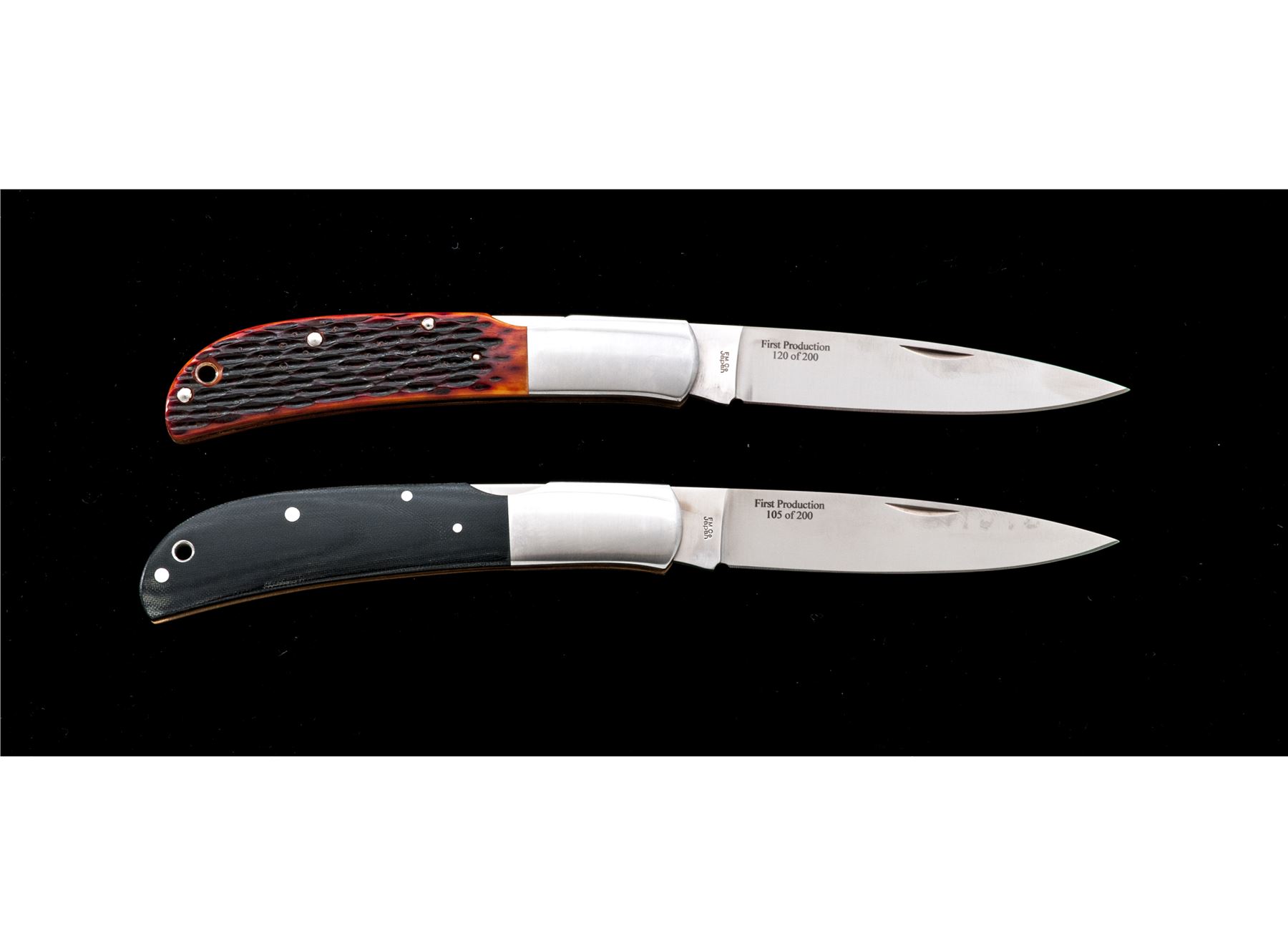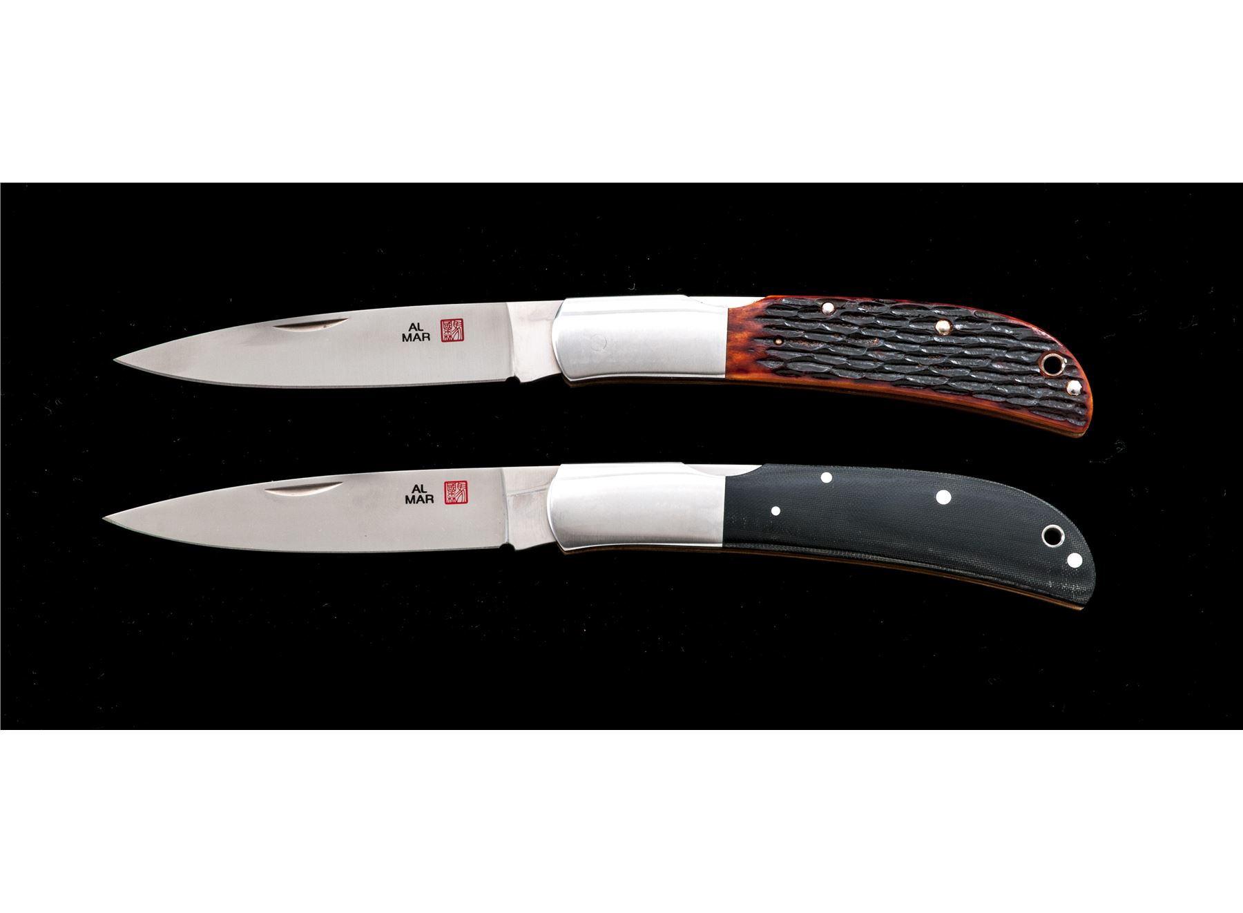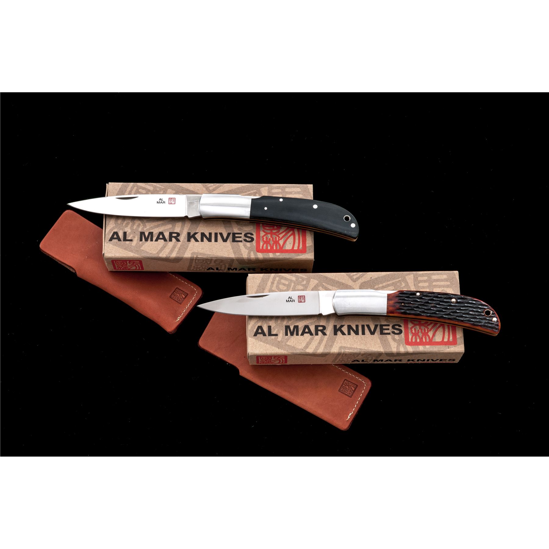Lot of Two (2) New In Box First Production Run Al Mar Folding Knives: 1.) #1005BM Eagle Classic, 4'' satin finished blade with nail nick, blade is marked ''105 of 200'', 4-7/8'' overall closed length, mid-lock mechanism, satin finished stainless bolsters, and black micarta grips. In original two-piece box that is numbered to the knife with the original tan leather Al Mar sheath. Made in Japan. 2.) #1005HJB Eagle Classic, 4'' satin finished blade with nail nick, blade is marked ''120 of 200'', 4-7/8'' overall closed length, mid-lock mechanism, satin finished stainless bolsters, and honey jigged bone grips. In original two-piece box that is numbered to the knife with the original tan leather Al Mar sheath. Made in Japan. Both are in new condition, never carried or sharpened. Est.: $300-$400/lot.