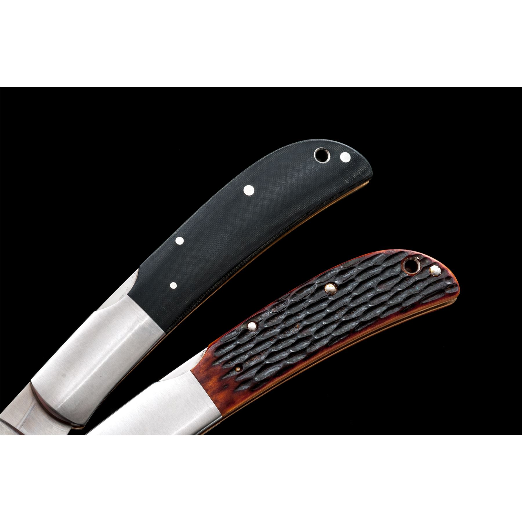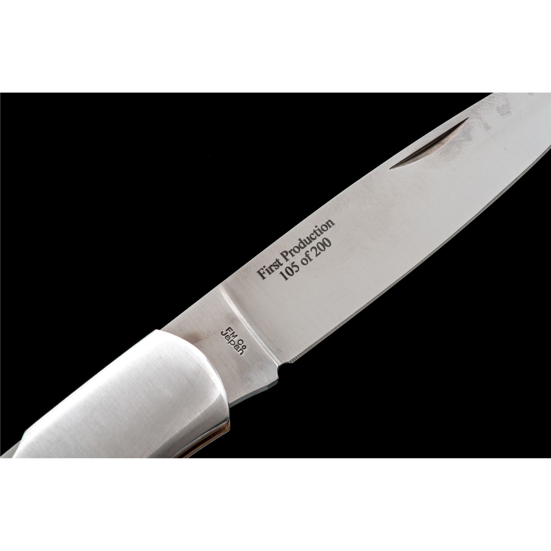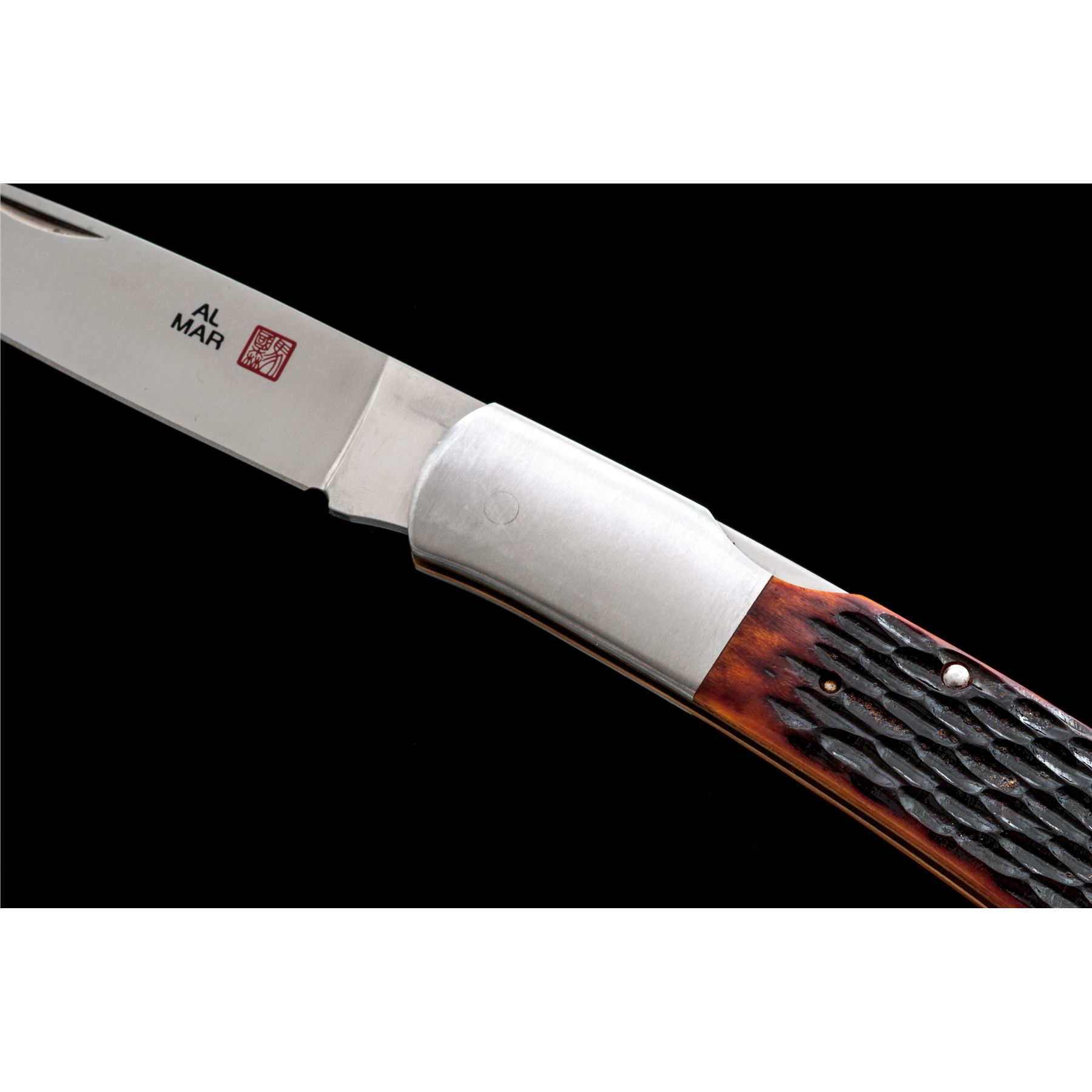 Lot of Two (2) New In Box First Production Run Al Mar Folding Knives: 1.) #1005BM Eagle Classic, 4'' satin finished blade with nail nick, blade is marked ''105 of 200'', 4-7/8'' overall closed length, mid-lock mechanism, satin finished stainless bolsters, and black micarta grips. In original two-piece box that is numbered to the knife with the original tan leather Al Mar sheath. Made in Japan. 2.) #1005HJB Eagle Classic, 4'' satin finished blade with nail nick, blade is marked ''120 of 200'', 4-7/8'' overall closed length, mid-lock mechanism, satin finished stainless bolsters, and honey jigged bone grips. In original two-piece box that is numbered to the knife with the original tan leather Al Mar sheath. Made in Japan. Both are in new condition, never carried or sharpened. Est.: $300-$400/lot.