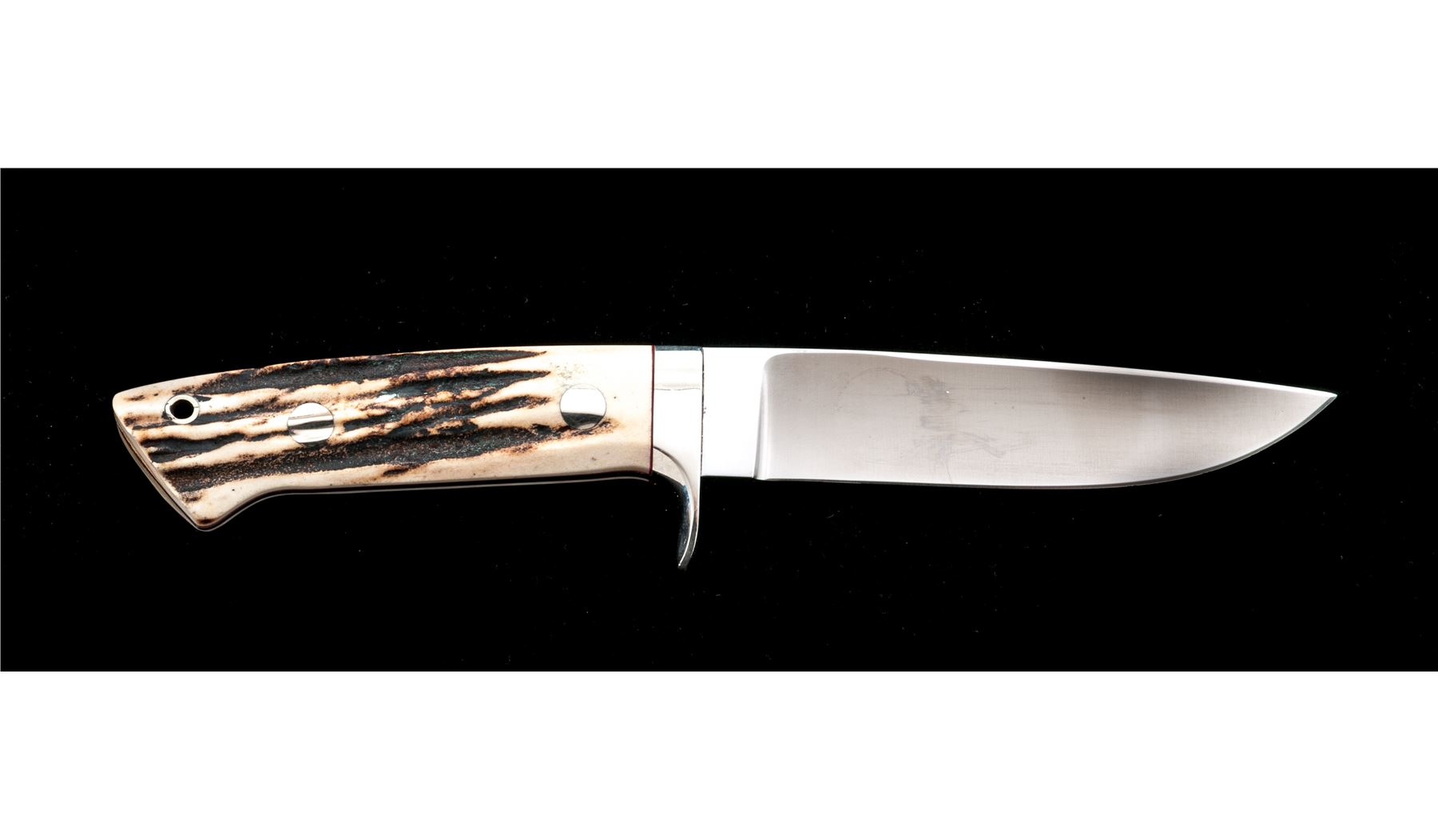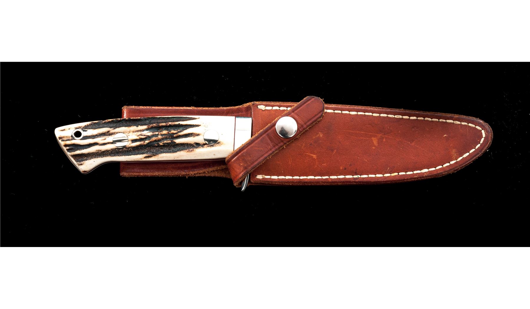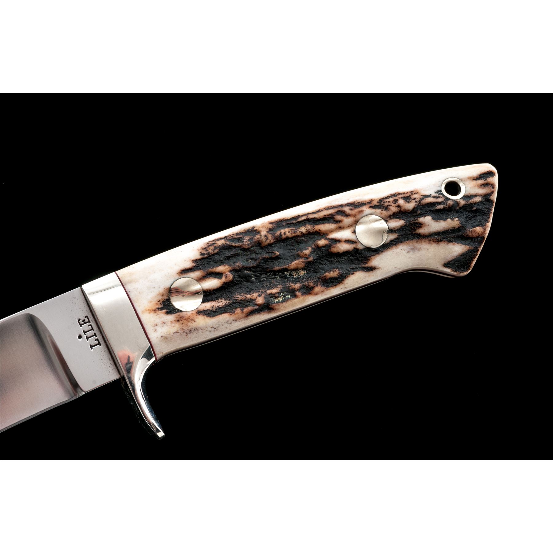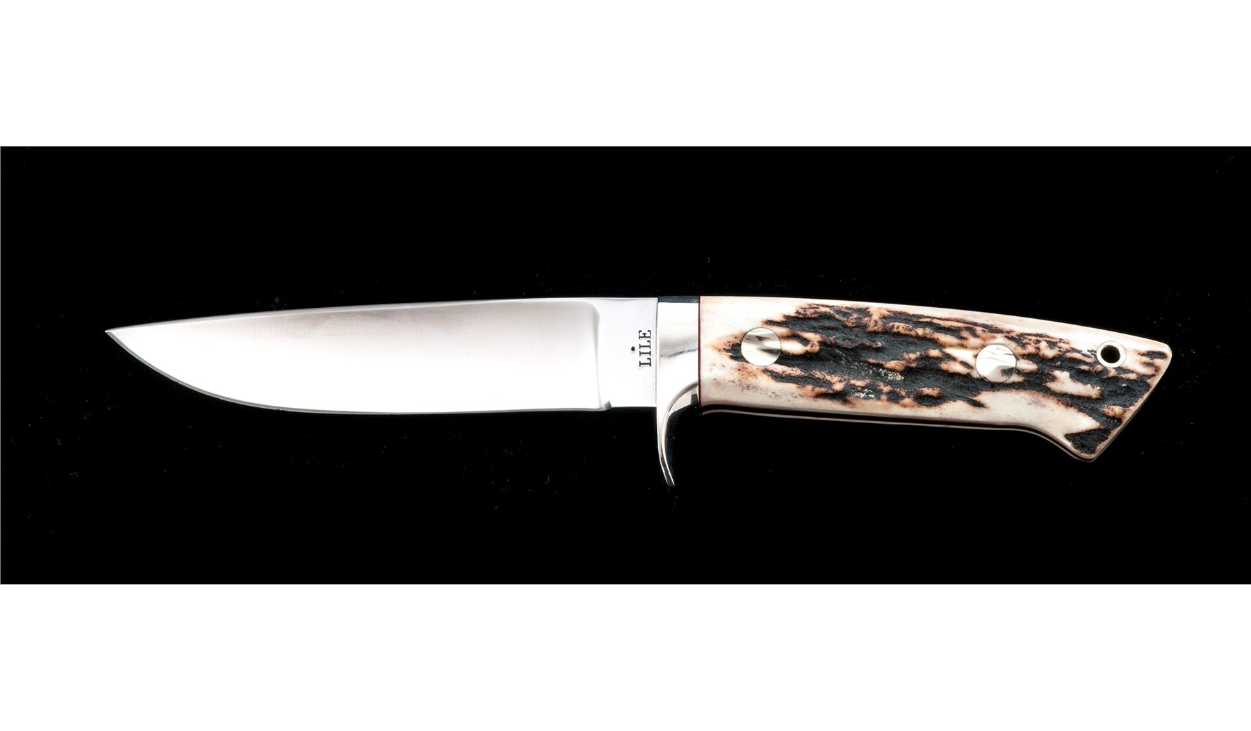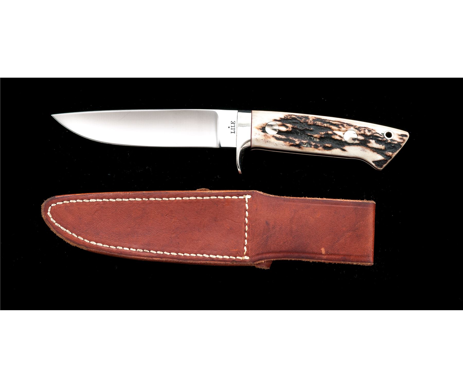 Jimmy Lile (with dot) Fixed Blade Knife, with sheath, 5'' satin finished drop-point blade marked on ricasso ''LILE (with dot)''; 9.5'' overall, tapered full tang, polished nickel silver guard, stag scales with red spacers, nickel silver pins and ferrule. In unmarked brown leather sheath. Knife is excellent with only a few spots of light scratching near tip and on guard. Stag scales with an attractive natural pattern and color. Sheath with light scuffs and scratches, tip with a small repair. Est.: $400-$600.