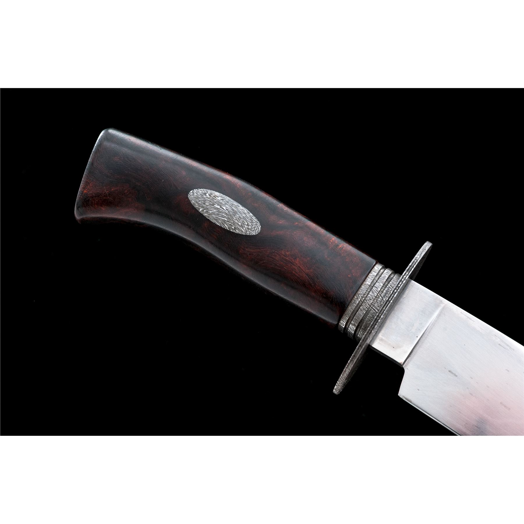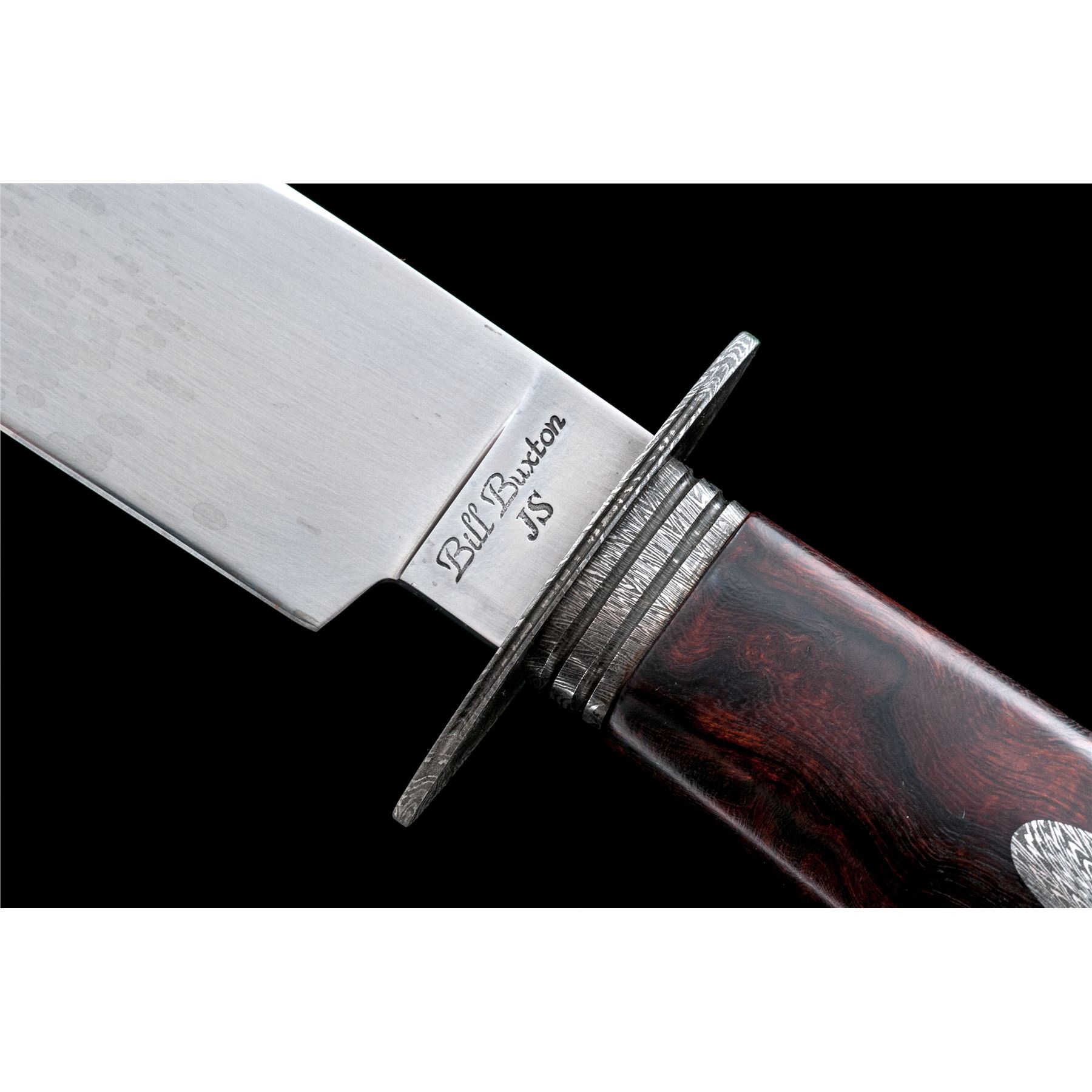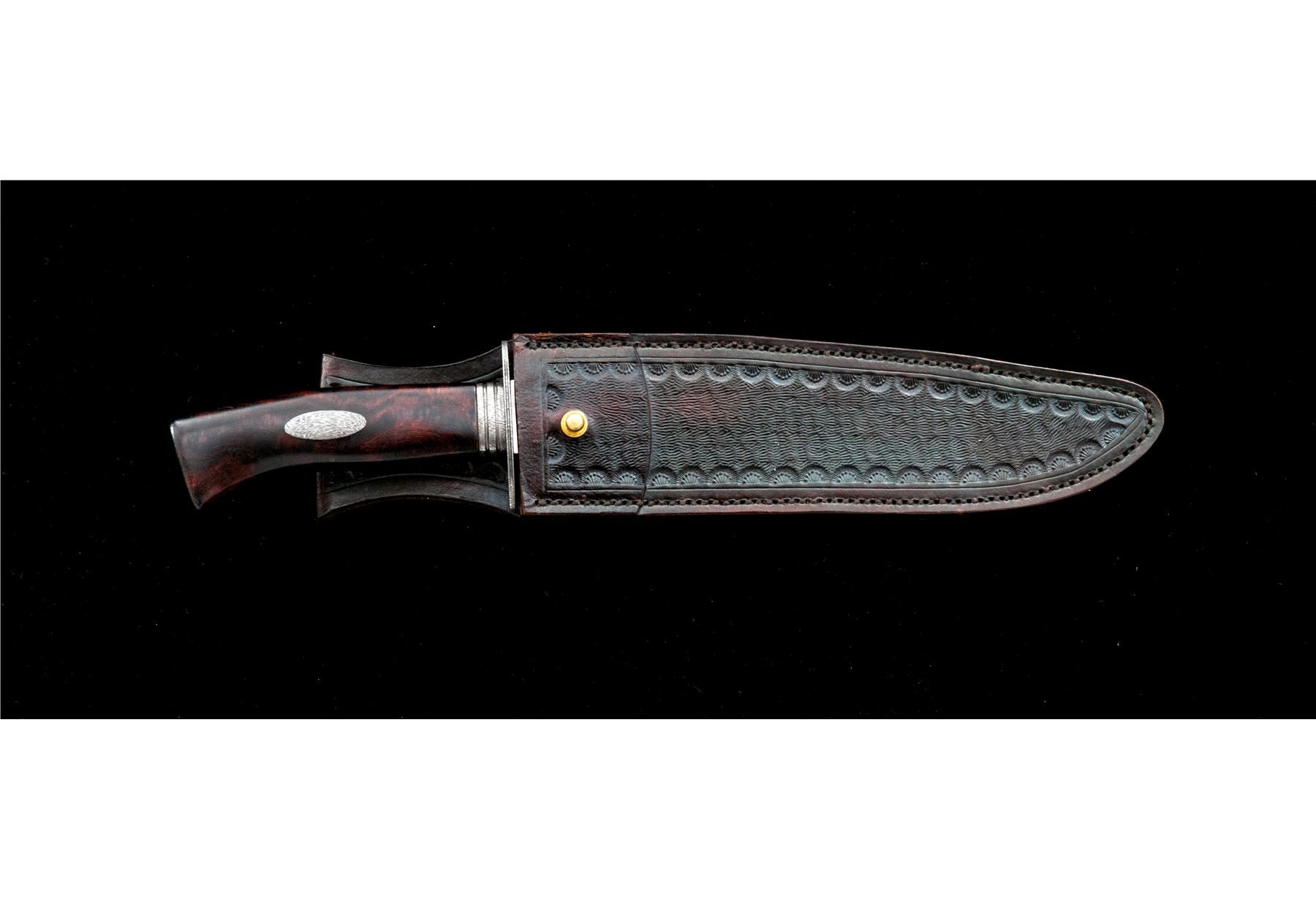 Custom Bill Buxton Fighting Knife, with sheath, 9.25'' drop-point blade with hamon line; marked on ricasso ''Bill Buxton/JS''. Overall length is 14.25'' with hidden tang, damascus guard and ferrule; one-piece desert ironwood handle with an oval damascus shield in each side. In dark brown leather sheath with tooled scalloped design on front. In excellent as new condition, never used or sharpened. Blade with an interesting pattern around the hamon. Ironwood shows only a few very minor handling marks. Sheath is also excellent with a couple of light scuffs and shallow impressions to the backside. Tooled pattern is attractive and of high quality. Est.: $300-$500.