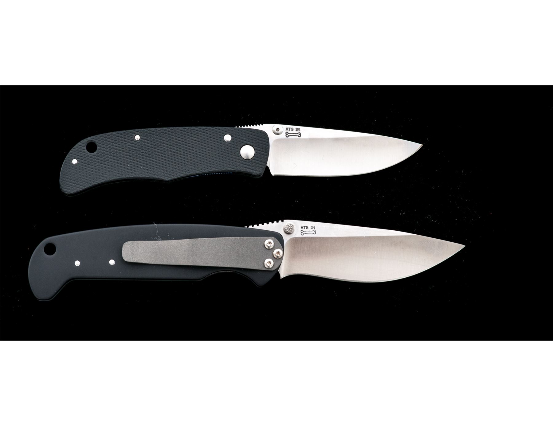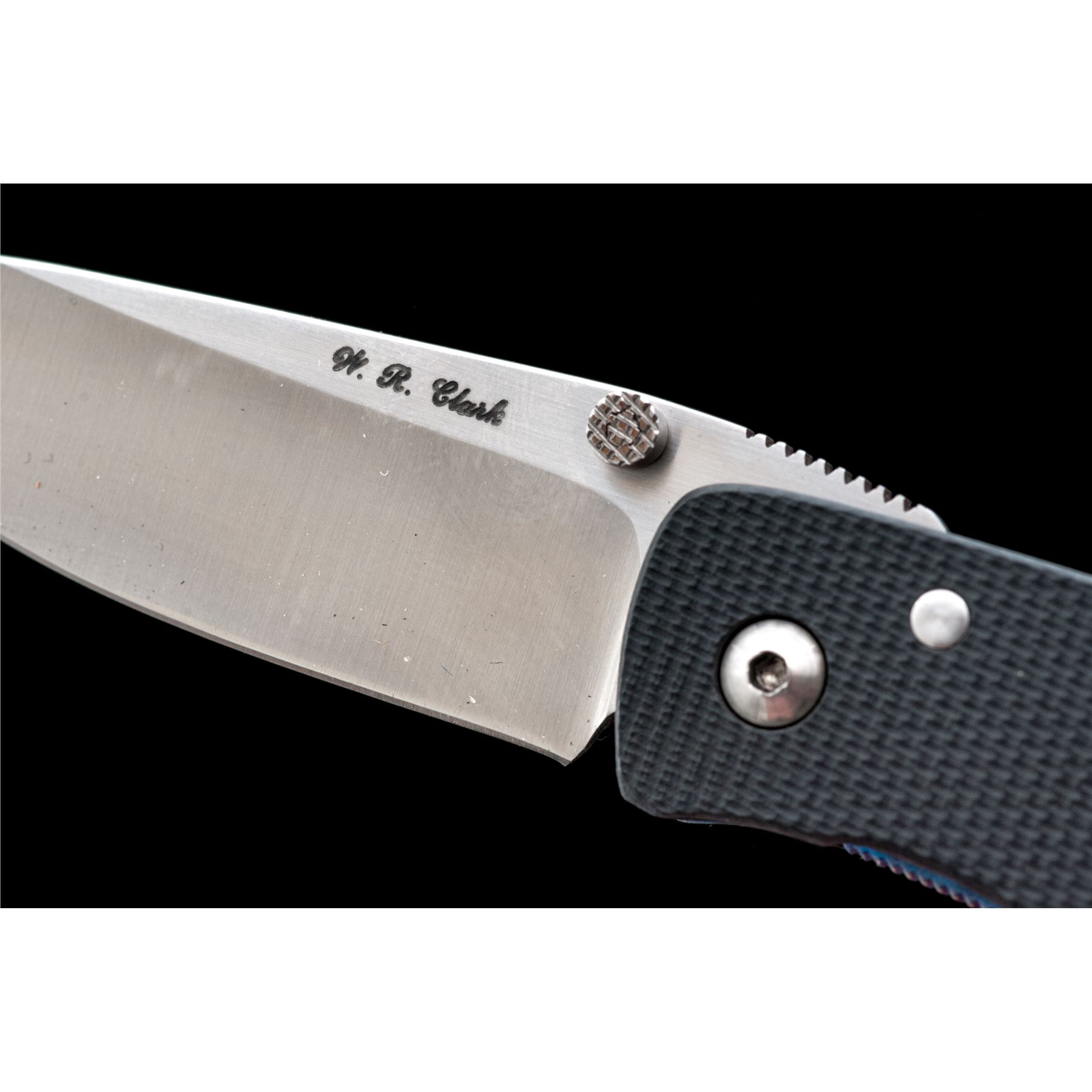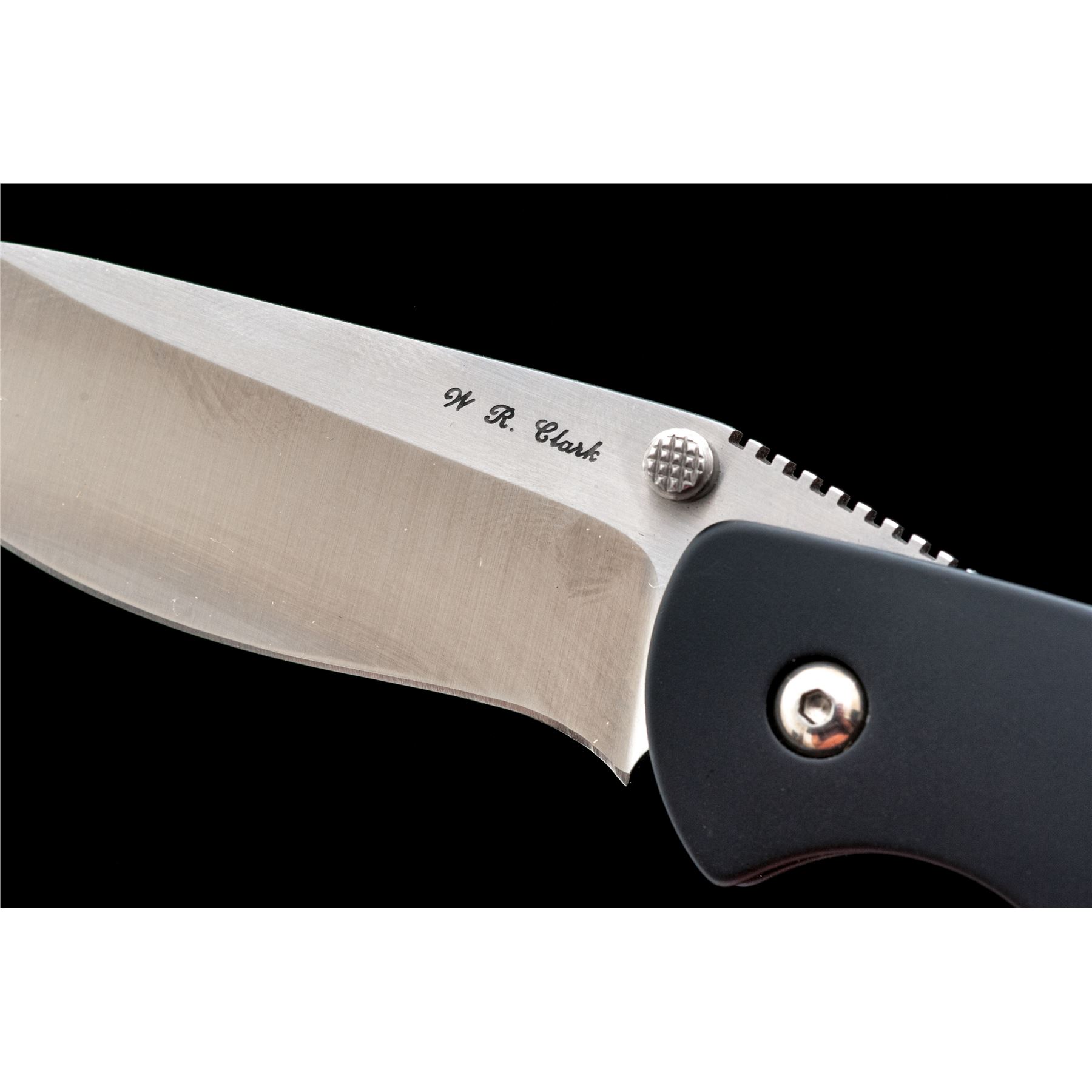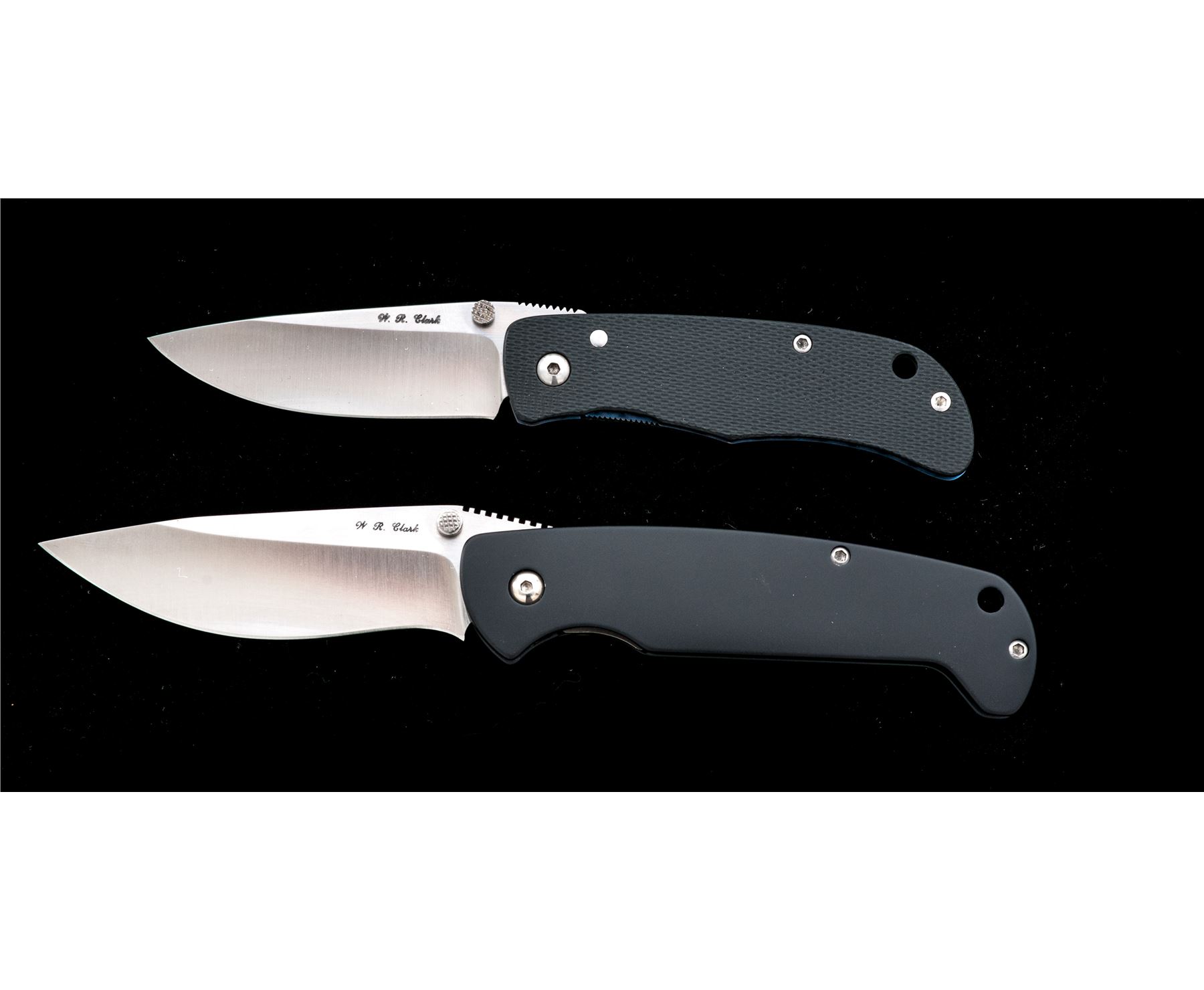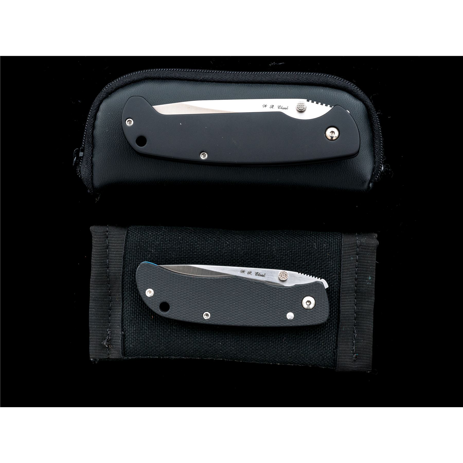 Lot of Two (2) W.R. Clark Custom Linerlock Folding Knives: 1.) 3'' satin finished ATS-34 drop-point blade, 4'' overall closed length, black aluminum frame, with carry clip. Top of blade behind the thumb stud is notched for thumb traction. Left side of blade is marked ''W.R. Clark''; right side with ''Bone'' logo. In excellent as new condition, never carried or sharpened. Knife comes in a small padded case. 2.) 2.5'' satin finished ATS-34 drop-point blade, 3.25'' overall closed length, black G-10 frame, purple anodized liner. Top of blade behind the thumb stud is notched for thumb traction. Left side of blade is marked ''W.R. Clark''; right side with ''Bone'' logo. In excellent as new condition, never carried or sharpened. Knife comes in a small padded case. Est.: $250-$400/lot.