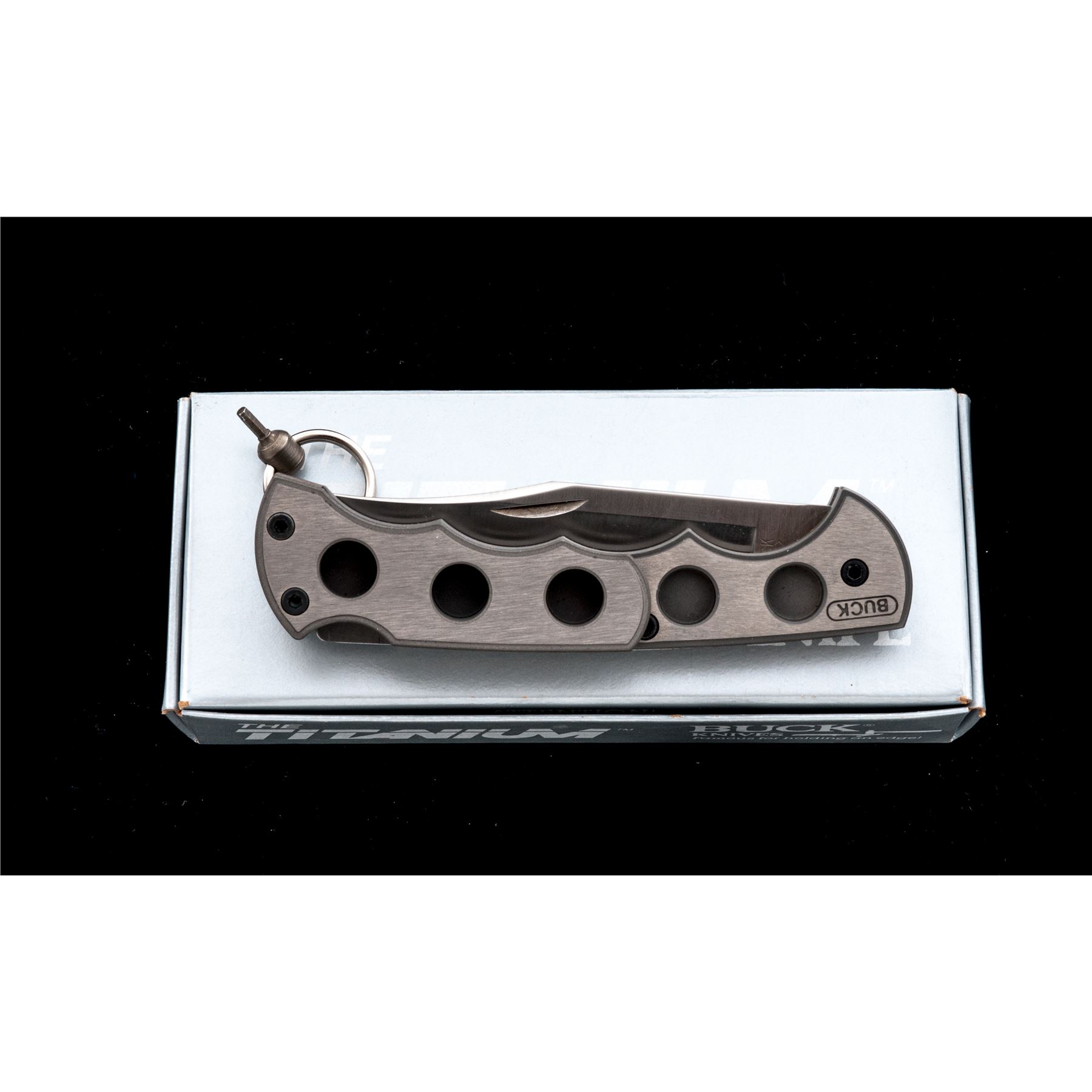 Buck Model 186 ''The Titanium'' Lock-back Folding Knife, 3.75'' blade, 5'' overall closed length, titanium frame with carry clip, three-line blade stamp and ''Pat. Pend.'', made in 1987. In the original box with factory paperwork which includes disassembly instructions; clear plastic blade protector and ringed hex head tool for disassembly. Knife is excellent appearing as new, the overall condition would be hard to improve upon. Box is also excellent. Est.: $200-$300.