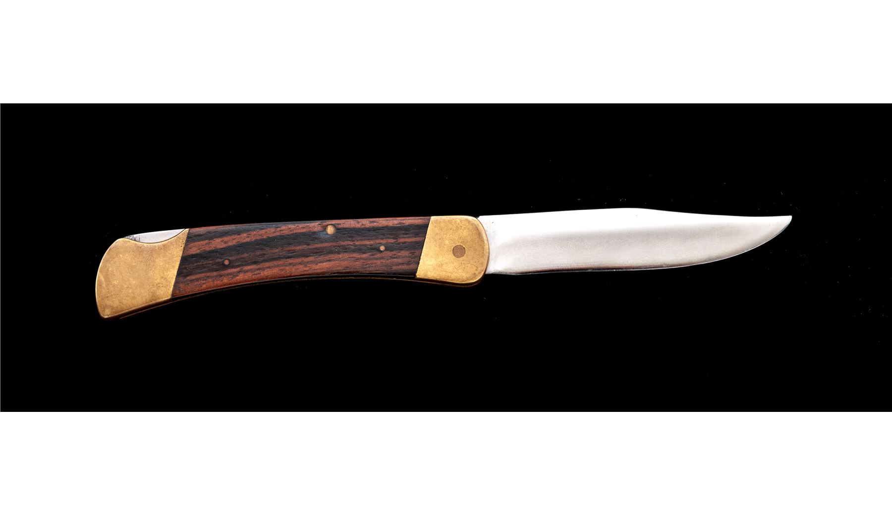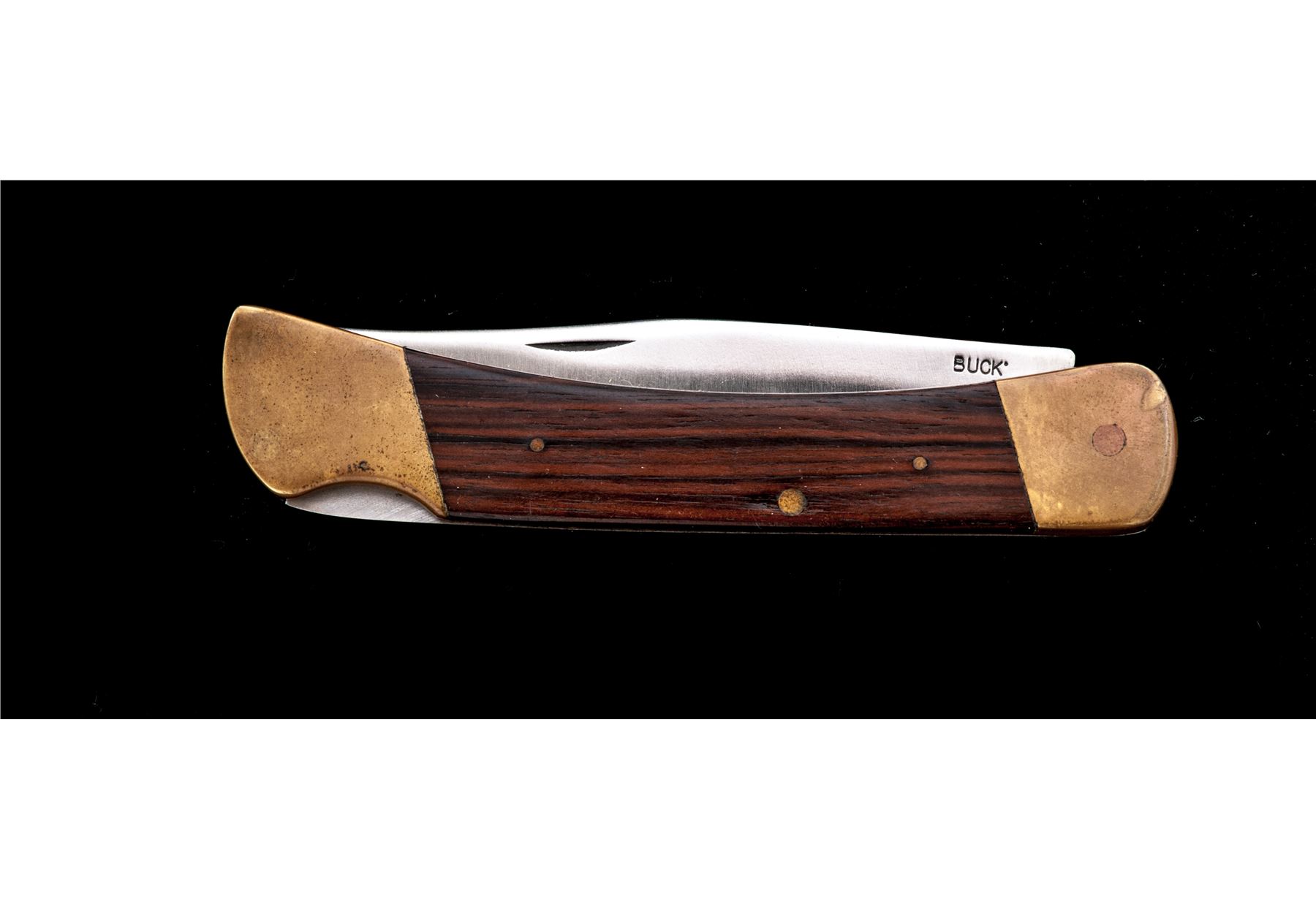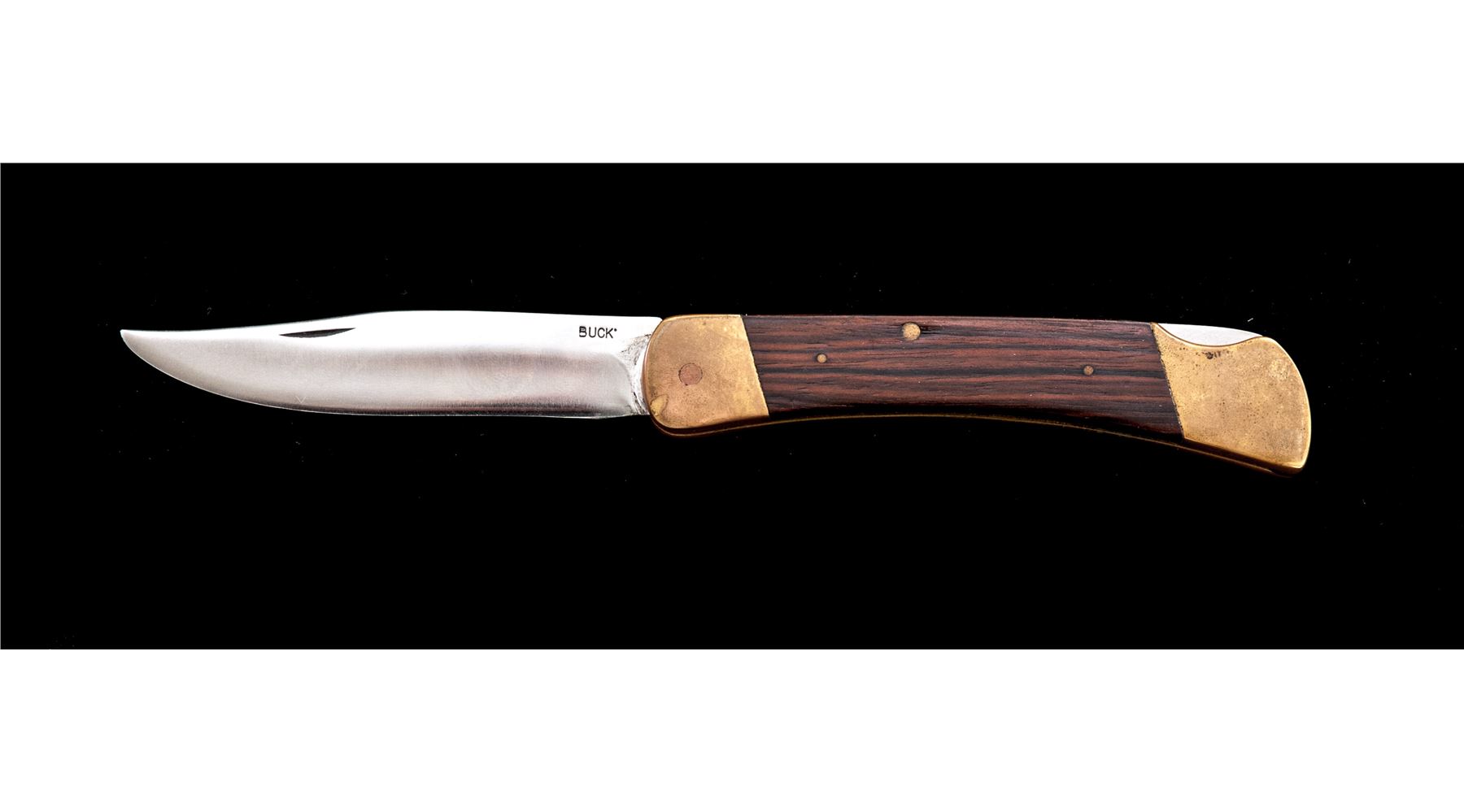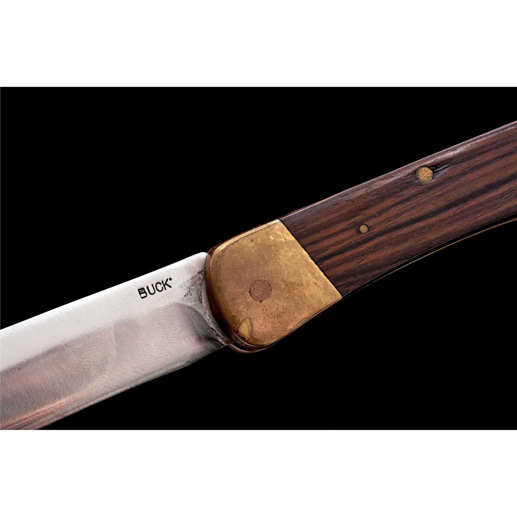 Early Horizontal Blade Stamp Buck Model 110 Folding Hunter, 3.75'' blade is marked horizontally on the left side ''BUCK(dot)'', with brass bolsters, Macassar Ebony handles held in place by brass pins, with hard fiber spacer between the rear bolsters. Mfg'd ca. 1965. Condition is very good overall. Blade has been lightly reconditioned; Buck blade stamp is clear and defined. Bolsters show moderate even toning. Handles are near excellent. Blade is tight without any wobble. Est.: $250-$400.