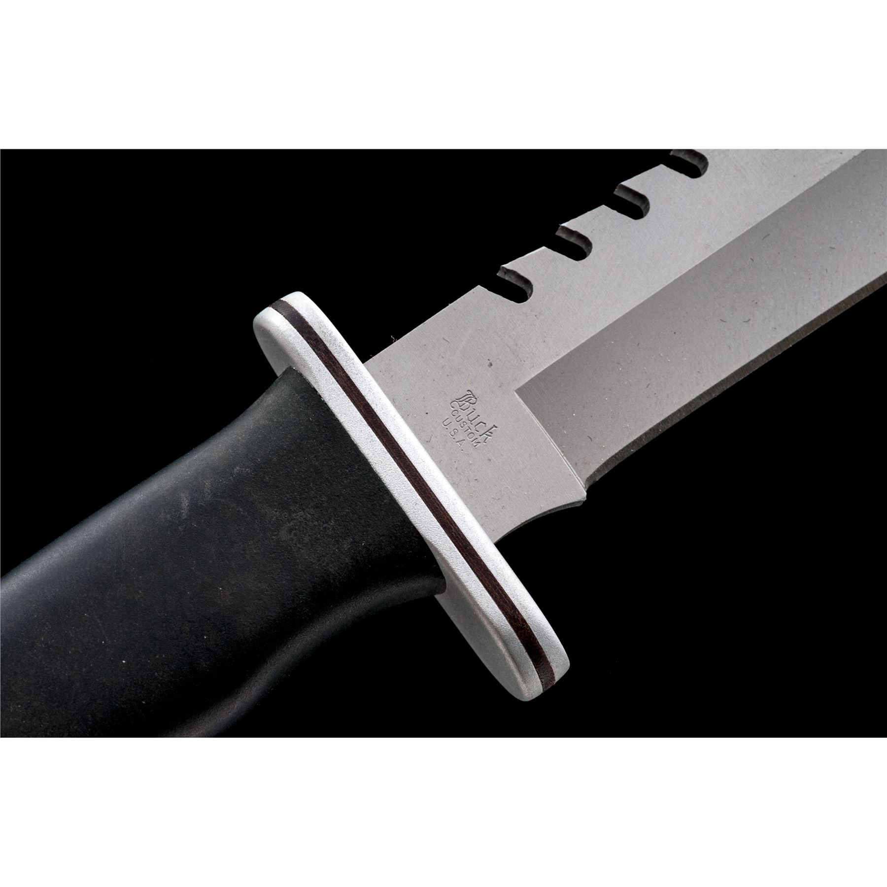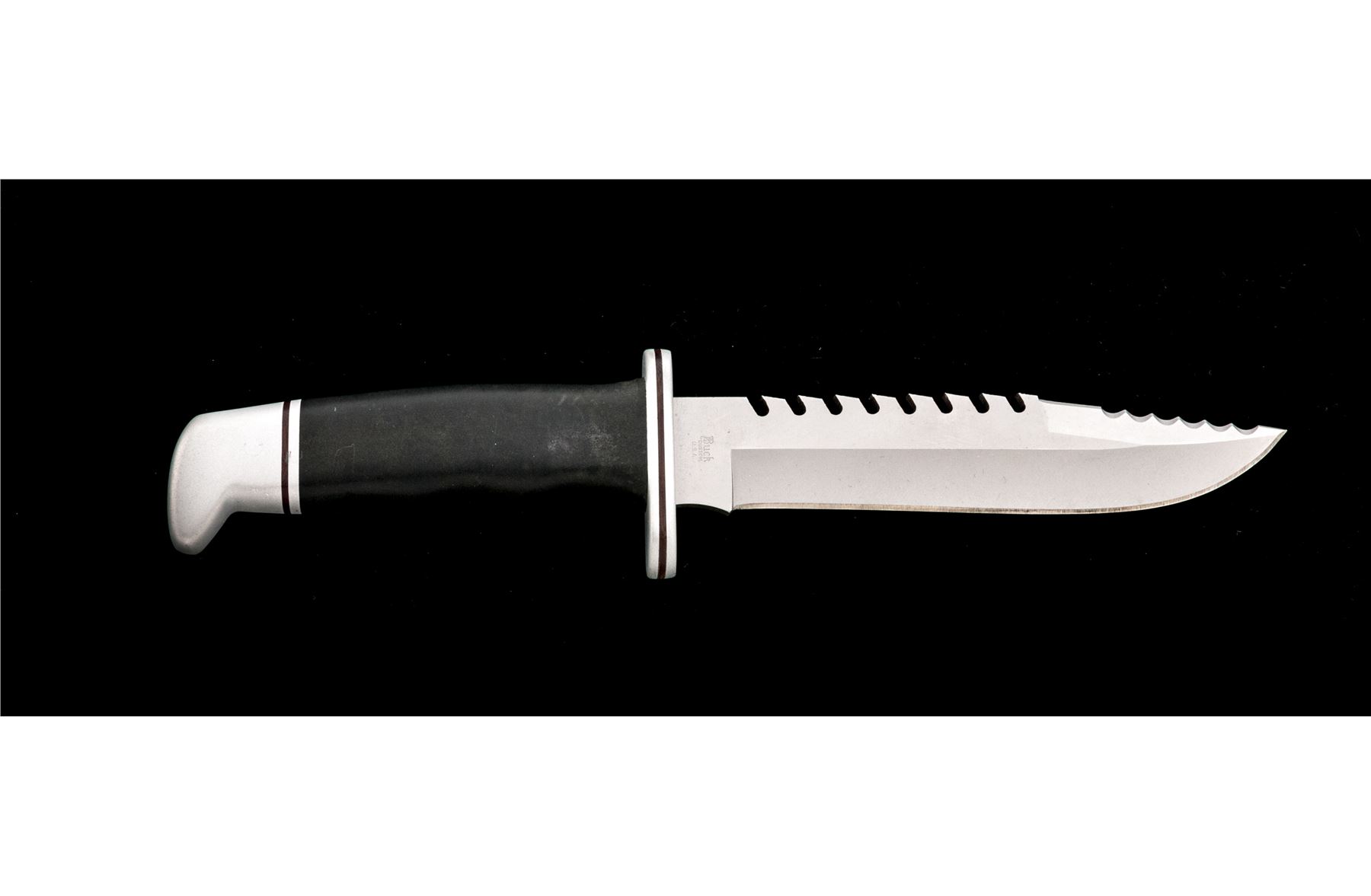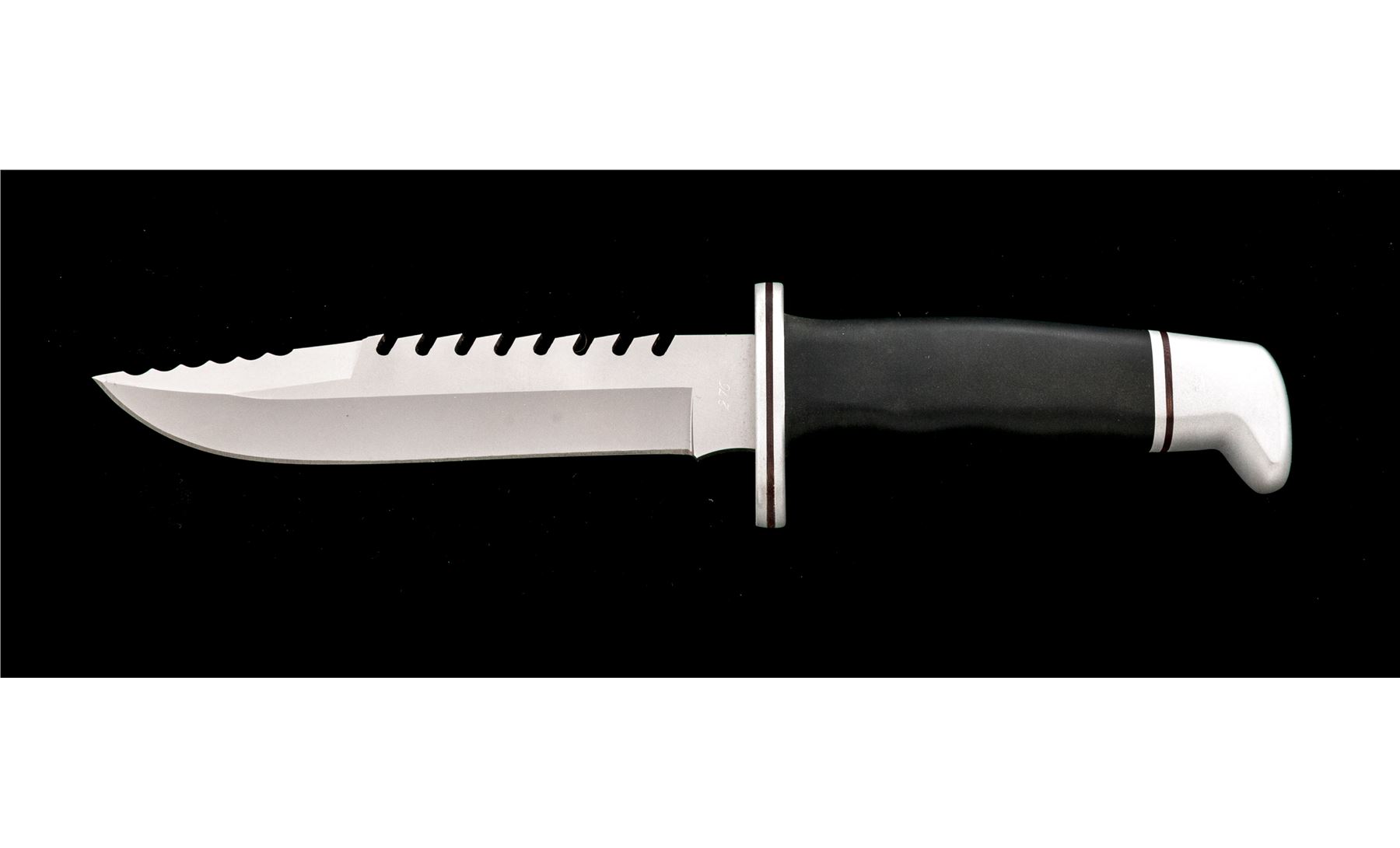 Special Order Buck Model 639B1 Fieldmate Fixed Blade Knife, 5.75'' serrated and saw-toothed blade with Buck Custom blade stamp, and numbered ''276'' on the opposite side; 10.25'' overall, all of the metal surfaces have a bead blasted finish, with a black composite handle. In original box that is hand numbered to the knife, and also includes a black nylon ''Made In USA'' sheath. Knife is in excellent as new condition. Handle with a few slight surface scuffs from handling. Box shows moderate storage type wear. Est.: $200-$400.