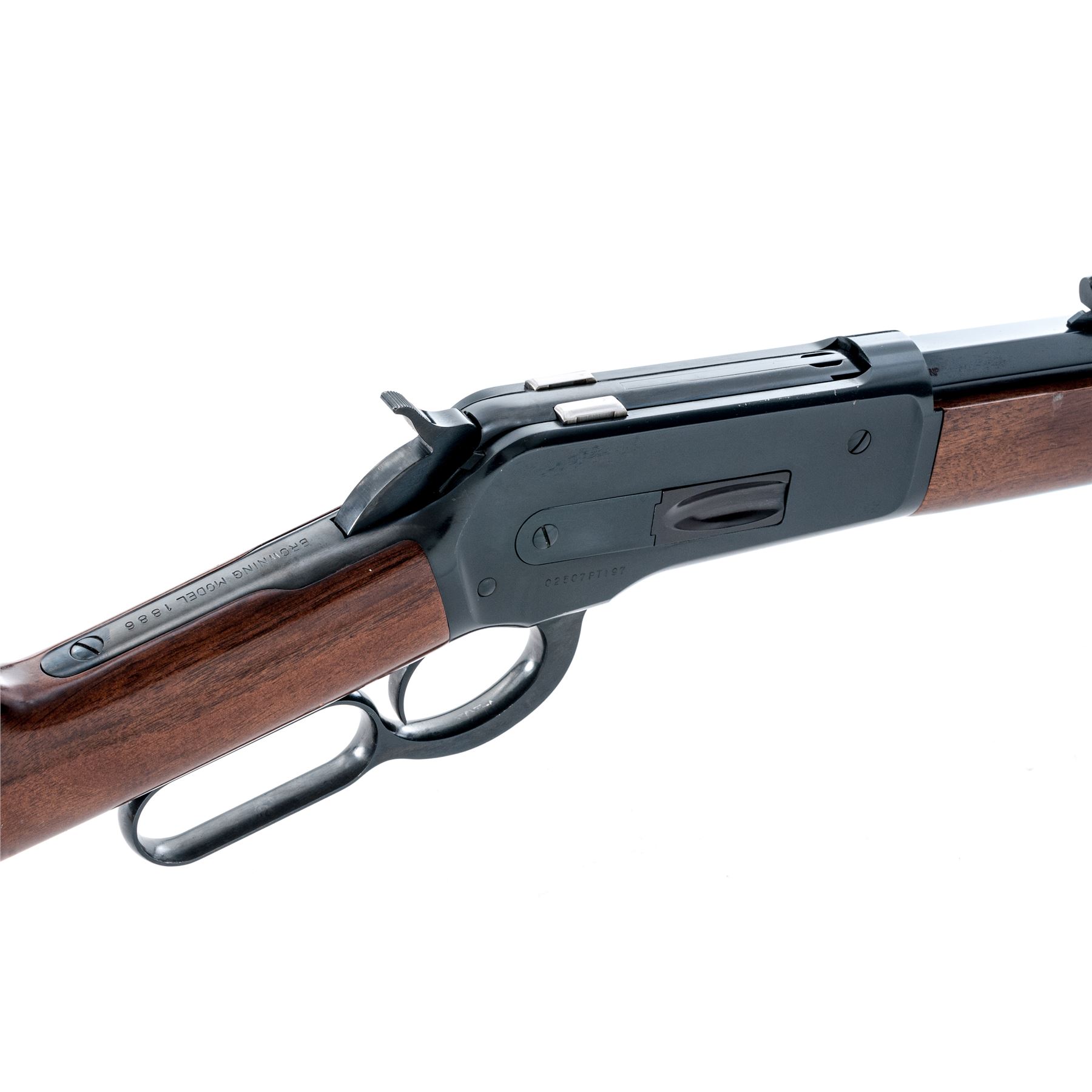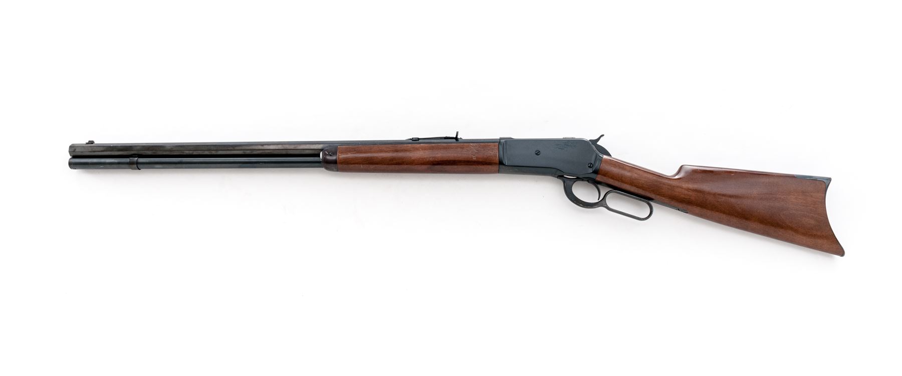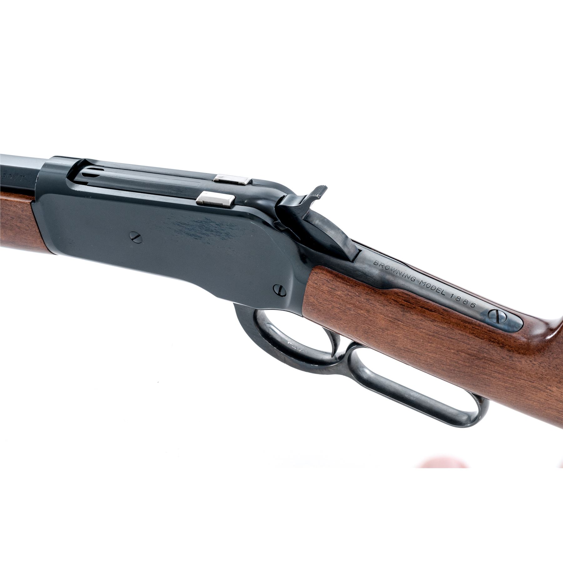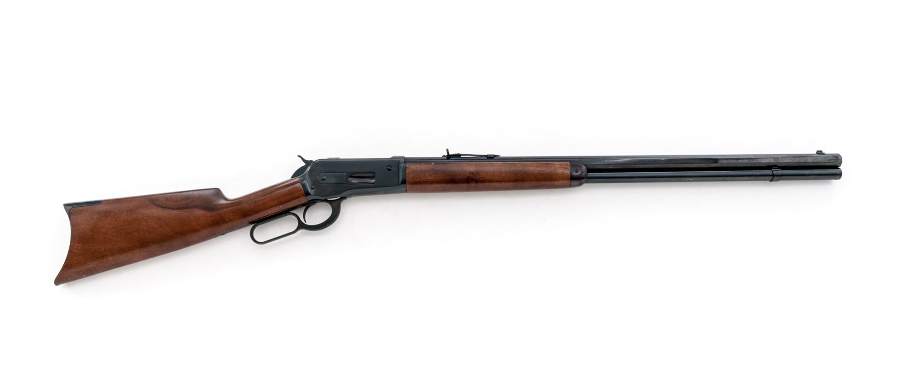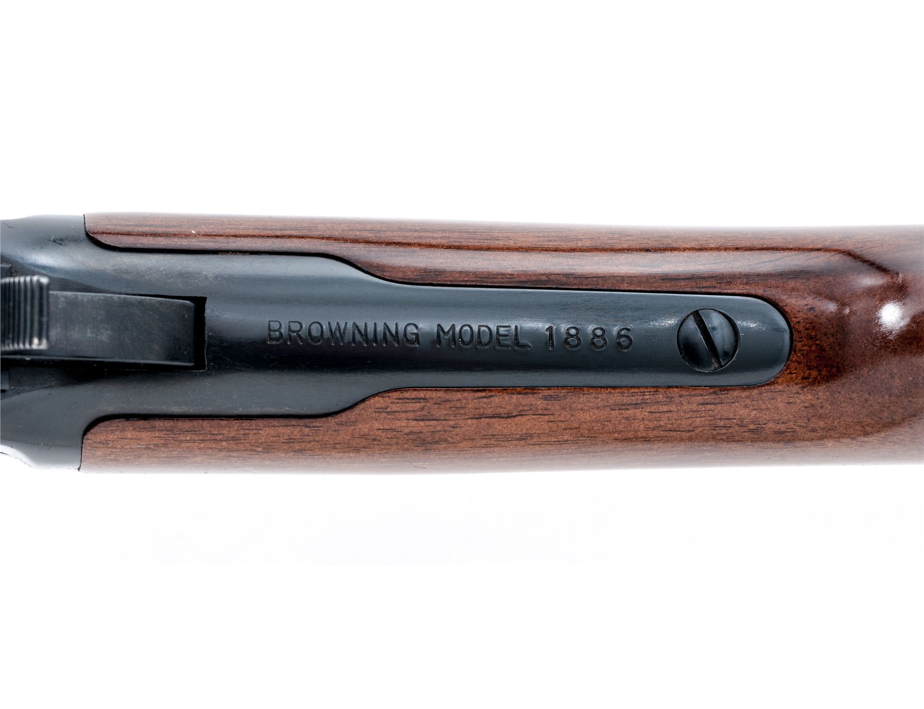 Browning Model 1886 Grade I Limited Edition Lever Action Rifle, #02507PT197, .45-70 cal., 26'' octagonal barrel, blue finish, straight grip walnut stock and forend, with blued crescent steel buttplate and forend cap. Sights include a dovetailed brass beaded front and semi-buck rear, with standard markings, including ''BROWNING MODEL 1886'' on the upper tang. Only 7,000 of these rifles were made in 1986, mfg'd in Japan. Metal rates as about fine overall condition with a handful of noticeable storage nicks and scratches; approx. 96% original metal finish remains, factory lettering is clear. Wood is very good overall also showing storage wear. Buttstock with a few small impressions; forend with larger pressure dings and scratches, larger and more frequent on the left side. Crisp action, bright bore with excellent rifling; overall this rifle looks like it was fired very little, the cosmetic blemishes appear to be storage related; a solid shooter grade rifle. Est.: $700-$900. (Modern)