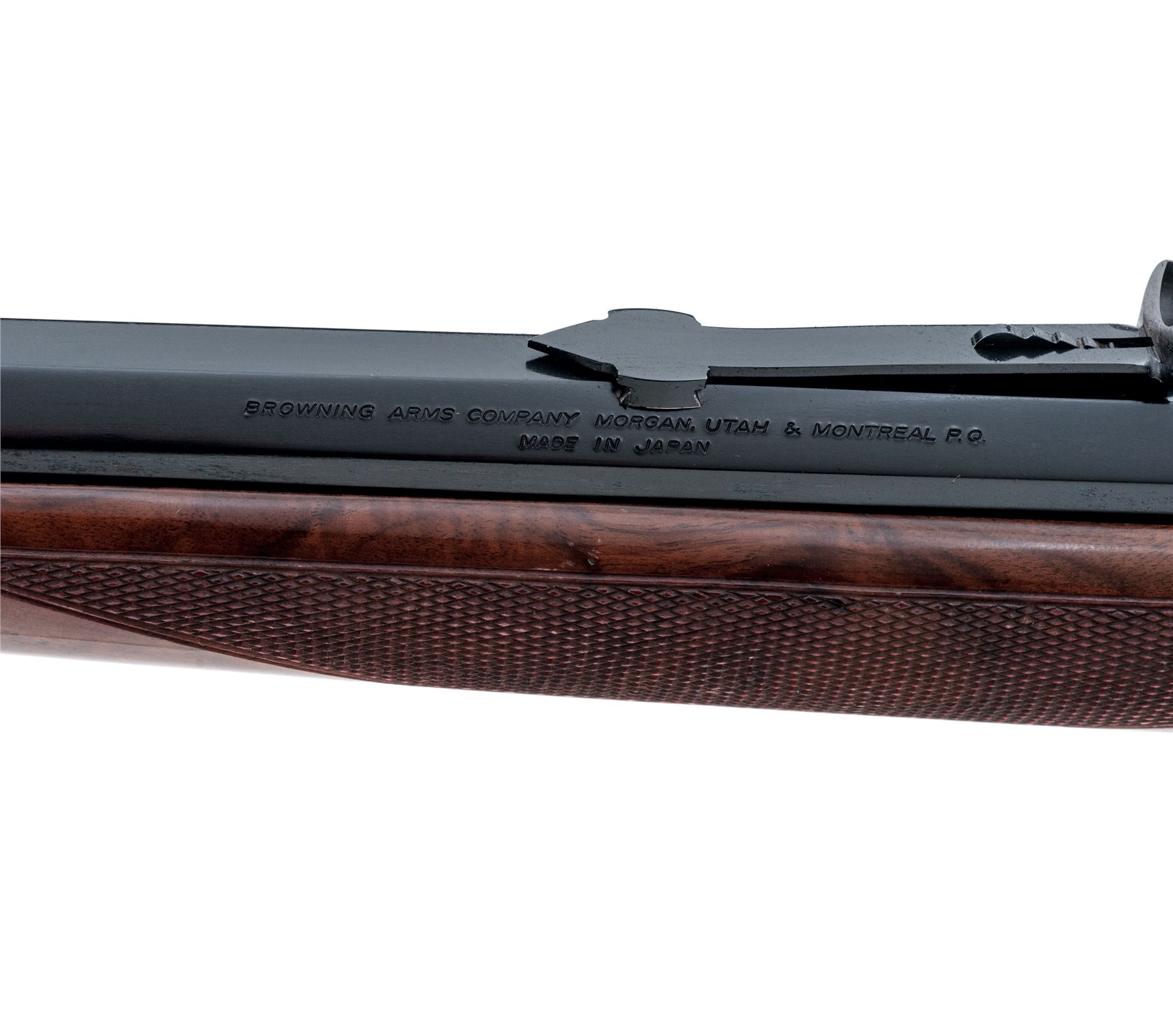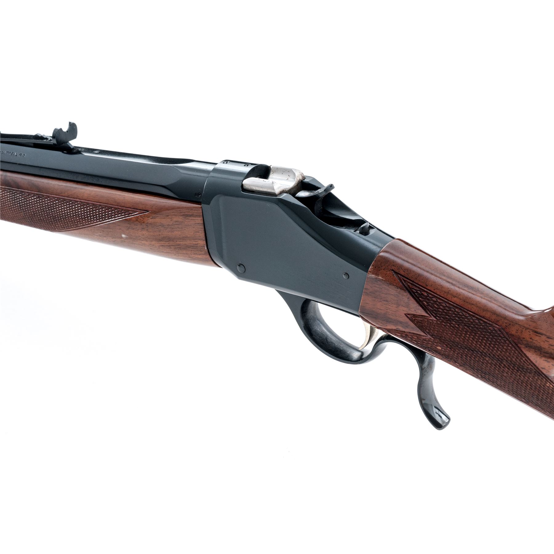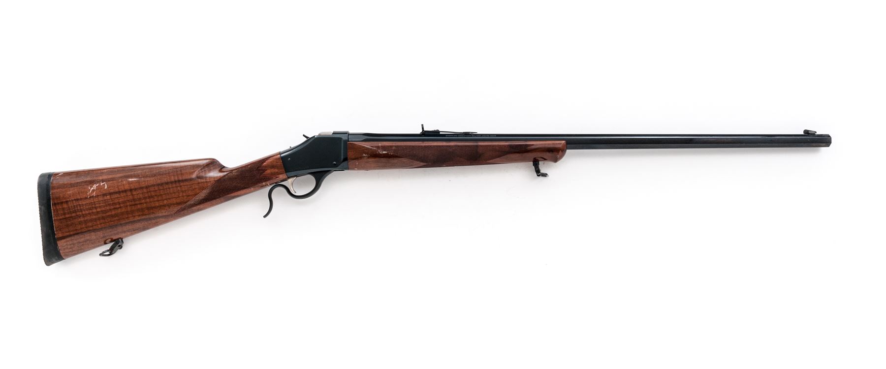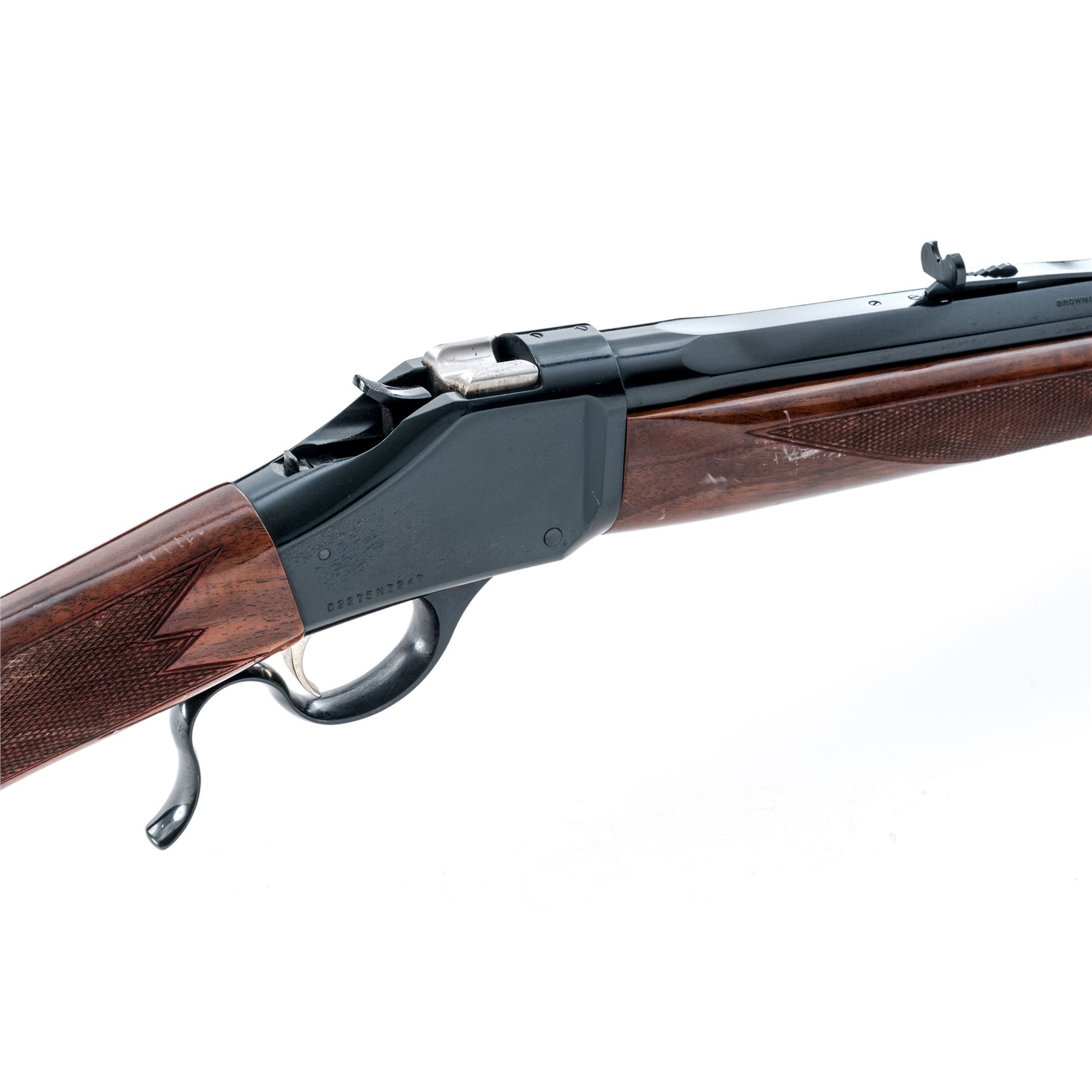 Browning Model 1885 High-Wall Single Shot Rifle, #02275NZ247, .45-70 cal., 28'' octagonal barrel, dark blue finish, straight grip checkered walnut stock and Schnabel forend with gloss finish, black rubber Browning recoil pad, and quick-release sling swivels, with dovetailed Rocky Mountain type front sight and semi-buckhorn rear sight with elevator. Made in Japan. Metal is very good with approx. 95% original blue, scratches on right side of frame, as well as scratches and edgewear on the upper portion of barrel accounts for most of the finish loss. Stock is serviceable but does show a considerable amount of dings and mars, most appear to be from poor storage. Excellent action, bright bore, internally a clean rifle. Est.: $500-$750. (Modern)