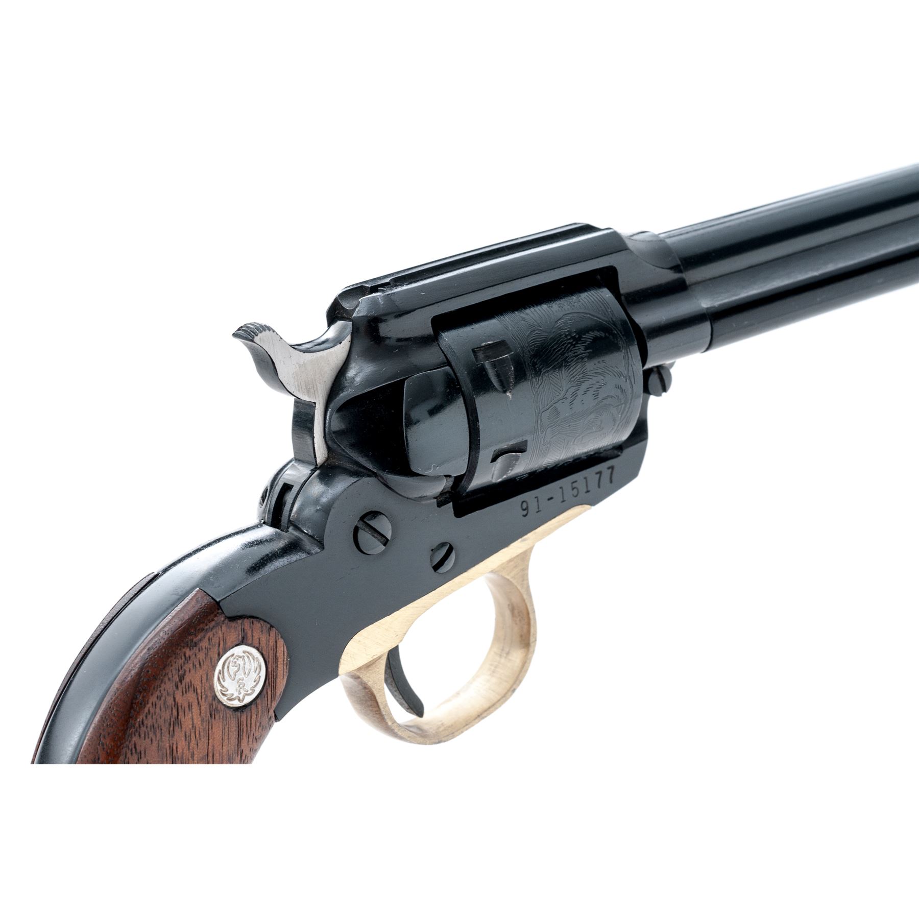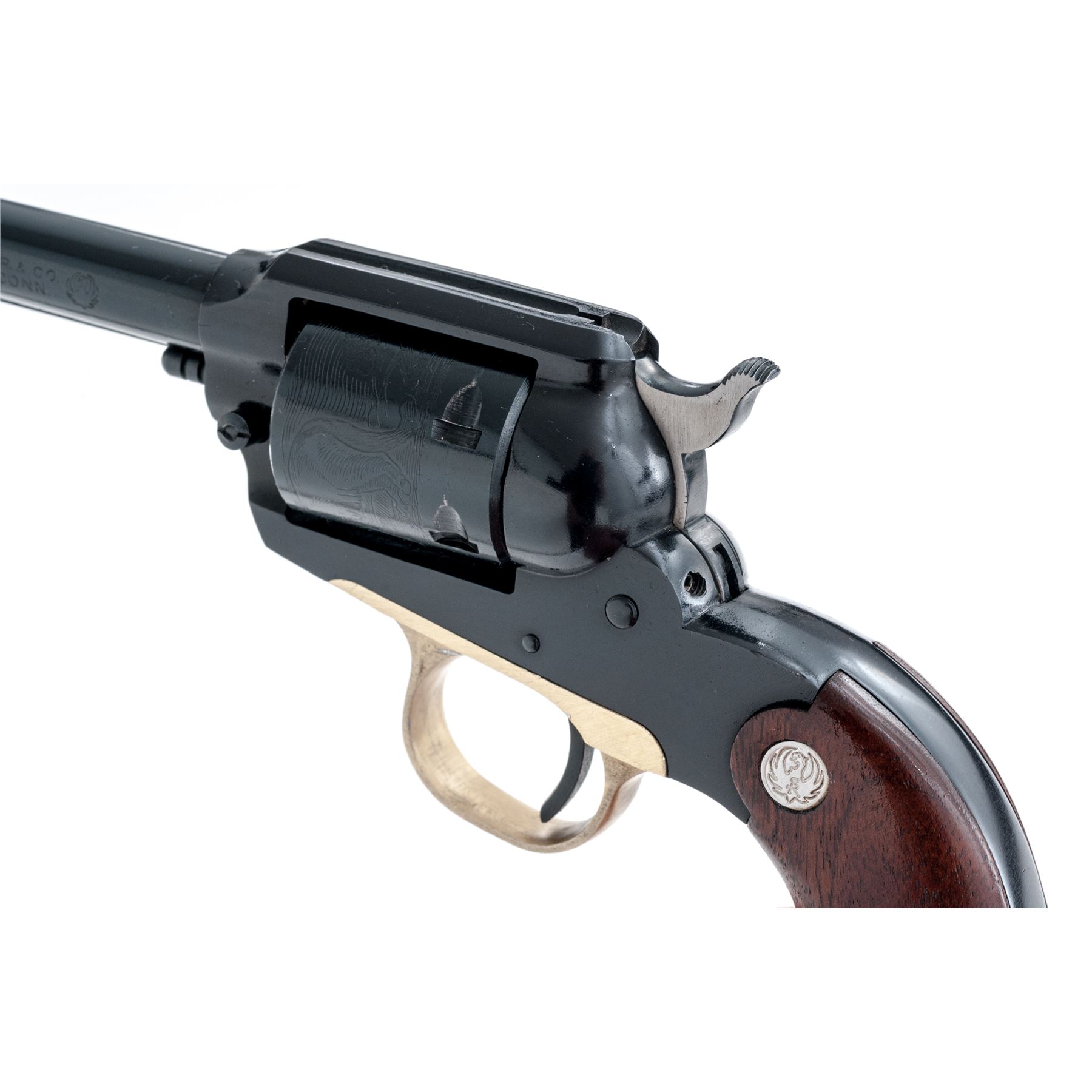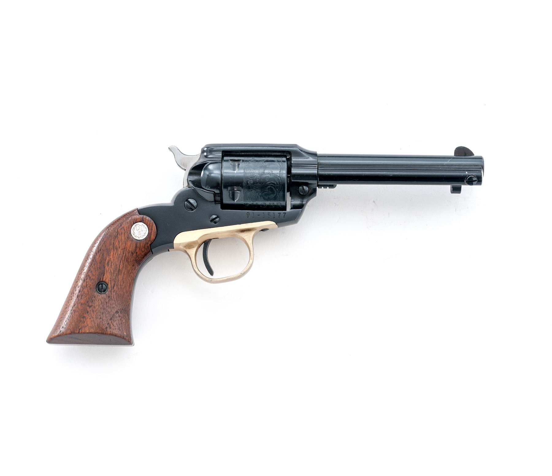 Ruger Old Model Super Bearcat Single Action Revolver, #91-15177, .22 LR cal., 4'' barrel, blue finish, steel frame, brass anodized aluminum triggerguard, smooth walnut grips with silver colored Ruger medallions, fixed blade front sight and square-notched rear sight. Cylinder with standard engraving. This example does not have caliber markings on the barrel. Mfg'd during the first year of Super Bearcat production, 1971. Revolver is in very good+ overall condition retaining approx. 97% of its original finish. Triggerguard with general light scratching, as well as a few tiny surface nicks. Factory lettering is clear. Left top edge of frame, near the grip with two very shallow impressions. Cylinder scene remains strong; cylinder with only a very light index line. Grips with a little finish wear mainly at highpoints, both with normal scattered small marks from handling; medallions are shiny. Right grip with a few narrow grain fissures; grip remains solid as they do not transfer thru to the backside. Action is smooth and crisp; mirror bright bore rates excellent. Est.: $250-$450. (Modern)