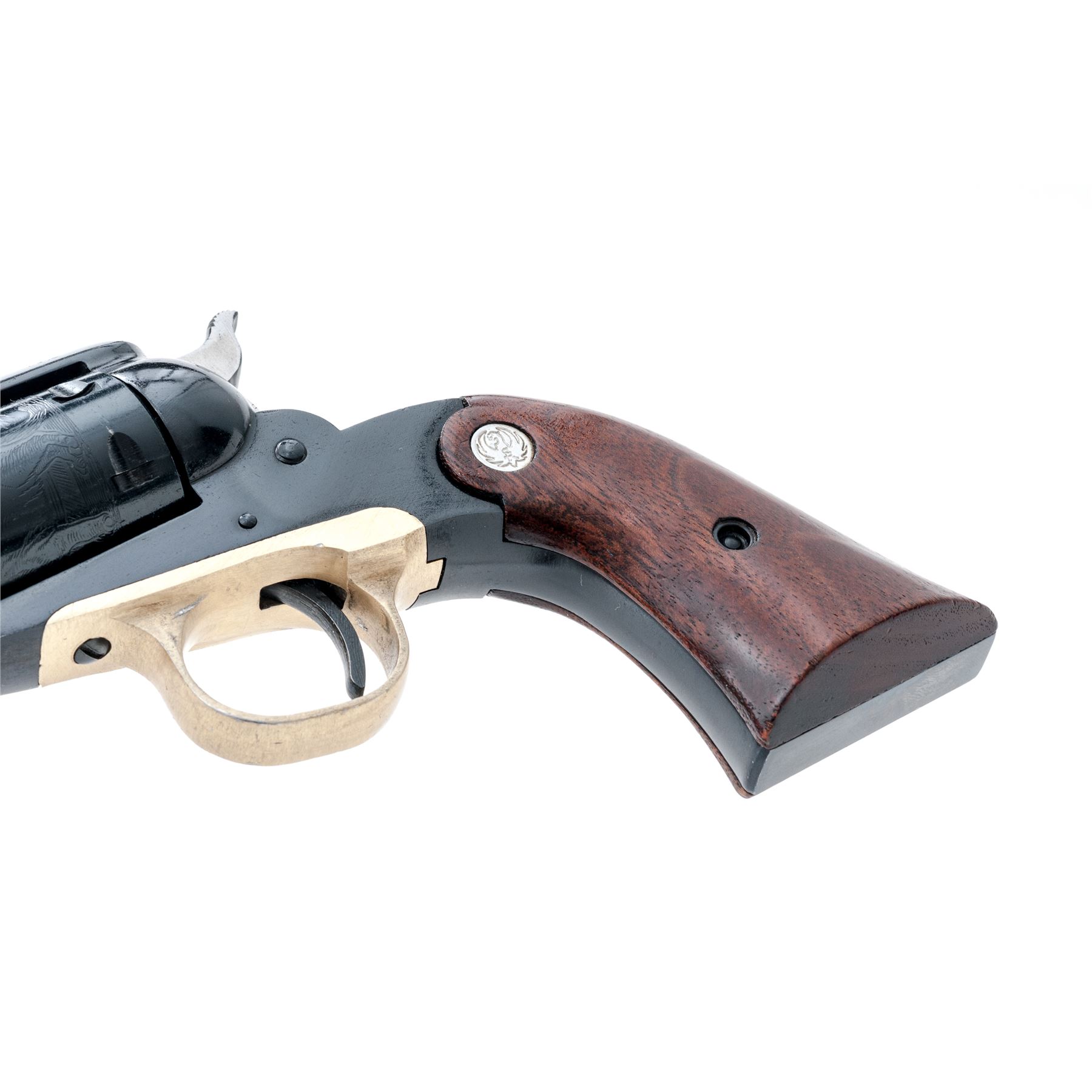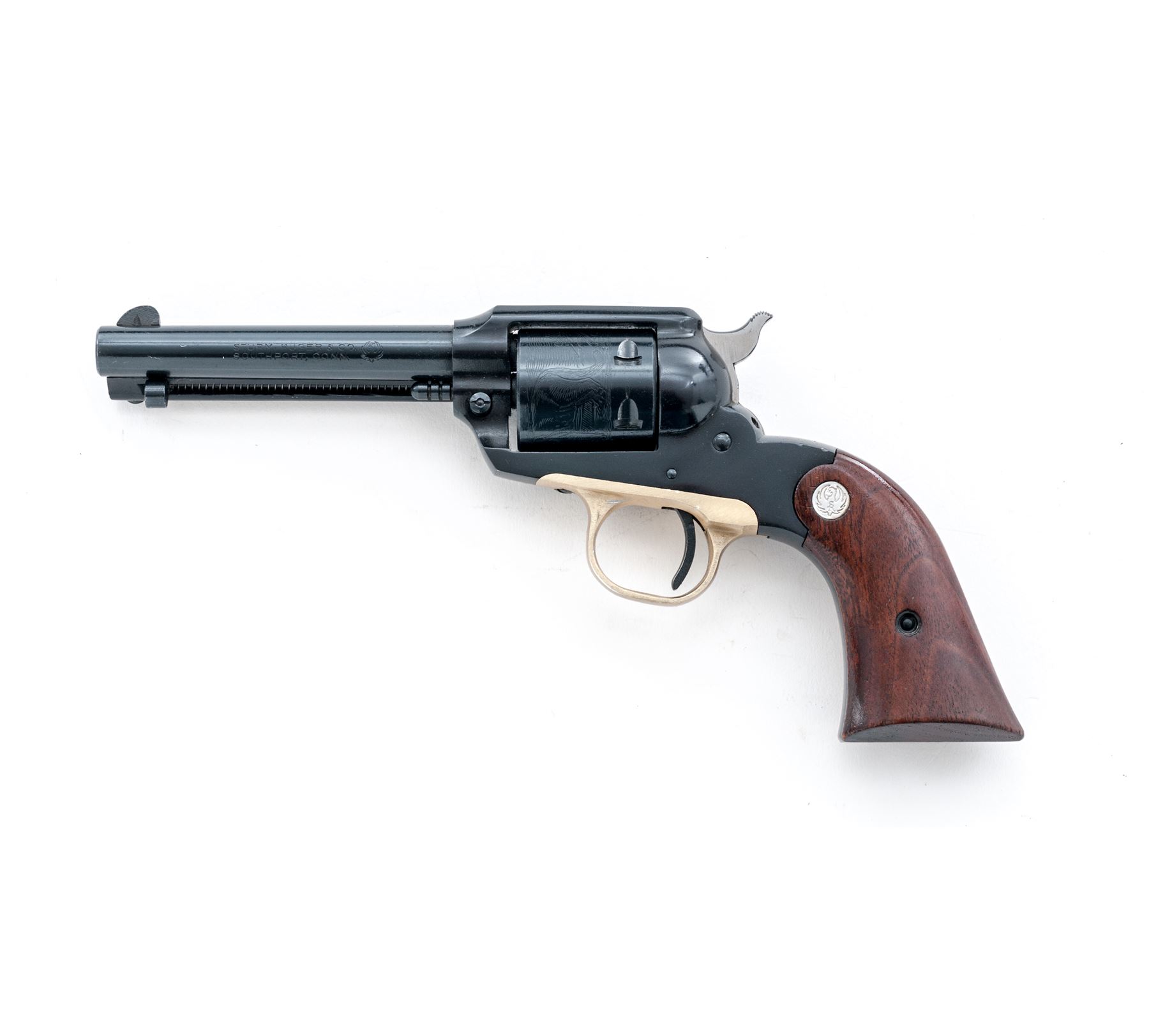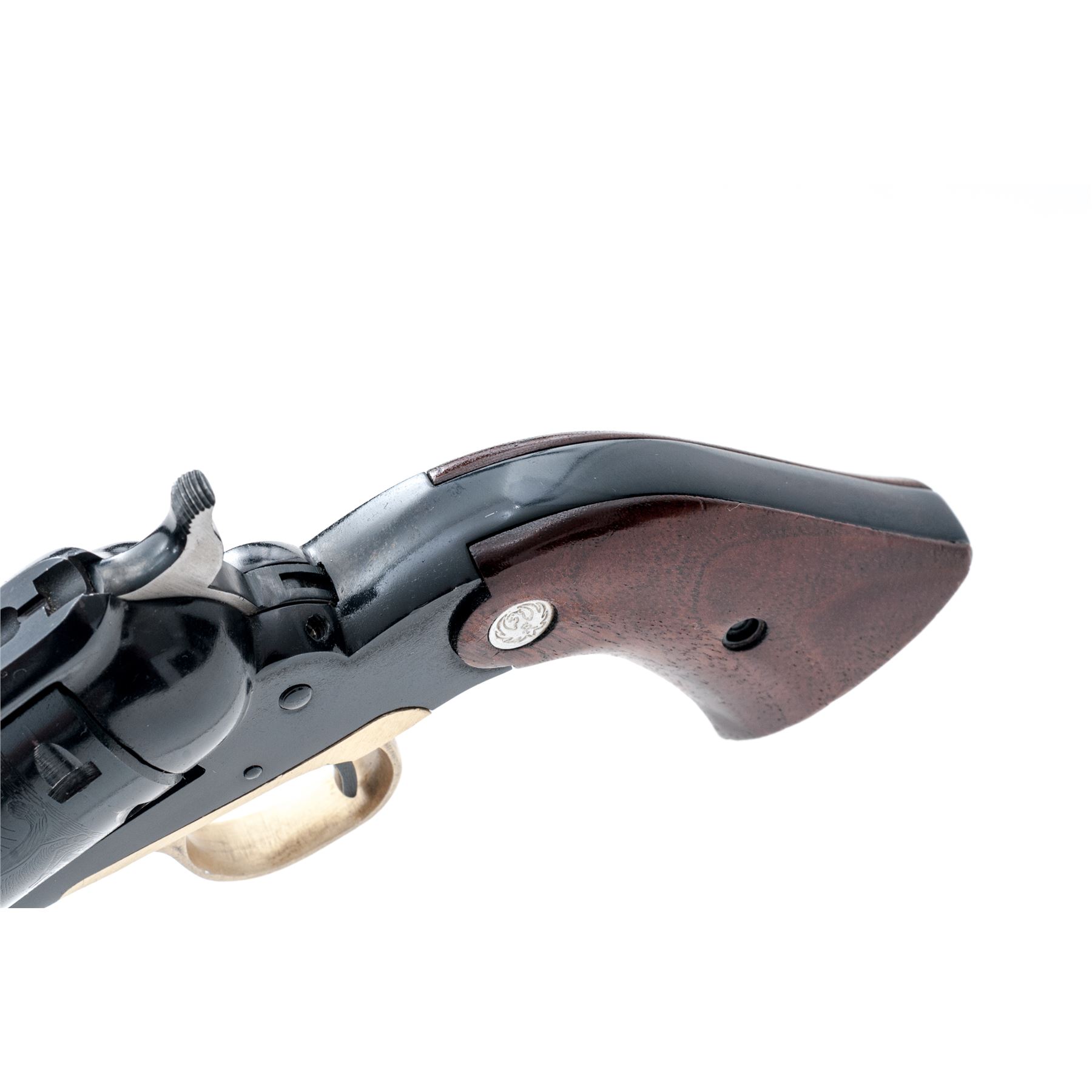 Ruger Old Model Super Bearcat Single Action Revolver, #91-15177, .22 LR cal., 4'' barrel, blue finish, steel frame, brass anodized aluminum triggerguard, smooth walnut grips with silver colored Ruger medallions, fixed blade front sight and square-notched rear sight. Cylinder with standard engraving. This example does not have caliber markings on the barrel. Mfg'd during the first year of Super Bearcat production, 1971. Revolver is in very good+ overall condition retaining approx. 97% of its original finish. Triggerguard with general light scratching, as well as a few tiny surface nicks. Factory lettering is clear. Left top edge of frame, near the grip with two very shallow impressions. Cylinder scene remains strong; cylinder with only a very light index line. Grips with a little finish wear mainly at highpoints, both with normal scattered small marks from handling; medallions are shiny. Right grip with a few narrow grain fissures; grip remains solid as they do not transfer thru to the backside. Action is smooth and crisp; mirror bright bore rates excellent. Est.: $250-$450. (Modern)