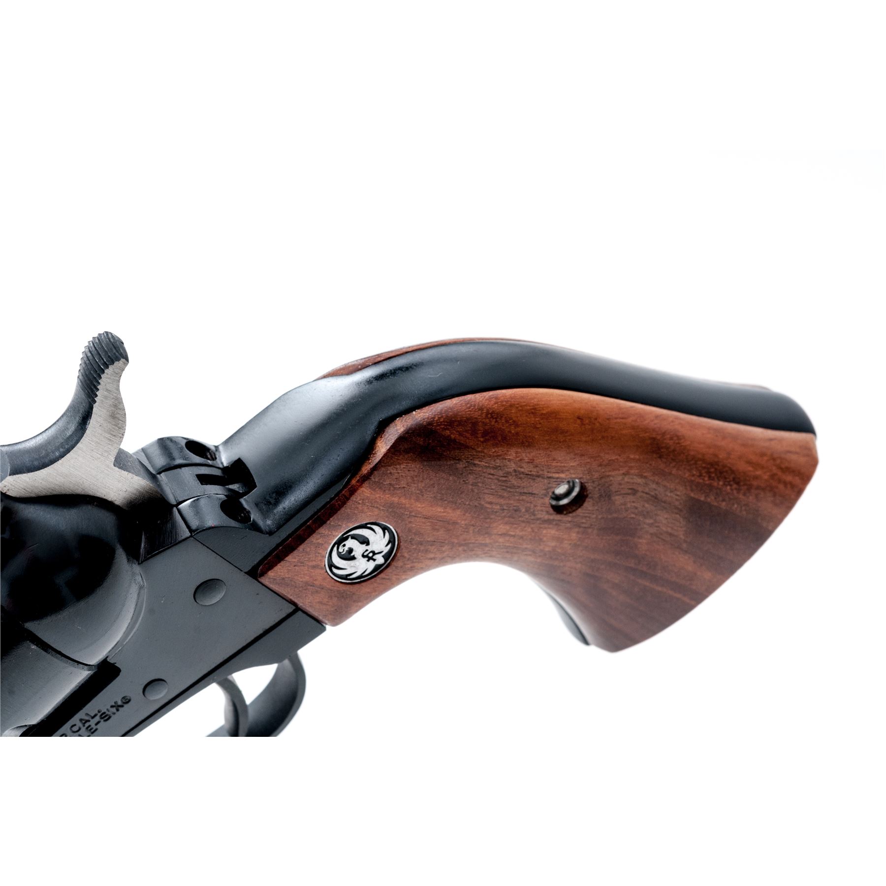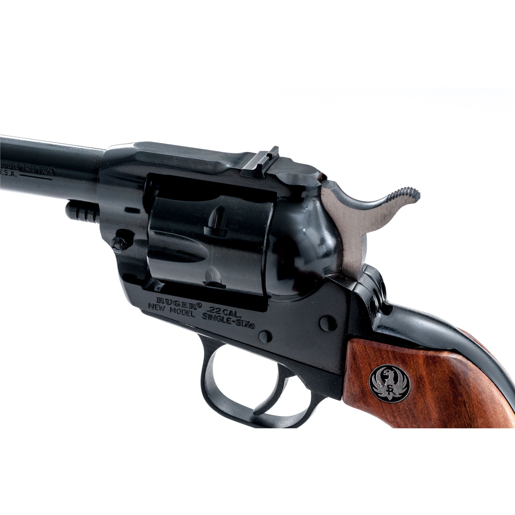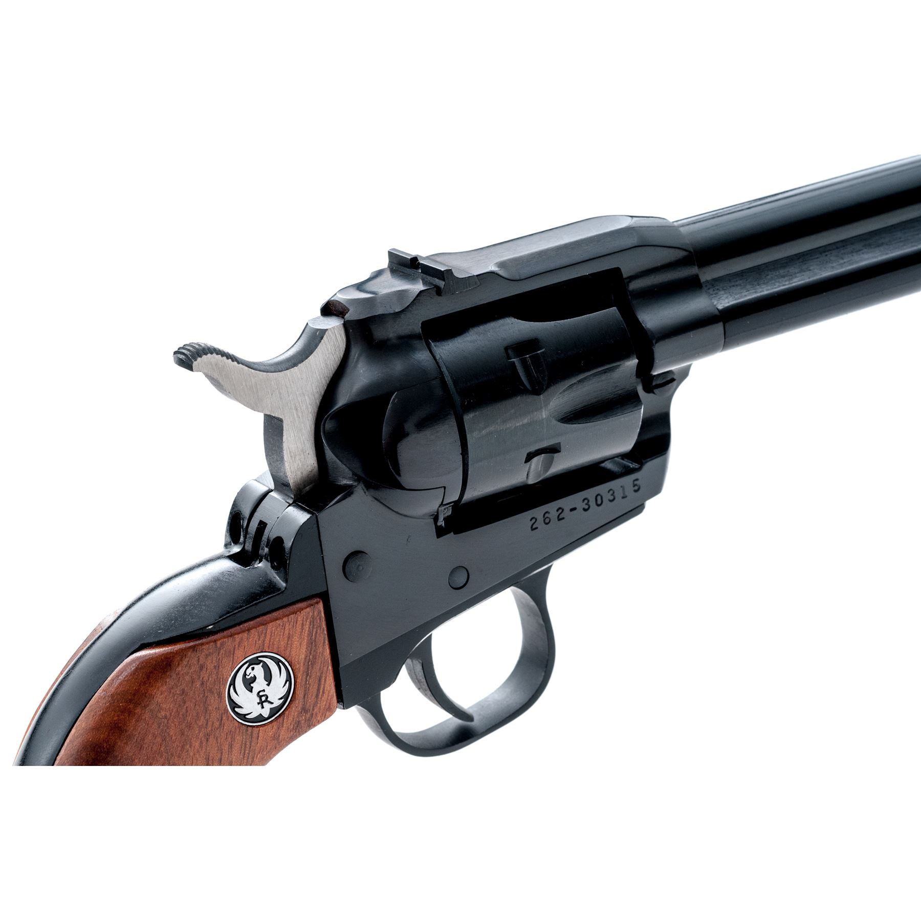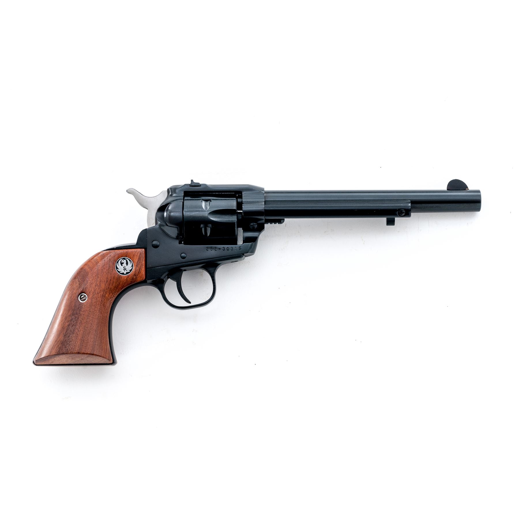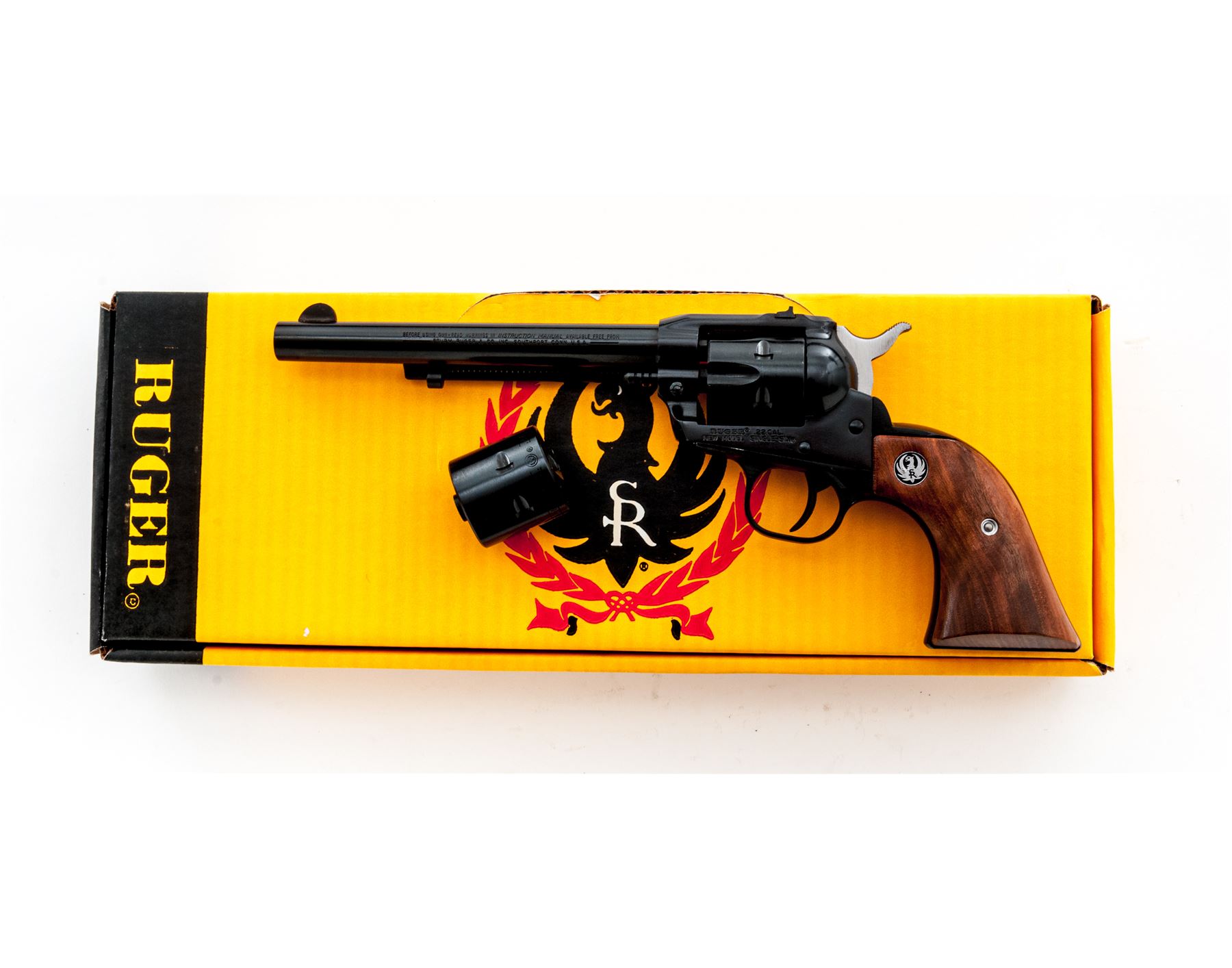 Like New Ruger New Model Single Six Convertible Single Action Revolver, #262-30315, with both a .22 LR and .22 WMR cylinder; both cylinders are numbered to the gun; 6.5'' barrel, blue finish, aluminum alloy grip frame, smooth wood grips with Ruger ''silver eagle'' medallions, and standard fixed sights. In an original unnumbered box with additional brown cardboard exterior box that is hand numbered to the gun. In like new condition this revolver retains 99%+ original finish; left side of triggerguard with one very minor spot of edgewear, both cylinders with extremely faint index lines. Grips also appear as new. Factory lettering with crisp edges. Bore is mirror bright and overall this revolver shows very little evidence of being fired. Box is excellent with bright, clean colors. Est.: $350-$500. (Modern)