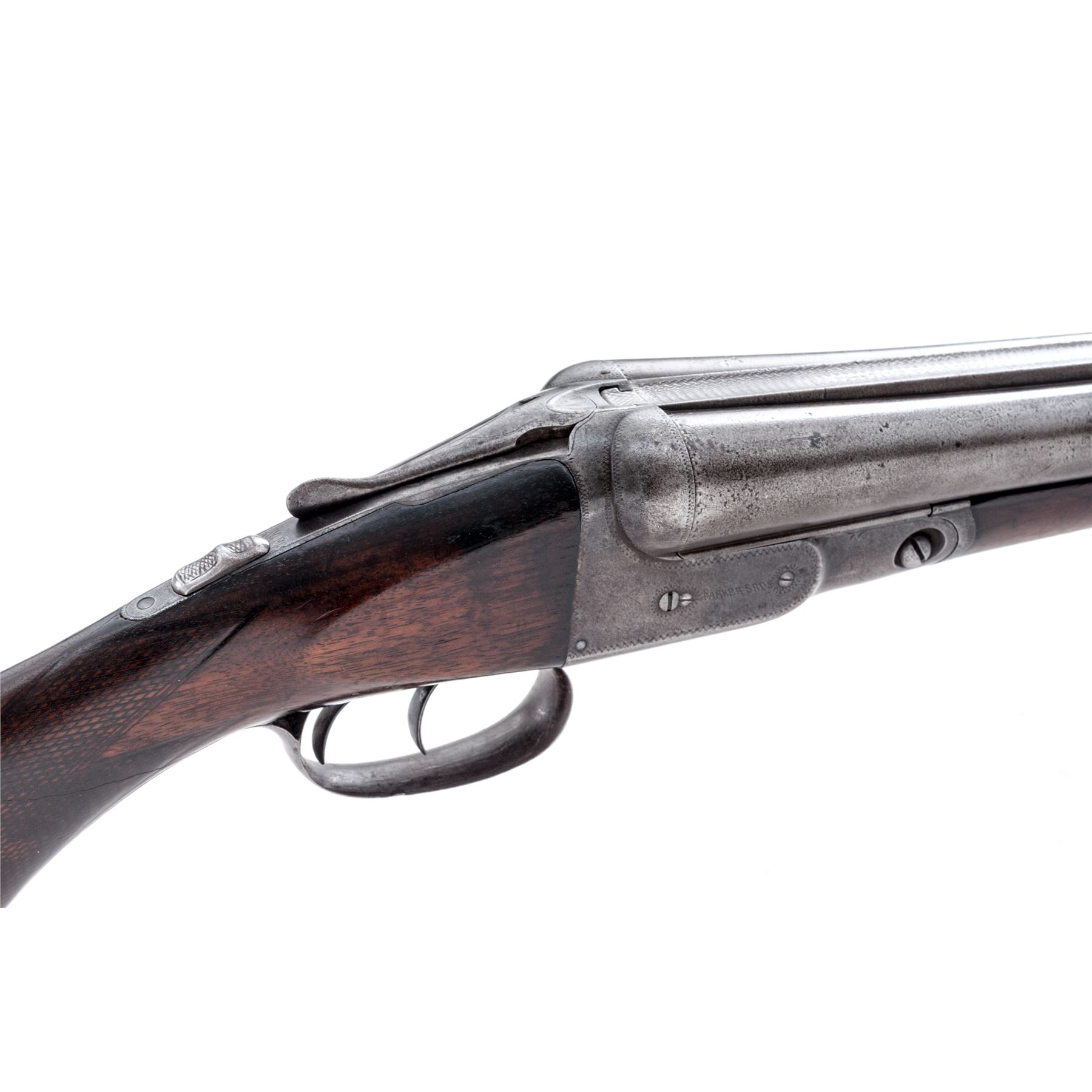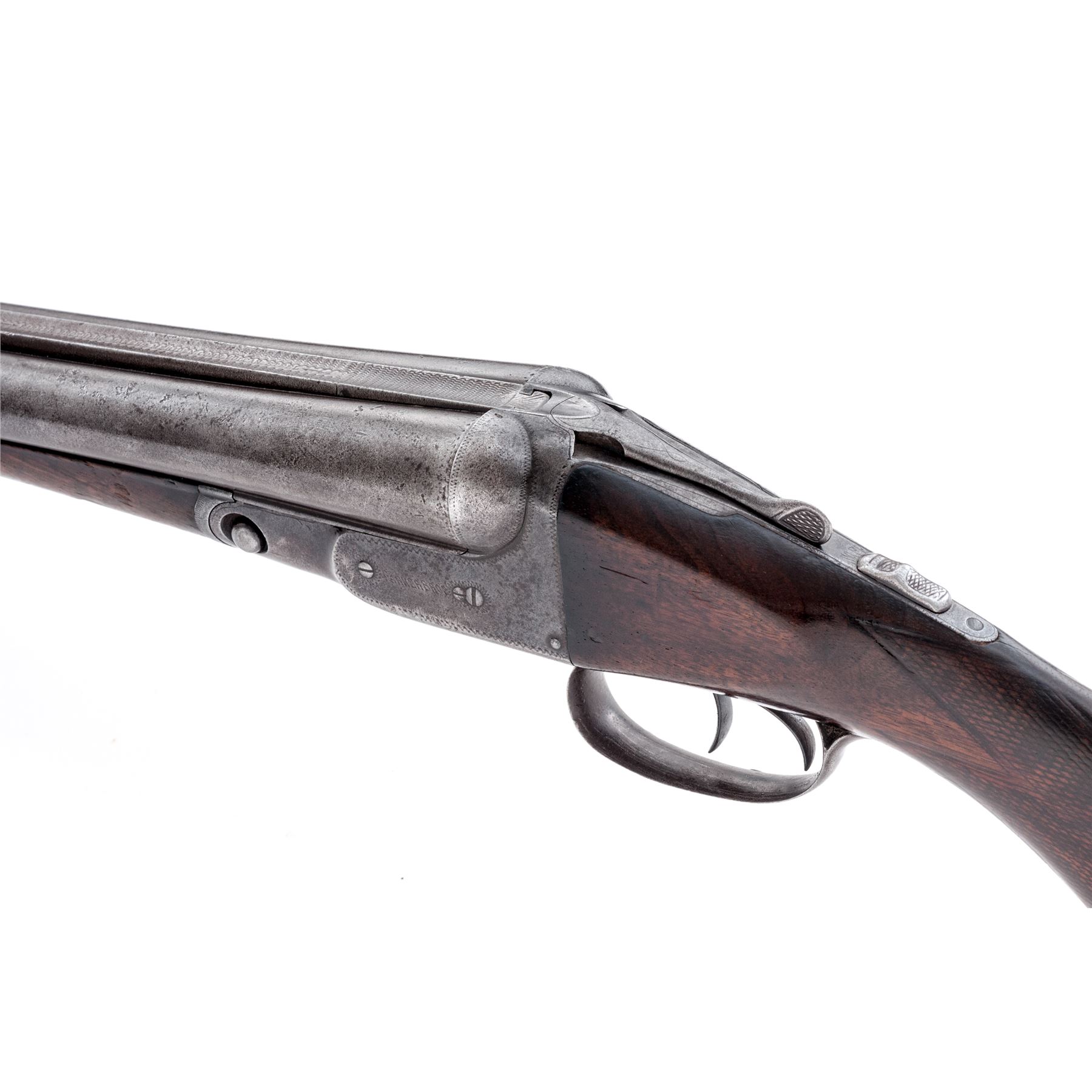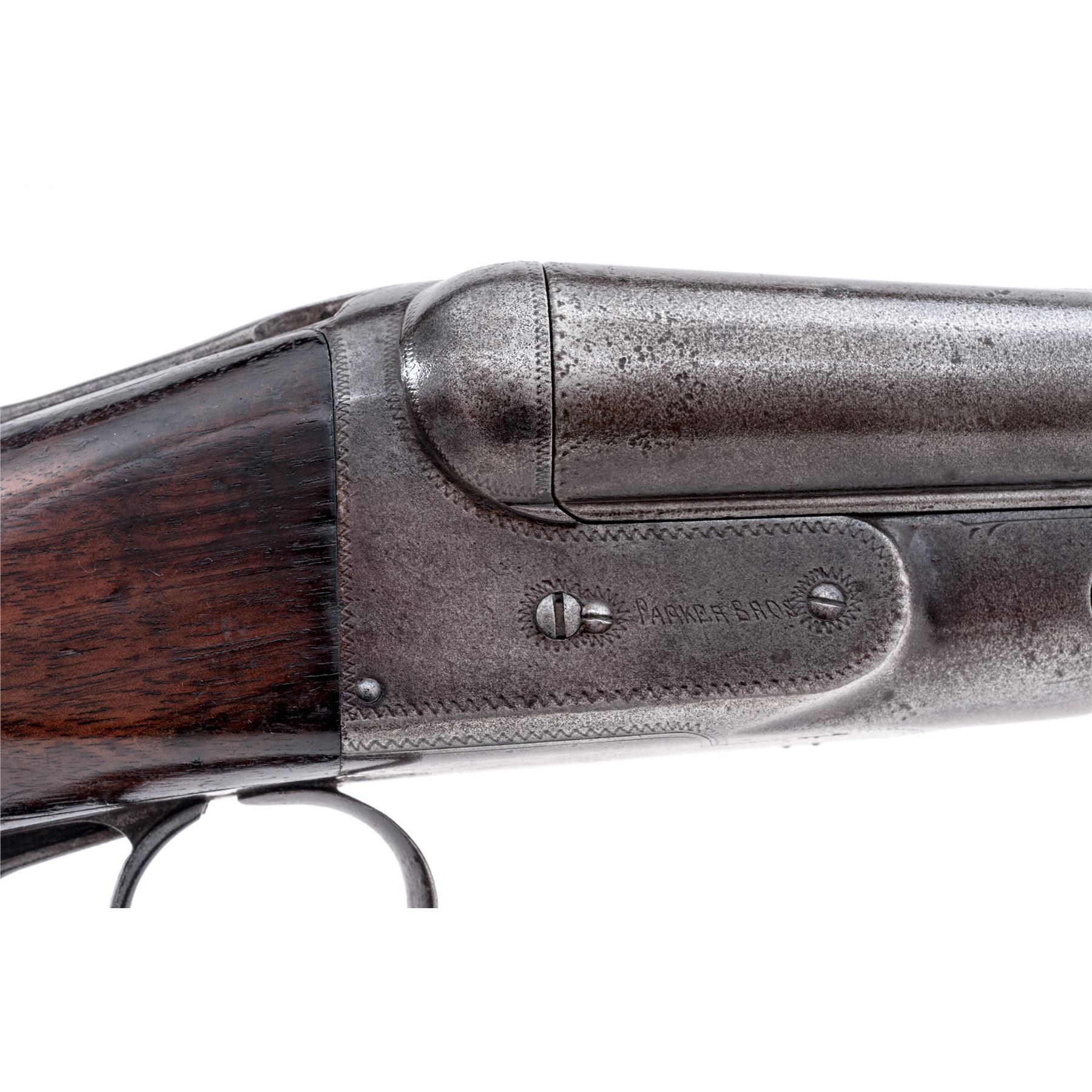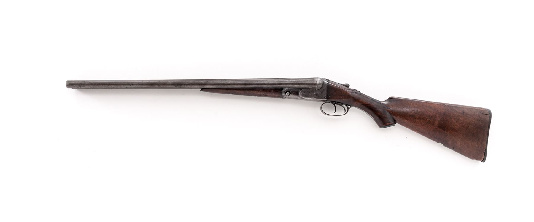 Parker Trojan Side-by-Side Shotgun, #147428, 12 ga., 2-3/4'' chambers, 24'' cutdown barrels, originally blue and case hardened finish, double trigger, auto safety and extractors, pistol-grip checkered walnut stock with splinter forend. Mfg'd 1907. Condition is very good retaining approx. 20%-30% original finish. Stock with moderate to heavy flattening of details. Good action and bores. The ultimate coach gun. Est.: $450-$650. (C&R)