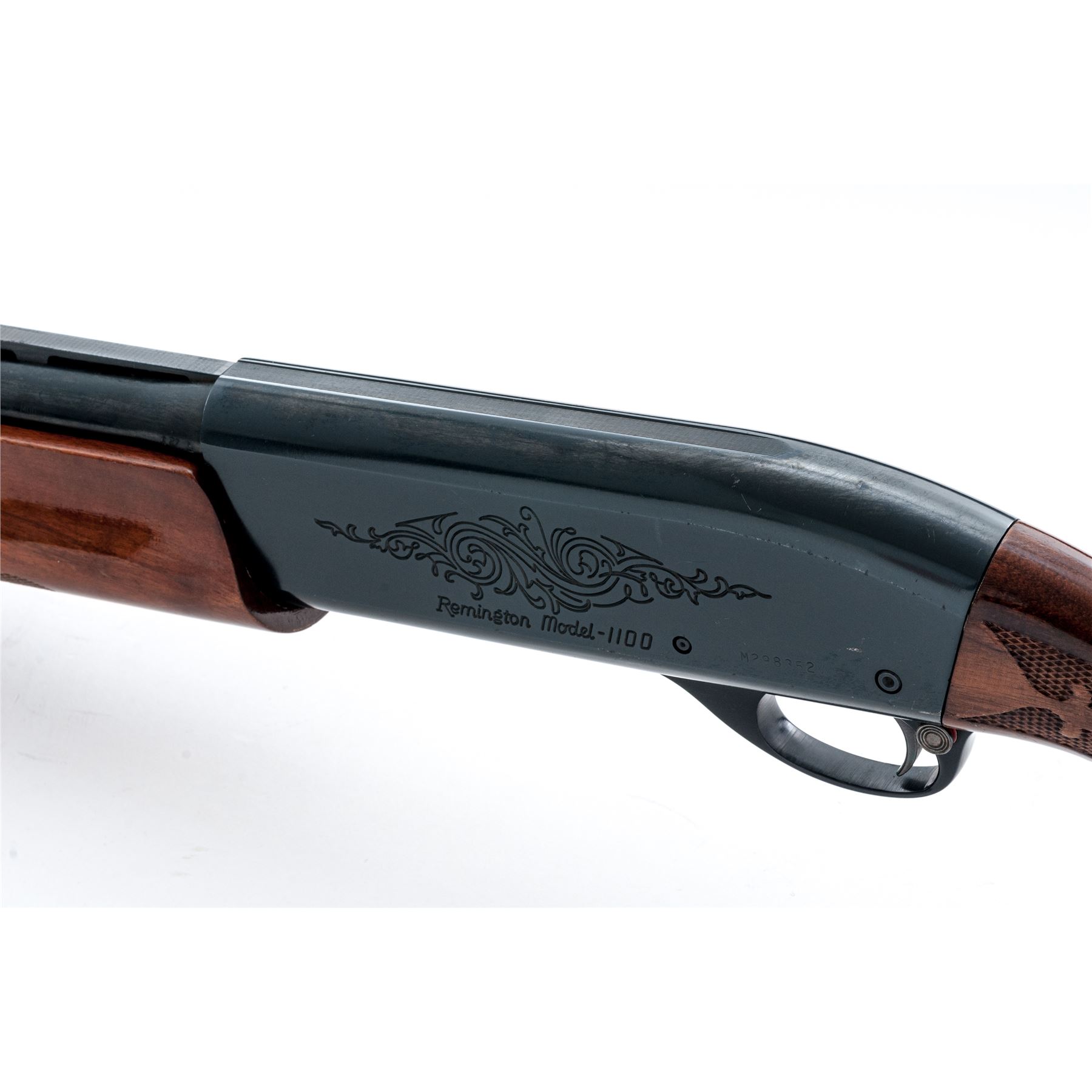 Remington Model 1100 Semi-Automatic Shotgun, #M298352V, 12 ga., 28'' vent rib barrel with white bead front sight and mid-sight, 2-3/4'' chamber, internal screw-in IC choke, blue finish, receiver with standard light engraving. Gloss-finished pistol-grip wood stock with press checkering, black rubber Pachmayr recoil pad, and black composite grip cap that is missing the white diamond center; stock has been neatly shortened with a 13'' LOP. Condition is very good, shotgun has been moderately used but not abused. Metal with approx. 97% factory finish; receiver with some light scratches, mainly on left side. Wood with light handling marks, retaining a nearly all of its gloss finish; checkering is unmarred. Action is smooth and tight with a bright bore. Est.: $250-$400. (Modern)