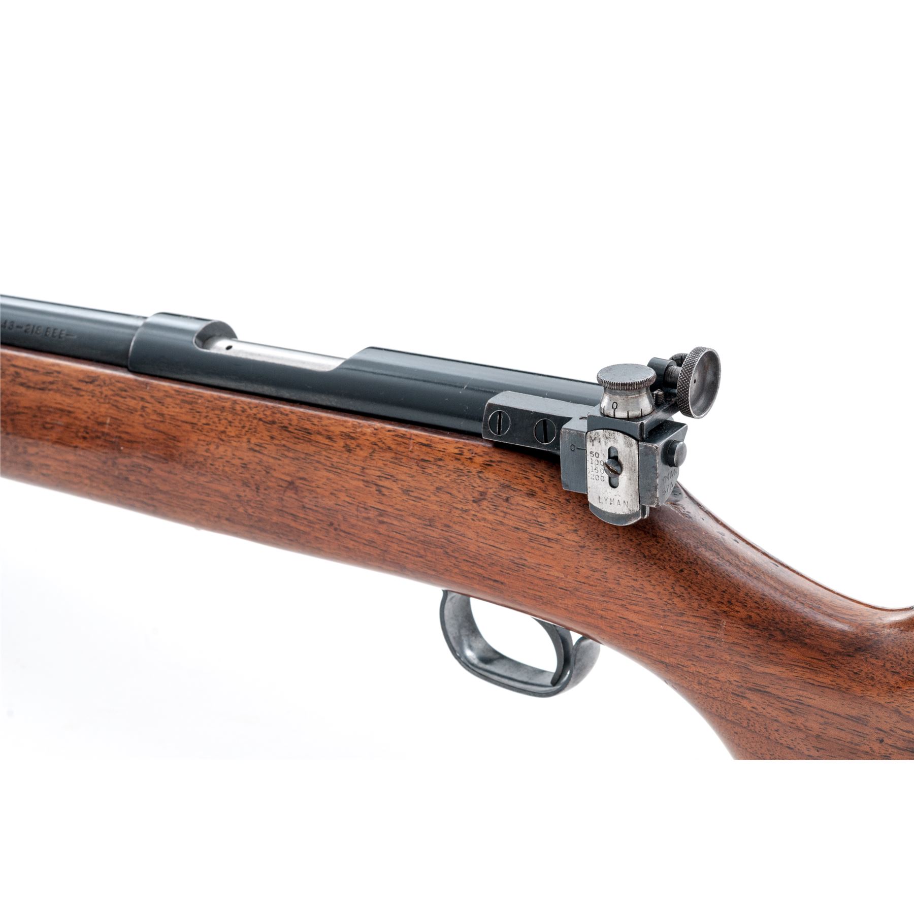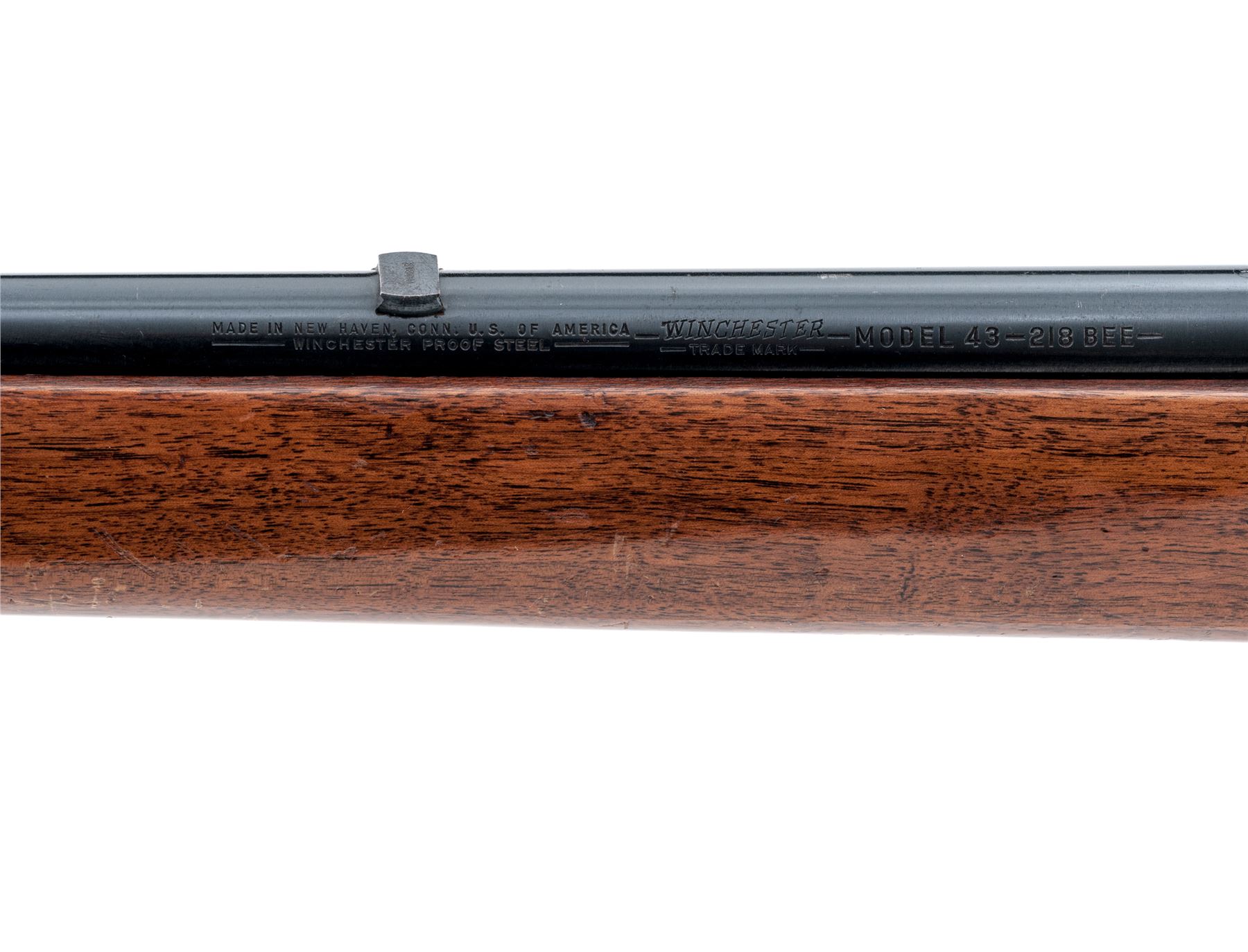 Winchester Model 43 Bolt Action Rifle, #18521A, .218 Bee cal., 24'' barrel, blue finish; one-piece pistol-grip walnut stock, checkered steel buttplate, with sling swivels, silver beaded blade front sight on ramped base, rear sight has been removed and filled with a dovetailed blank; with Lyman 57A receiver sight. Included is one magazine. Rifle shows standard markings, including Winchester proofs on top of barrel and receiver. Mfg'd 1949-1957. Approx. 93%-95% original blue finish remains and metal surfaces are in fine condition. Barrel with scattered light scratches and handling marks; bolt handle and body with operational finish loss; triggerguard with mild thinning and toning. Barrel address and other factory lettering are clear and defined. Stock is solid, no chips or cracks but does have several shallow scratches and impressions throughout, a little heavier on the right side; most of the semi-gloss finish remains. Action is smooth, bore is clean with excellent rifling. Est.: $500-$700. (C&R)