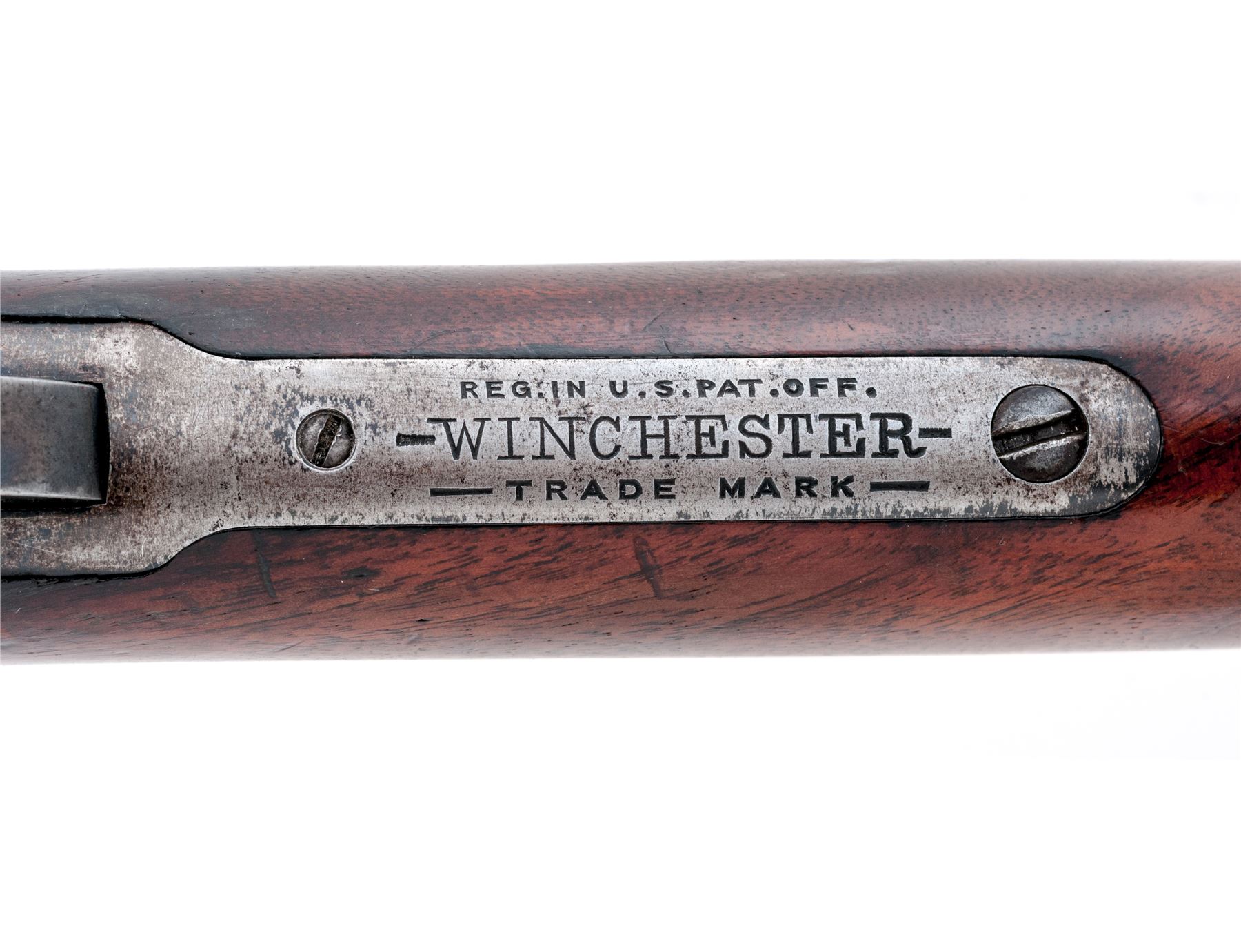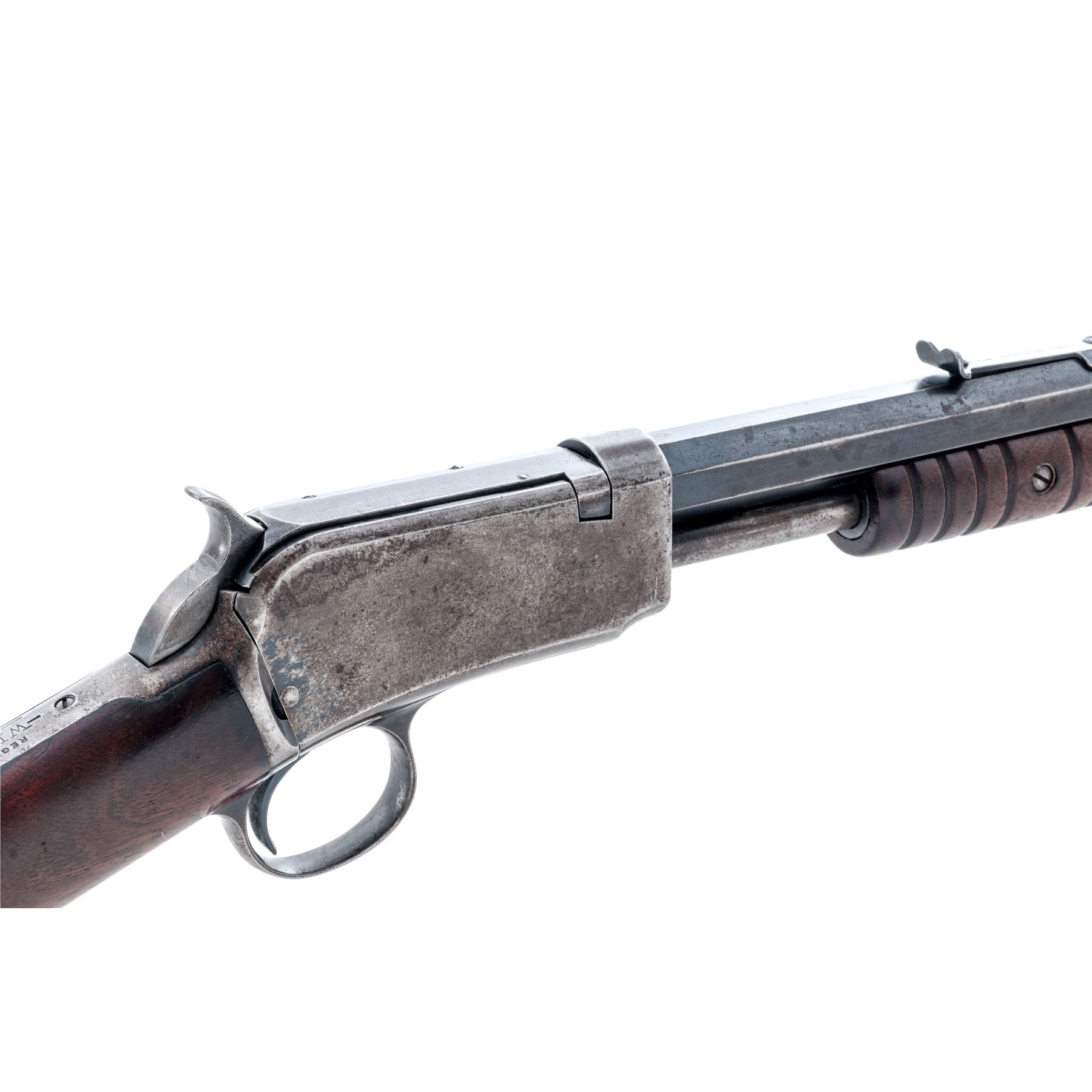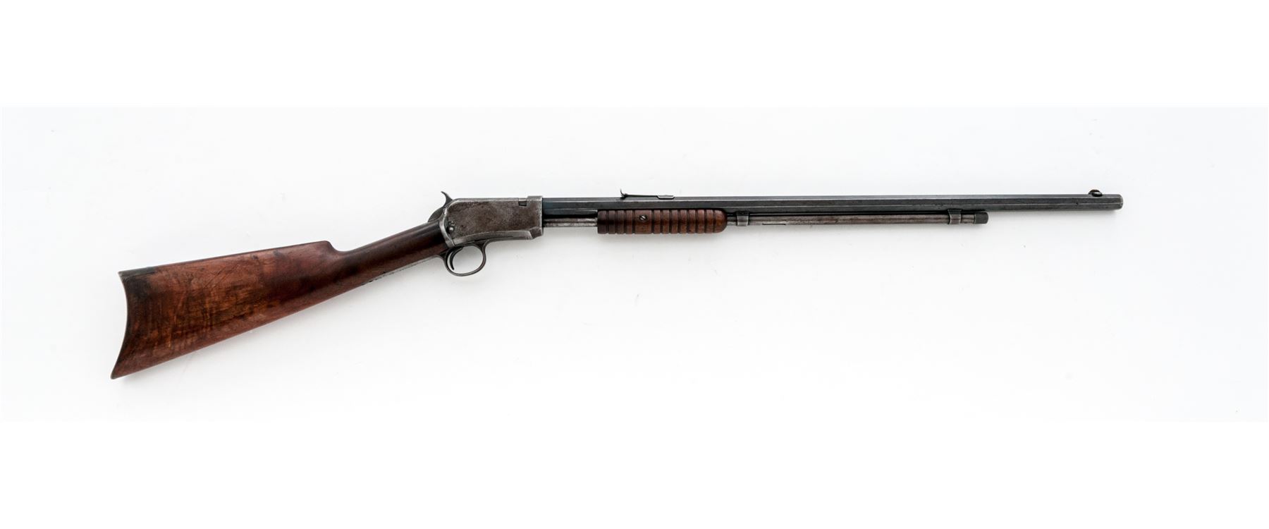 Winchester Model 1890 Third Model Pump Action Rifle, #425224, .22 Short cal., 24'' octagon barrel, straight grip walnut stock, 12-groove forend, crescent steel buttplate, dovetailed brass blade front sight and ''V''-notched rear sight with elevation screw. Top of barrel and receiver are Winchester proofed. Mfg'd 1910. Condition overall is very good. Barrel retains approx. 90% thinning and lightly toning original blue finish, barrel address is clear and defined; magazine tube with a mostly brown patina; frame retains little finish and is mostly silvery gray with cloudy dark spotting. Forend is very good for its age with only intermittent small handling marks. Stock with an added coat of finish overall shallow scratches and field wear; a portion of the finish on the right side has thinned. Crisp action; very good bore that is clean and has no visible surface erosion. Est.: $300-$500. (C&R)