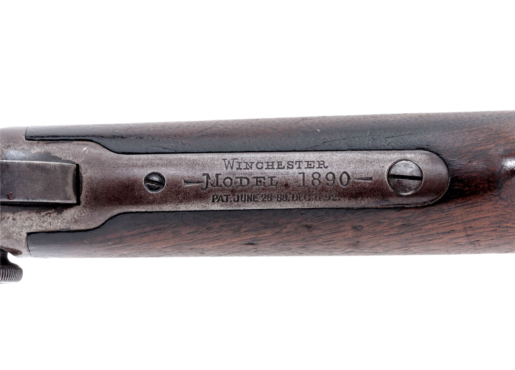 Winchester Model 06 Slide-Action Rifle, #56388, .22 S-L-LR cal., 20'' round barrel, blue finish, gumwood stock and forend, with standard sights (missing rear sight elevator screw). Mfg'd 1907. Condition is good retaining approx. 65% toning blue, with losses to left side of forend. Buttstock with moderate impressions and scratches. Good functioning action, fine bore. Est.: $250-$450. (C&R)
