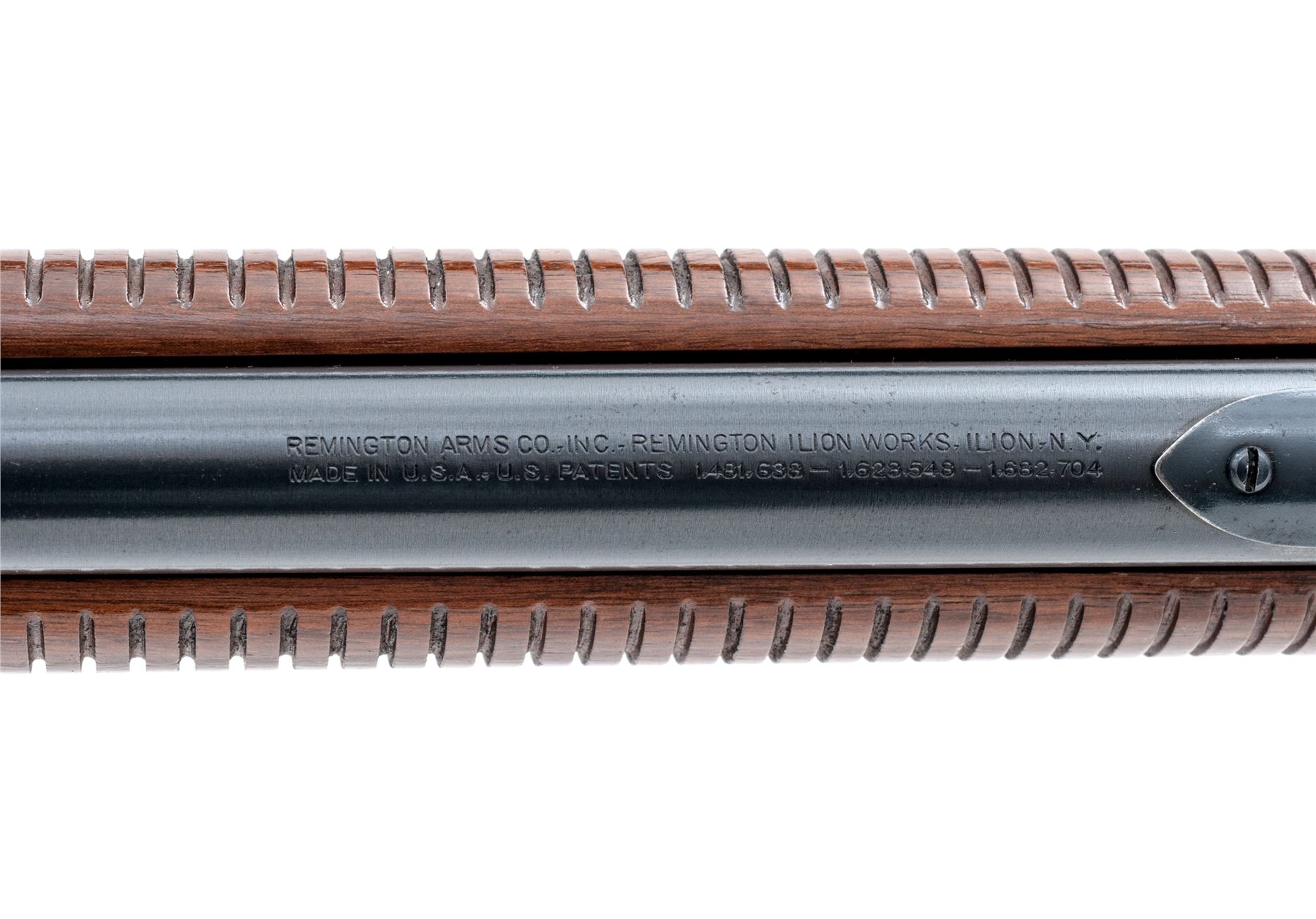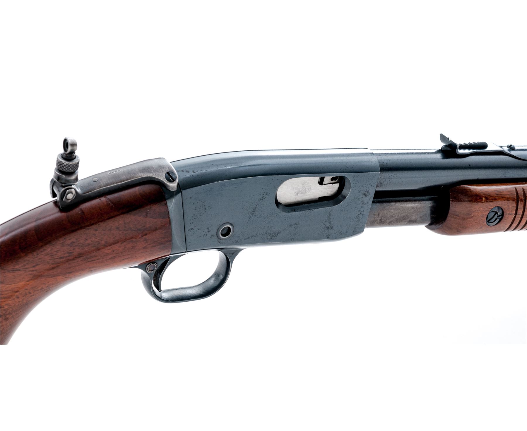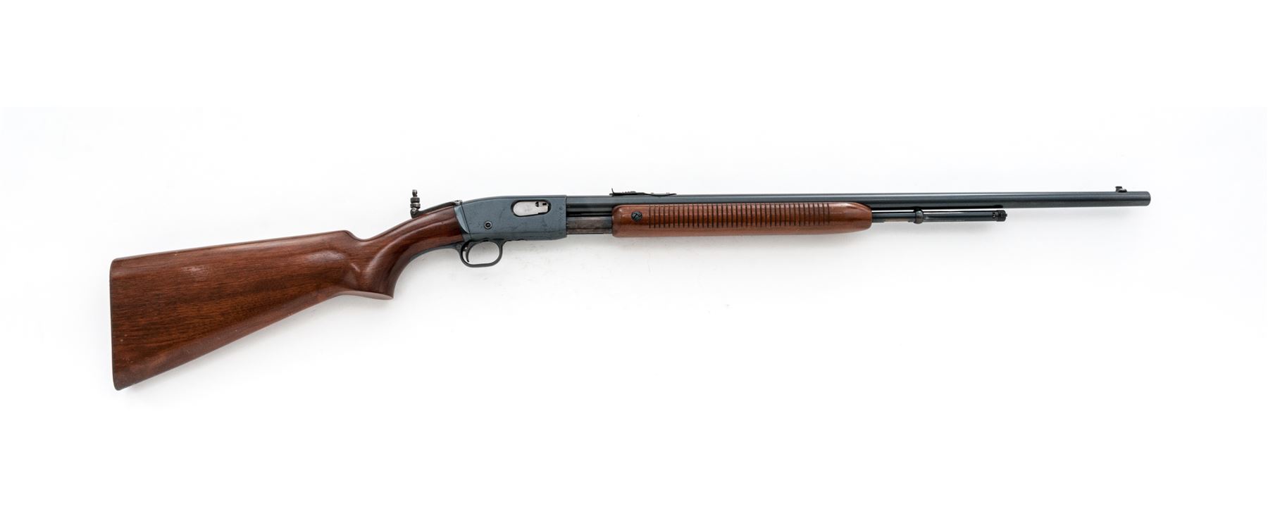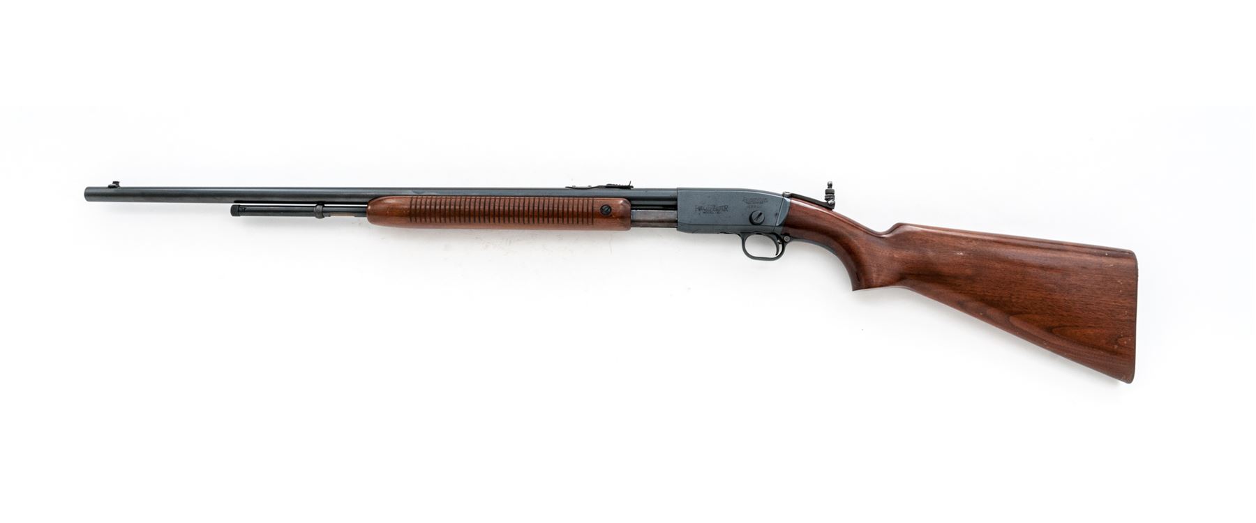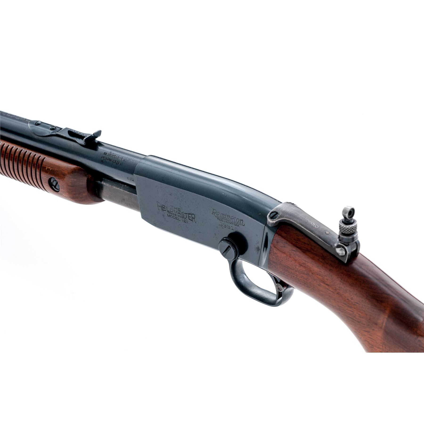 Remington Model 121 Fieldmaster Pump Action Rifle, #39910, .22 S-L-LR cal., 24'' round barrel, blue finish, pistol-grip walnut stock and grooved forend, checkered metal Remington buttplate, dovetailed silver bead front sight, notched elevator rear sight, with a Lyman peep sight. Remington barrel date code is ''OJ'', mfg'd 1940. Metal rates as fine and retains approx. 97% factory blue on barrel and receiver; lower portion of barrel around the address and rear sight as well as the frame with scattered pinprick oxidation and very fine pits or peppering to the metal. All of the factory lettering is crisp. Magazine tube shows normal mechanical wear; Lyman sight retains approx. 70% thinning and toning blue. Wood is very good retaining most of the original finish with small and shallow surface dings, mainly along the top and bottom edge of the buttstock. Excellent action, exceptional bore. Est.: $300-$500. (C&R)