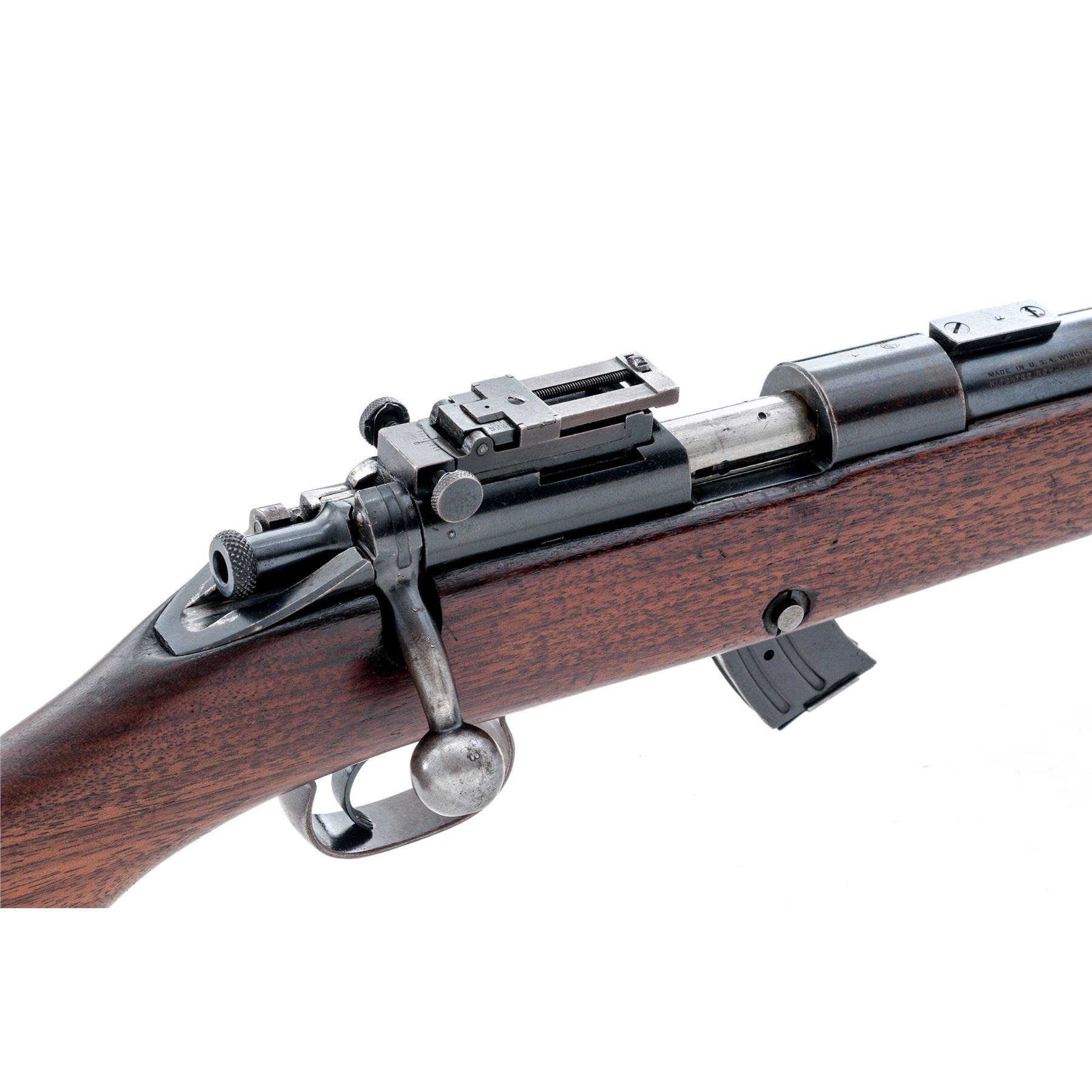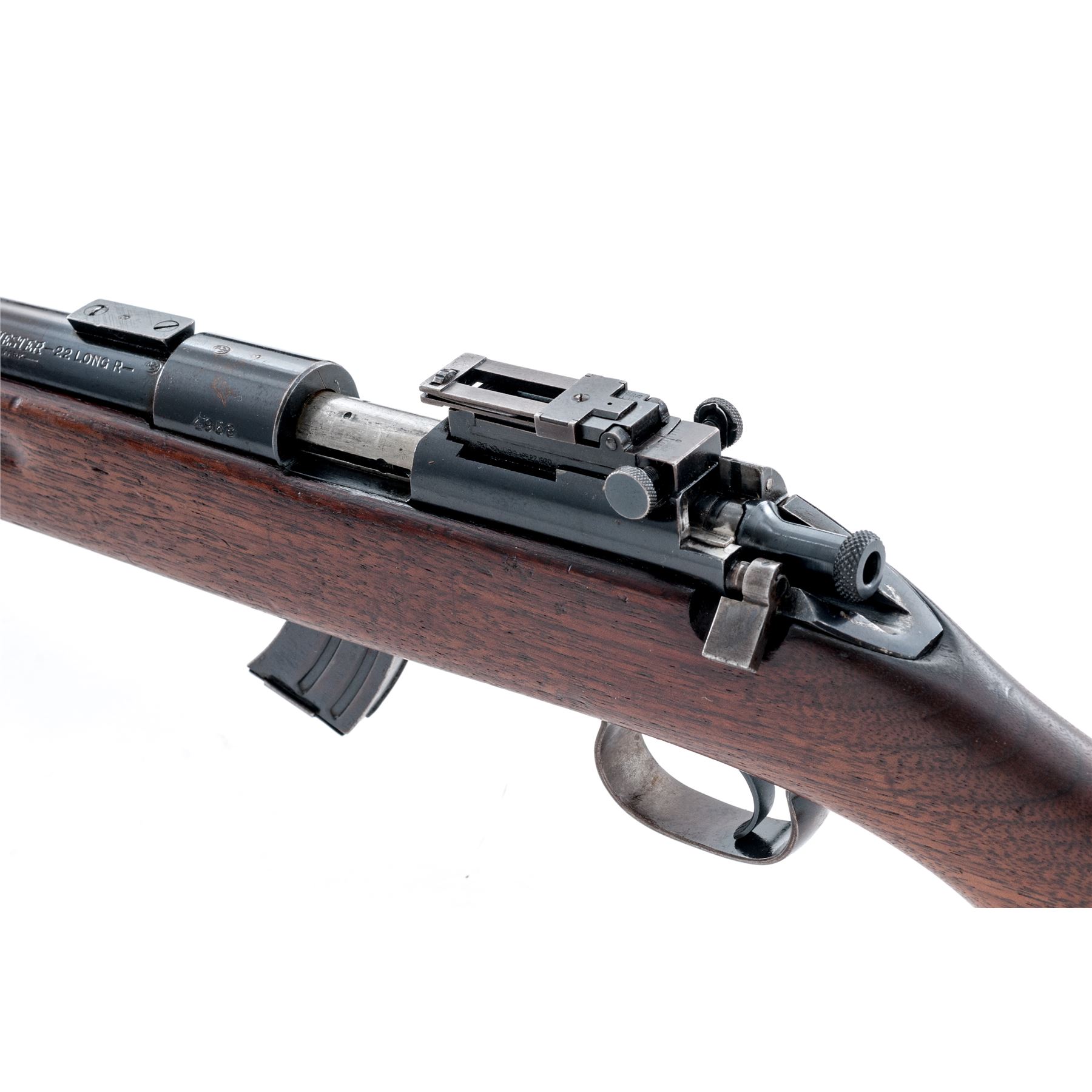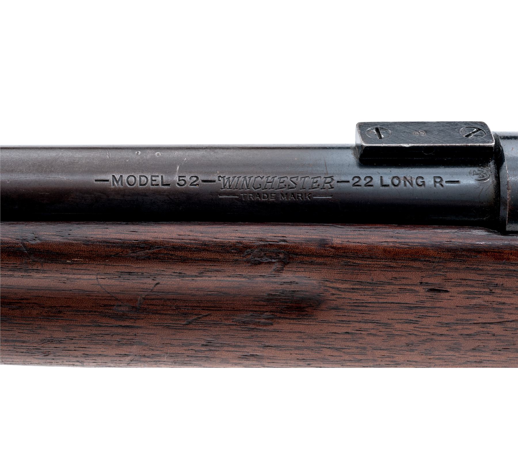 Pre-War Winchester Model 52 Bolt Action Target Rifle, #4958, .22 LR cal., 28'' barrel, blue finish, smooth pistol-grip walnut target stock, factory checkered steel buttplate, original Winchester aperture rear sight and standard front sight, as well as dovetailed scope blocks, and one 10-round Winchester marked magazine. Mfg'd 1926. Condition is near fine retaining approx. 90% blue. Stock with light general overall scuffs and scratches, and loss of definition to finger groove portion of stock. Good action, bright bore. Est.: $500-$750. (C&R)