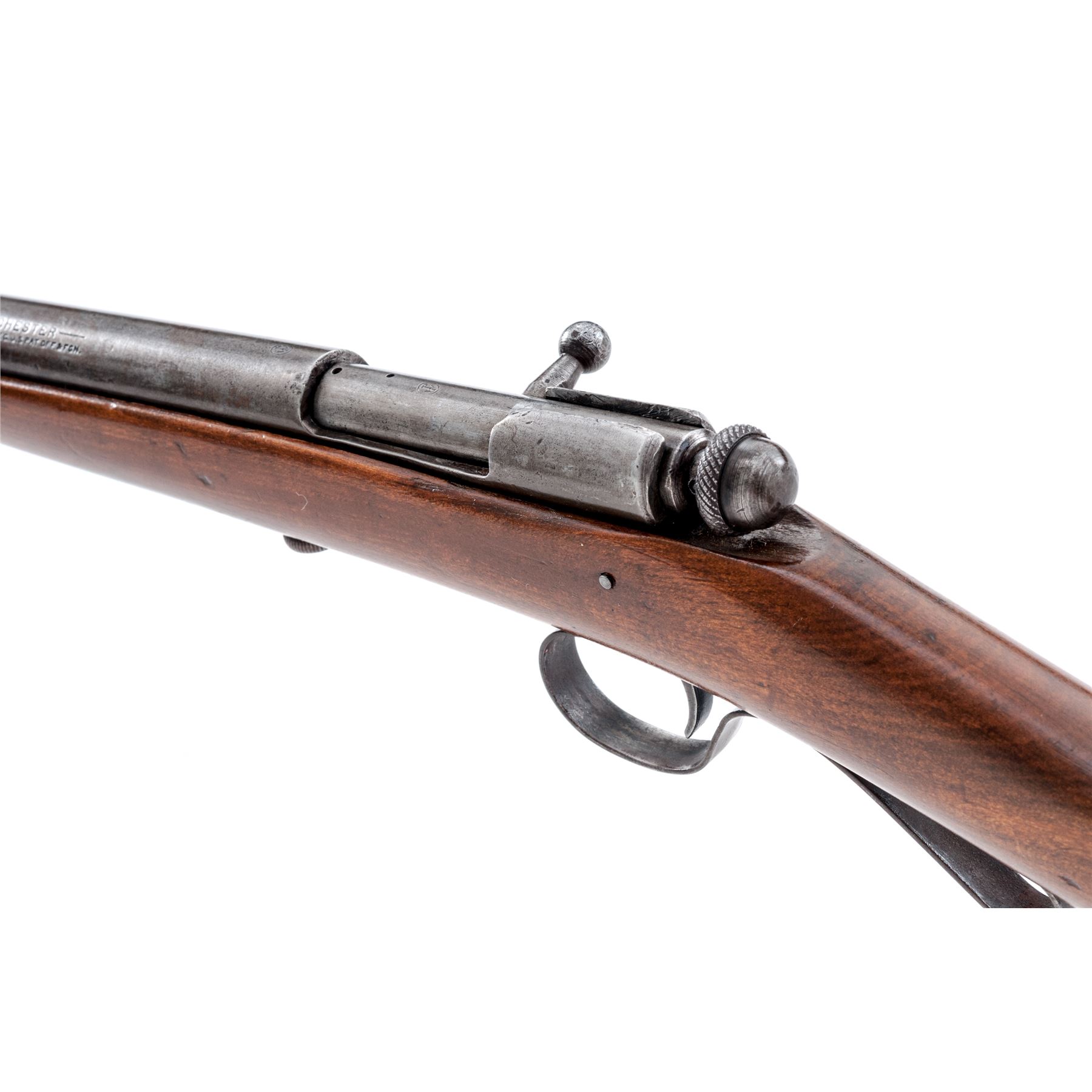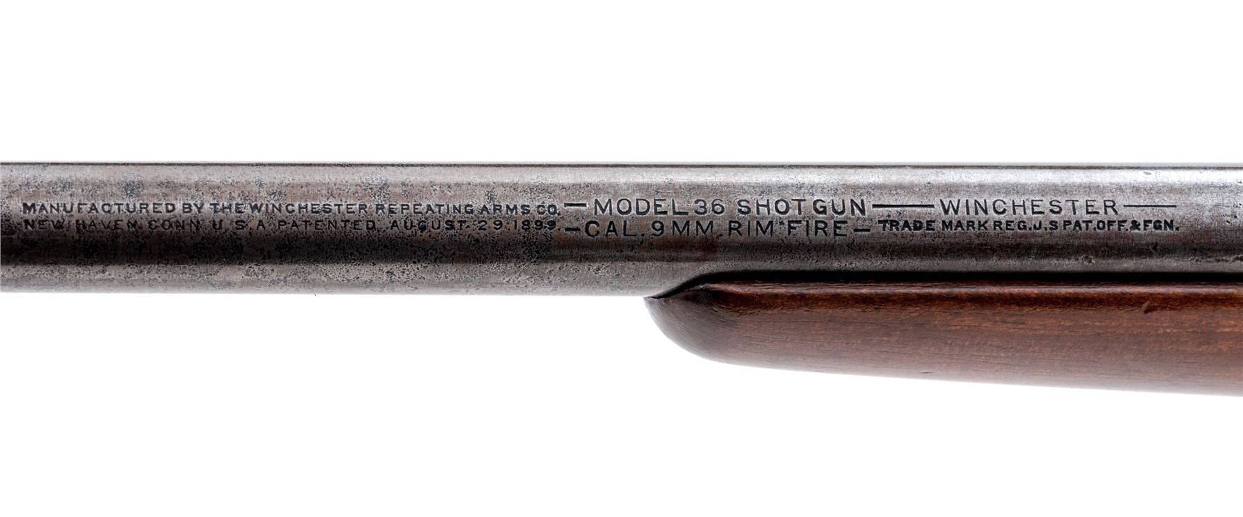 Winchester Model 36 Bolt Action Shotgun, or ''Garden Gun,'' NVSN, 9mm Shot RF cal., 17-3/8'' round barrel with post front sight, marked with maker's name, address and 1899 patent date, ''Model 36 Shotgun/Cal. 9mm Rim Fire'' and ''Winchester/Trade Mark Reg. U.S. Pat. Off. & Fgn.'' on left side; action has auto extraction and knurled ''acorn'' bolt knob; gumwood ''fish-belly'' halfstock has a scrolled sheetmetal triggerguard, large knurled screw retaining action in the stock, and checkered hard rubber buttplate with ''Winchester/Trade Mark'' in a circular sunburst-like cartouche. Mfg'd ca. 1920-27. Condition is very good. Metal shows an overall smooth gunmetal gray-brown patina, with sharp markings. Stock is sound and smooth with minimal use marks, a secure crack at left butt, and what may be a later varnish finish; buttplate shows moderate wear with mostly clear checkering and markings. Action functions; smoothbore is clean. Est.: $400-$700. (C&R)
