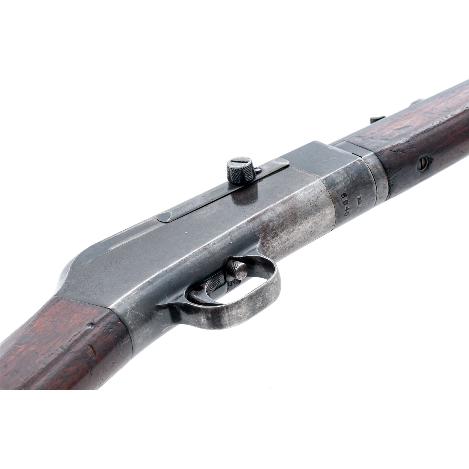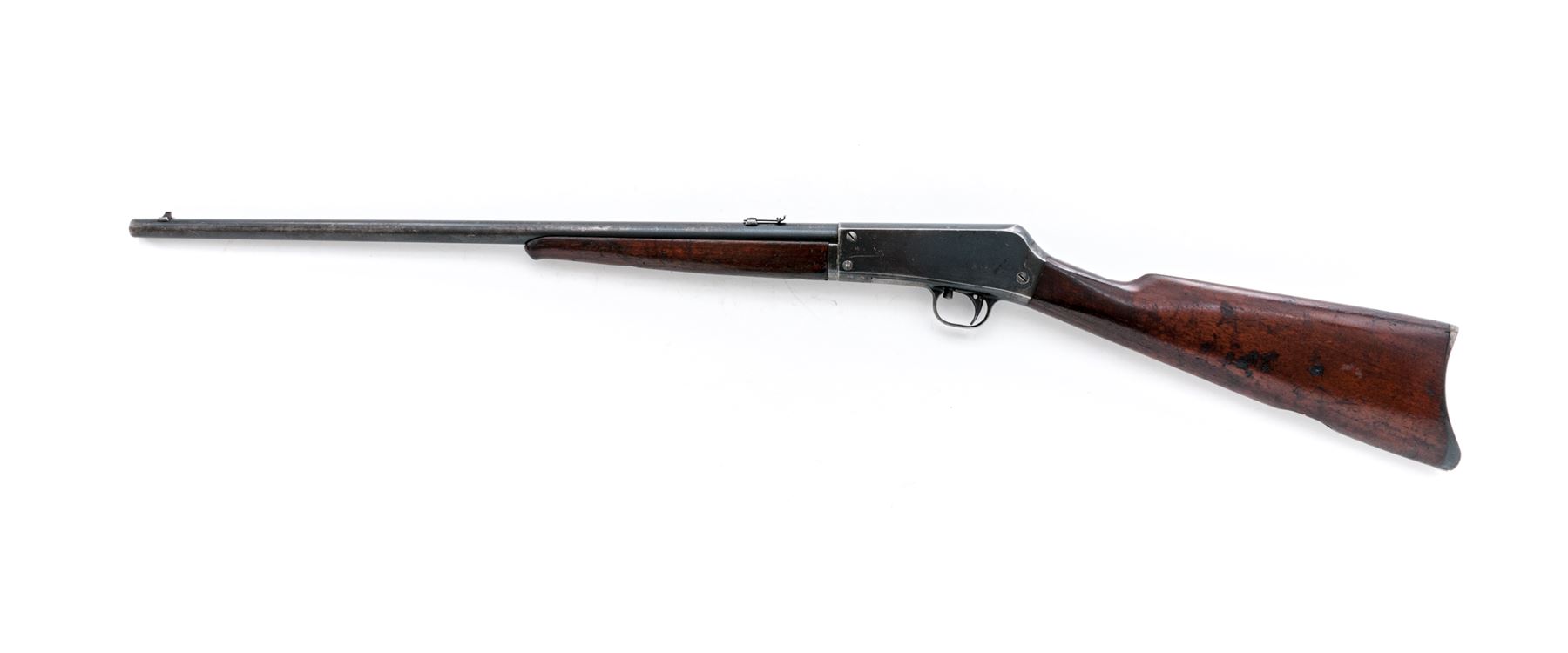 Remington Model 16 Auto-Loading Takedown Rifle, #6040, .22 Rem. Auto-loading cal., 22'' barrel, blue finish, straight grip walnut stock and forend, crescent steel ''Remington-UMC'' marked buttplate, dovetailed blade front sight with brass bead, notched rear sight with elevation adjustment screw. Barrel and receiver with matching numbers. Condition overall is good with approx. 65% remaining thinning and toning original finish. Barrel address is clear and defined. Right side of barrel near the receiver with two moderate impressions. Sound wood with an old added coat of finish over numerous dings and mars. Smooth action; dark bore with some intermittent light erosion, rifling is good. Est.: $200-$400. (C&R)