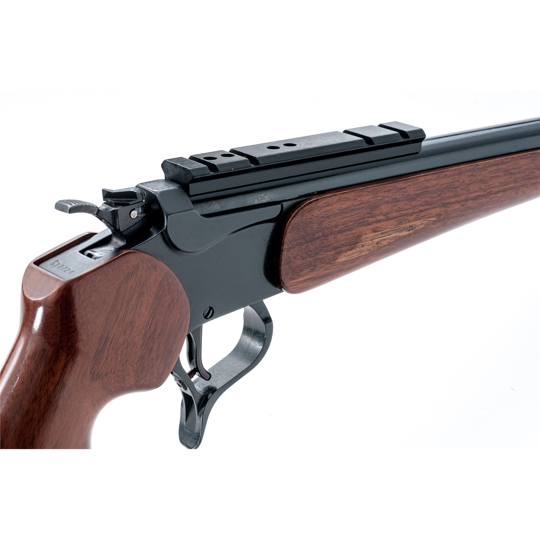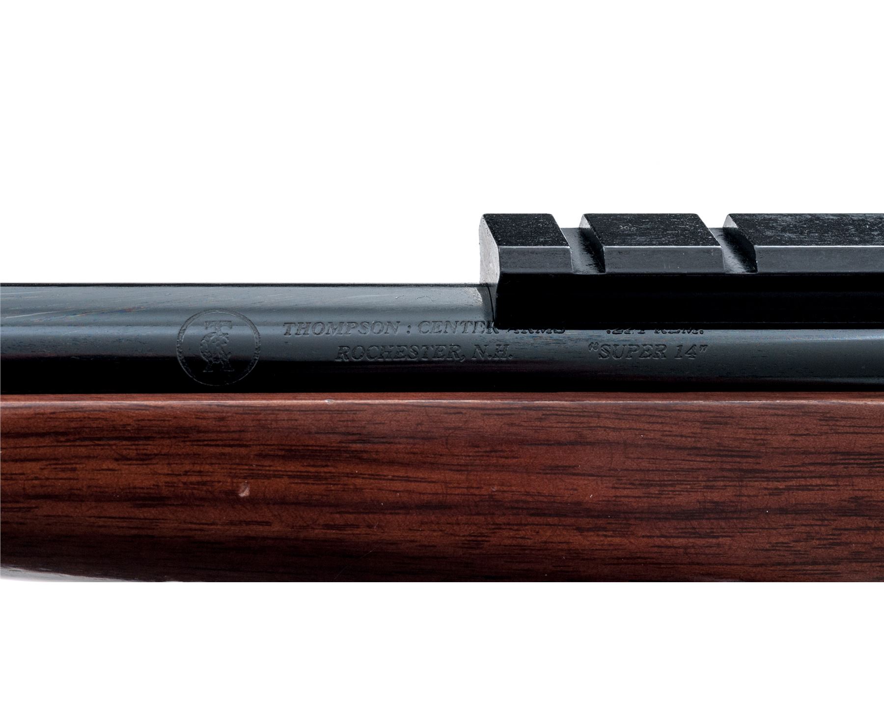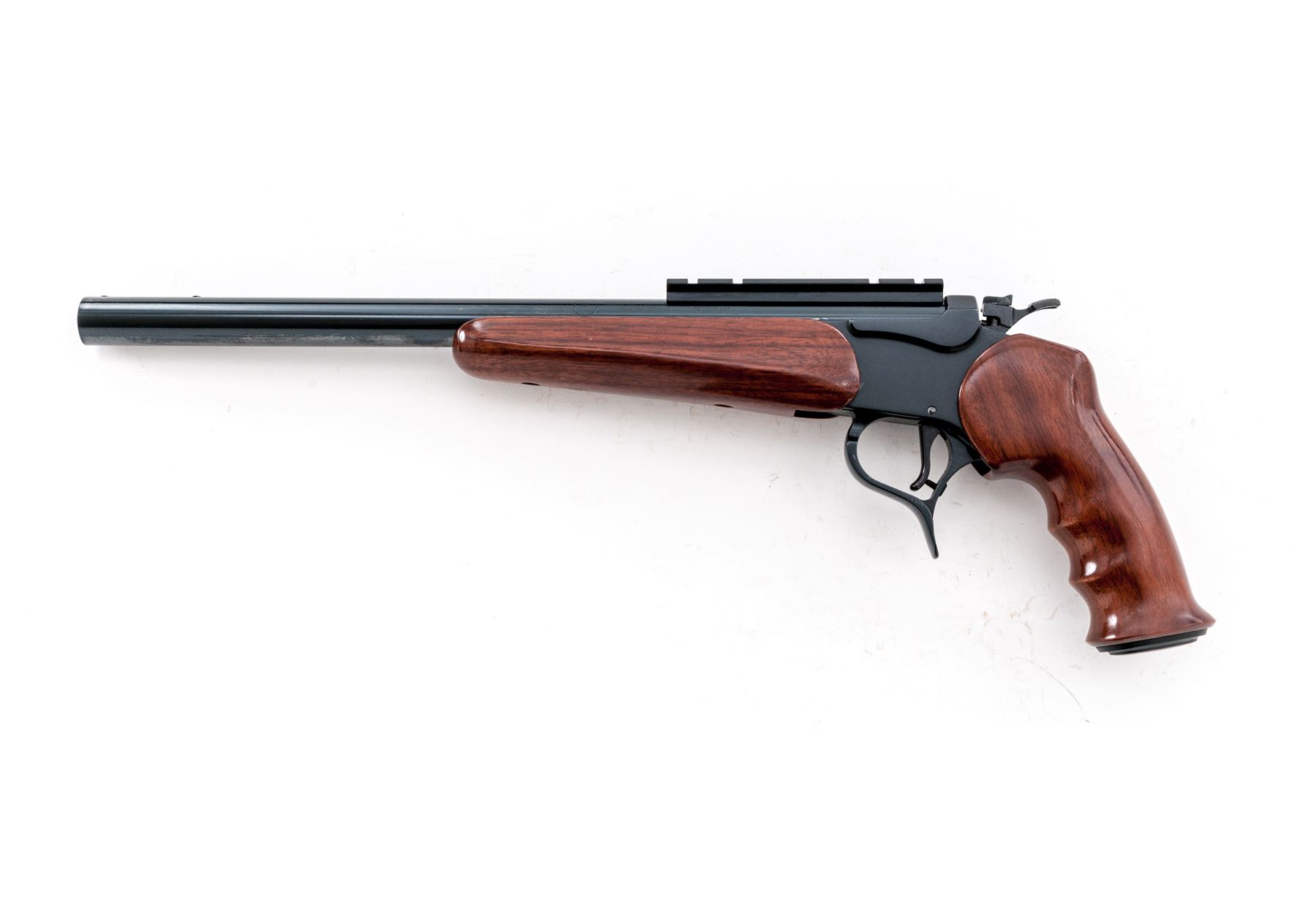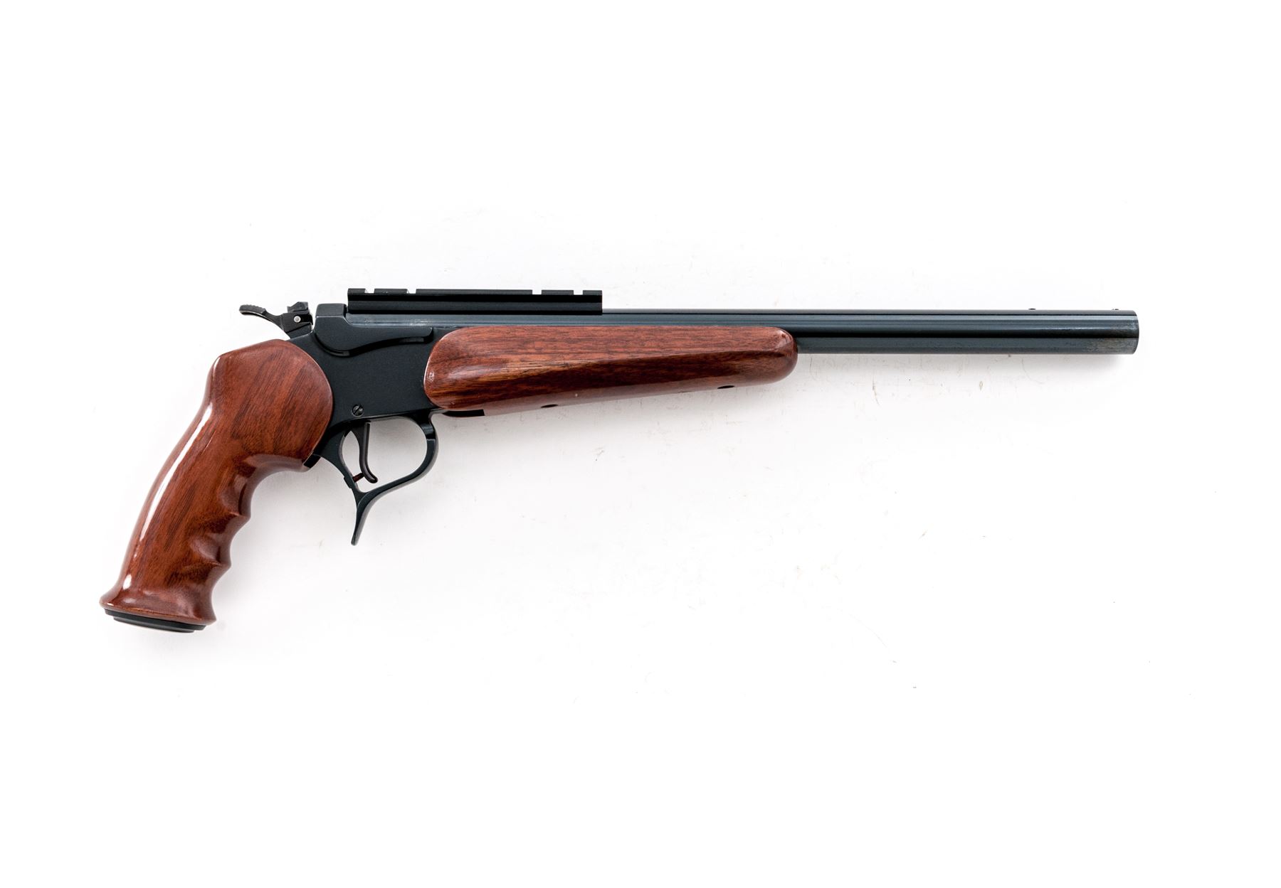 Thompson Center Arms G2 Contender Single Shot Pistol, #G17724, .221 Rem. cal., 14'' ''Super 14'' barrel, blued finish, smooth walnut forend and finger grooved grip, with ''TC'' grip cap. Center/Rimfire selector switch is mounted on the hammer. Top of barrel is fitted with a one-piece scope base for Weaver style rings; front sight holes are filled with plug screws. Condition overall is excellent. Barrel and receiver retain approx. 98%+ original finish. Forend and grip with a few normal light handling marks; finish on the right side of the forend with a little thinning towards the back edge. Excellent action, mirror bright bore with sharp rifling. Est.: $400-$600. (Modern)