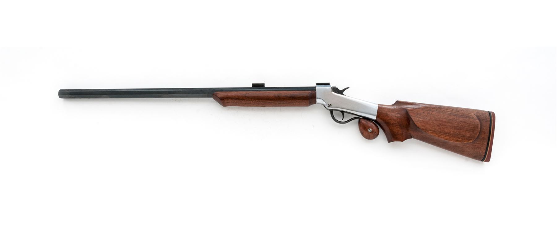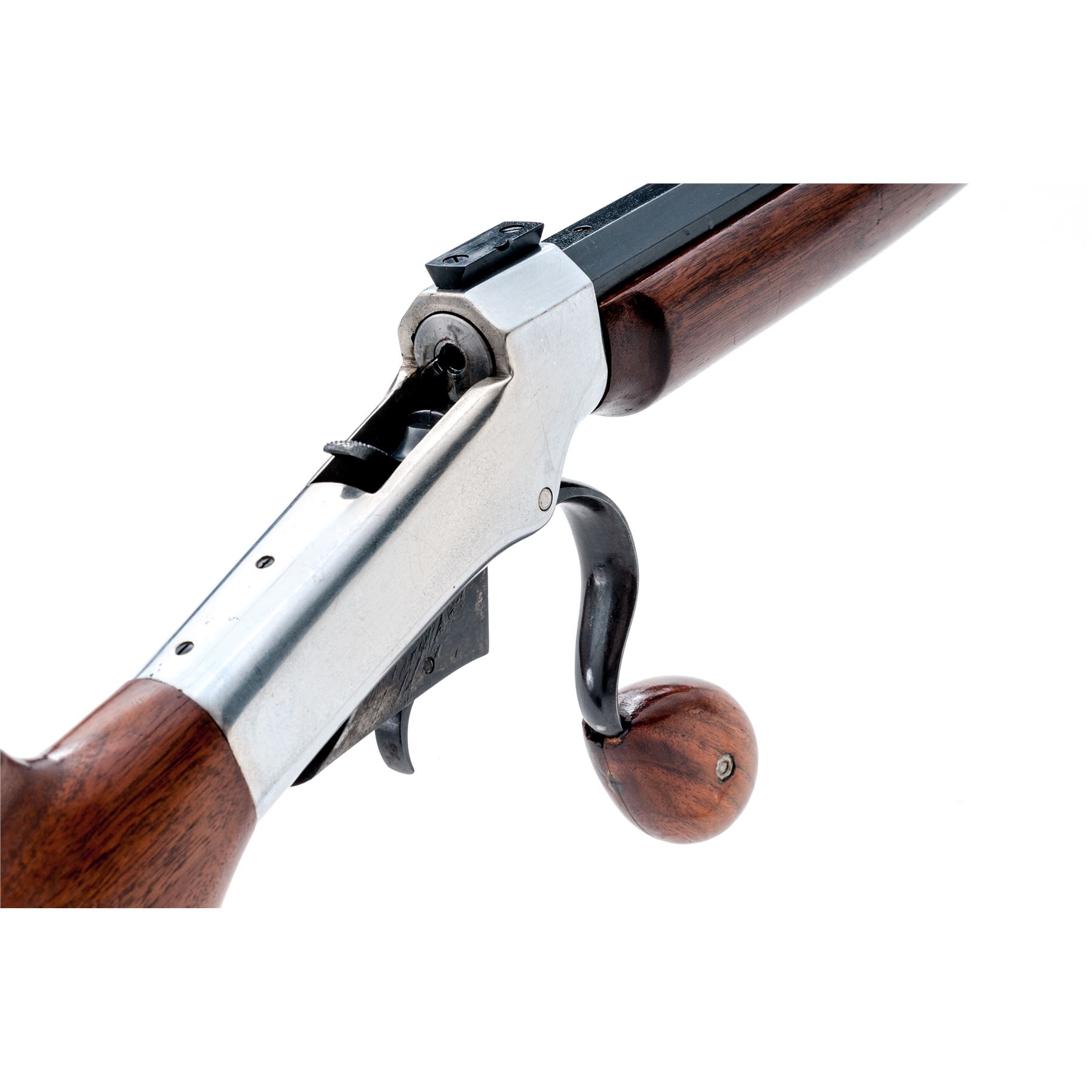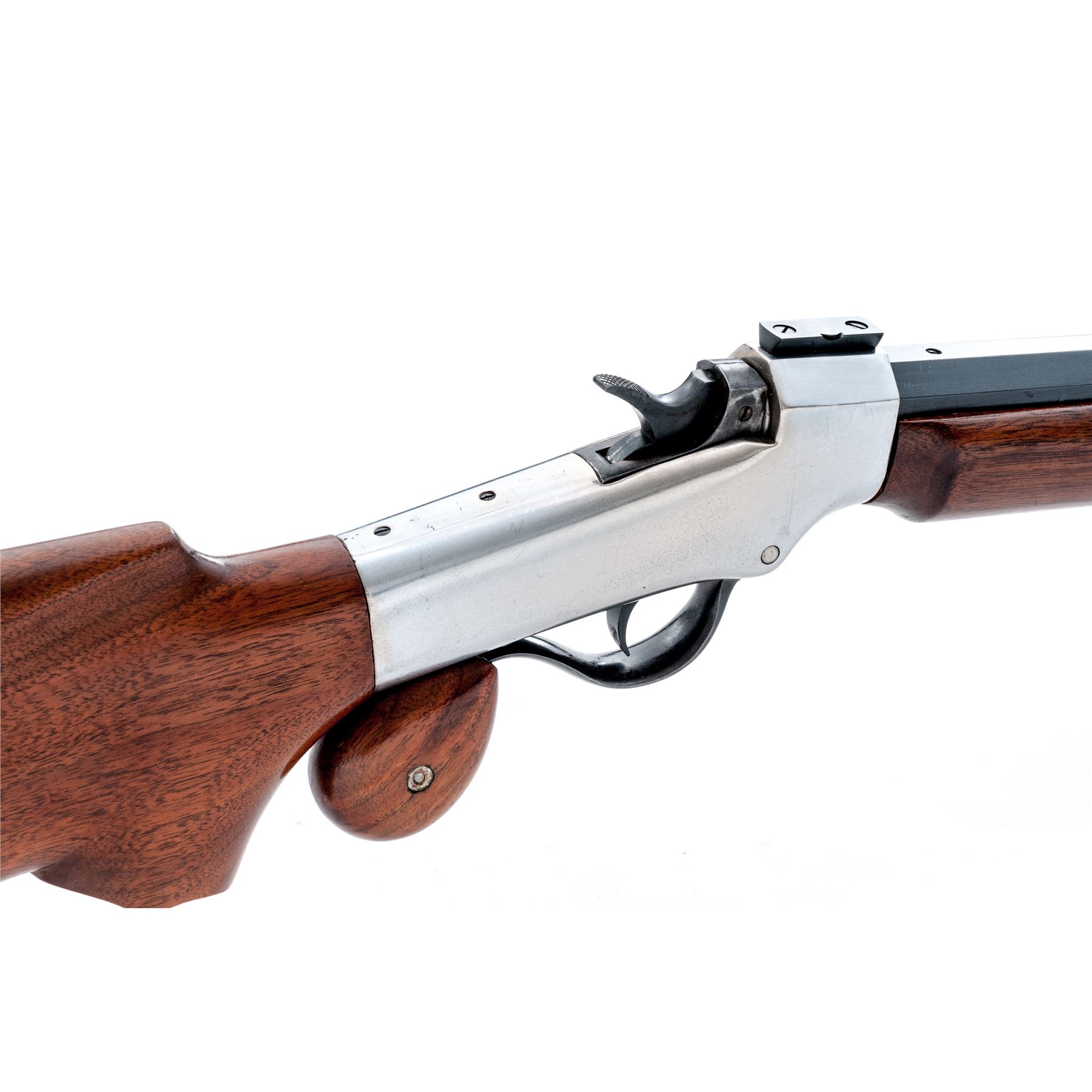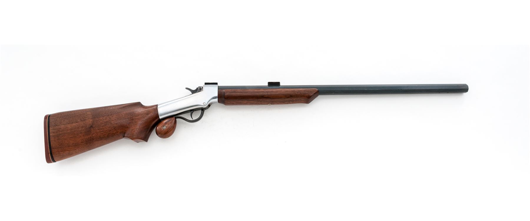 Ballard Action Single Shot Target Rifle, #1599, sleeved to .22 LR cal., 25.5'' medium-weight blue octagon barrel, nickel frame, pistol-grip cheekpiece walnut stock and forend, with red rubber butt pad, dovetailed scope mounts, with the original sight slots neatly filled with dovetailed blanks. Condition is excellent as modified with scuffs to both sides of the renickeled frame. Barrel has also been re-colored. Wood with just very light abrasions from handling. Action remains crisp with very light trigger; bore and recessed crown are excellent. Est.: $450-$650. (Antique)