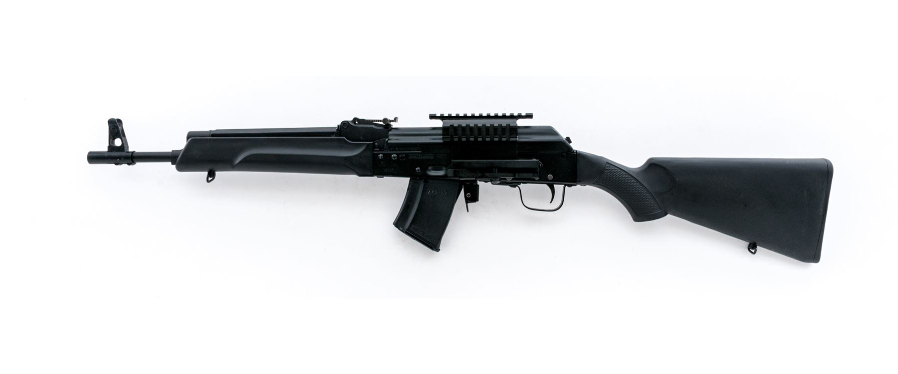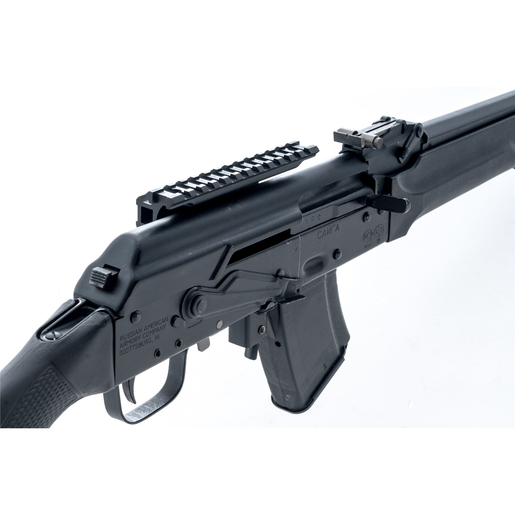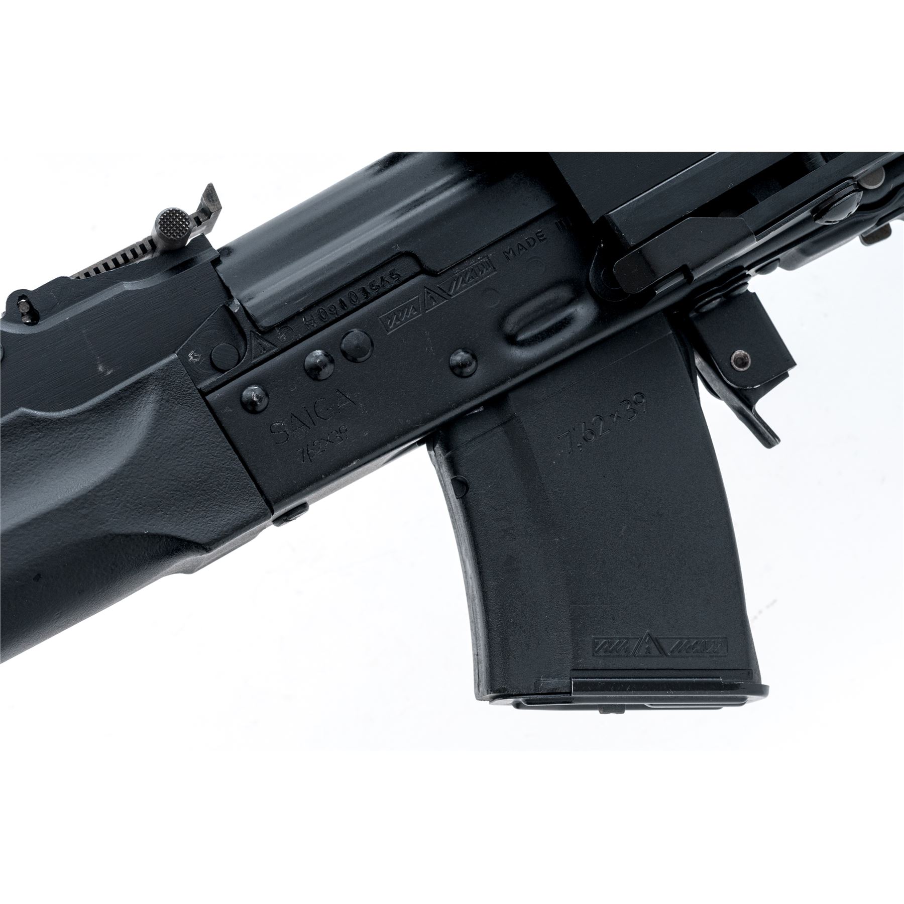 Featureless Izhmash Saiga IZ-132 Semi-Automatic Rifle, #H09103565, 7.62x39 cal., 16.5'' barrel, matte black finish, black synthetic rifle stock, sling swivels, standard sights, and four (4) 10-round polymer magazines. Two-piece side railed Picatinny scope mount with quick release lever. In original box with Certificate of Authenticity, service manual, cleaning rod, plastic oiler, and cleaning kit. Condition is excellent overall, showing a small amount of light handling marks to the handguard and some of the matte metal surfaces, all are normal for a lightly used rifle. Approx. 98% black finish remains. Mechanically excellent with a mirror bright clean bore. Est.: $700-$900. (Modern)