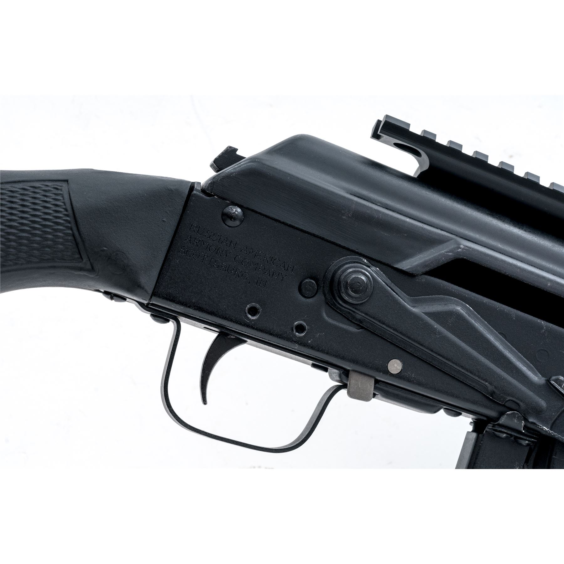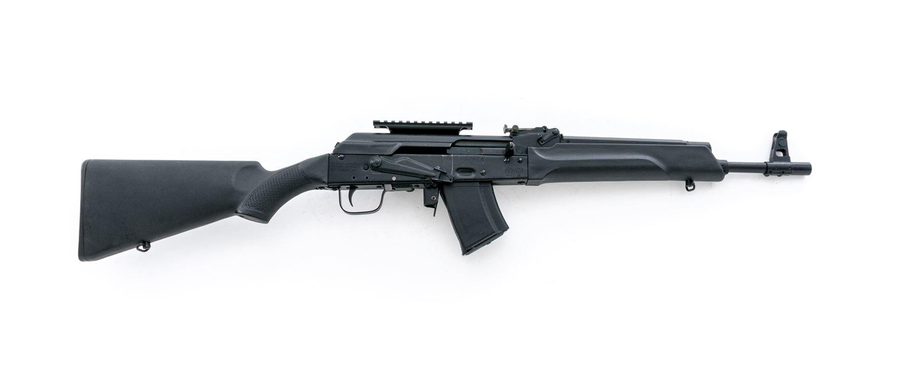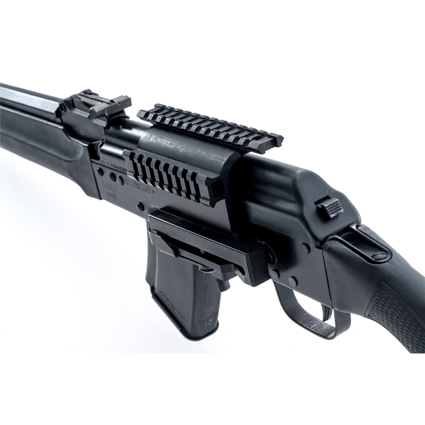 Featureless Izhmash Saiga IZ-132 Semi-Automatic Rifle, #H09103565, 7.62x39 cal., 16.5'' barrel, matte black finish, black synthetic rifle stock, sling swivels, standard sights, and four (4) 10-round polymer magazines. Two-piece side railed Picatinny scope mount with quick release lever. In original box with Certificate of Authenticity, service manual, cleaning rod, plastic oiler, and cleaning kit. Condition is excellent overall, showing a small amount of light handling marks to the handguard and some of the matte metal surfaces, all are normal for a lightly used rifle. Approx. 98% black finish remains. Mechanically excellent with a mirror bright clean bore. Est.: $700-$900. (Modern)
