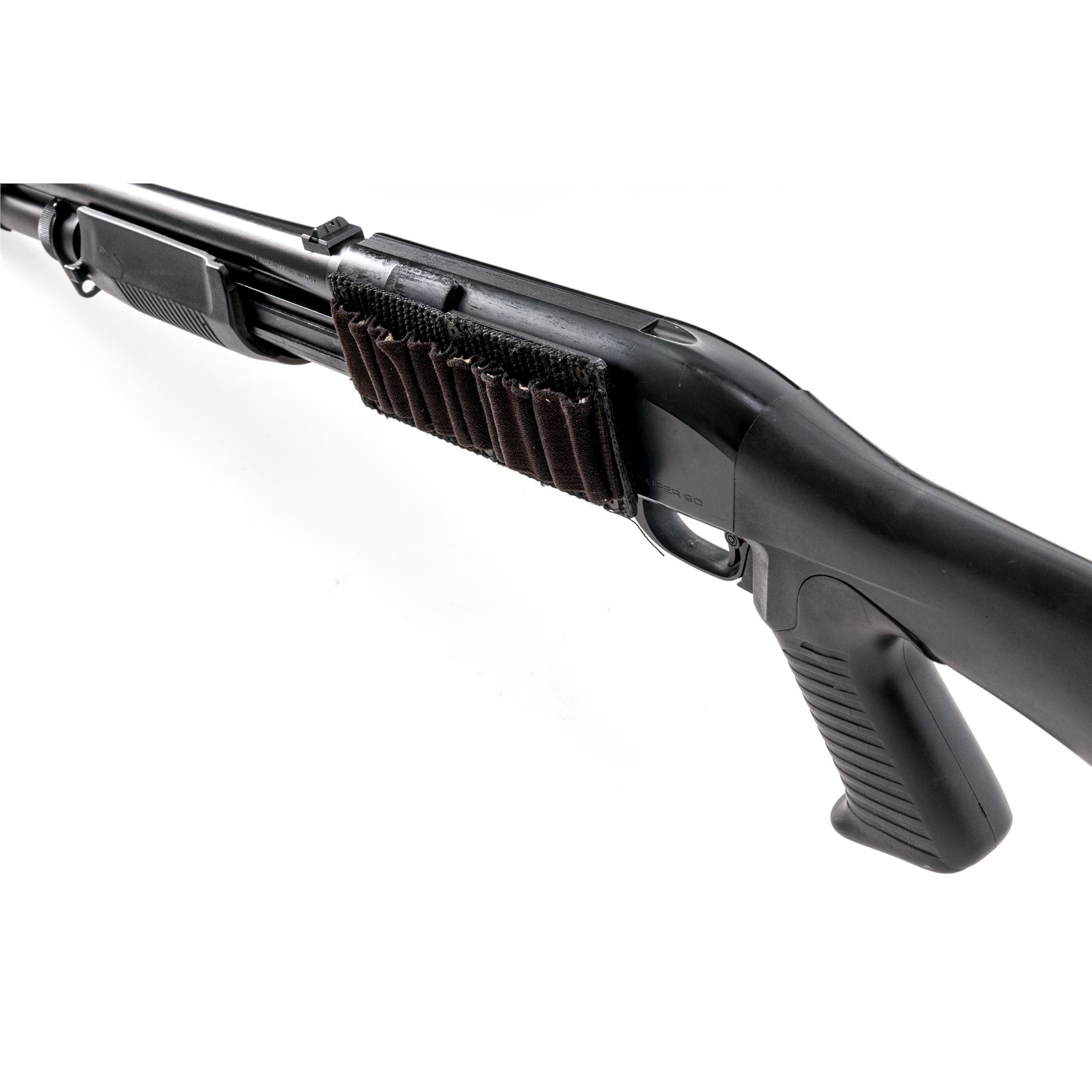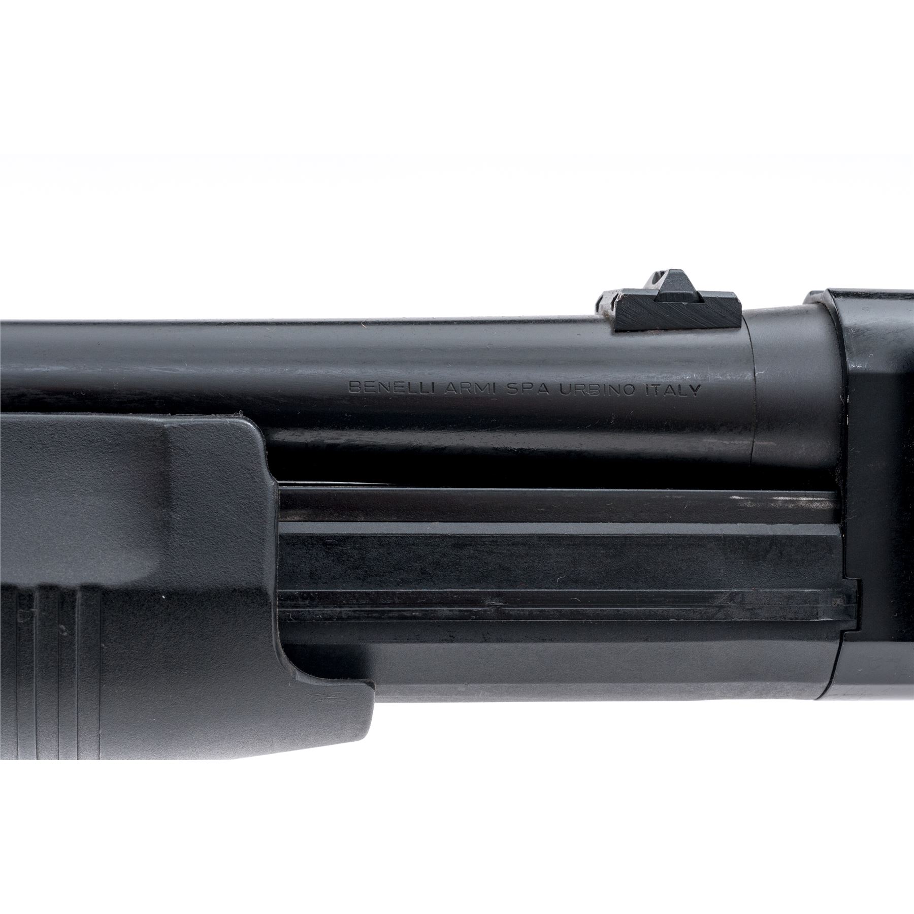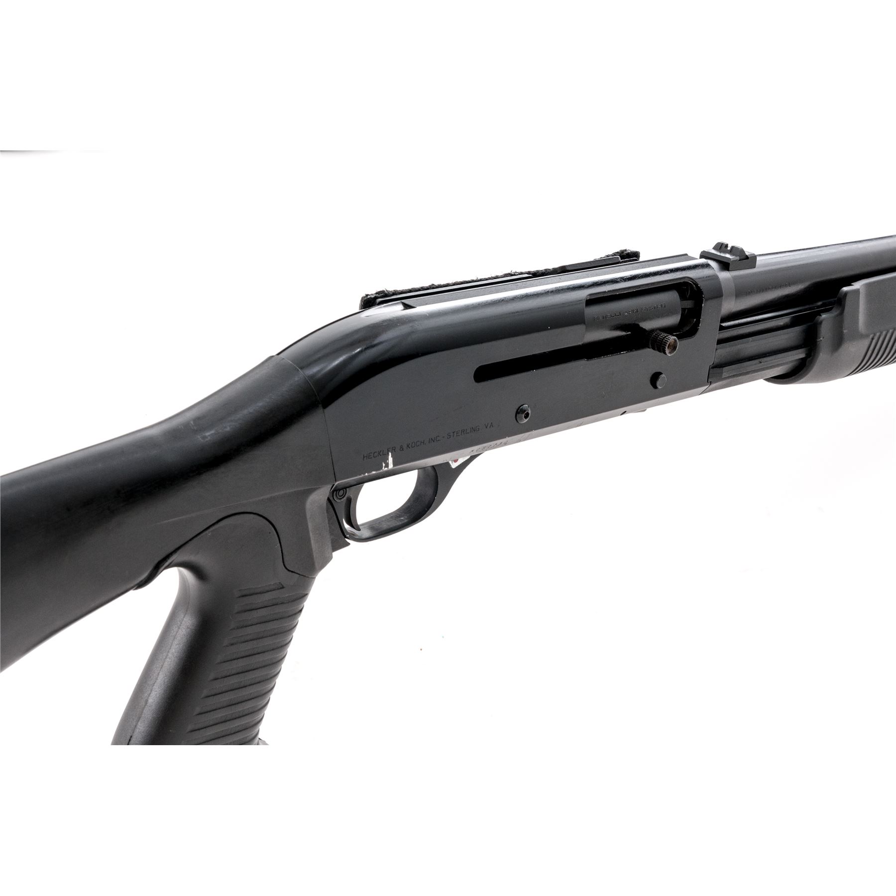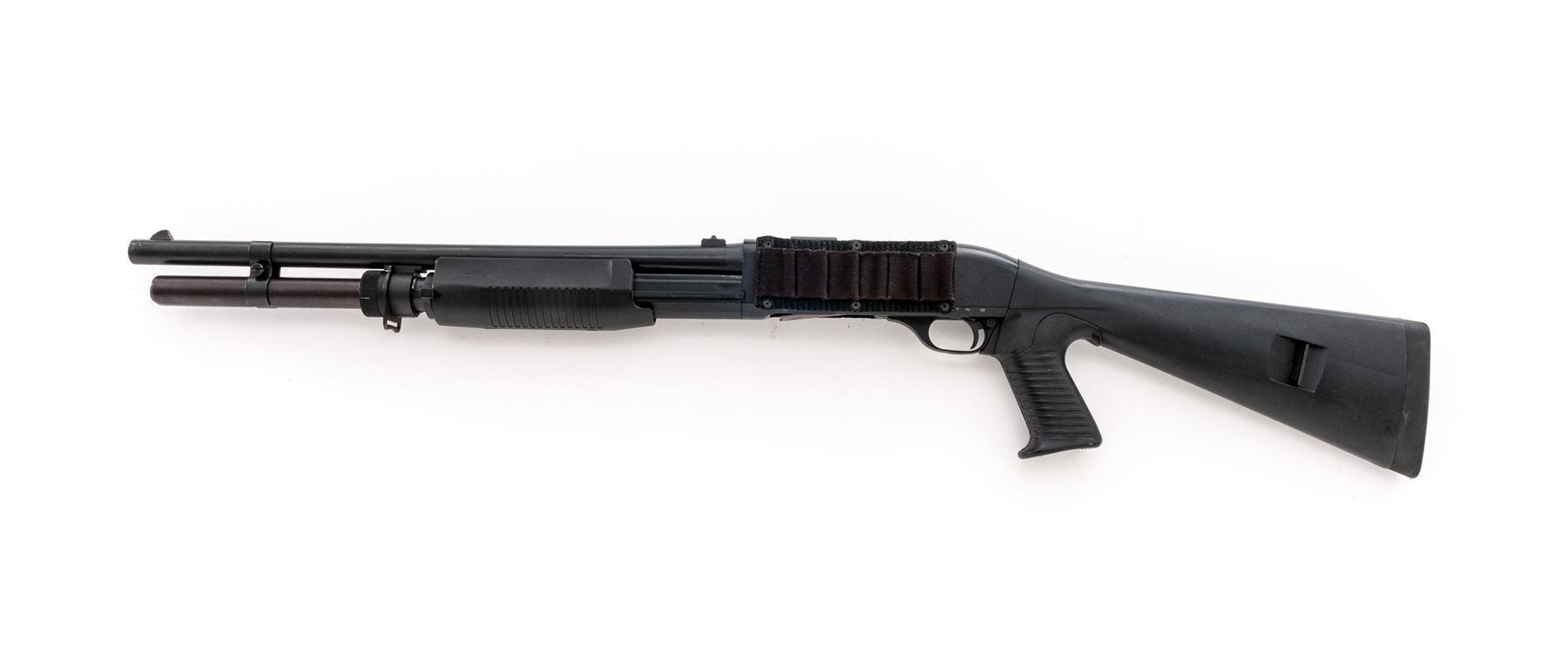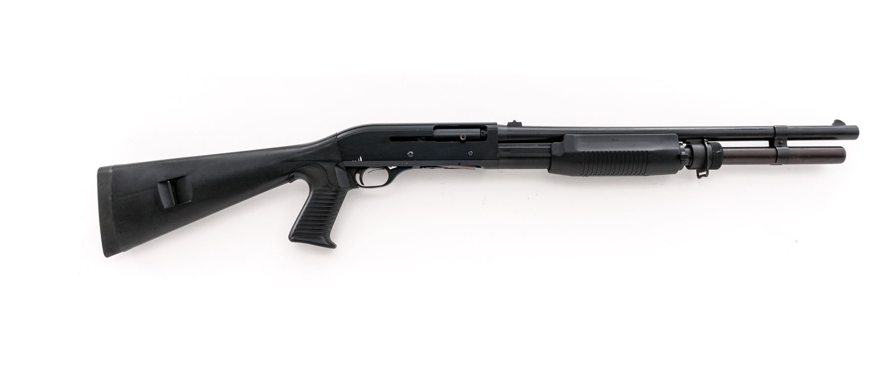 Benelli M3 Super-90 Convertible Semi-Auto/Pump Shotgun, #M087730, 12 ga., 20'' matte blue barrel, black alloy receiver, black synthetic full pistol-grip stock, grooved forend, black rubber Benelli recoil pad; right side of buttstock with integral sling swivel; front swivel is mounted to the barrel ring; with iron sights, left side of receiver with a 6-round nylon shell holder. This shotgun can be operated as either a pump or semi-auto. Imported by Heckler & Koch and so marked on right side of receiver. Condition is very good retaining approx. 95% original blue/black finish; receiver with light scuffs and scratches. Bottom tip of mag tube is dented. Stock with mostly light handling marks, including a few impressions to the forend. Smooth action, bright bore. Est.: $600-$800. (Modern)