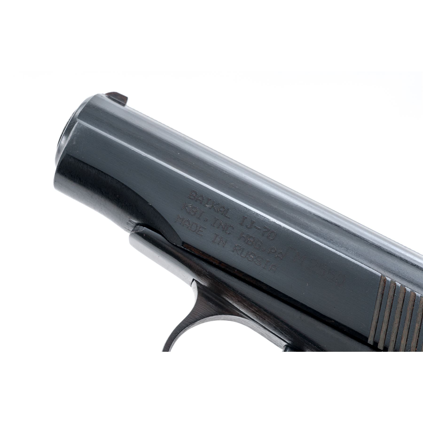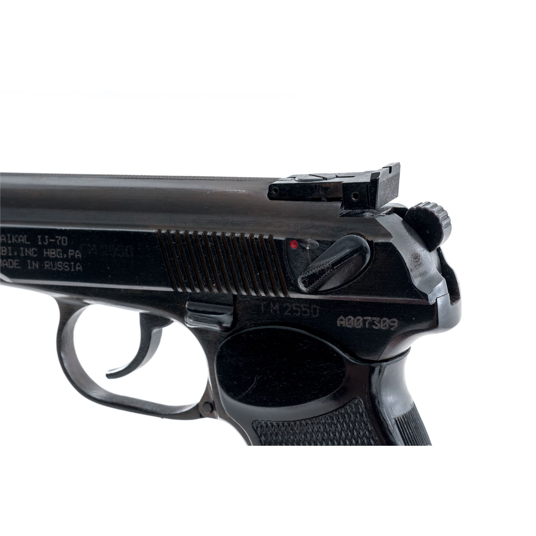 Russian Baikal Model IJ-70 Makarov Semi-Automatic Pistol, #A007309, 9mm Makarov cal., 3-5/8'' barrel, dark blue finish, checkered black plastic one-piece Baikal grips, blade front sight and fully adjustable rear sight, lanyard ring, with one magazine. Left side of slide is import marked. The original serial number on the slide and frame are matching. Frame and slide rate as excellent retaining approx. 98%+ original finish. Grips are very good showing moderate handling marks to the smooth borders, checkering is sharp. All of the factory lettering is clear. Smooth tight action, bright bore rates excellent. Est.: $250-$400. (Modern/PPT)