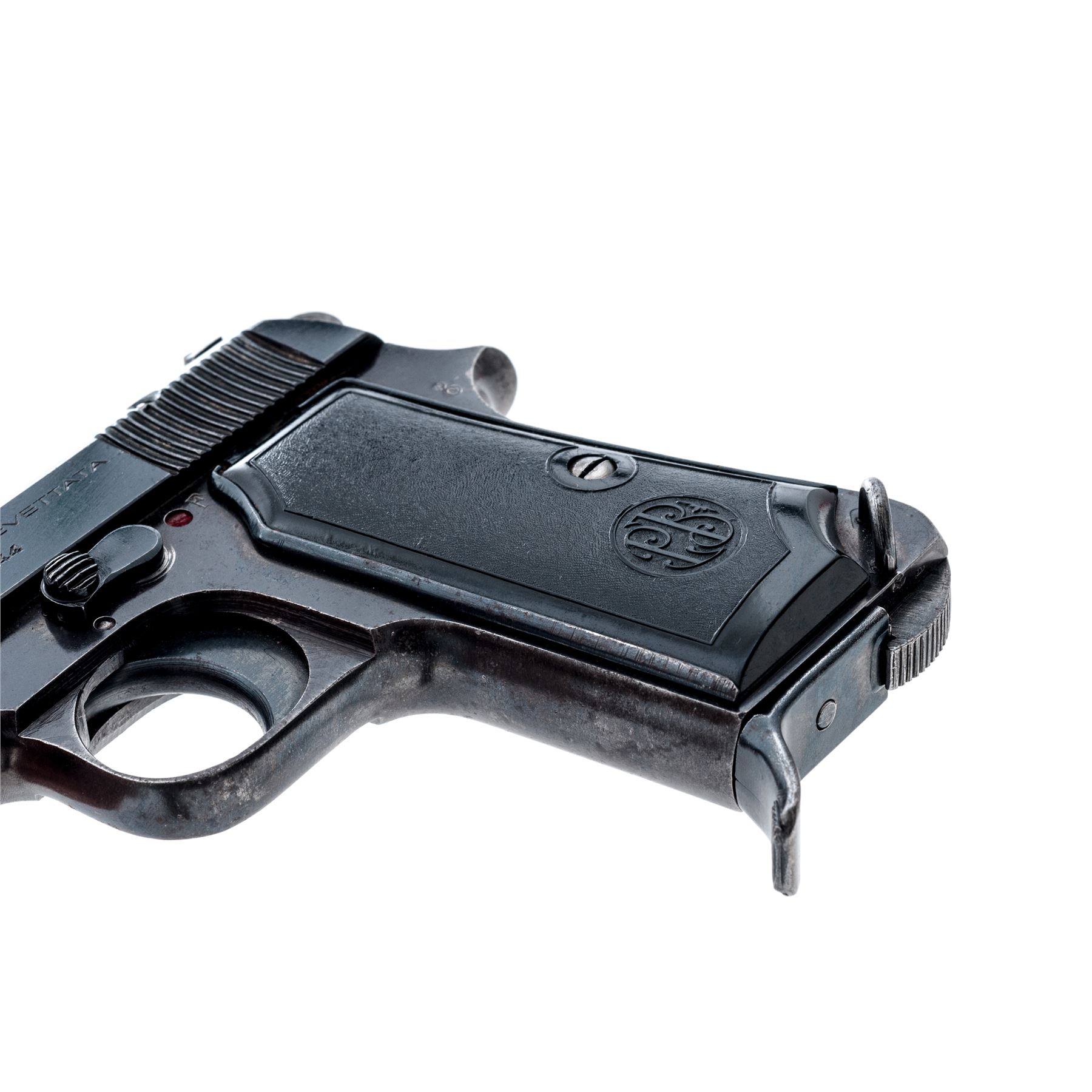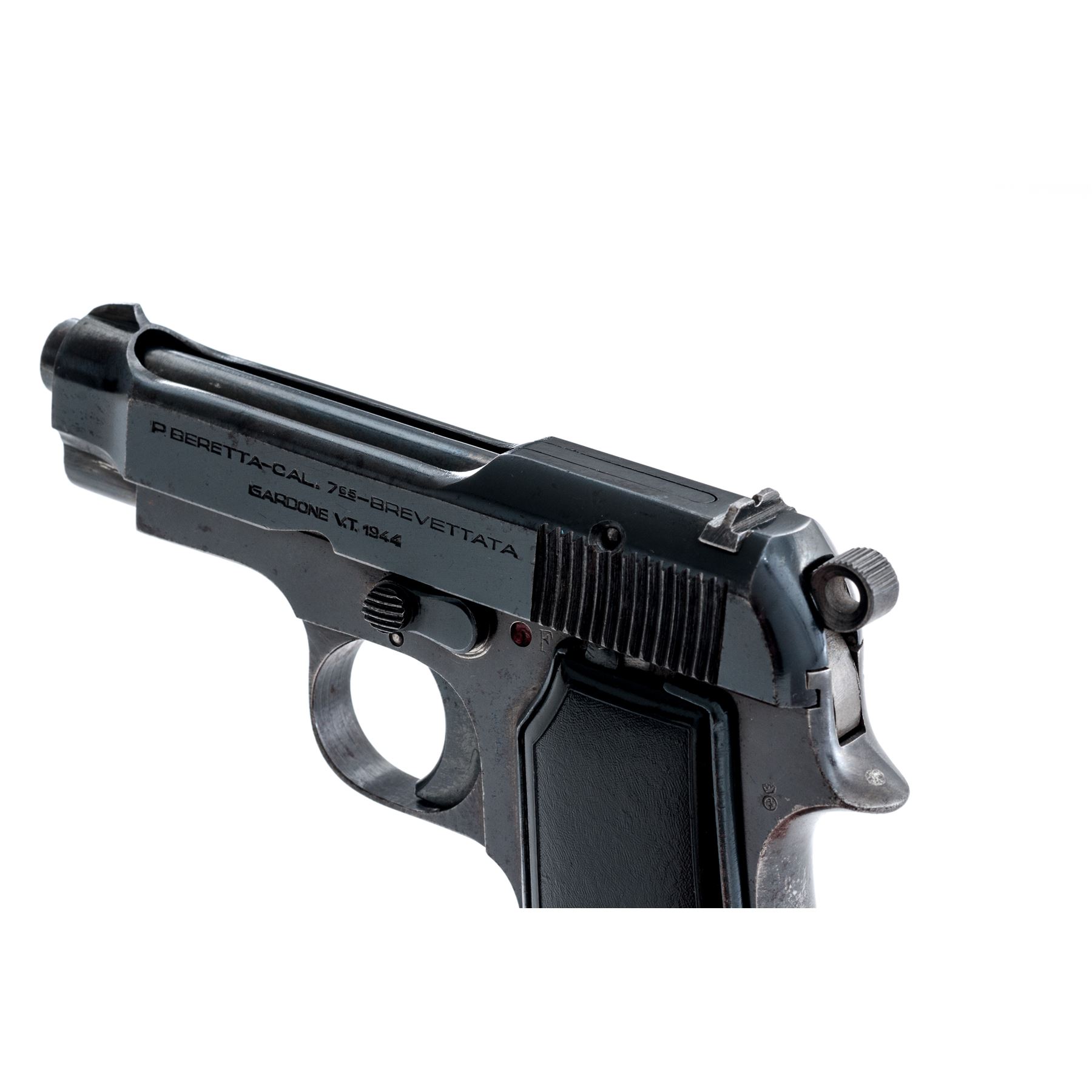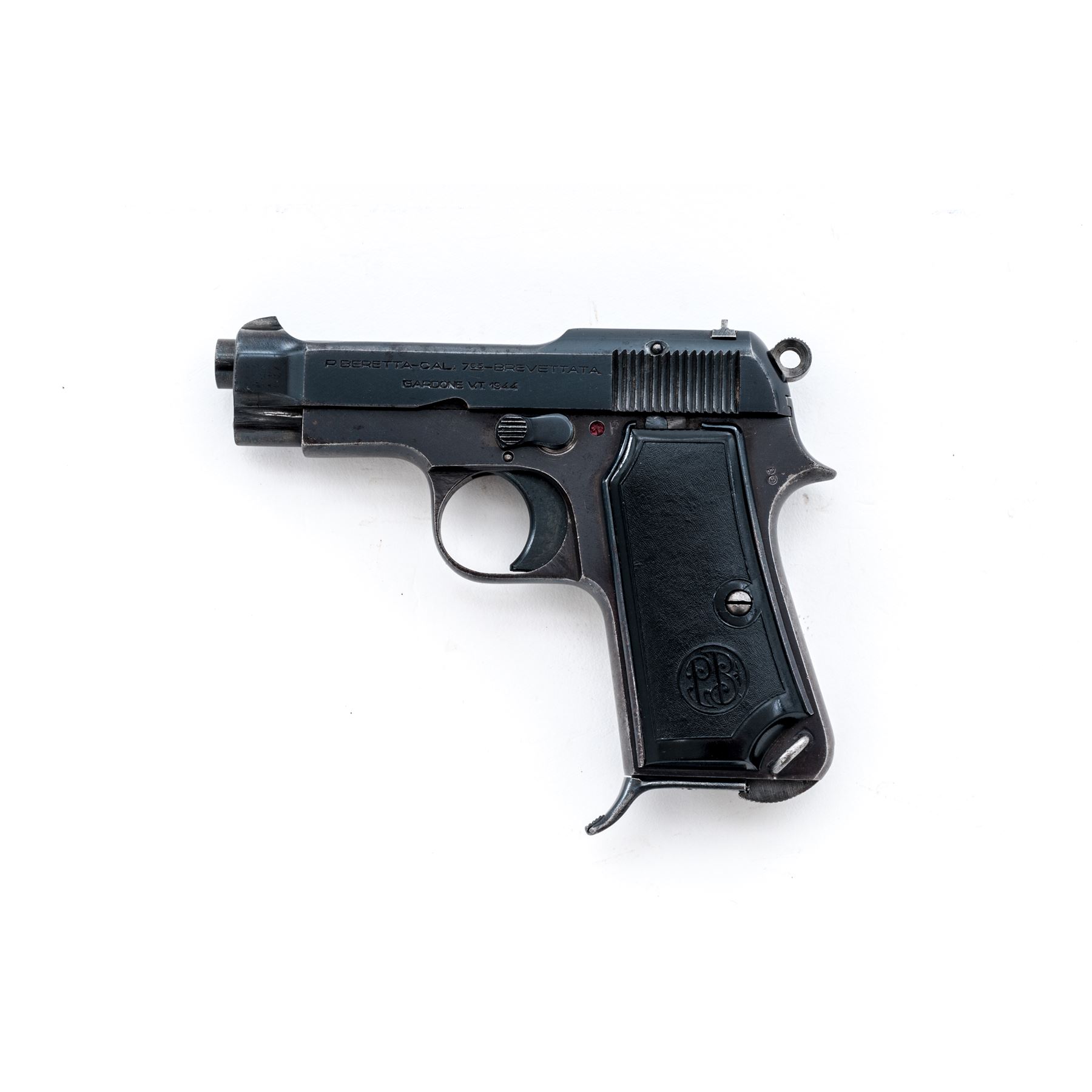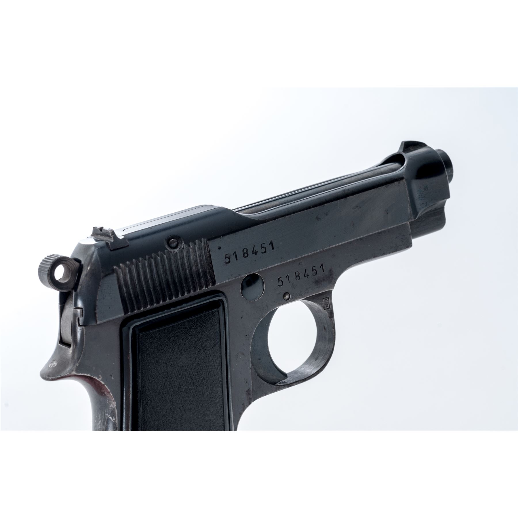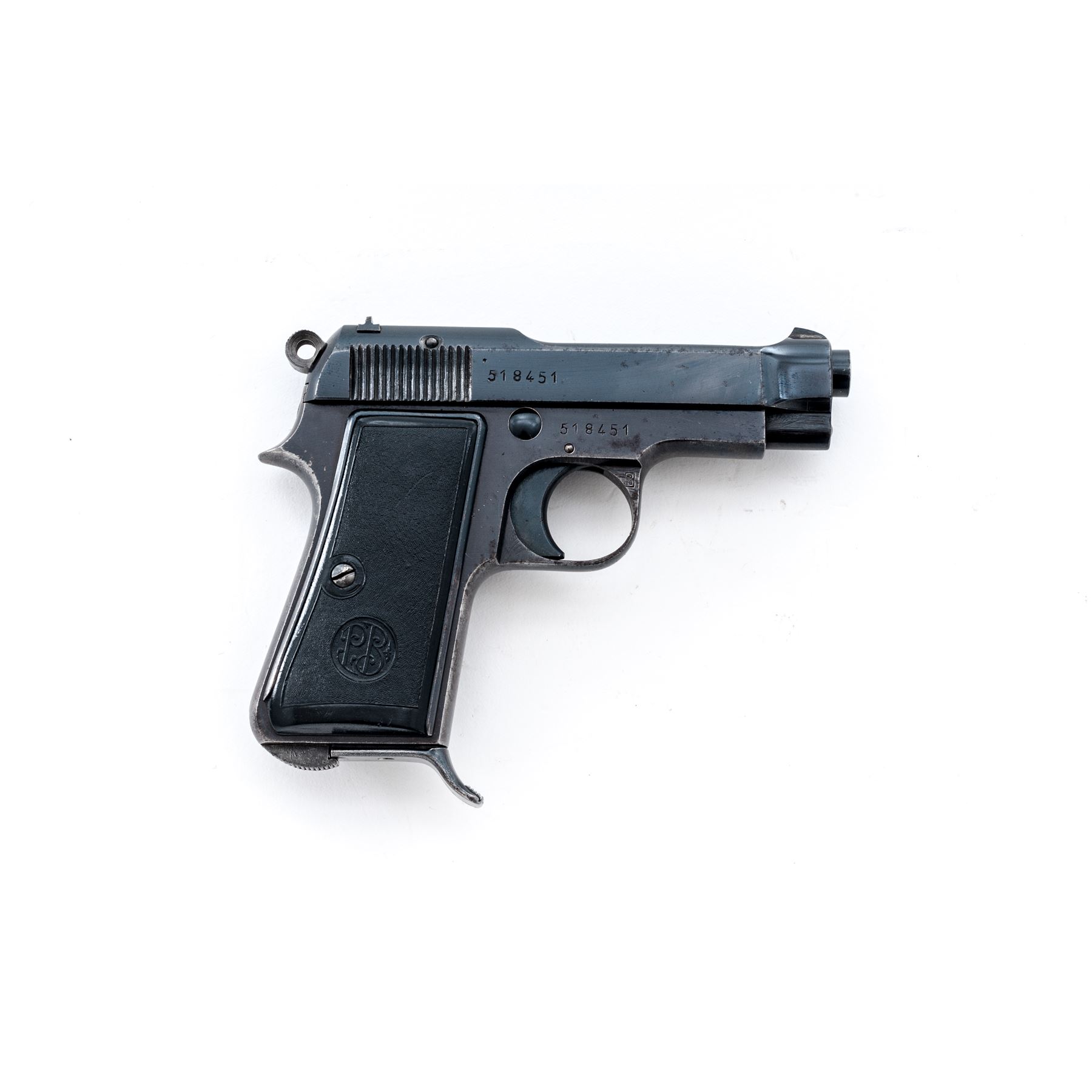 Beretta Model 1935 Semi-Automatic Pistol, #518451, .32 Auto cal., 3.4'' barrel, blued finish, black plastic grips, fixed blade front sight and notched rear sight. Marked on left side of slide with standard model and address information including ''1944'', with one magazine. Condition overall is very good with approx. 85% finish remaining on the metal with thinning to the front and back straps and scattered areas of very light pitting overall. Factory lettering is crisp. Left grip has a couple of small cracks around the screw, otherwise both sides are very good with minor handling marks. Action is smooth, bright bore is very good with very good rifling. No visible import marks. Est.: $250-$400. (C& R)