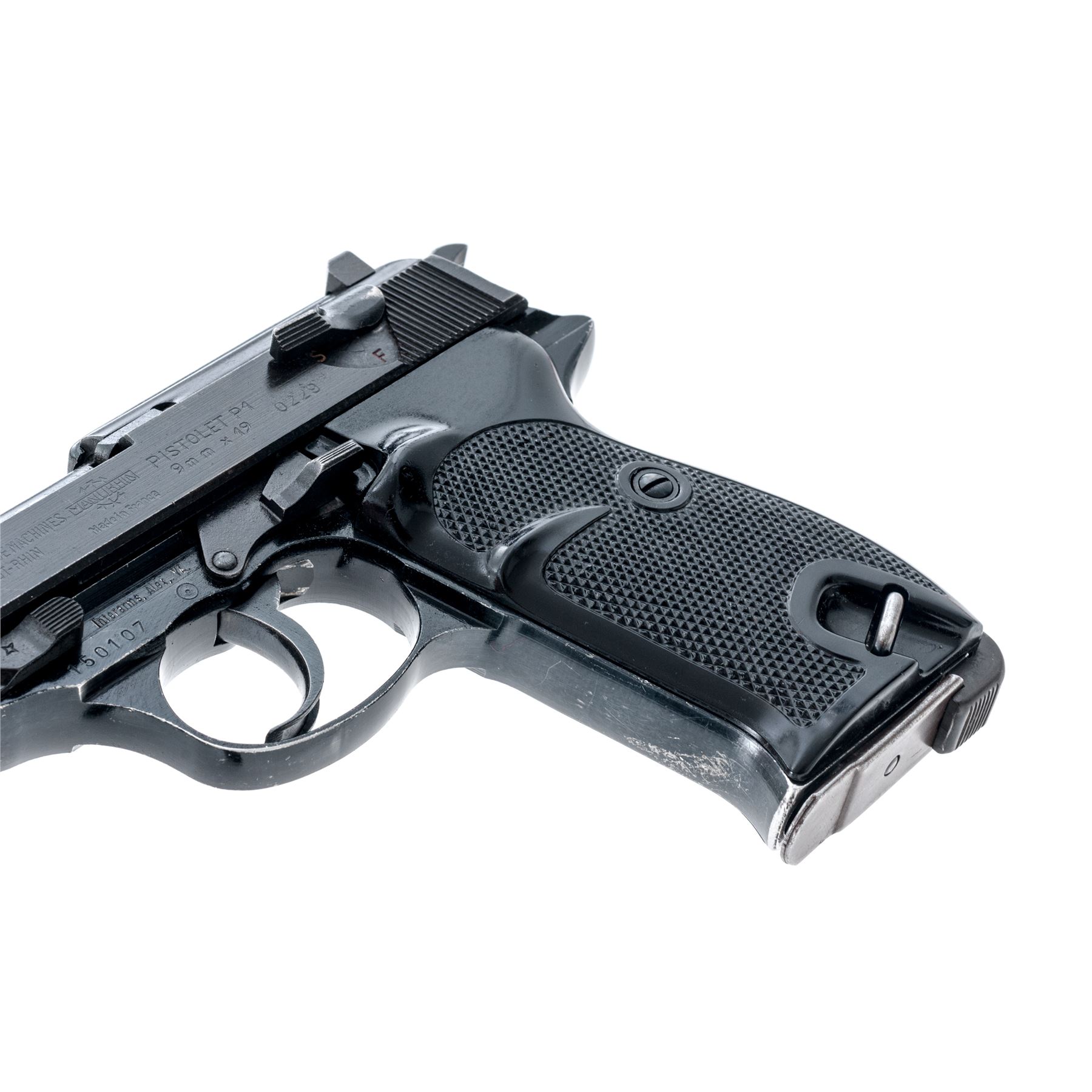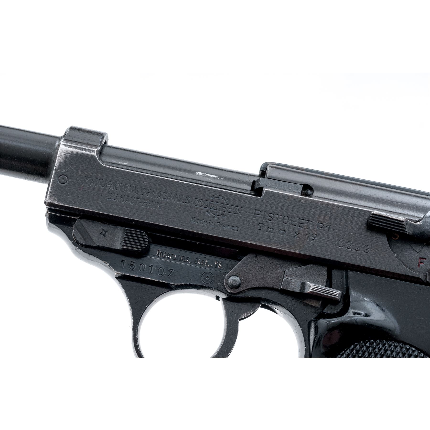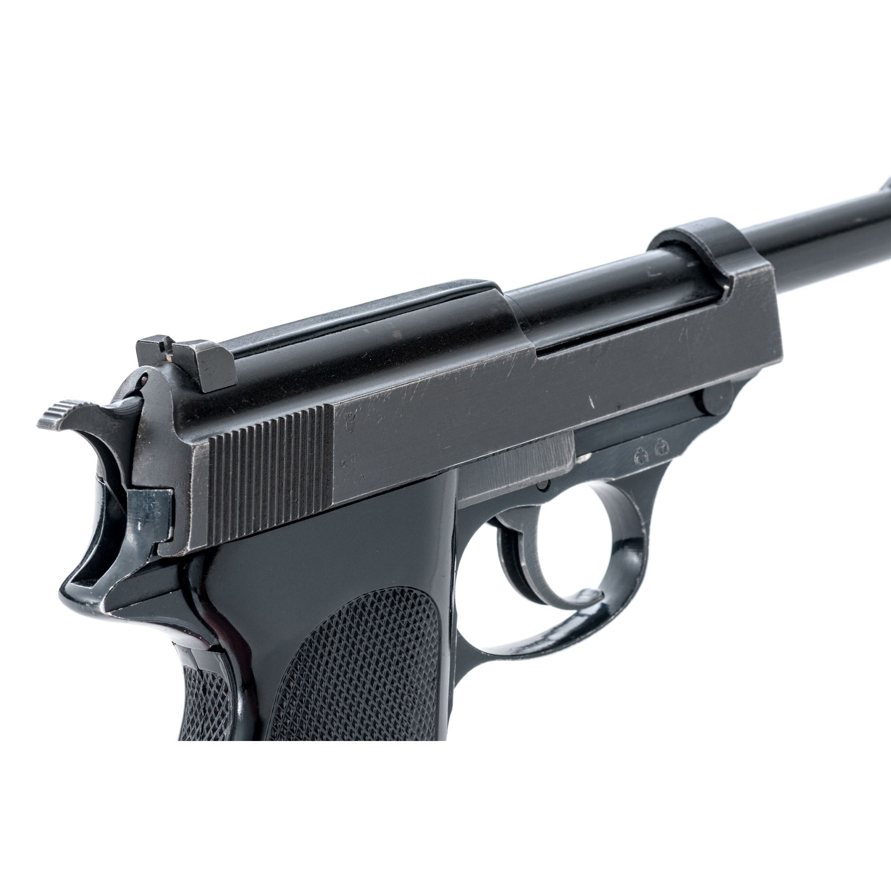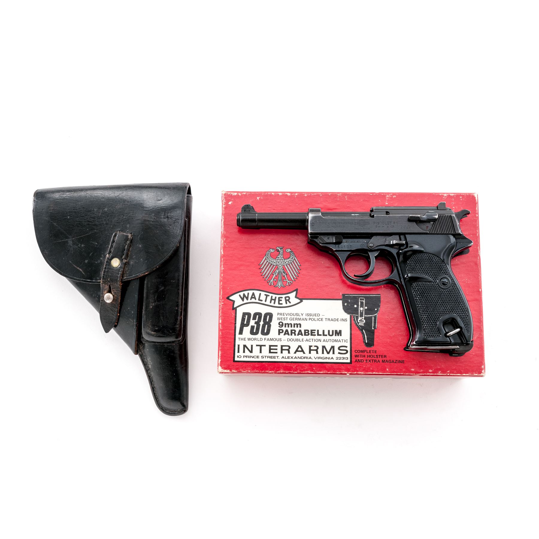 Manurhin P1 Semi-Automatic Pistol, with holster, #150107, 9mm, 5'' barrel, matte blue barrel and slide; aluminum frame with black finish, checkered black plastic grips, standard fixed sights, with one magazine that is marked on the side ''P38/U''. Metal with various proof marks; left side of frame is import marked; right side of the slide with small ''(crossed cannons)''. Barrel, frame, and slide with mismatched numbers. In black leather post-war holster that is stamped ''Wunderlich, Berlin'' and dated ''1963'', with additional names, etc. written in pen on inside of flap. In an original Walther/Interarms box that is numbered to another gun, with manual. Condition is very good retaining approx. 80%-85% blue; frame with moderate thinning and toning accounting for a majority of the finish loss. Factory lettering, etc. is clear. Grips with normal light handling marks to the smooth borders, checkering is excellent. Smooth action, bright bore with excellent rifling. Holster is also very good showing normal light scuffs and wear to the exterior, stitching is tight. Est.: $350-$500. (C&R)