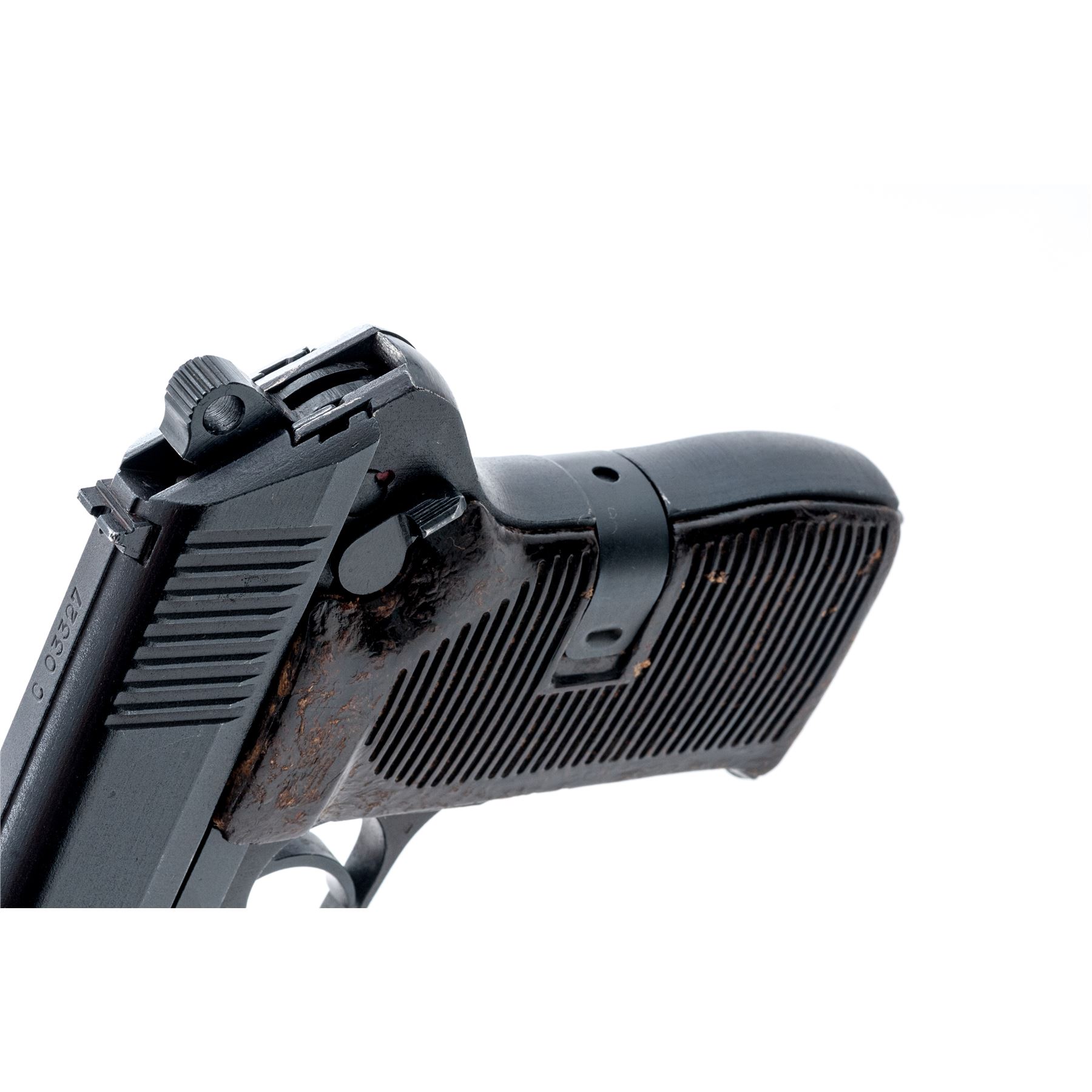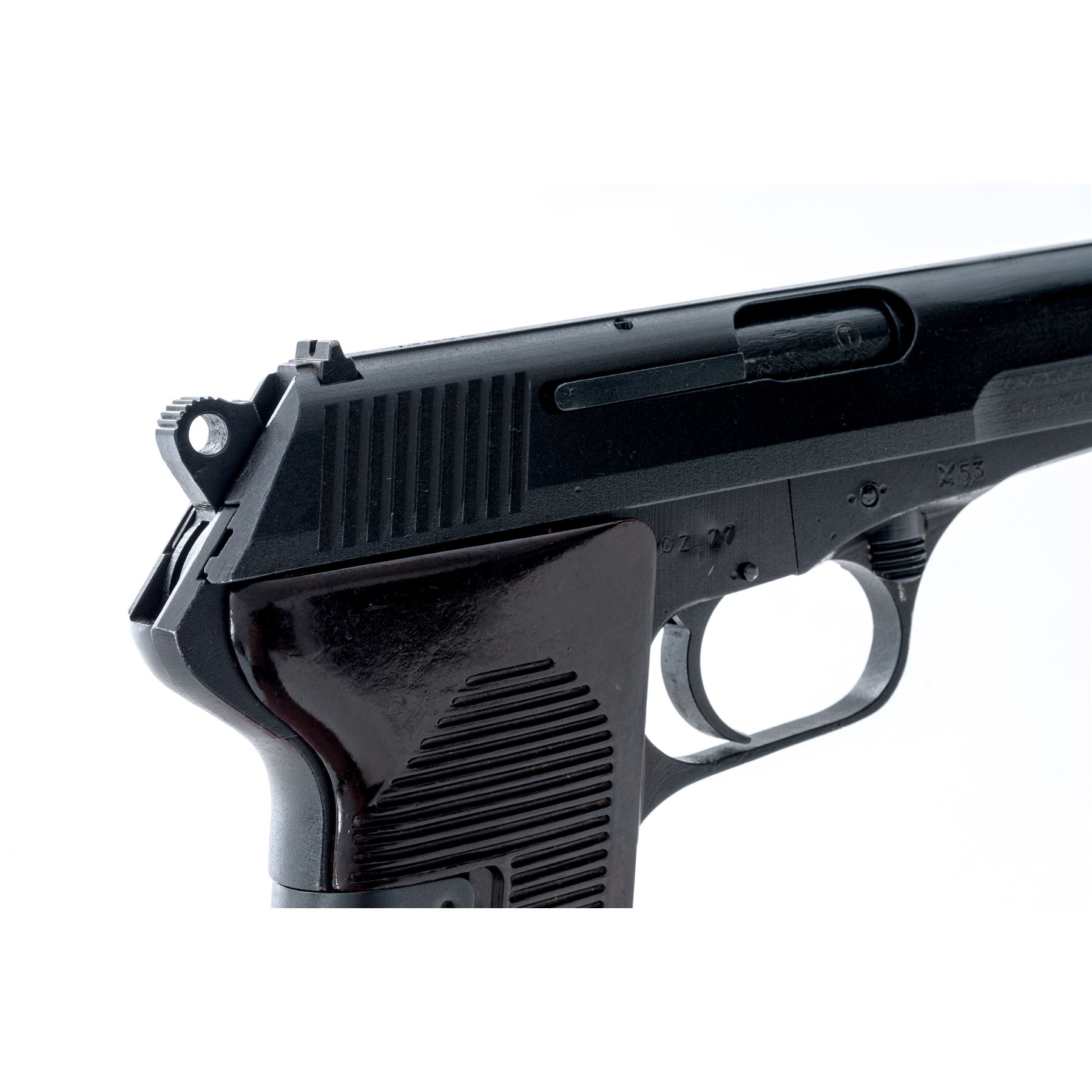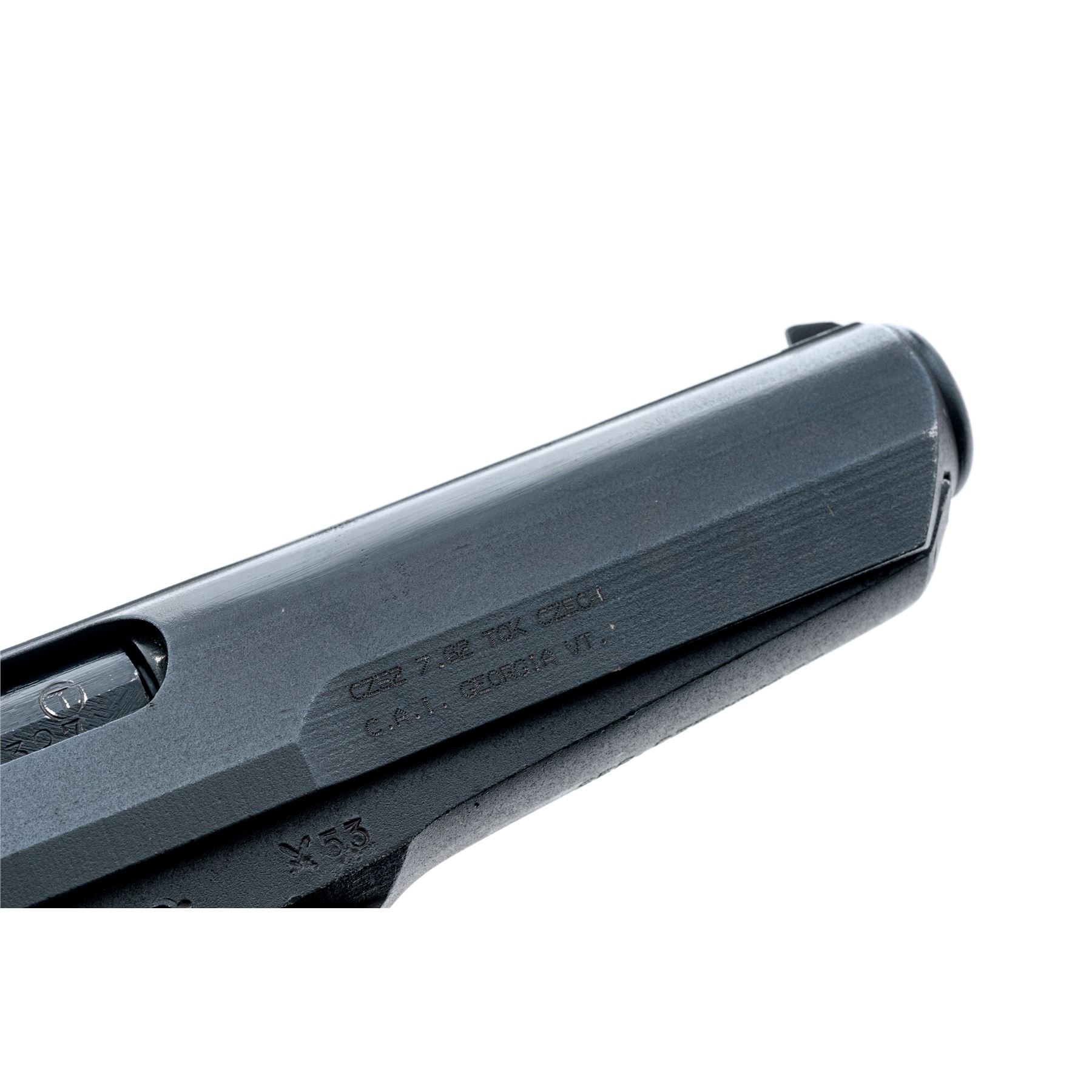 Czech Model CZ 52 Semi-Automatic Pistol, #C03327, 7.62x25mm cal., 4.7'' barrel, parkerized finish, brown plastic grips, blade front sight and notched rear sight, with one magazine. Marked on left side of frame ''rid'', and on right side ''53''. Also stamped ''VOZ 77''. Matching numbers. Condition overall is very good with the metal retaining about 95% finish. Grips are very good with a few chips and scratches to the left side. Action is smooth, bright bore is very good. Import stamped on right side of slide. Est.: $300-$450. (C&R/PPT)