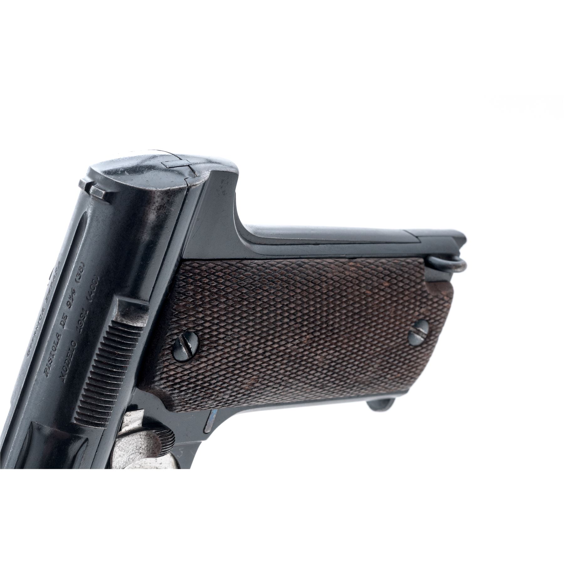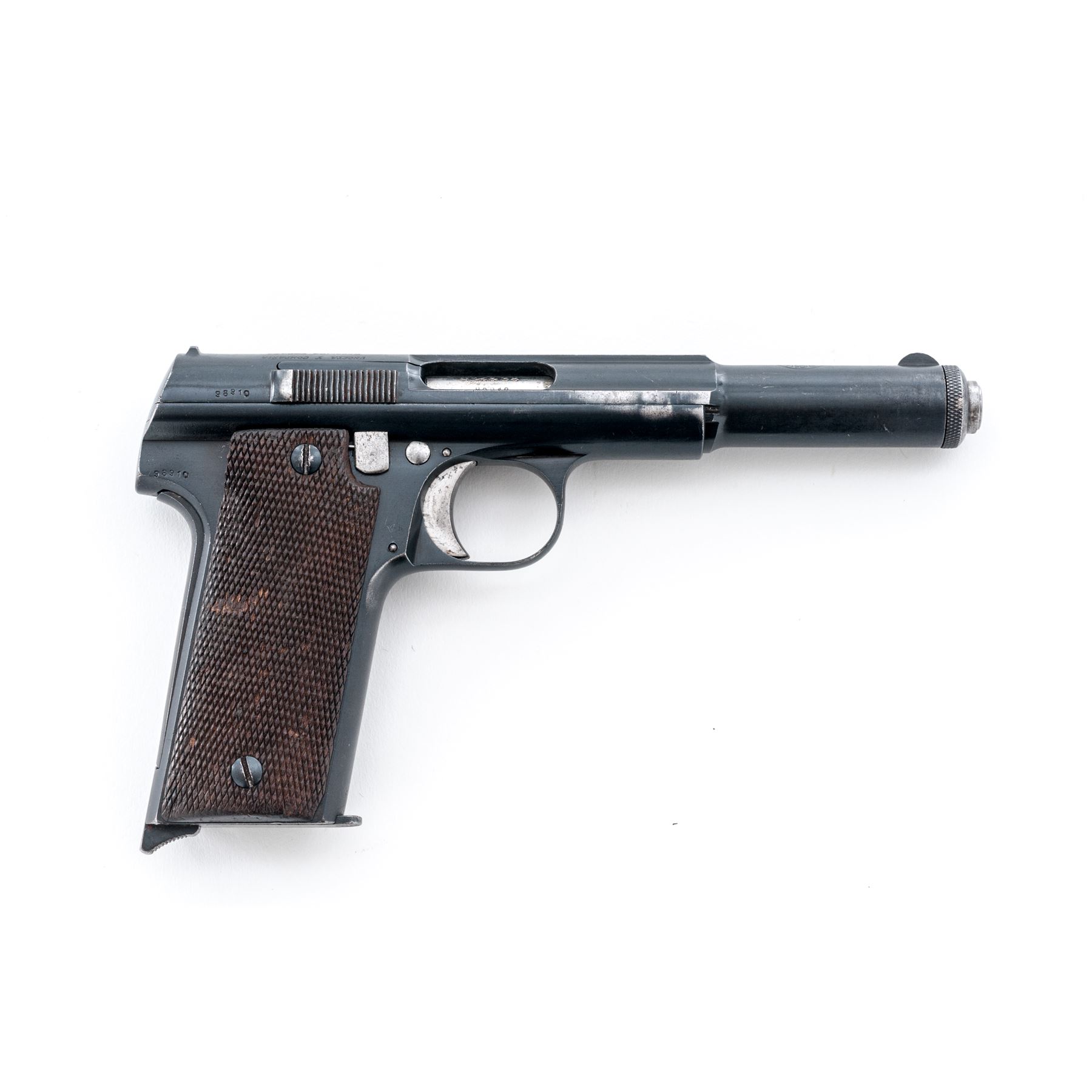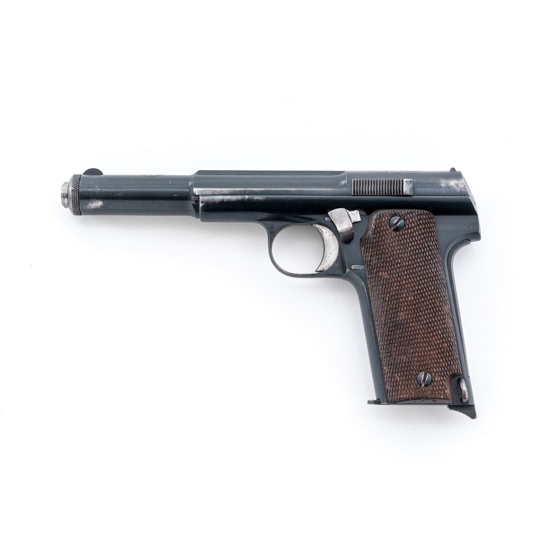 Astra Model 1921 (400) Semi-Automatic Pistol, #98910, 9x23 cal., 6'' barrel, blue finish, factory checkered walnut grips, with one Astra magazine. Condition is near excellent, with matching numbered barrel, slide and frame, retaining approx. 92% original finish. Grips with minor flattening and light impressions. Action is crisp, bore is very good. Est.: $400-$600. (C&R/PPT)