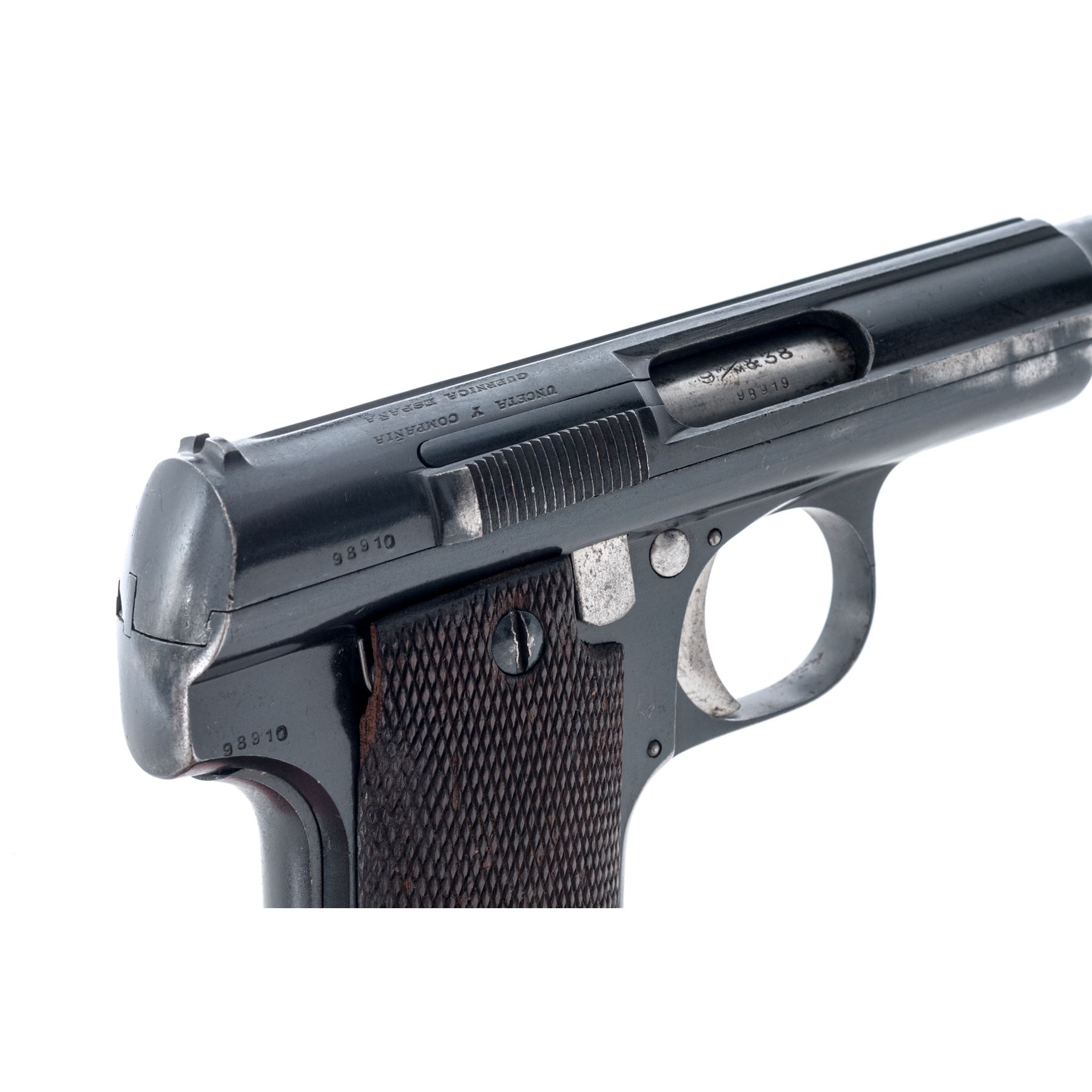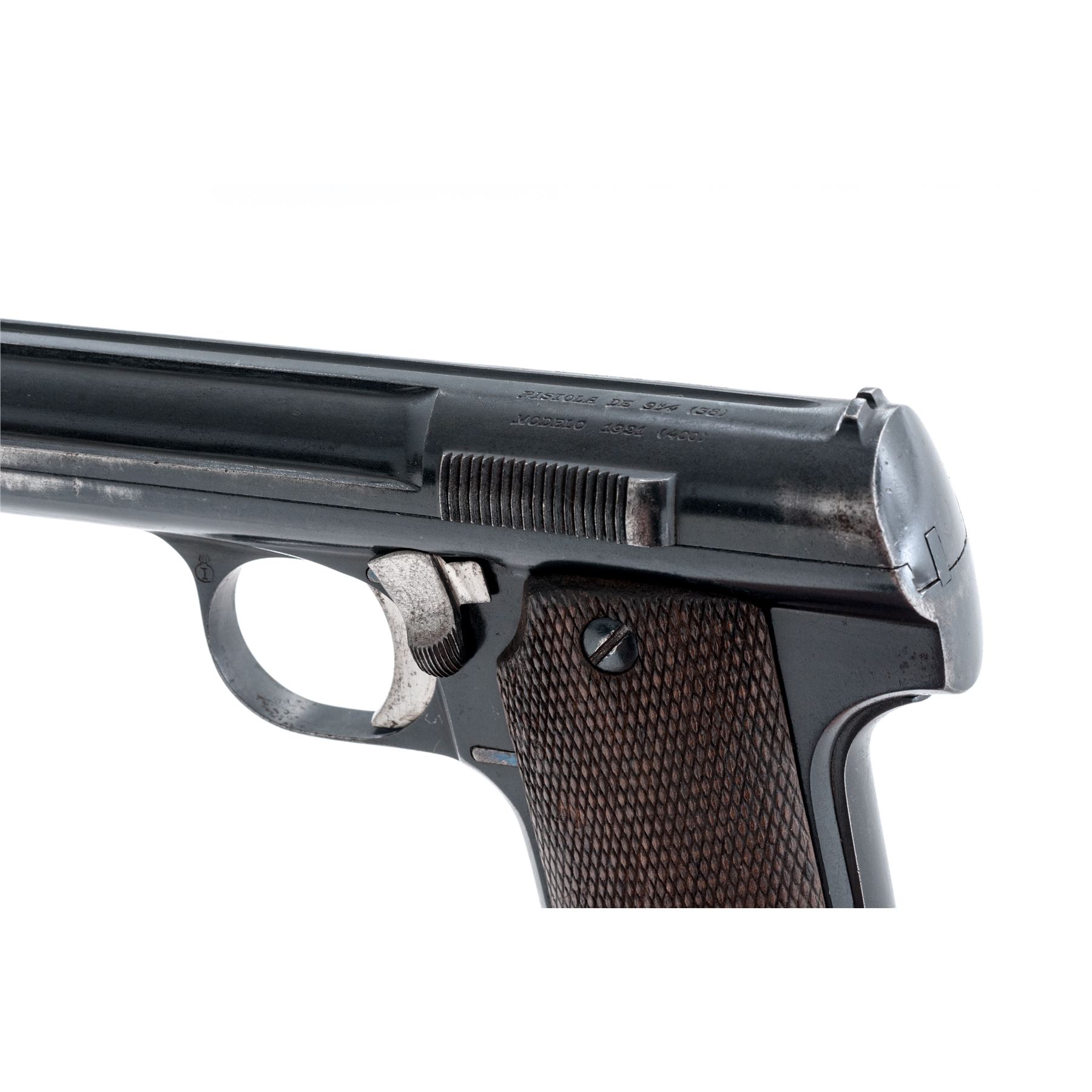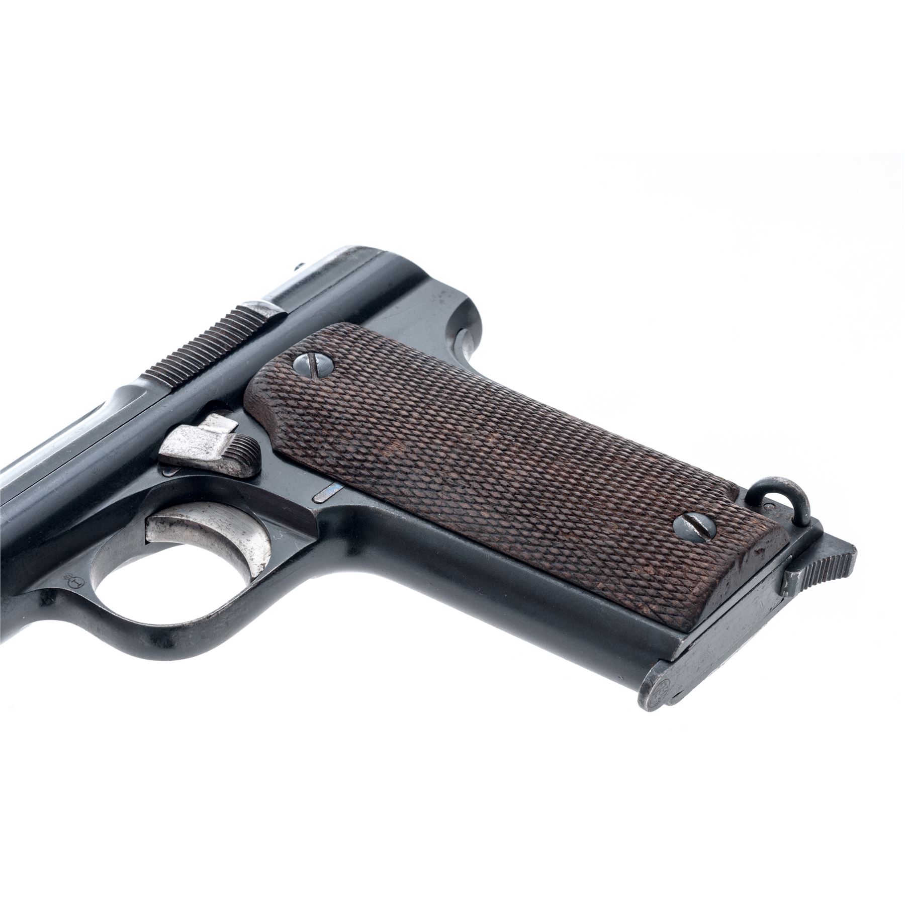 Astra Model 1921 (400) Semi-Automatic Pistol, #98910, 9x23 cal., 6'' barrel, blue finish, factory checkered walnut grips, with one Astra magazine. Condition is near excellent, with matching numbered barrel, slide and frame, retaining approx. 92% original finish. Grips with minor flattening and light impressions. Action is crisp, bore is very good. Est.: $400-$600. (C&R/PPT)