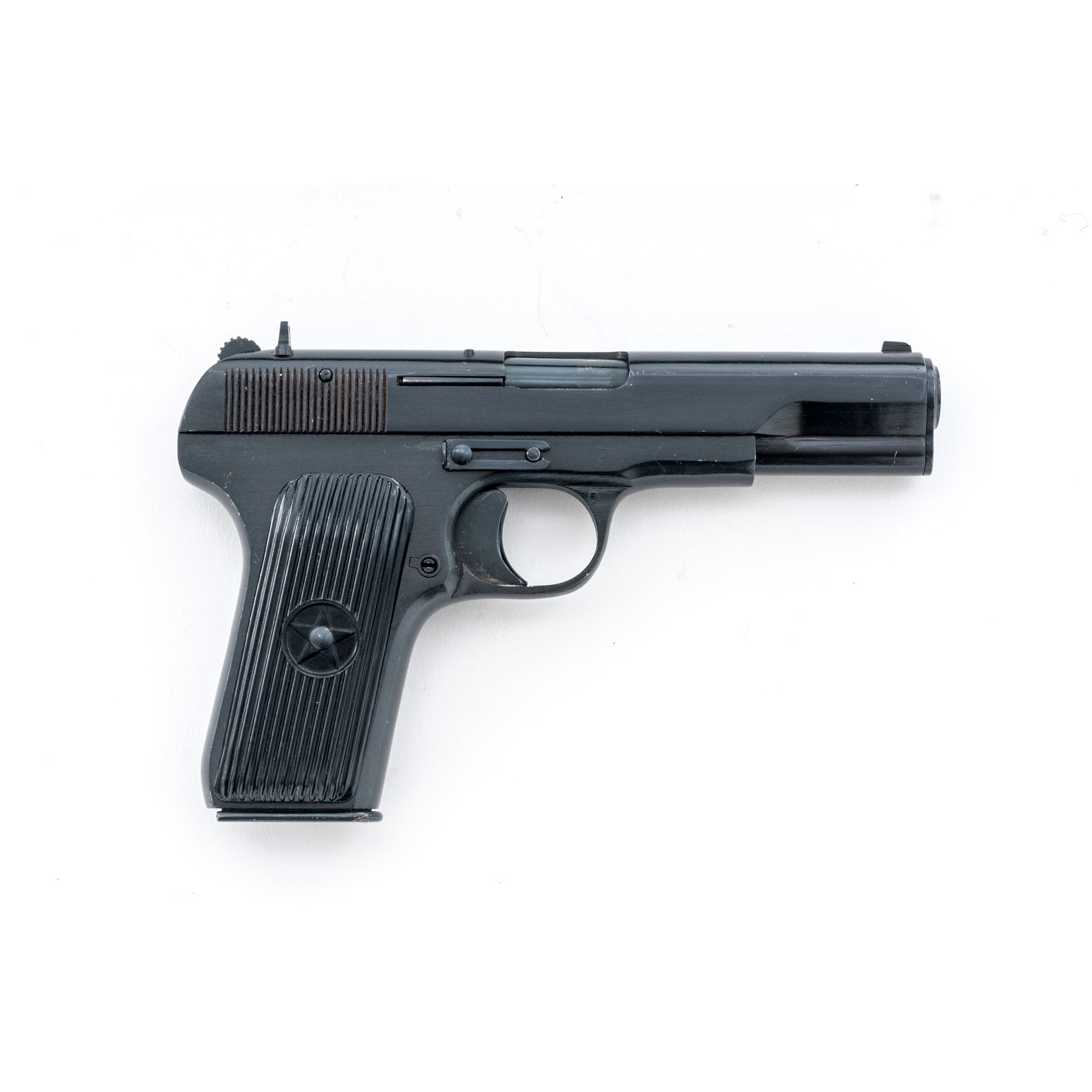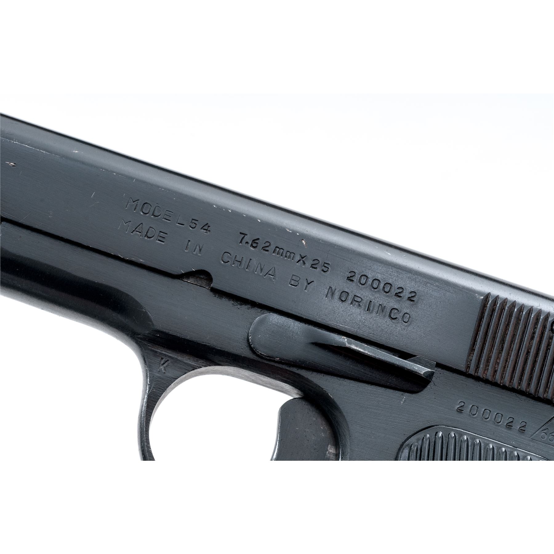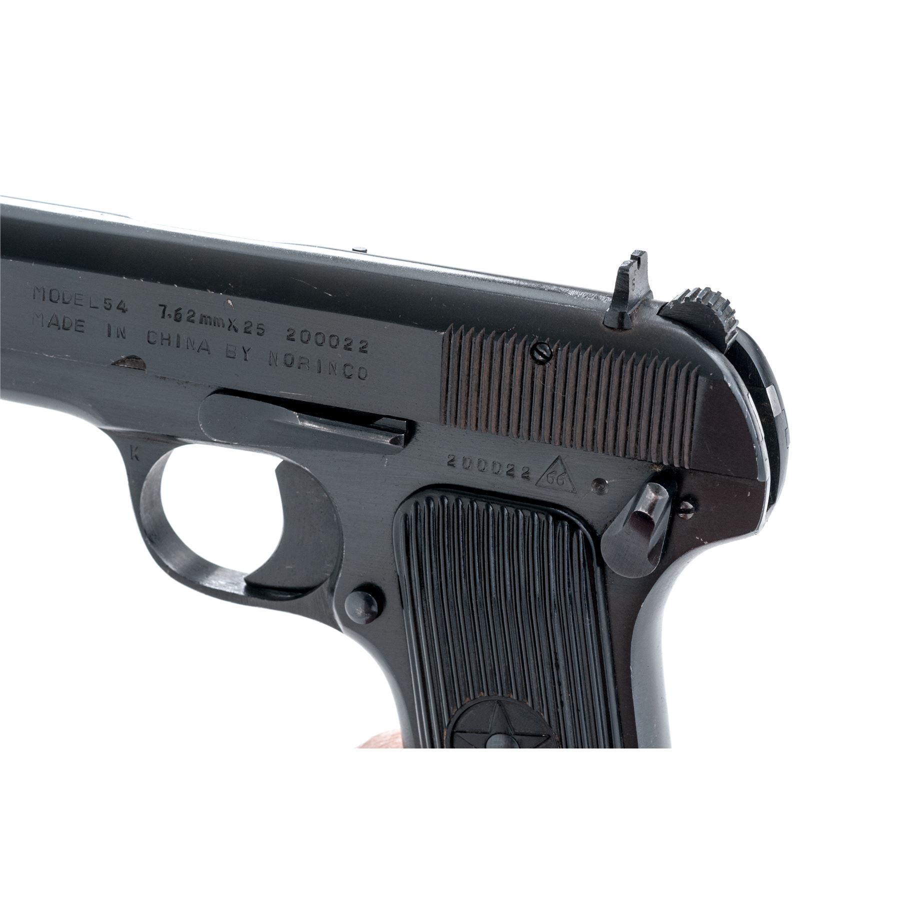 Norinco Model 54 Tokarev Semi-Automatic Pistol, #200022, 7.62x25mm cal., 4.5'' barrel, dark blue finish, grooved black plastic grips with ''Star'' center, blade front sight and fixed ''U''-notched rear sight, with lanyard loop on lower left side of frame. Includes one non-matching magazine. Frame, slide, barrel, hammer assembly, and barrel bushing with matching numbers. Marked on left side of slide ''MODEL 54 7.62mm x 25/MADE IN CHINA BY NORINCO''; left side of frame with factory ''66'' stamp; front gripstrap is import marked. Metal surfaces are in fine overall condition and retain approx. 97%-98% blue finish, with scattered tiny nicks and small surface scratches, predominantly along the front half of the slide. Grips are near excellent with only minor handling marks. All of the factory lettering on the frame and slide is clear. Smooth action, bright bore with excellent rifling. Est.: $250-$350. (Modern/PPT)
