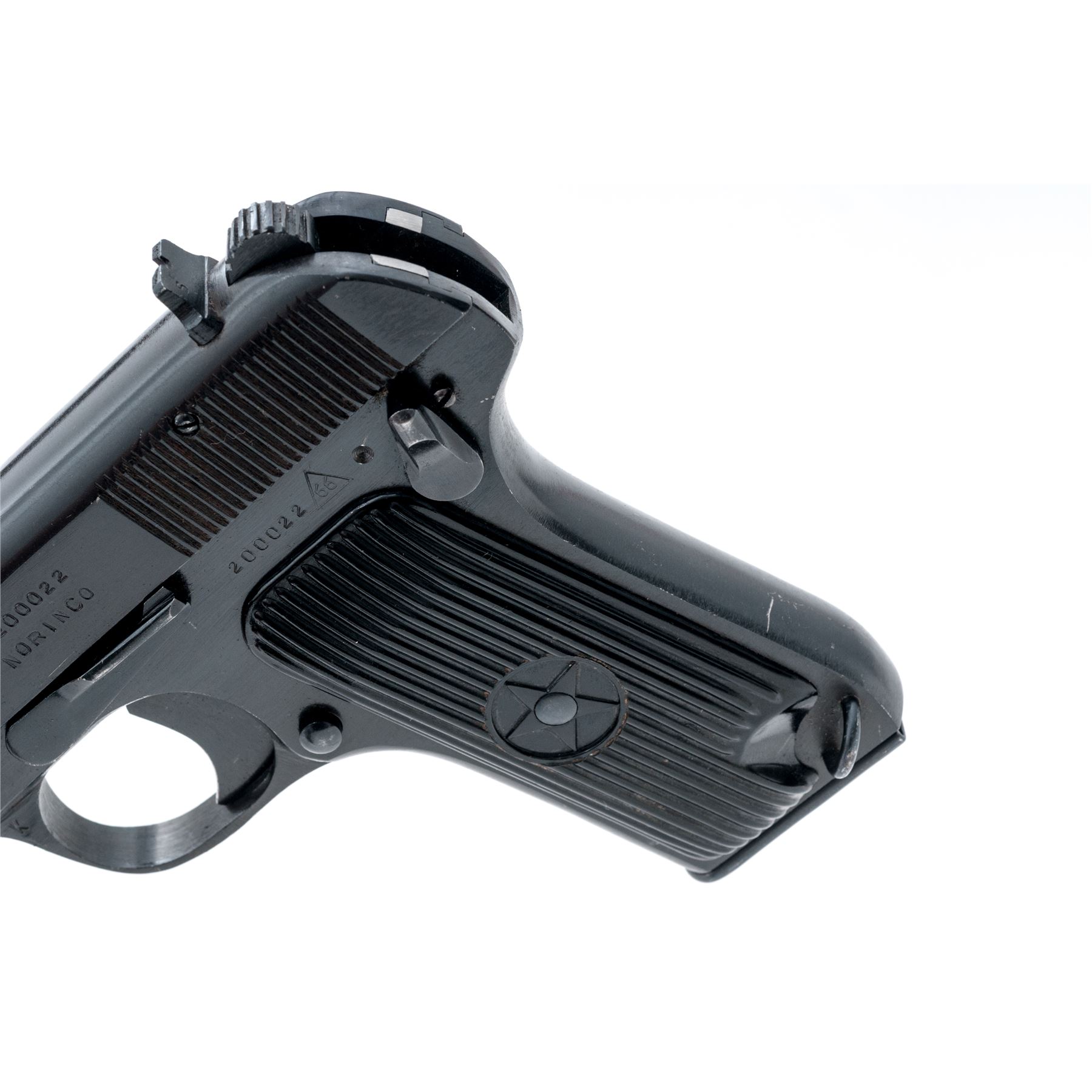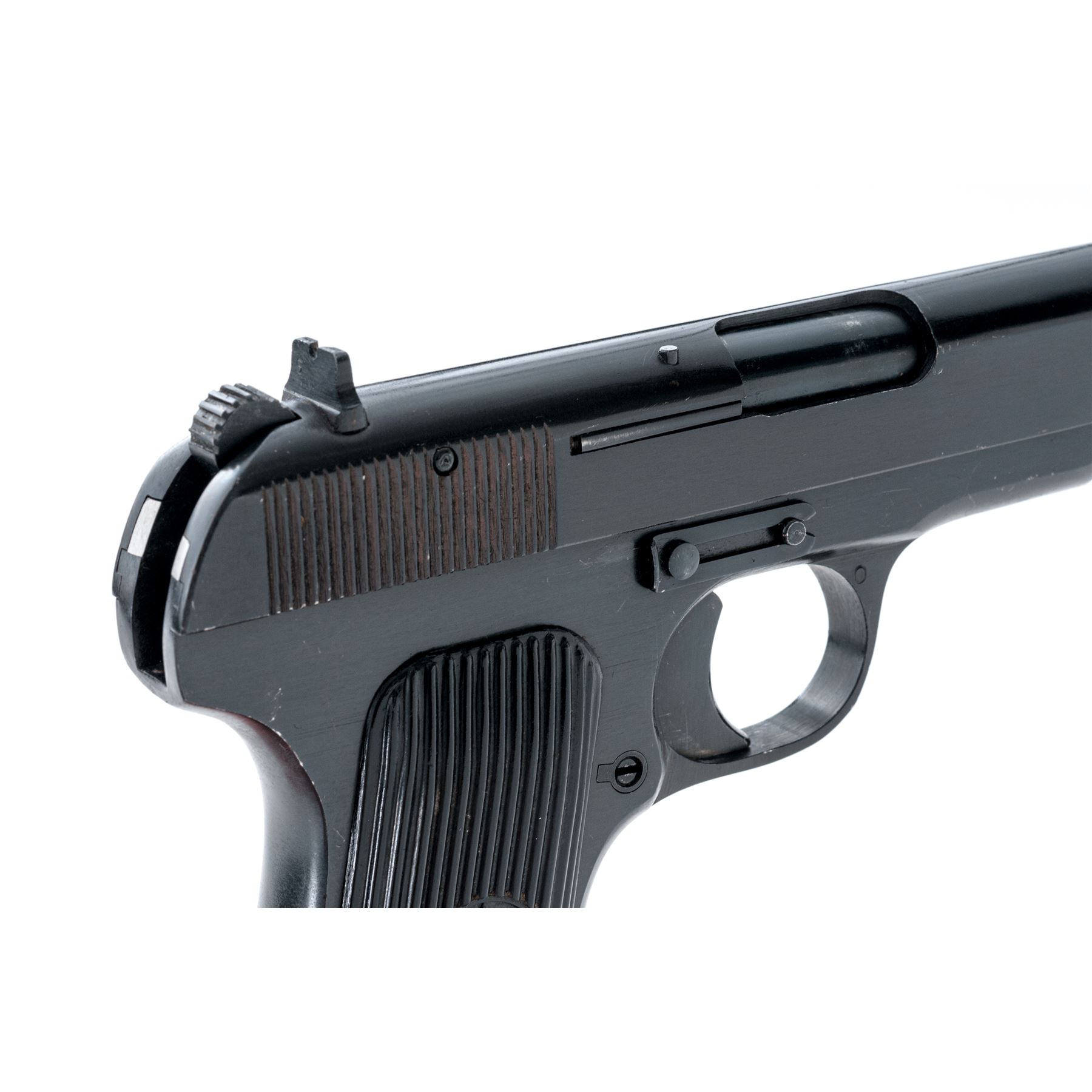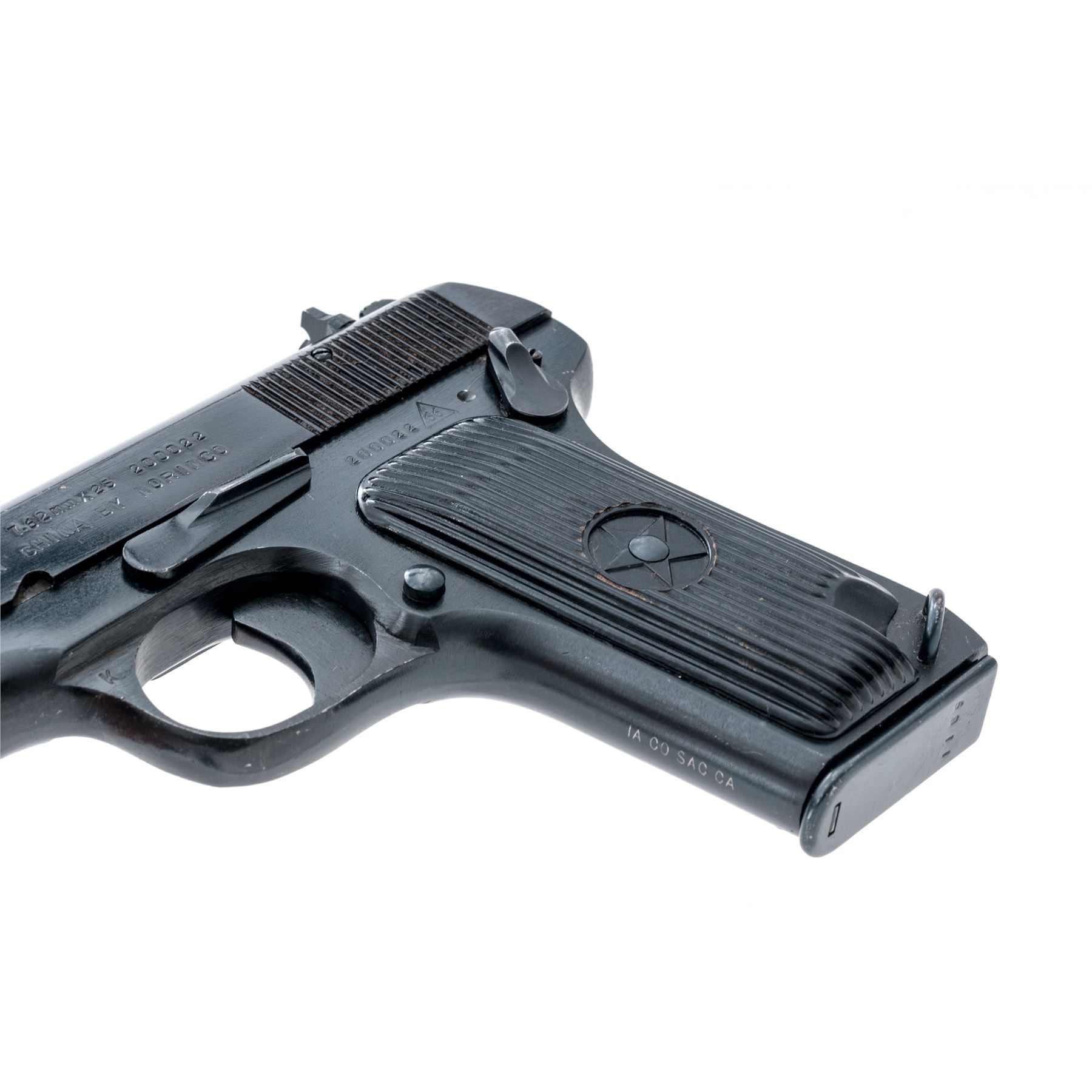 Norinco Model 54 Tokarev Semi-Automatic Pistol, #200022, 7.62x25mm cal., 4.5'' barrel, dark blue finish, grooved black plastic grips with ''Star'' center, blade front sight and fixed ''U''-notched rear sight, with lanyard loop on lower left side of frame. Includes one non-matching magazine. Frame, slide, barrel, hammer assembly, and barrel bushing with matching numbers. Marked on left side of slide ''MODEL 54 7.62mm x 25/MADE IN CHINA BY NORINCO''; left side of frame with factory ''66'' stamp; front gripstrap is import marked. Metal surfaces are in fine overall condition and retain approx. 97%-98% blue finish, with scattered tiny nicks and small surface scratches, predominantly along the front half of the slide. Grips are near excellent with only minor handling marks. All of the factory lettering on the frame and slide is clear. Smooth action, bright bore with excellent rifling. Est.: $250-$350. (Modern/PPT)